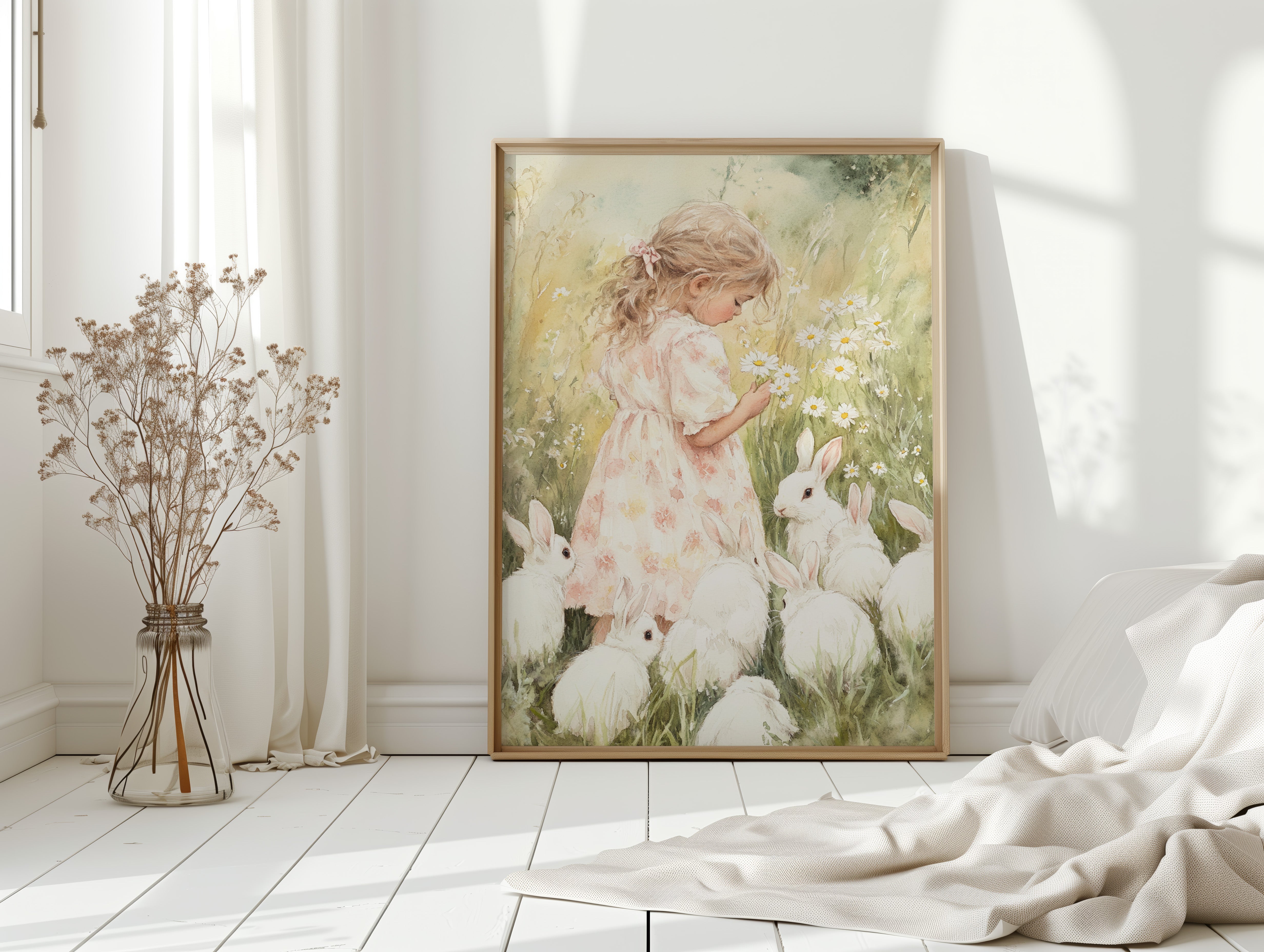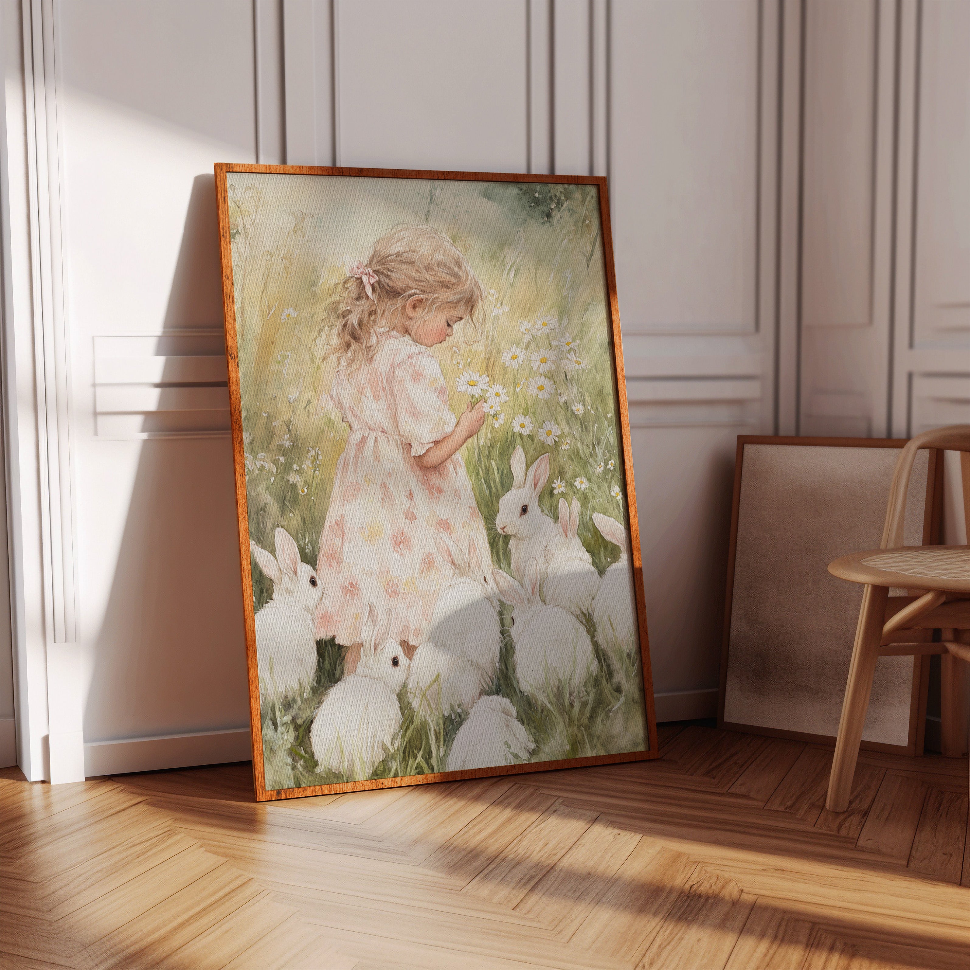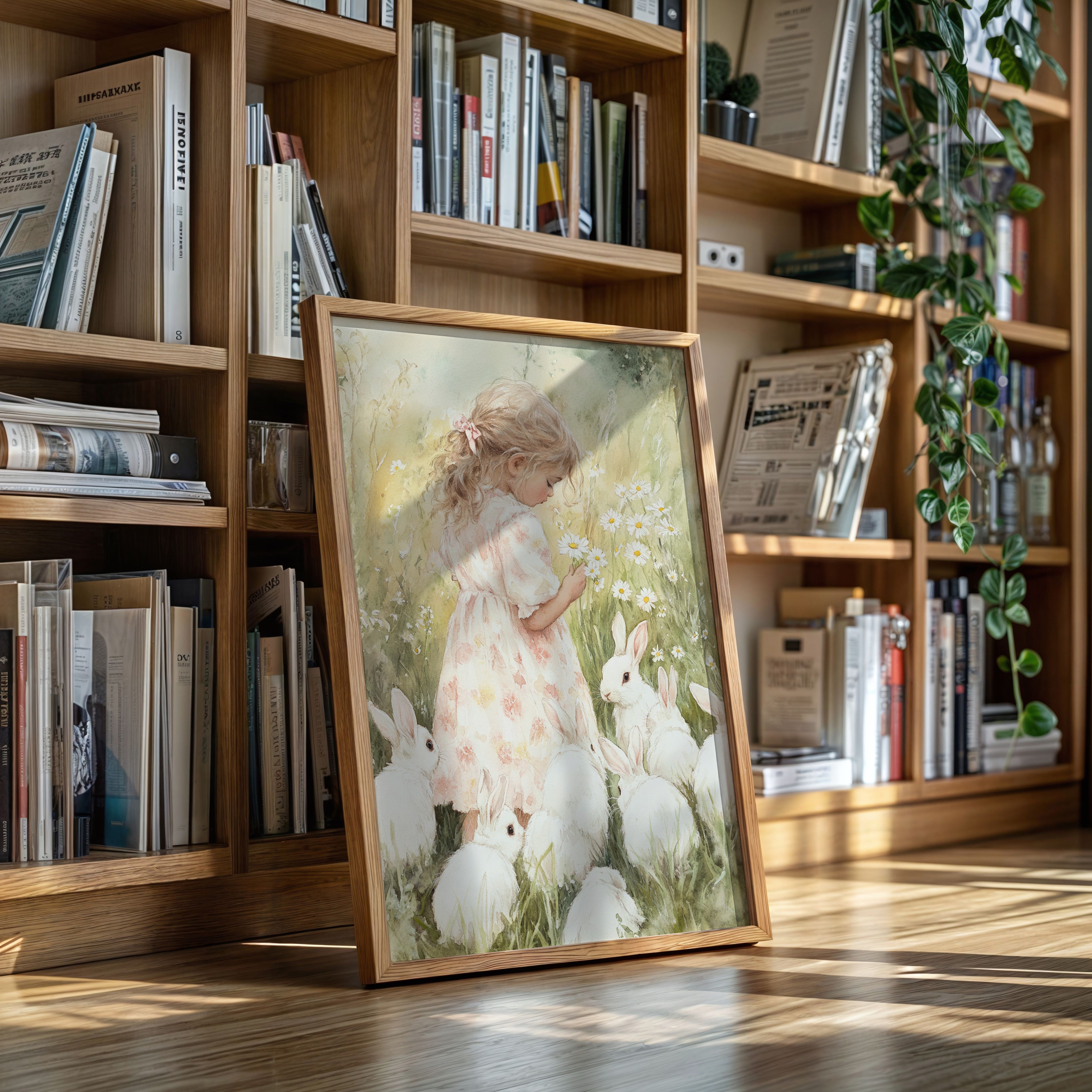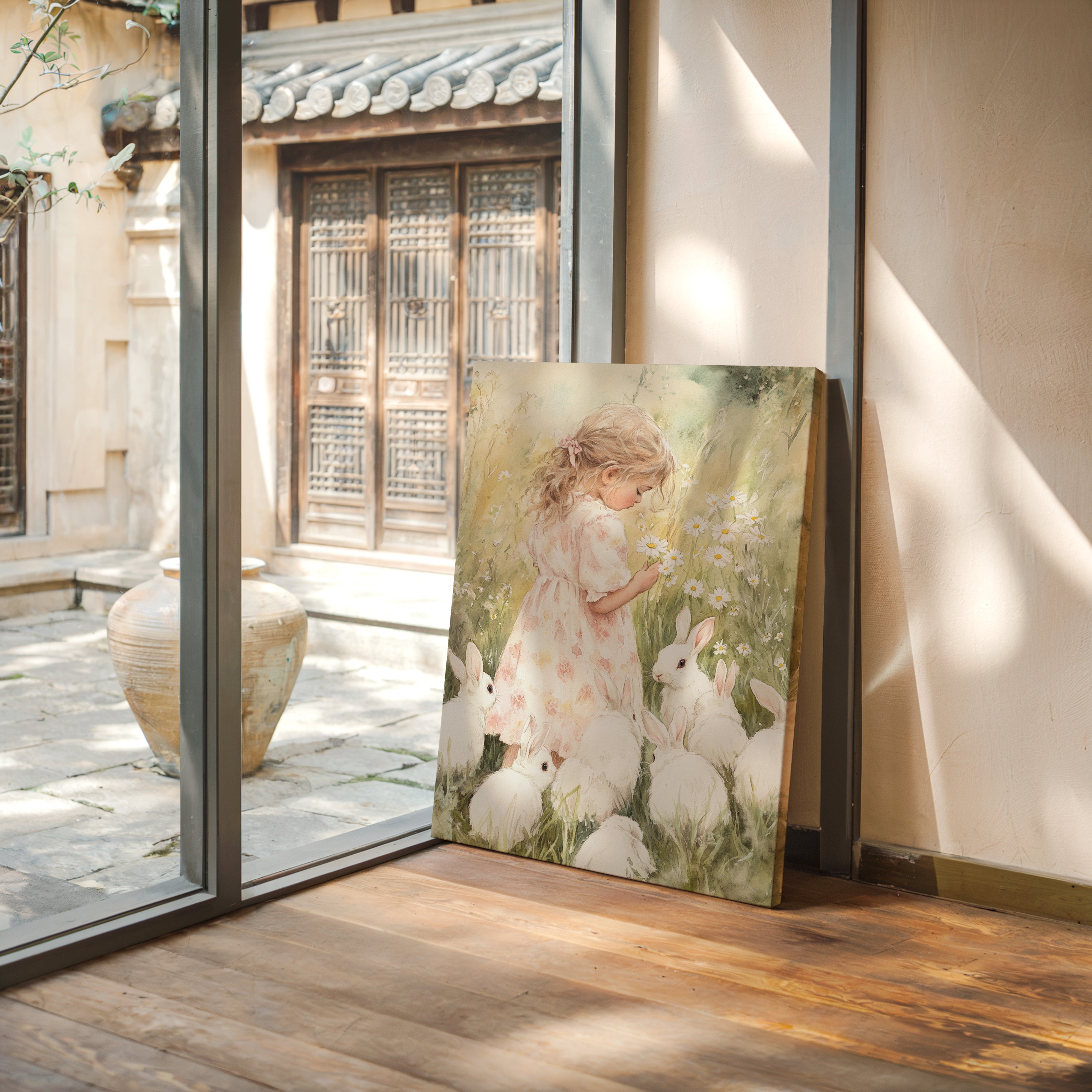 Step into a serene world where innocence meets nature. This enchanting piece captures a tender moment as a young girl, surrounded by curious white rabbits, gently holds daisies in a sunlit meadow. The soft pastel tones and delicate brushstrokes evoke a sense of nostalgia and tranquility, perfect for adding a touch of whimsy to any room. Ideal for nurseries or spaces seeking a dash of cottagecore charm, this artwork invites viewers to pause and relish the simple joys of life.