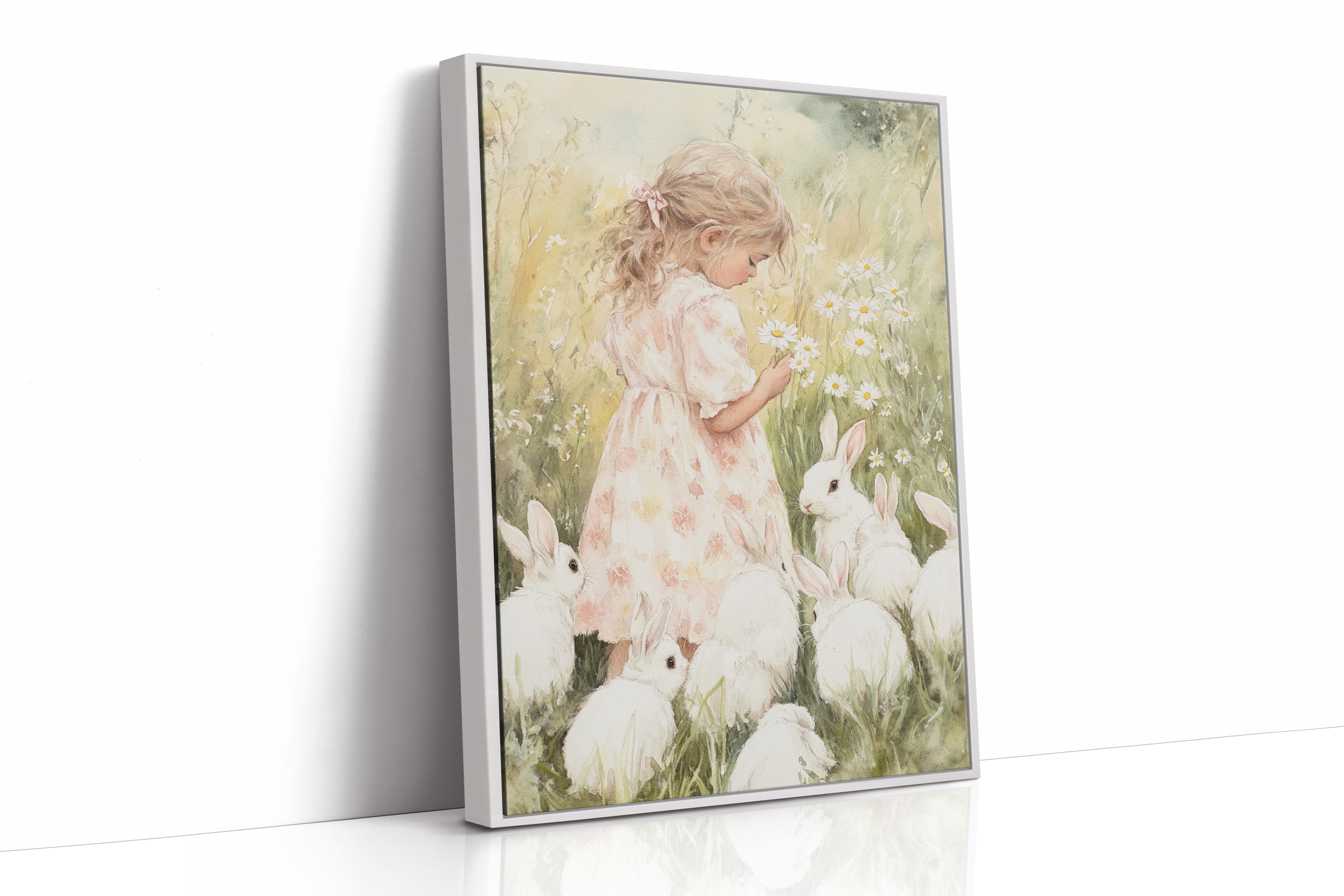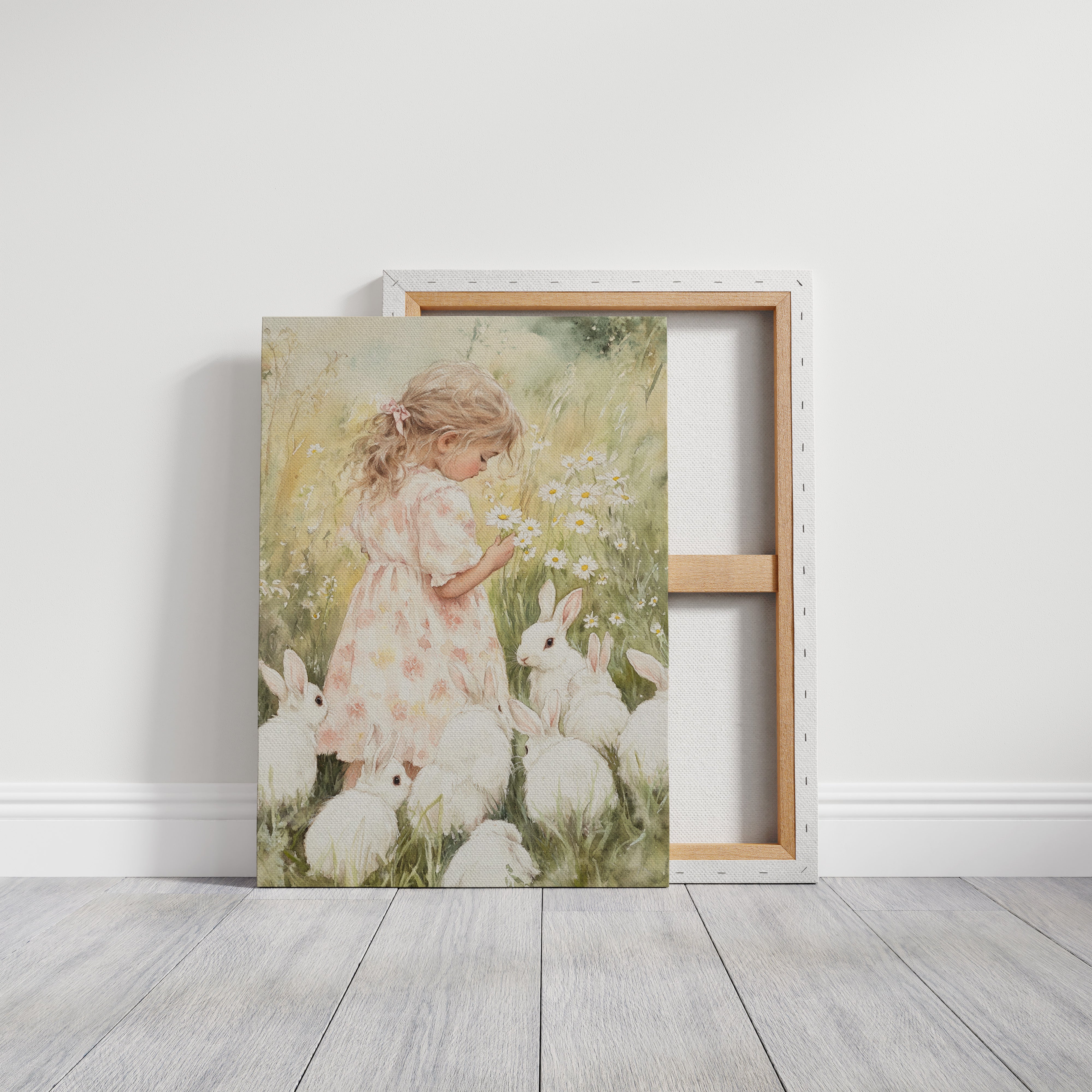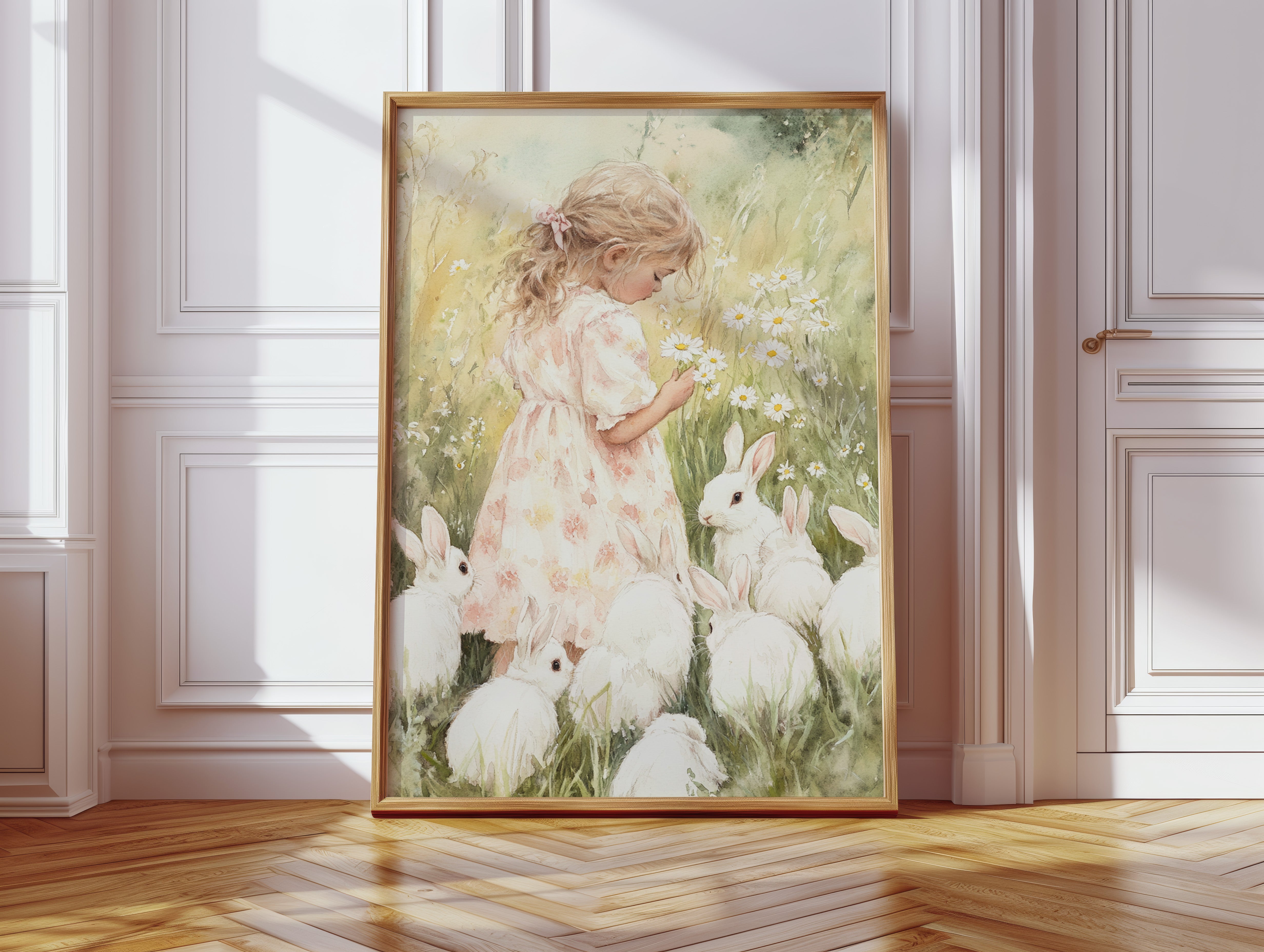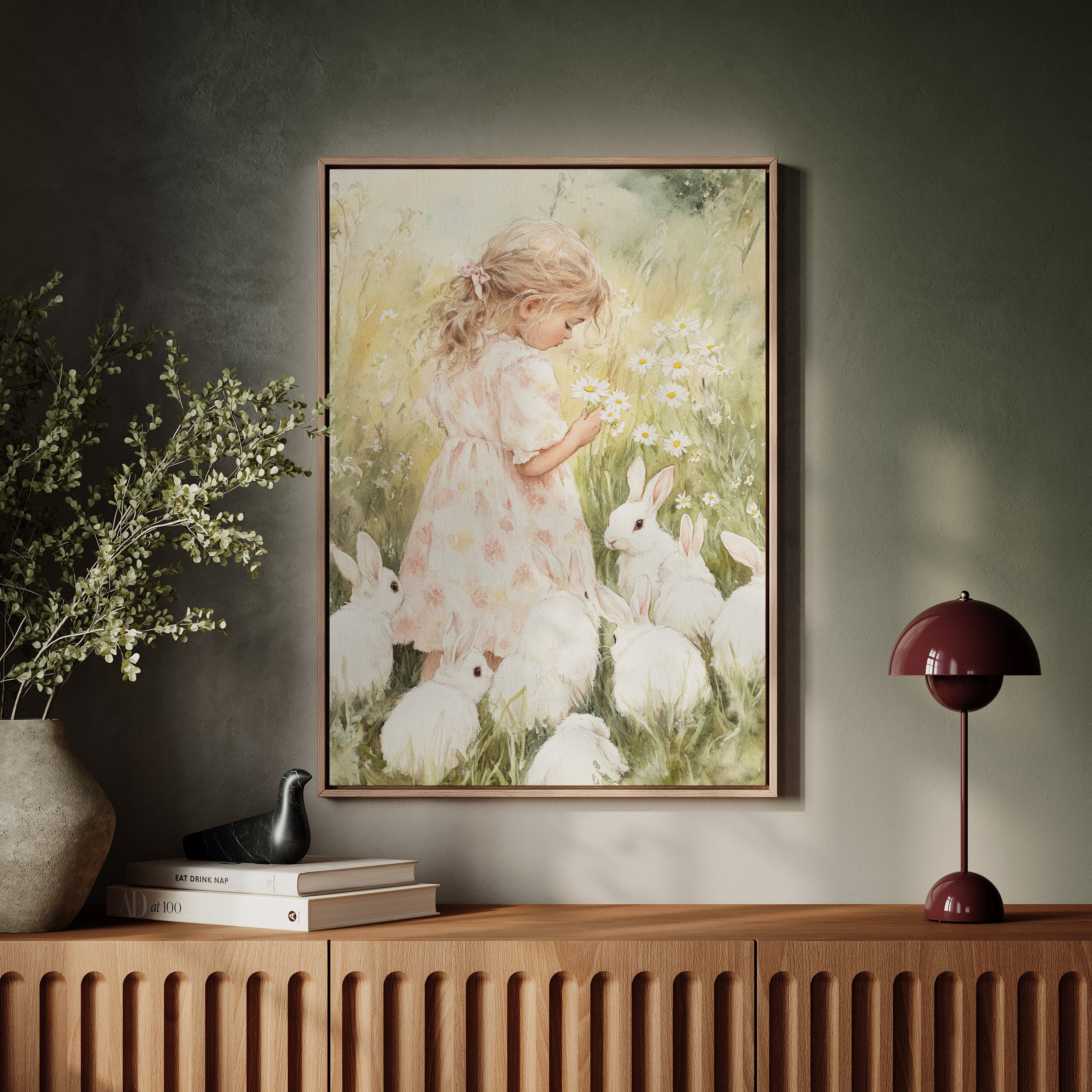 Step into a serene world where innocence meets nature. This enchanting piece captures a tender moment as a young girl, surrounded by curious white rabbits, gently holds daisies in a sunlit meadow. The soft pastel tones and delicate brushstrokes evoke a sense of nostalgia and tranquility, perfect for adding a touch of whimsy to any room. Ideal for nurseries or spaces seeking a dash of cottagecore charm, this artwork invites viewers to pause and relish the simple joys of life.