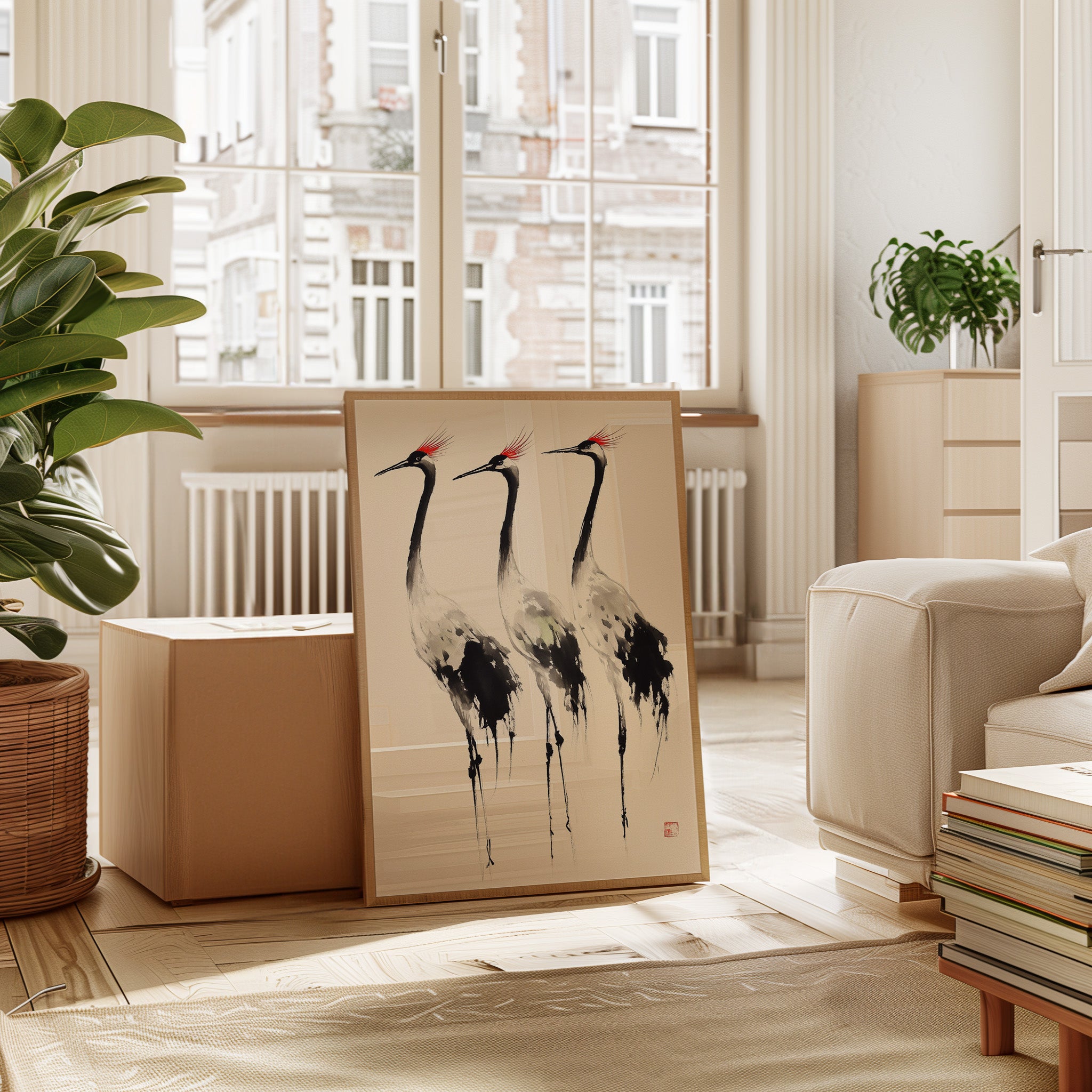 Step into a realm of serene beauty with 'Cranes Tranquil Elegance,' where the graceful dance of cranes is rendered in delicate brushstrokes. This piece captures the essence of minimalism, evoking a sense of peace and harmony. Perfect for those who cherish the simplicity of Japandi style, this artwork is a gentle reminder of nature's timeless grace. Whether gracing a modern living space or a cozy sanctuary, its calming presence will elevate any room, inviting moments of mindfulness and reflection. SKU: AL0030