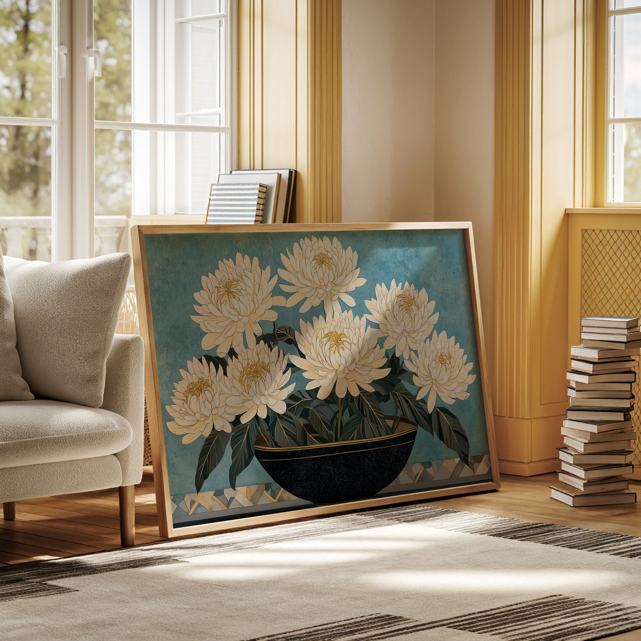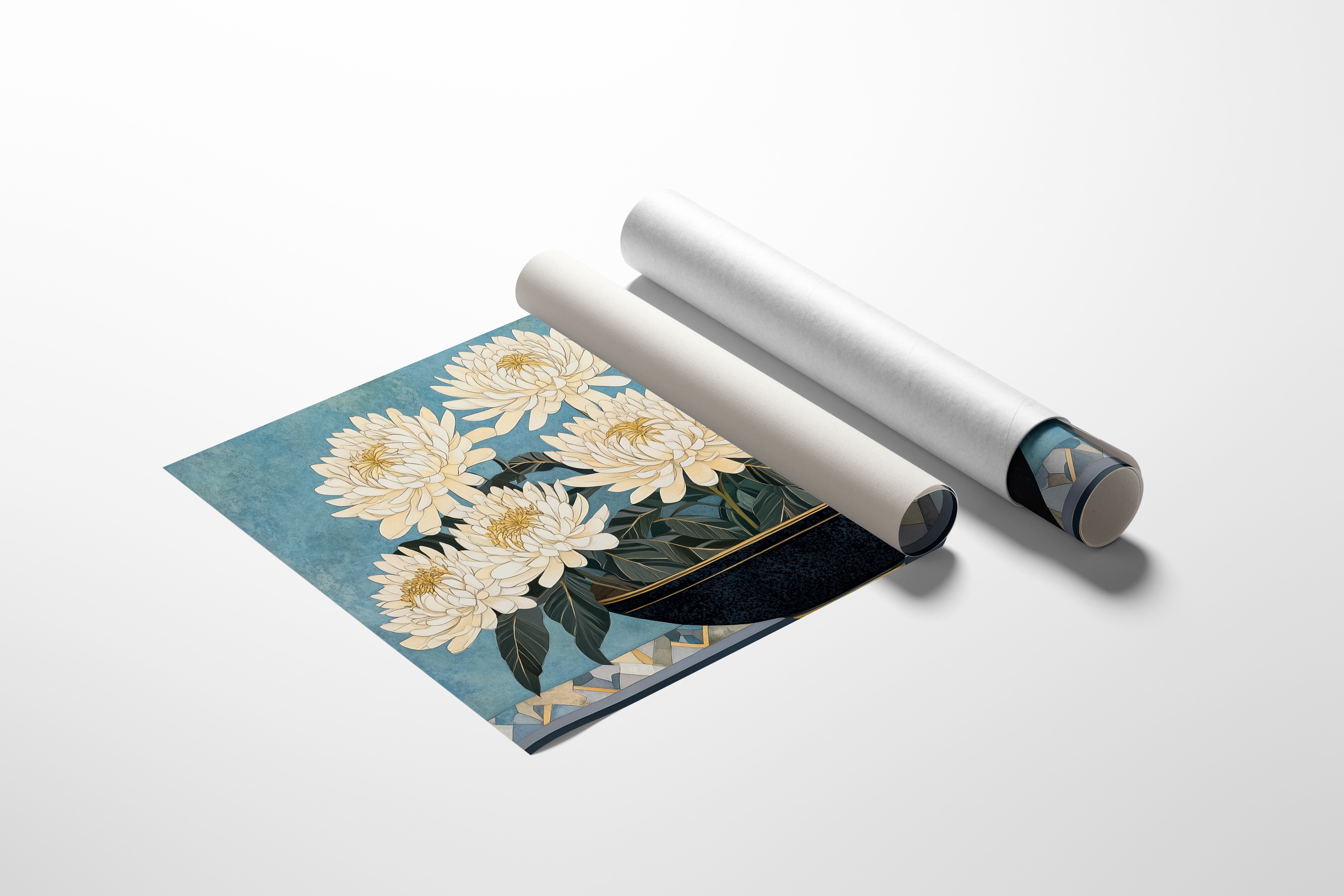 Creamy white blooms unfold like paper fans against a serene blue backdrop, their petals catching subtle hints of golden light at their centers. The chrysanthemums rest regally in a midnight-black bowl trimmed with gold, their dark green leaves creating a dramatic contrast to the delicate flowers. Below, a geometric pattern adds a modern touch to this otherwise traditional arrangement, while the textured blue background provides a perfect canvas for this elegant botanical display. This sophisticated piece would bring timeless grace to a dining room or create a striking focal point in an entryway, particularly when paired with modern furnishings.