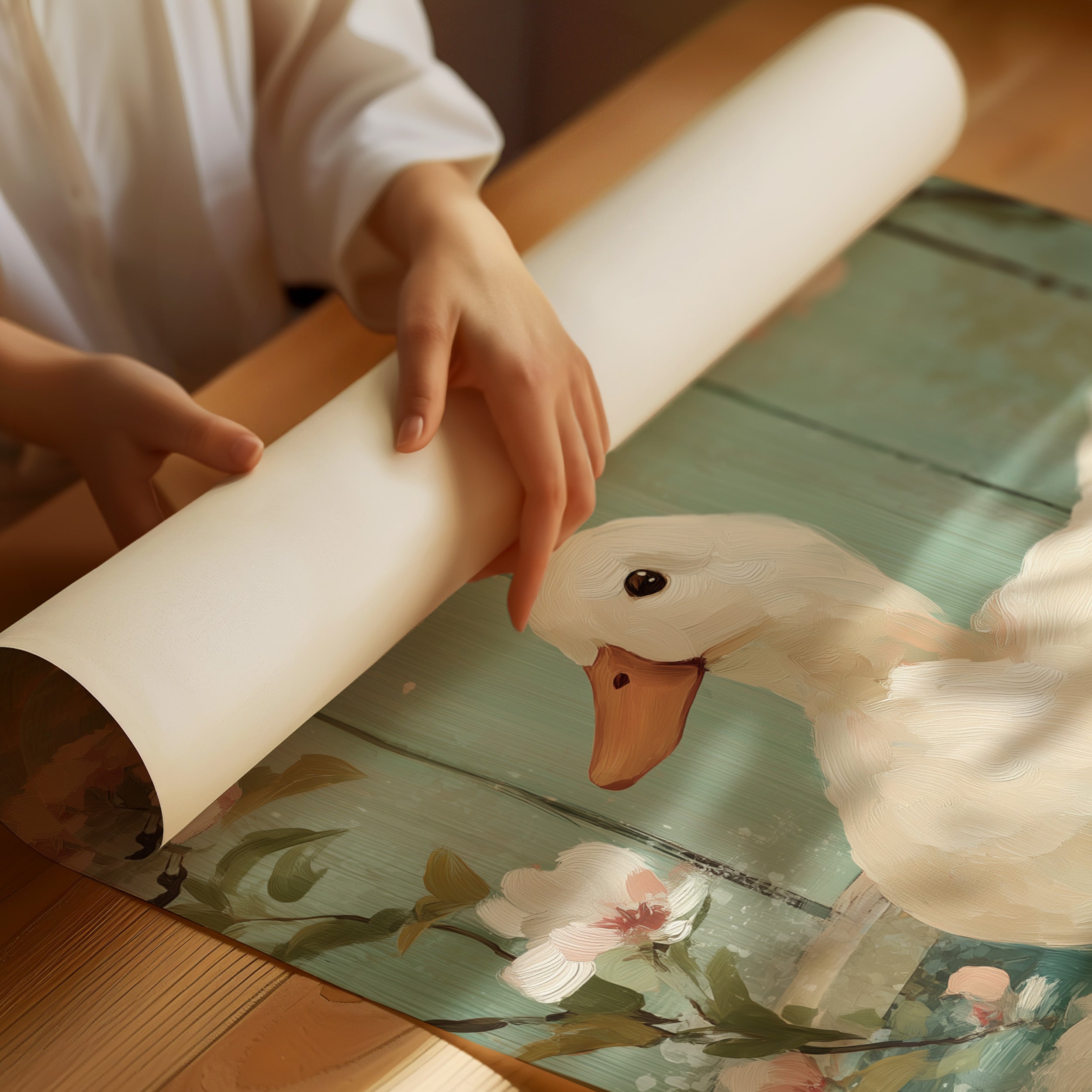 A gentle scene unfolds as a pristine white duck rests among delicate cherry blossoms, set against a soothing sage-green background. The artwork captures a moment of serene beauty, with soft pink petals dancing around the duck's peaceful form, creating a harmonious balance between nature's creatures and spring's tender blooms. The contemporary composition merges farmhouse charm with modern sophistication through its refined color palette and elegant simplicity. This piece would bring a breath of fresh air to a bright breakfast nook or serve as a graceful focal point in a modern farmhouse living space.