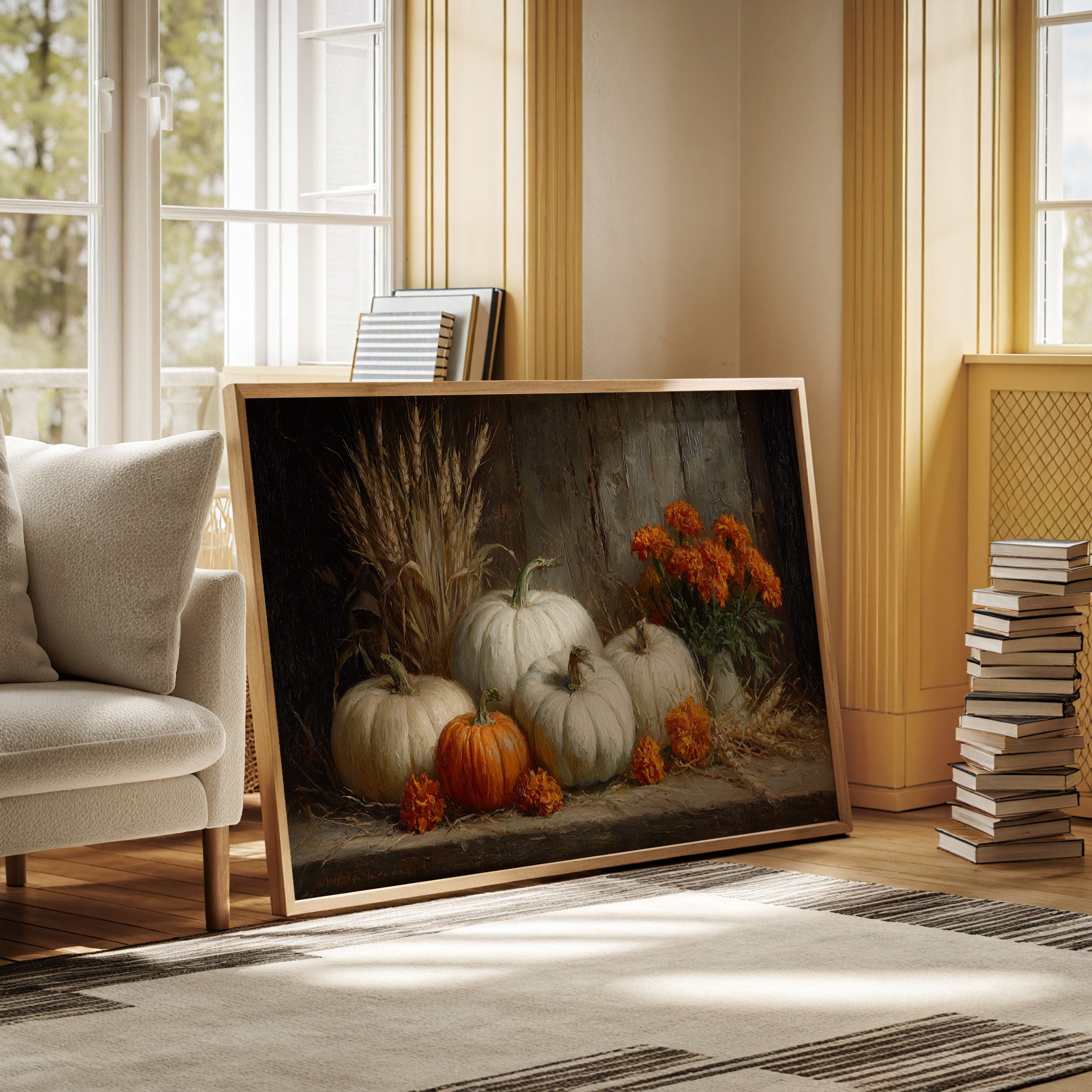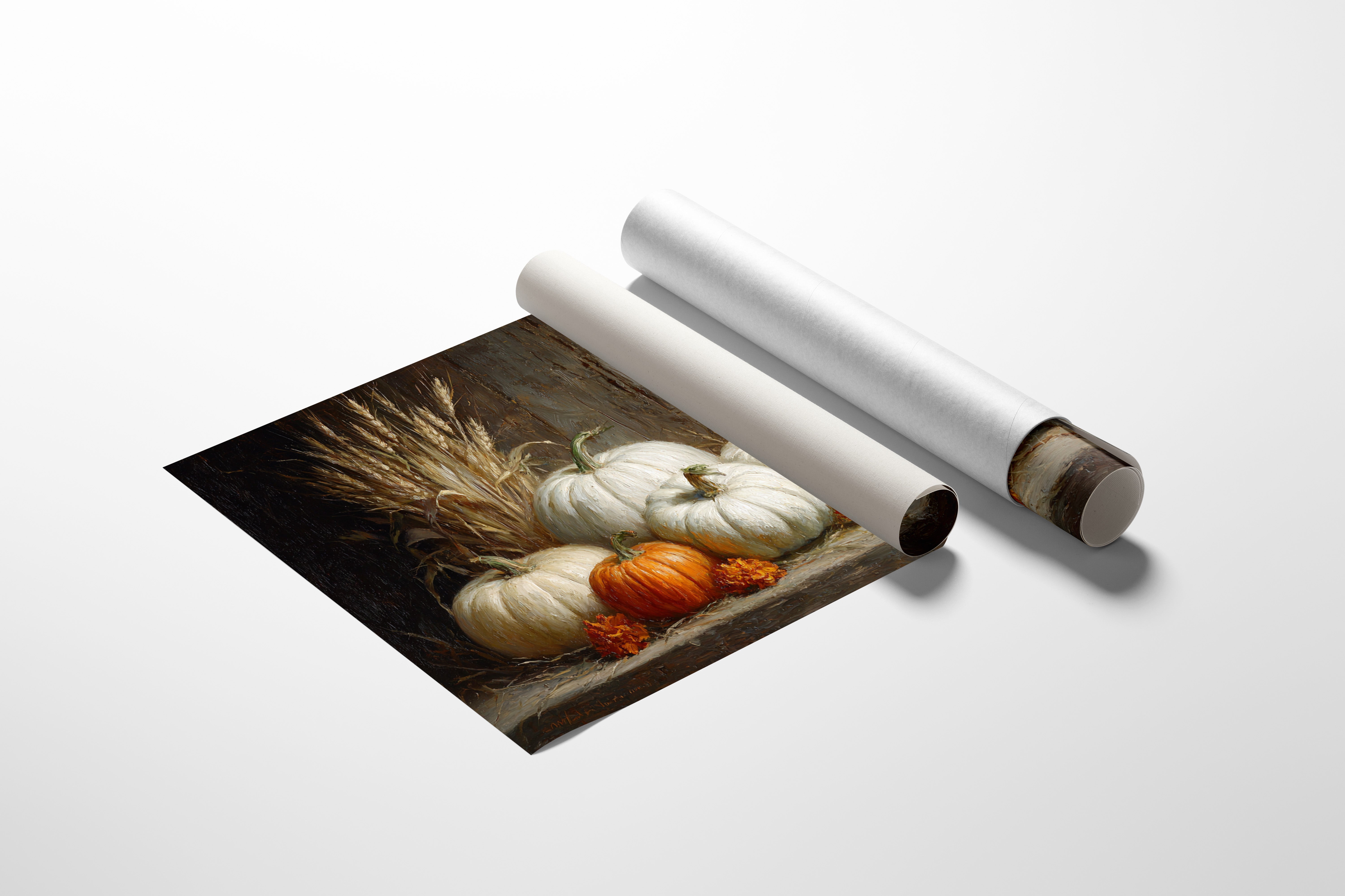 Soft autumn light caresses a collection of pristine white pumpkins, their pale forms creating a gentle contrast against weathered wood. A single vibrant orange pumpkin stands boldly among its ivory companions, while fiery marigolds burst forth like captured sunsets. Golden wheat stalks frame the scene, their delicate stems adding height and movement to this seasonal tableau. The rich textures and warm palette speak of harvest abundance, creating a sophisticated interpretation of fall's bounty. This piece would bring seasonal warmth to a dining room or create an elegant focal point in a modern farmhouse kitchen.