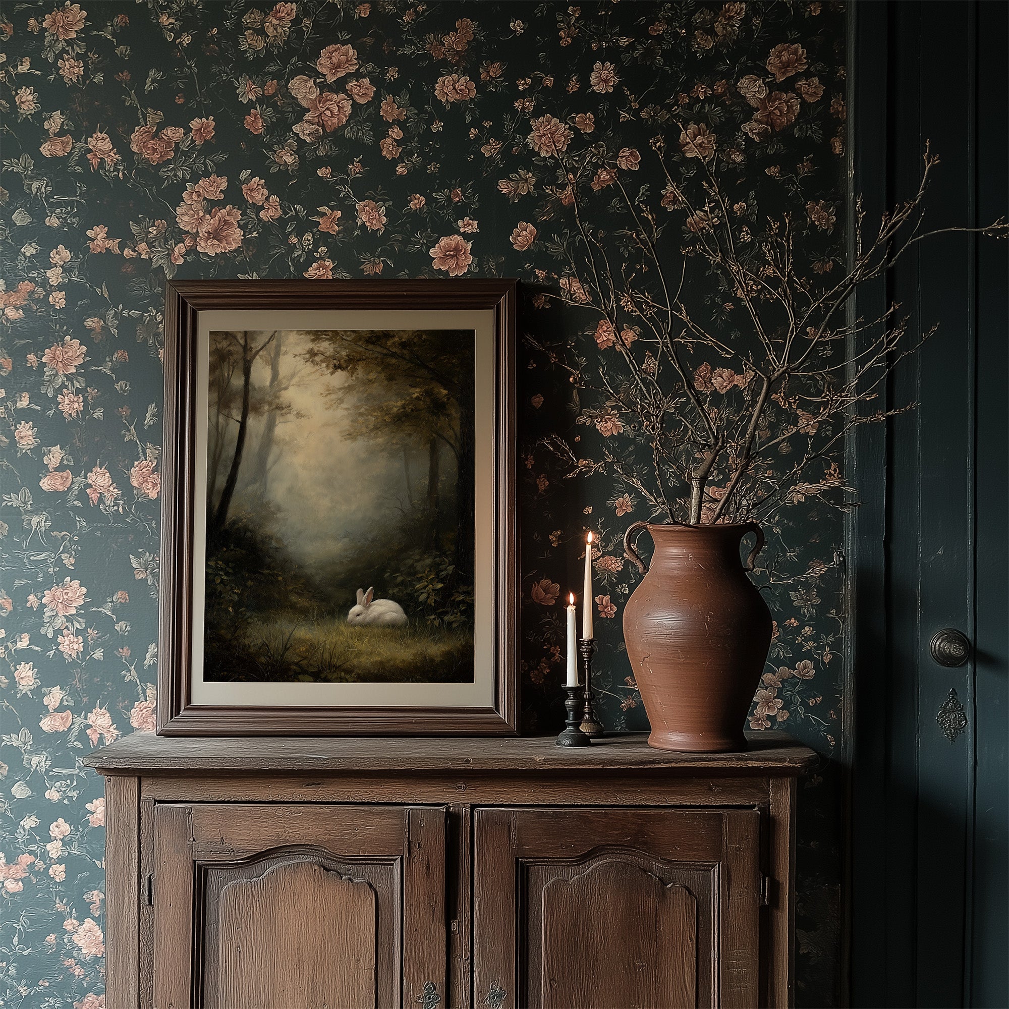 Morning fog lingers between ancient trees, cloaking the forest in mystery as a solitary white rabbit pauses in the clearing. The ethereal scene balances delicate innocence against the deep, unknowable woods, with golden light filtering through branches and illuminating fallen leaves. This atmospheric painting transforms any space into a contemplative sanctuary, particularly striking against dark walls where its misty palette and dreamlike quality can fully resonate.
