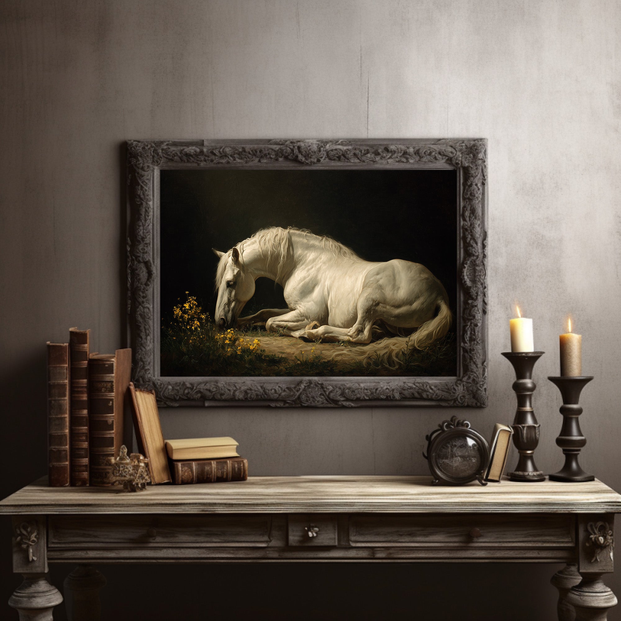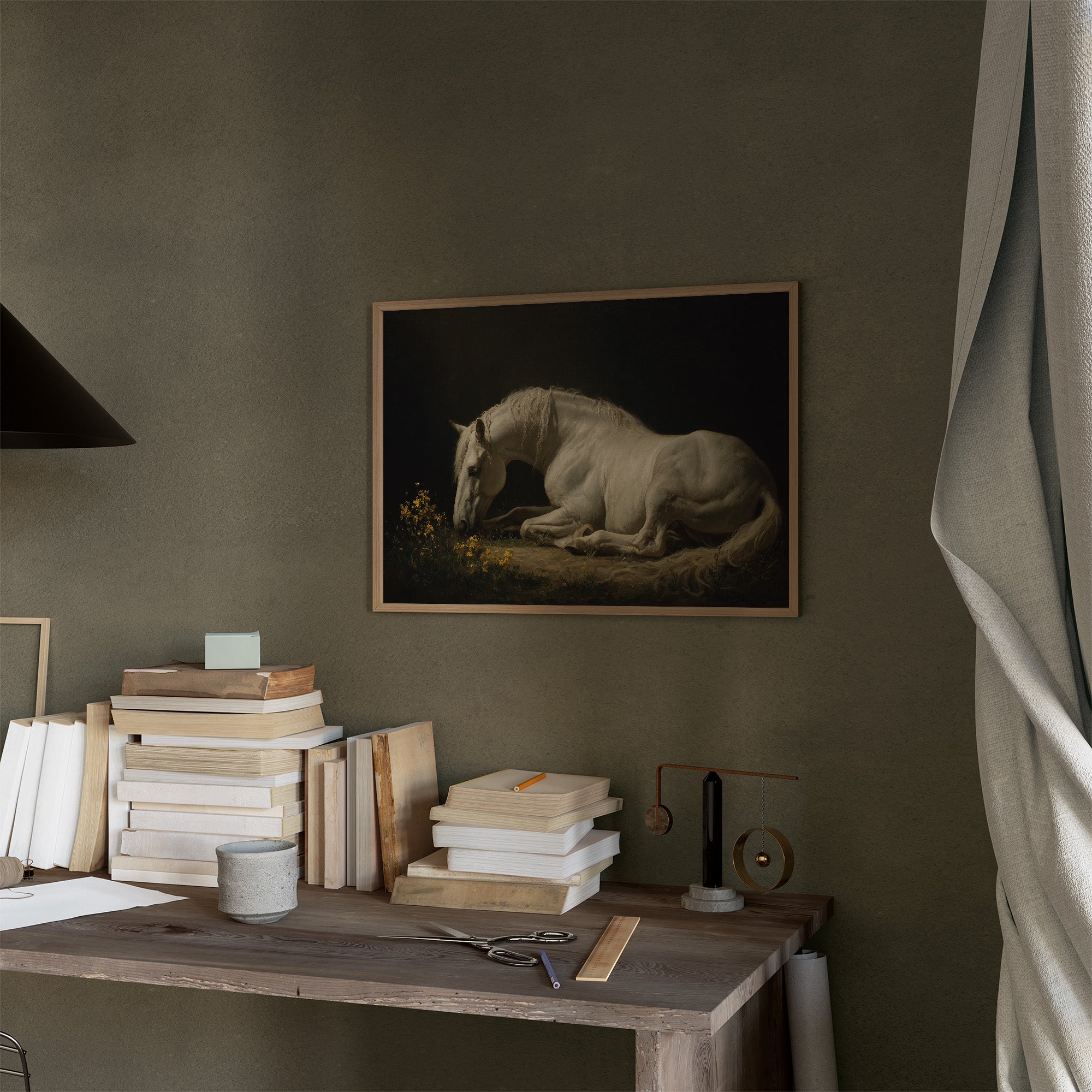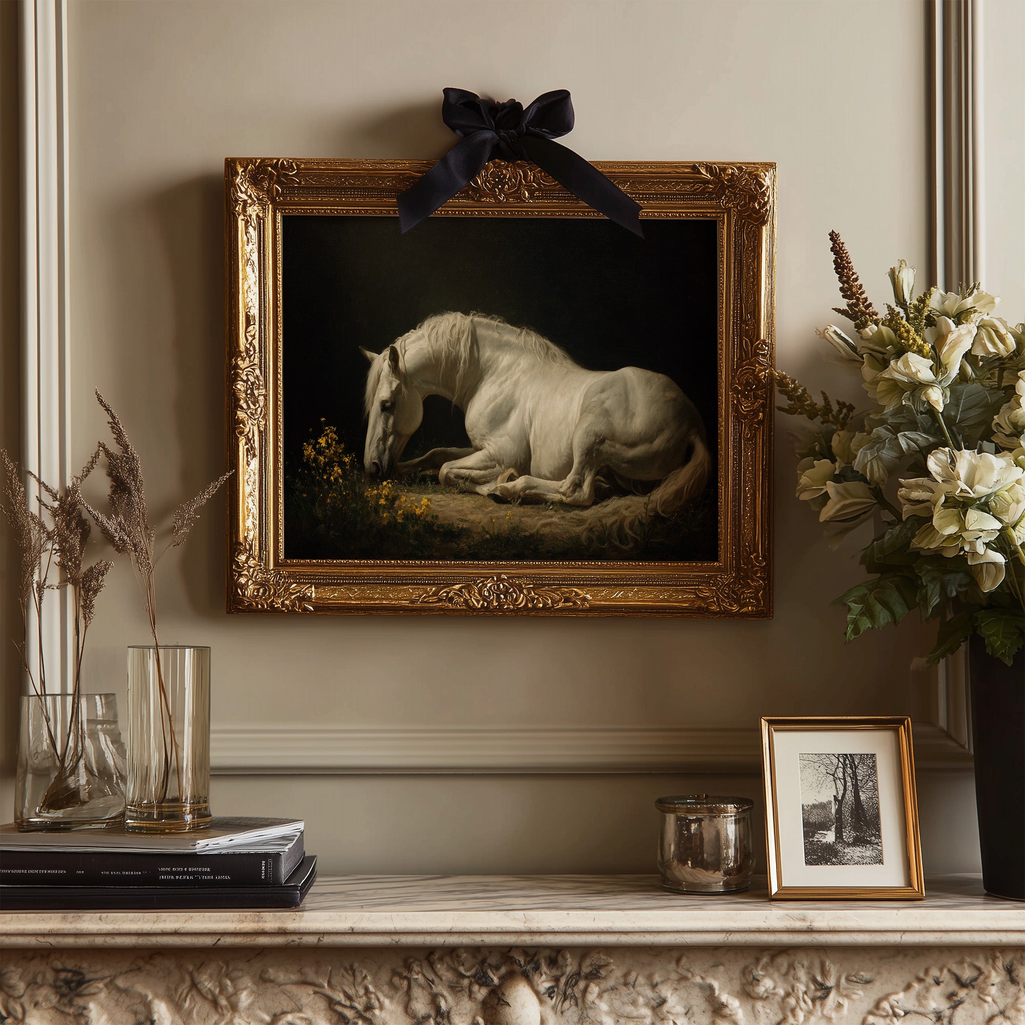 A moment of serene stillness captured in rich contrast. The luminous white horse rests against a dark backdrop, its powerful form softened by repose as it gazes toward delicate yellow wildflowers. The classical painting, framed in ornate bronze, stands proudly against a backdrop of countless books, their spines creating a tapestry of cream, burgundy, and navy hues. This elegant piece brings timeless equestrian grace to a study, library, or any space where contemplative beauty is treasured.