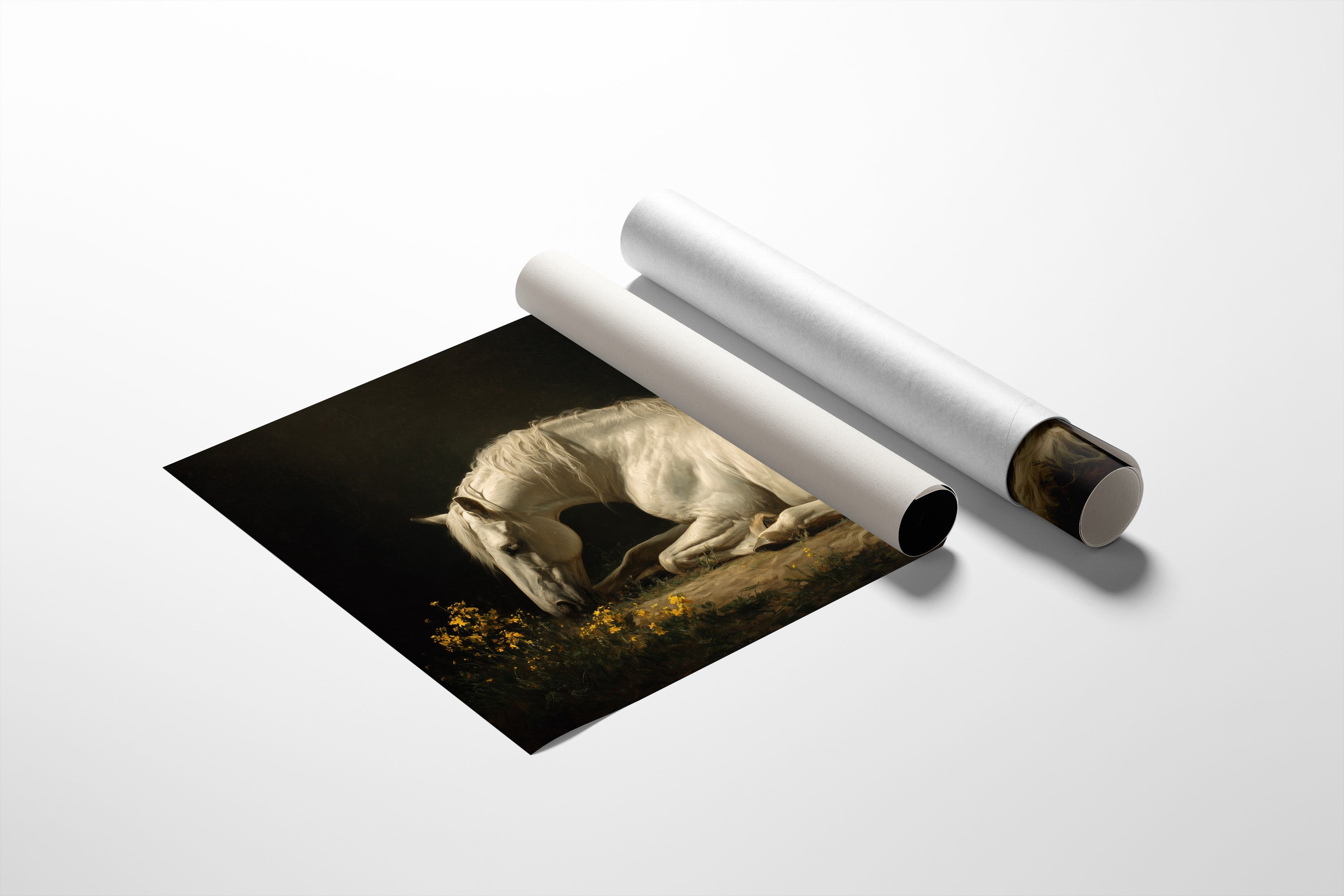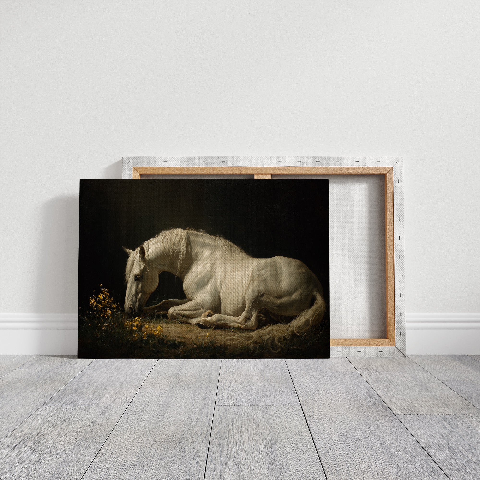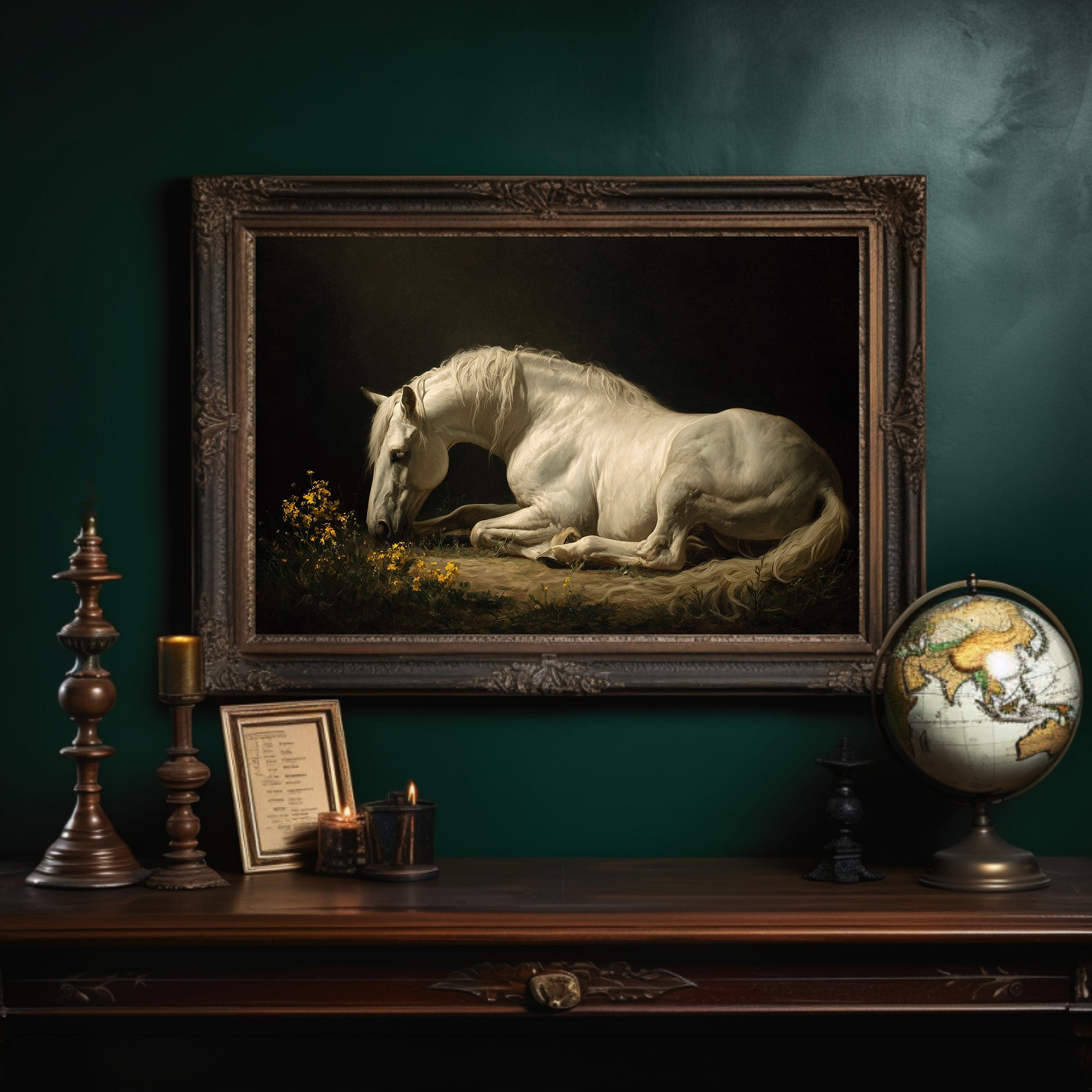 A moment of serene stillness captured in rich contrast. The luminous white horse rests against a dark backdrop, its powerful form softened by repose as it gazes toward delicate yellow wildflowers. The classical painting, framed in ornate bronze, stands proudly against a backdrop of countless books, their spines creating a tapestry of cream, burgundy, and navy hues. This elegant piece brings timeless equestrian grace to a study, library, or any space where contemplative beauty is treasured.