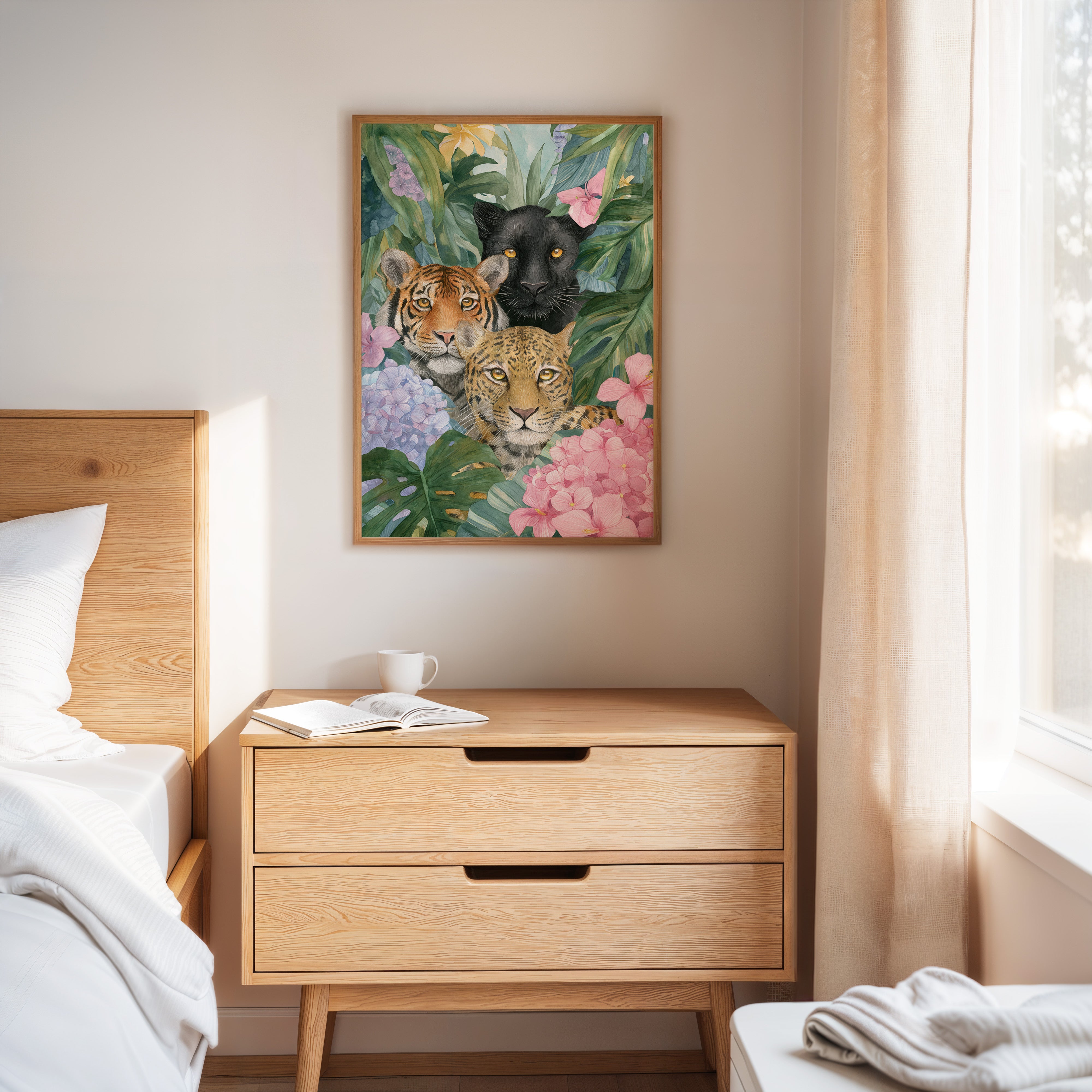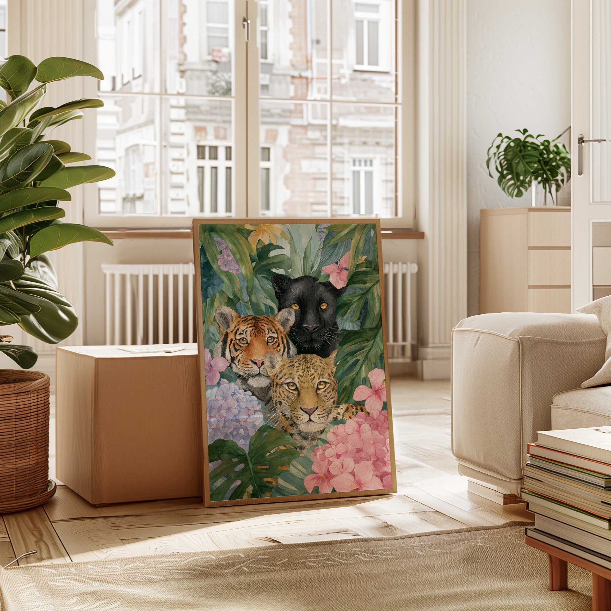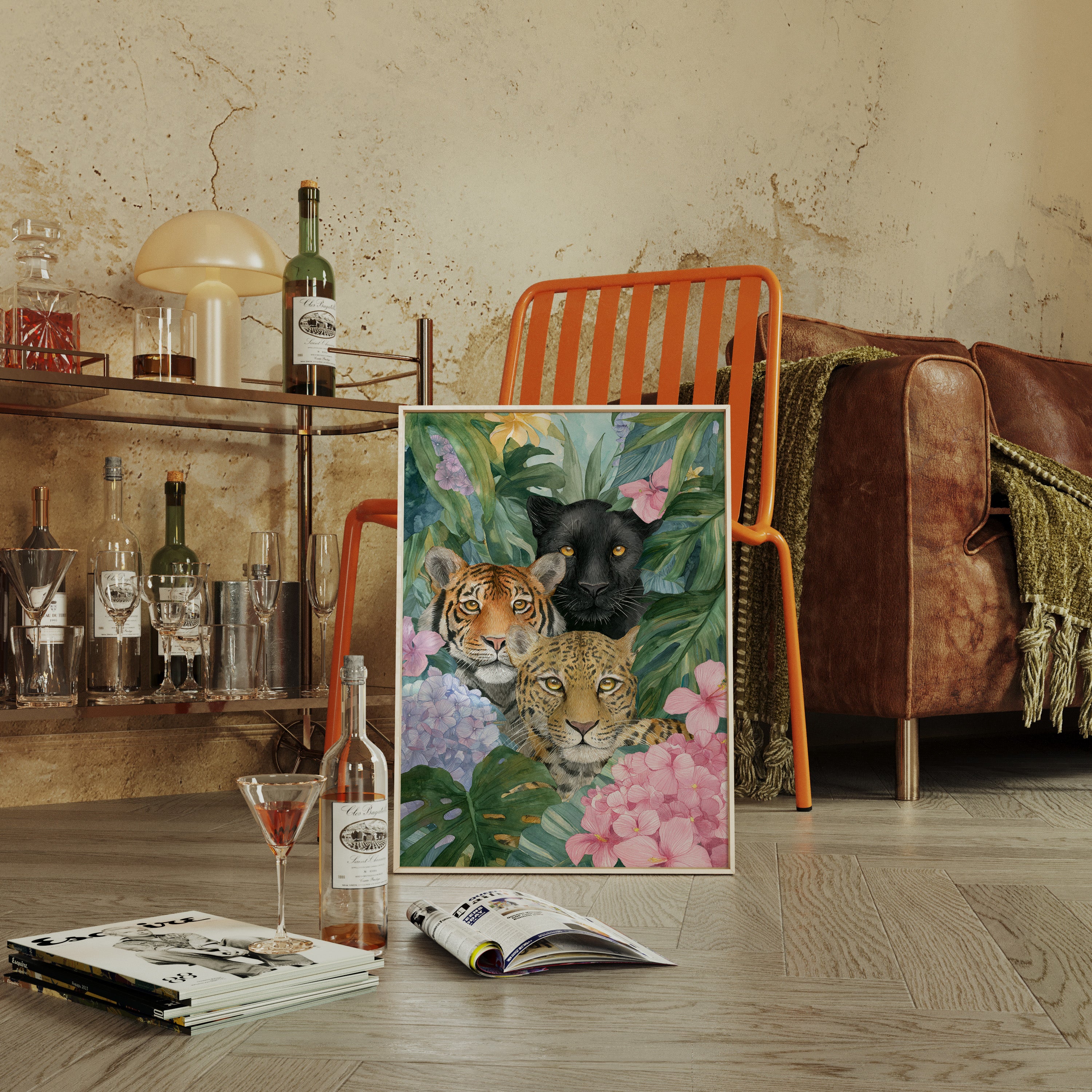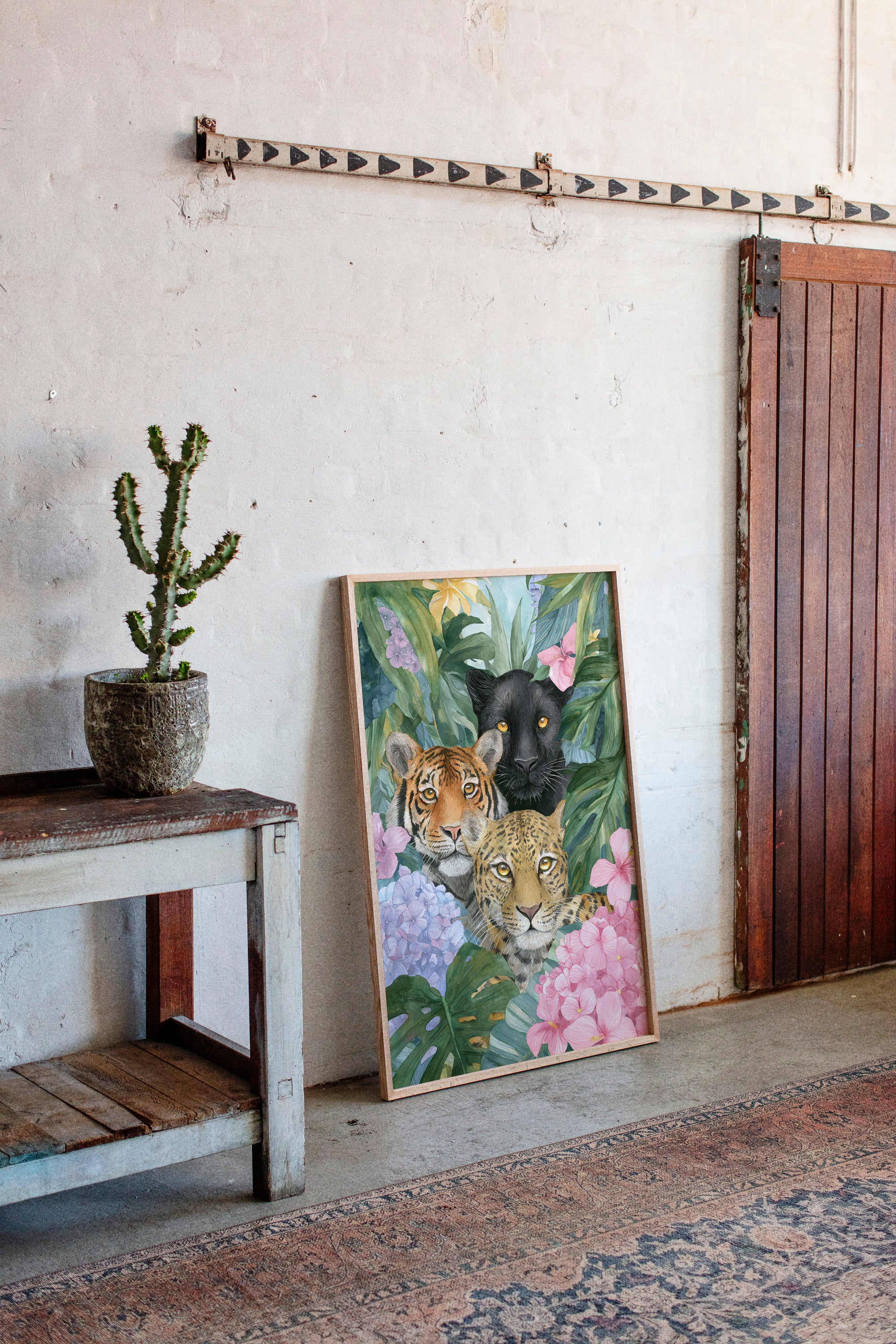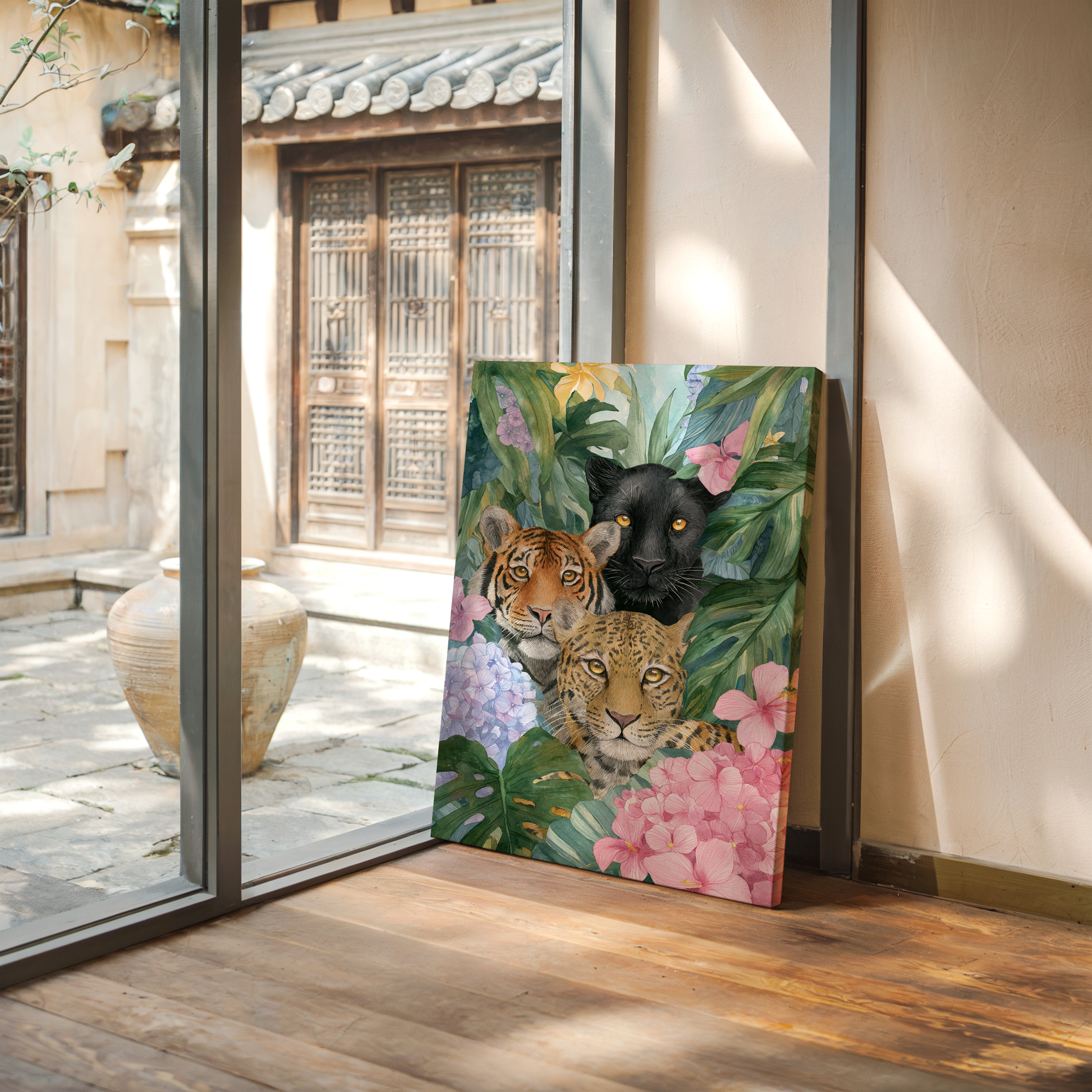 In the heart of a vibrant jungle, three majestic felines emerge, their gazes unyielding and wise. This piece celebrates the raw beauty of nature, intertwining the grace of wildlife with the lushness of flora. Each animal, from the fierce tiger to the enigmatic black panther, showcases intricate details, with hues of gold and rich earth tones harmonizing against the floral backdrop. Perfect for a nature lover's sanctuary, this piece invites the wild spirit into your home.