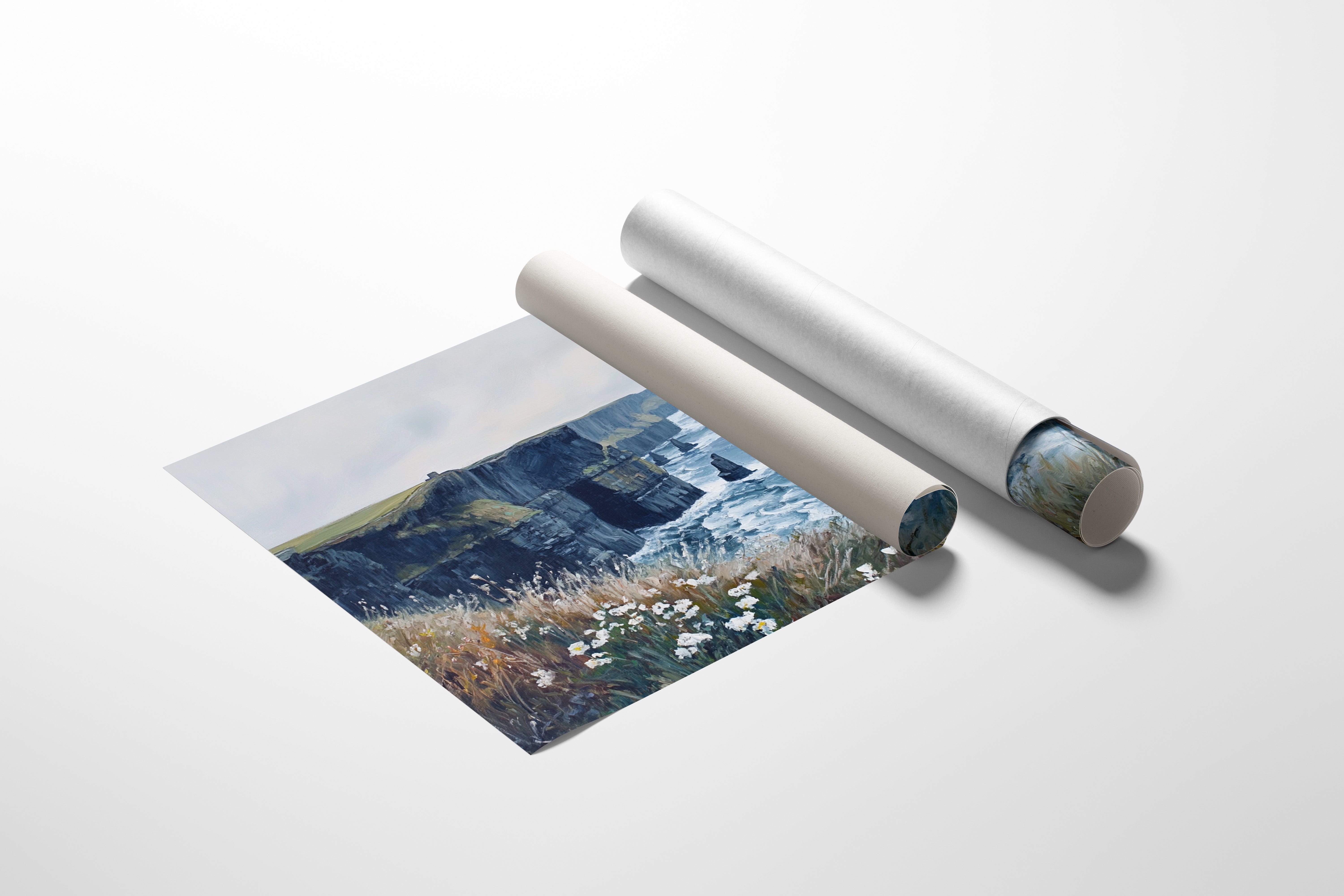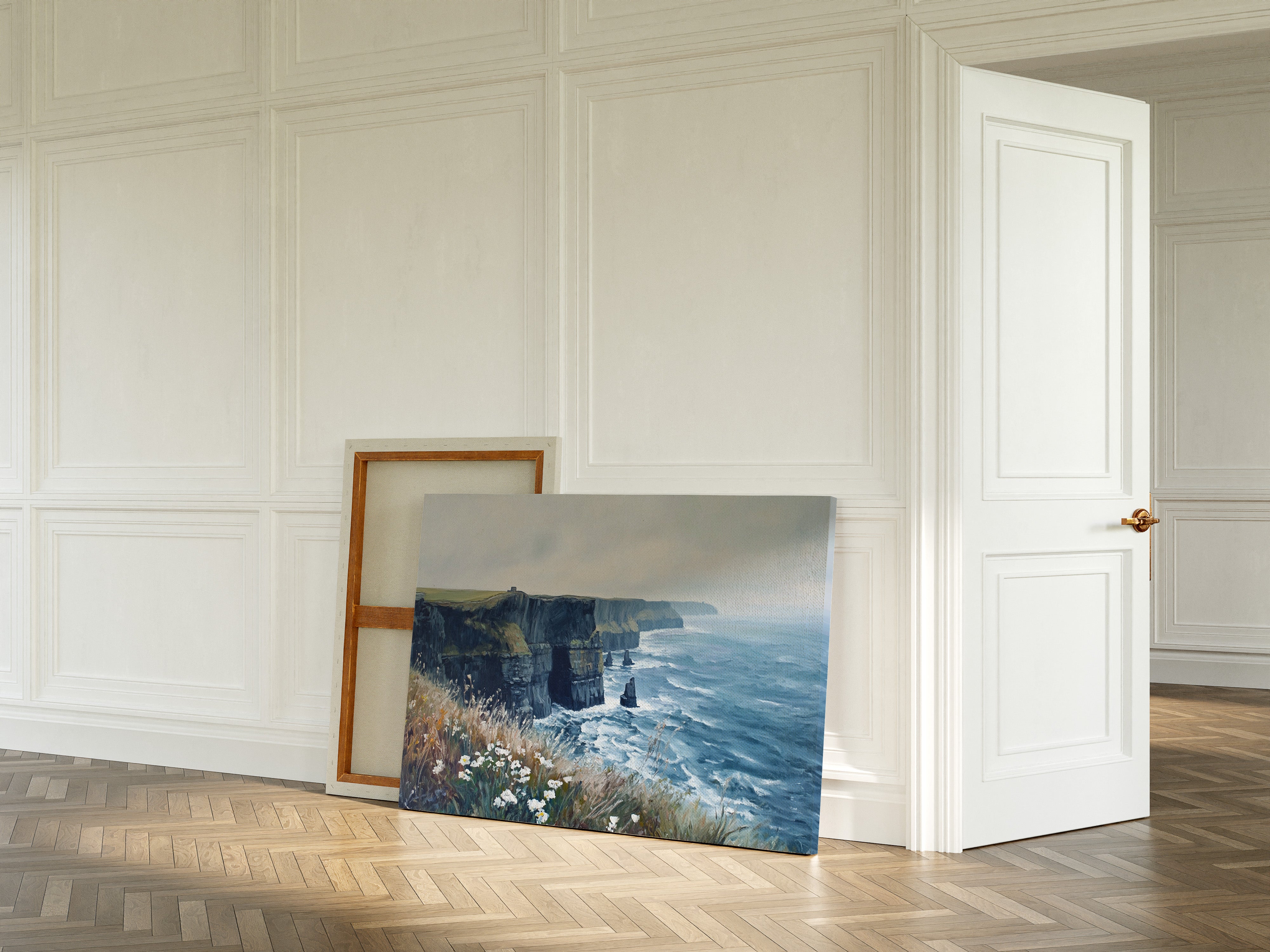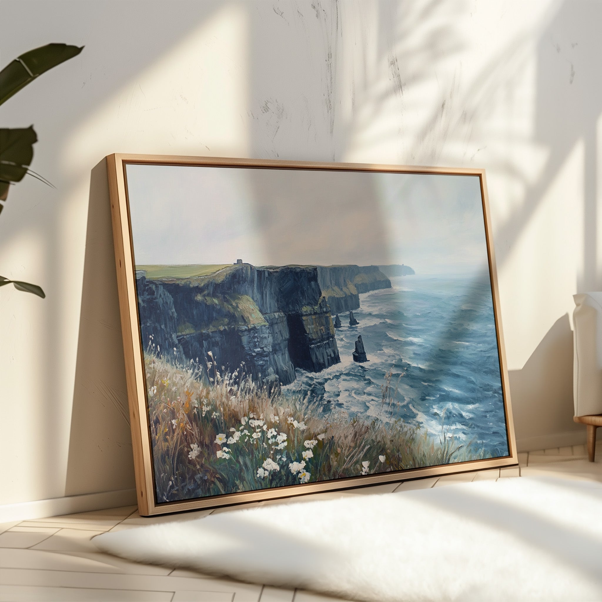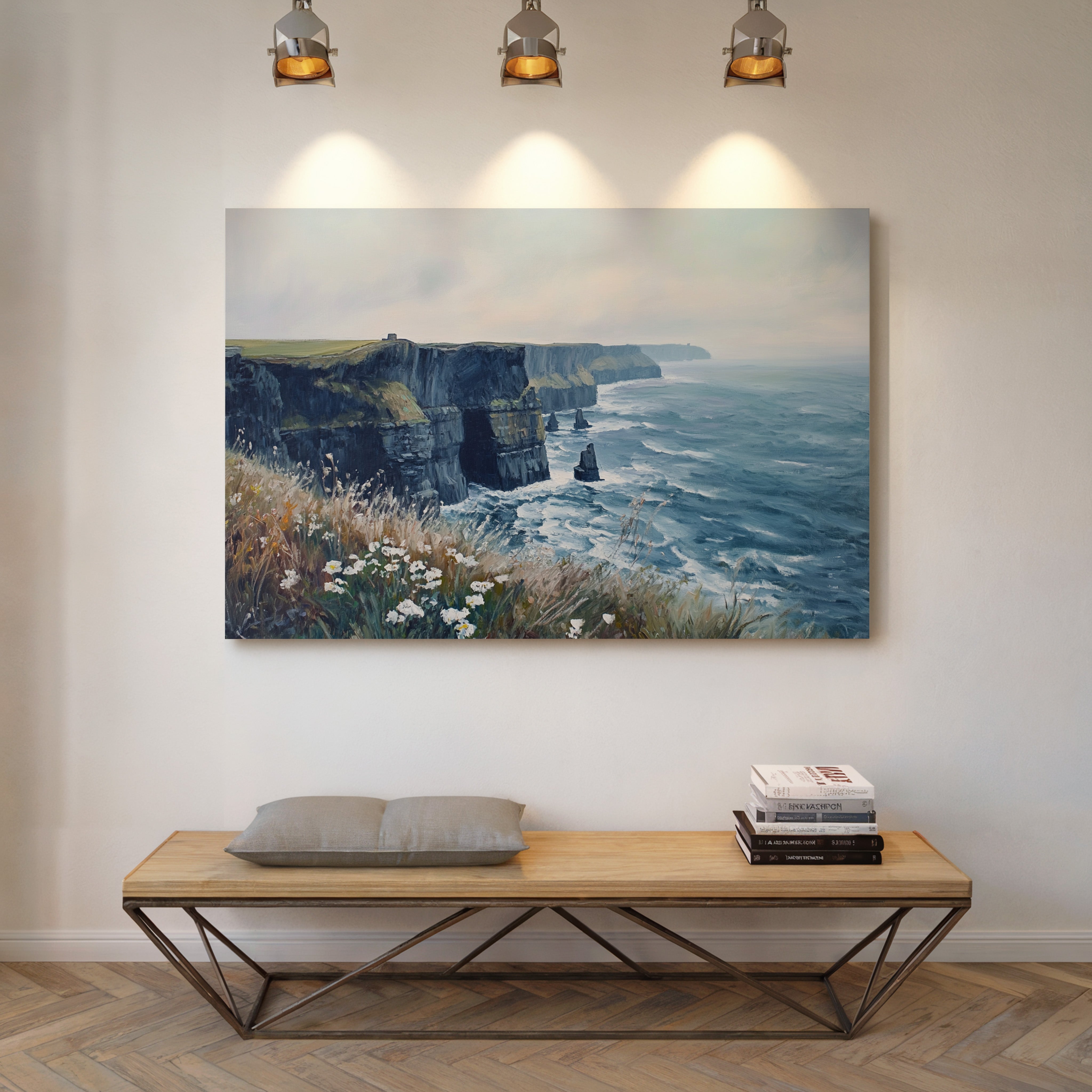 Delicate white daisies sway in the coastal breeze, standing sentinel at the edge of Ireland's mighty Cliffs of Moher. The dramatic dark slate walls plunge into churning azure waters below, creating a stunning contrast between gentle flora and raw geological power. Weathered limestone rises in majestic tiers, while scattered sea stacks stand like ancient guardians amid the foaming waves. This piece captures the wild romance of Ireland's western coast, where untamed nature writes its story in stone and sea spray.