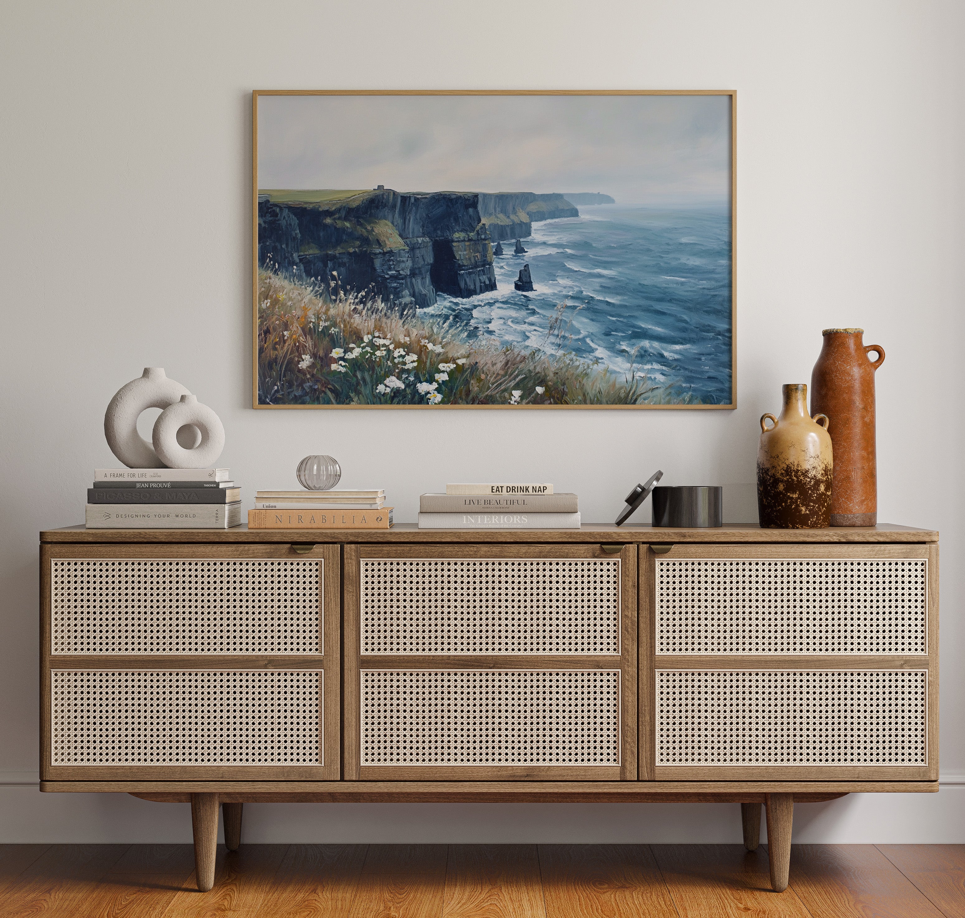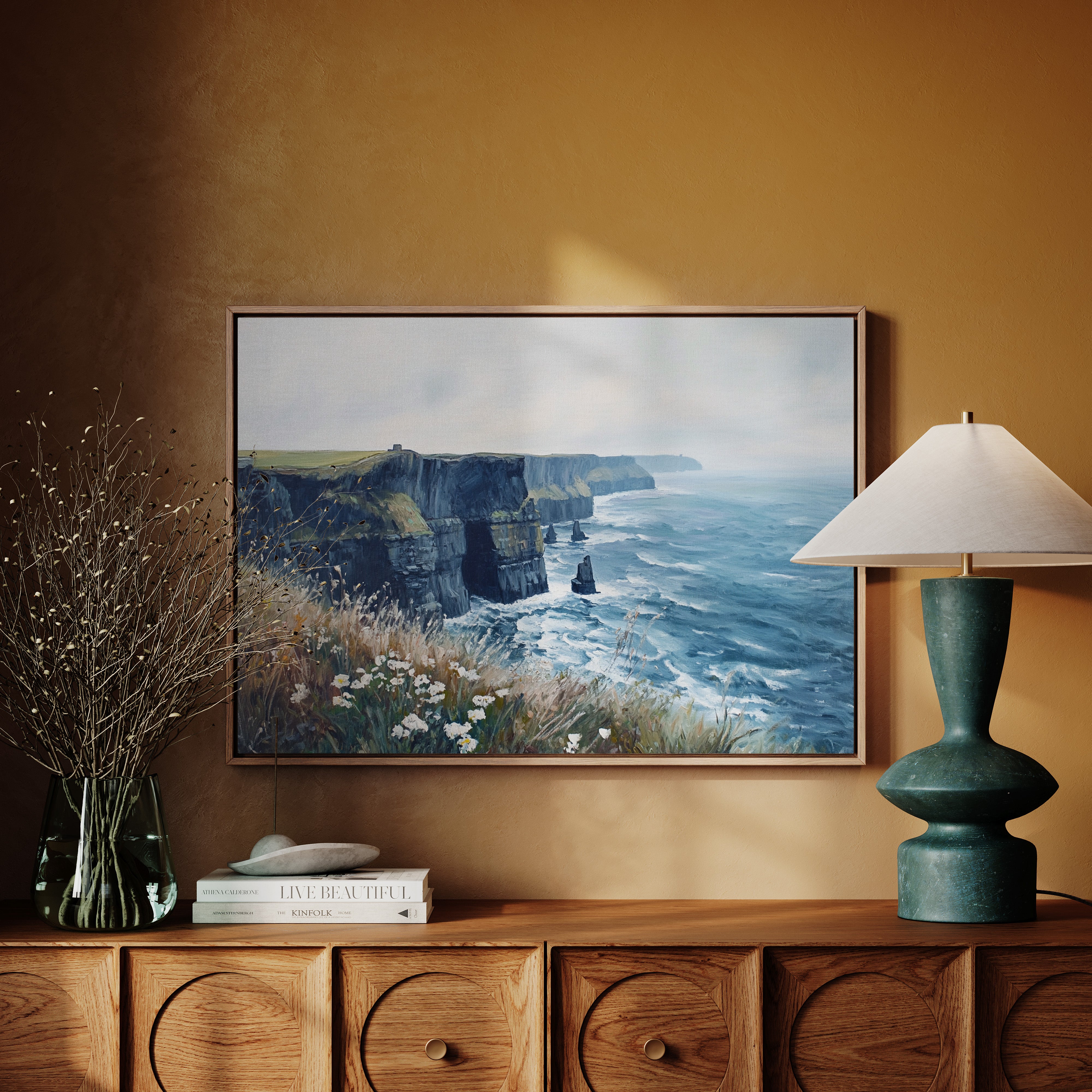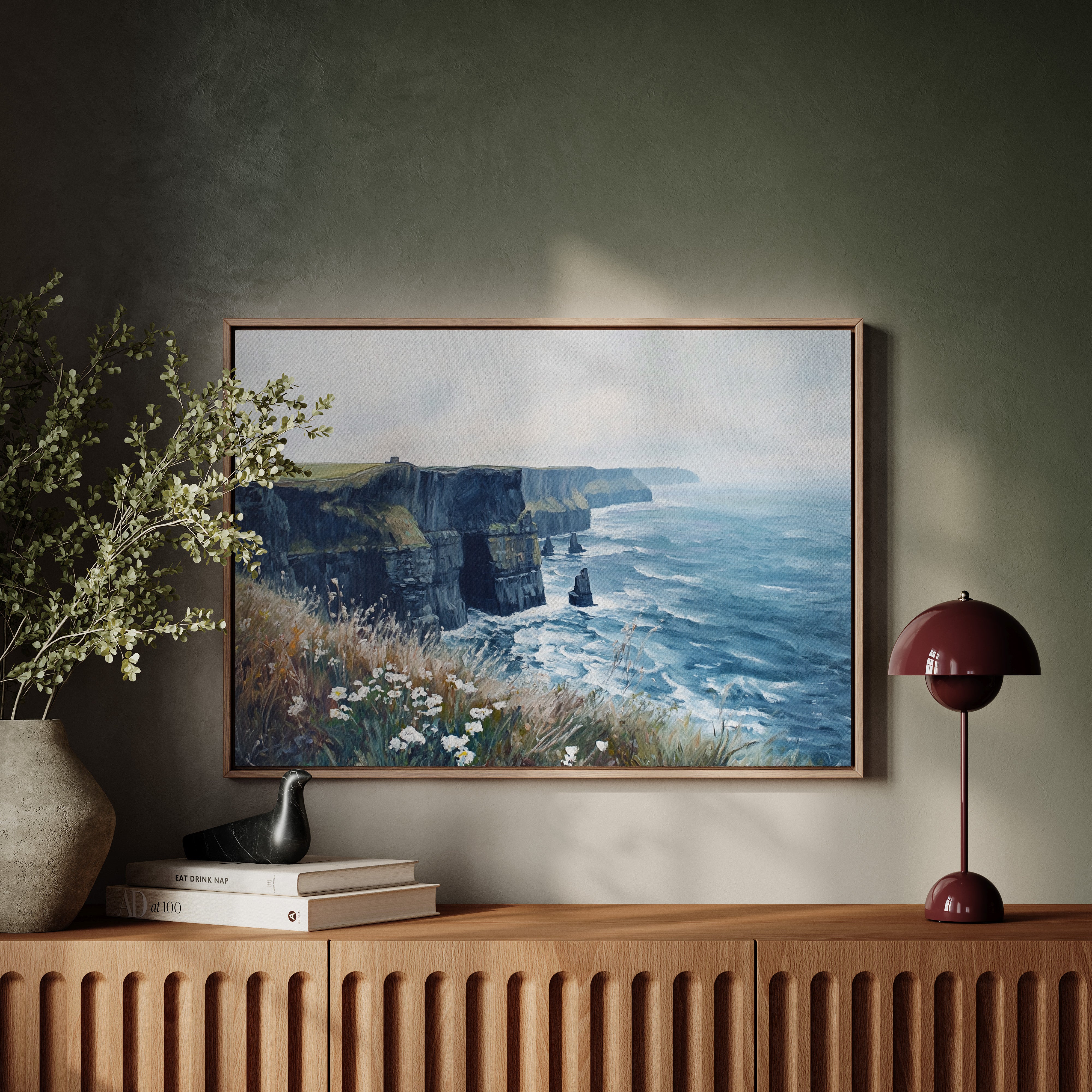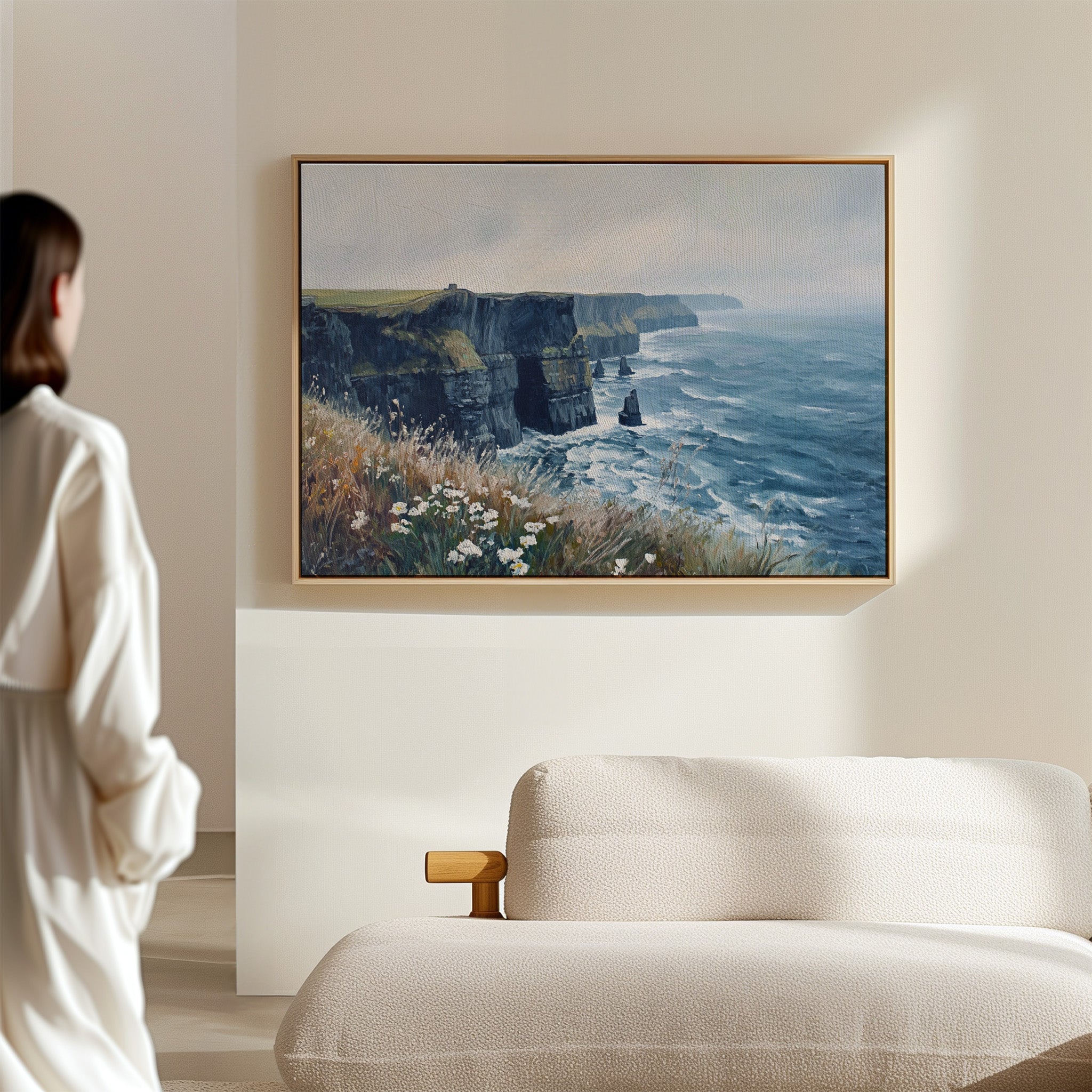Delicate white daisies sway in the coastal breeze, standing sentinel at the edge of Ireland's mighty Cliffs of Moher. The dramatic dark slate walls plunge into churning azure waters below, creating a stunning contrast between gentle flora and raw geological power. Weathered limestone rises in majestic tiers, while scattered sea stacks stand like ancient guardians amid the foaming waves. This piece captures the wild romance of Ireland's western coast, where untamed nature writes its story in stone and sea spray.