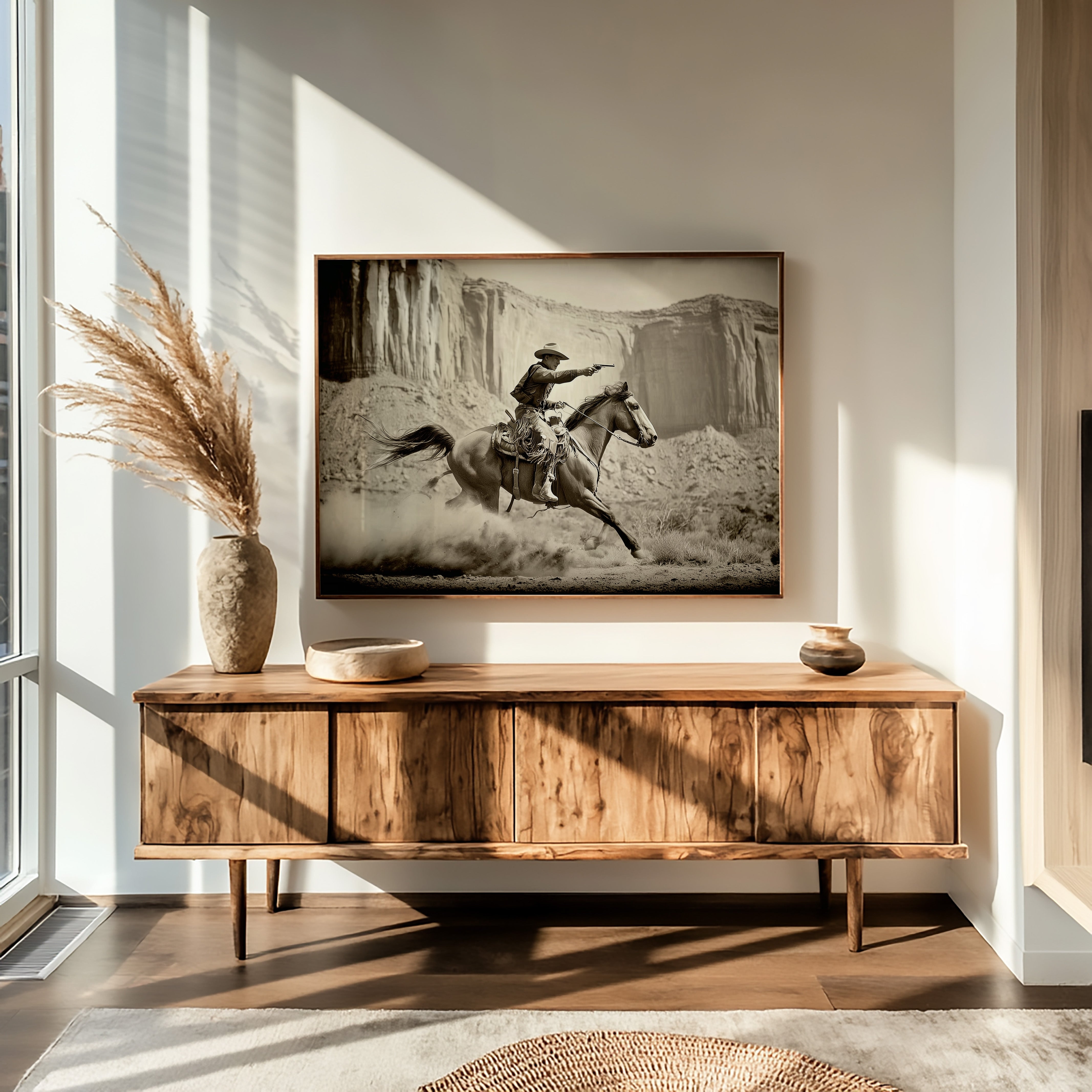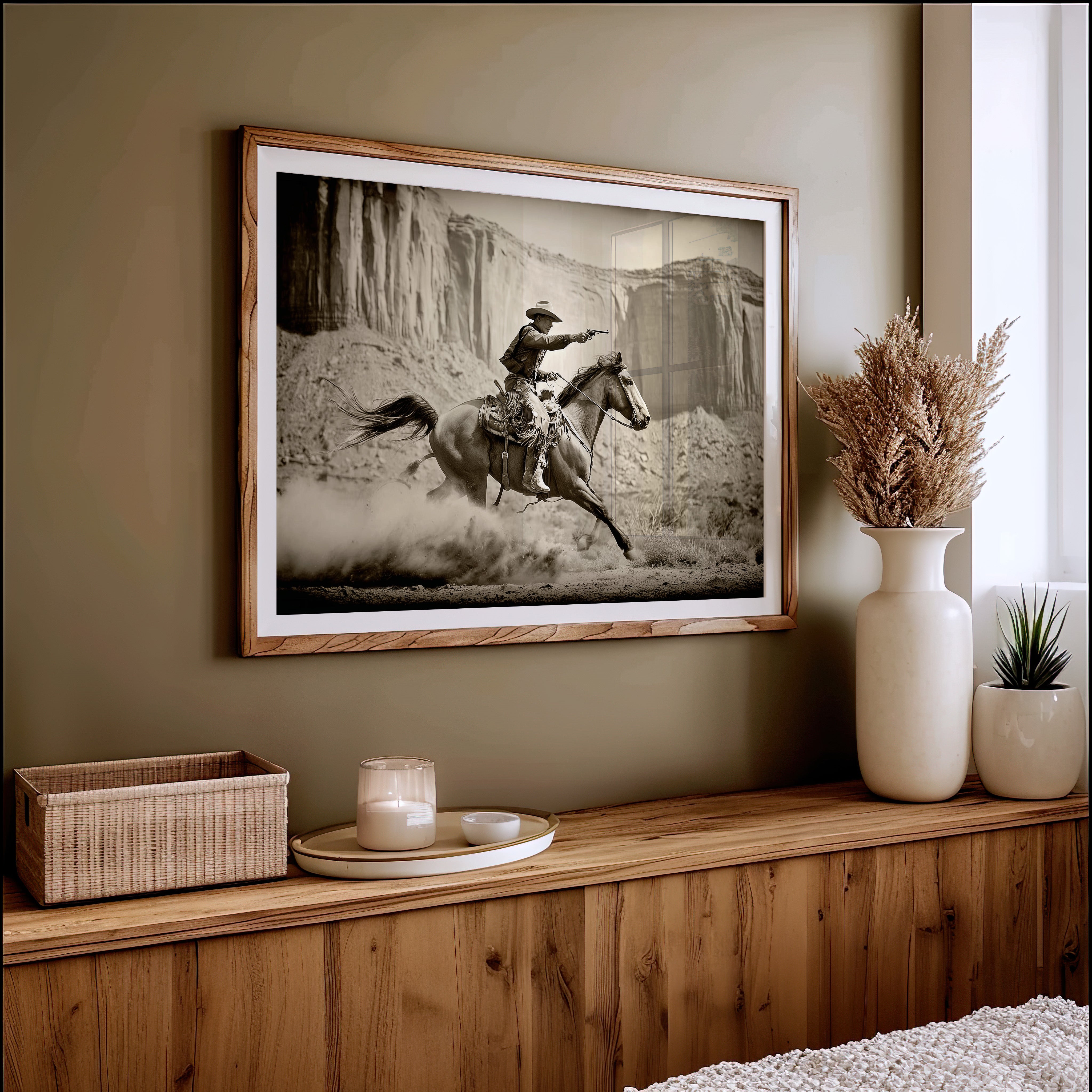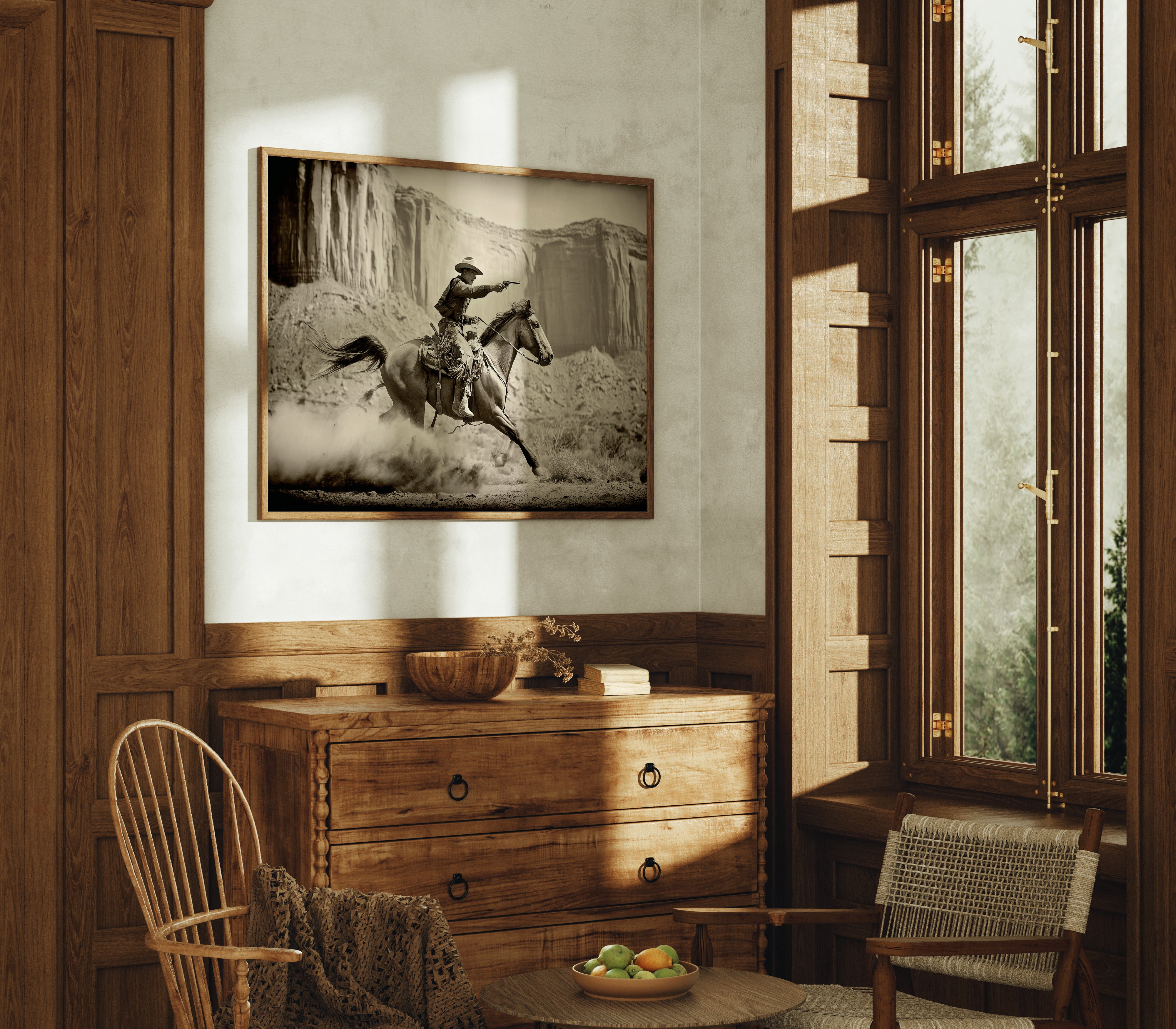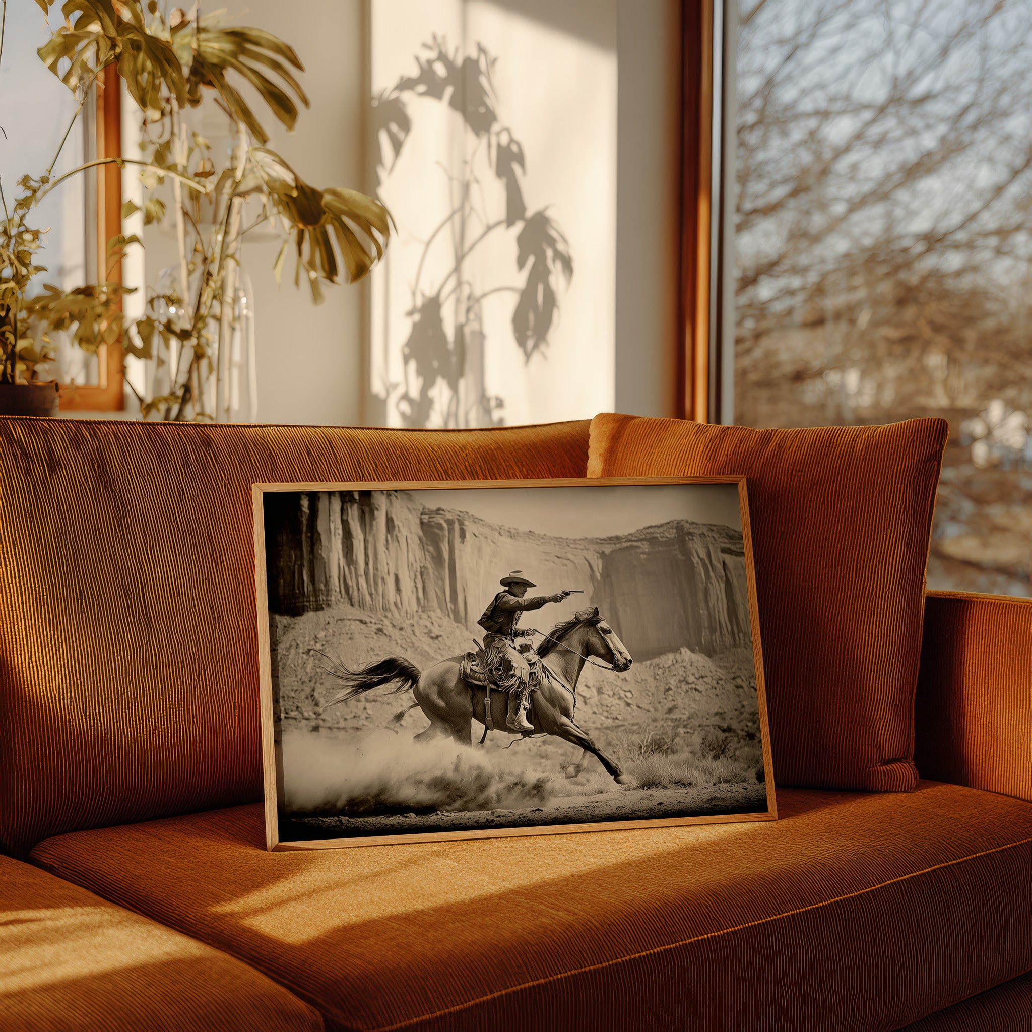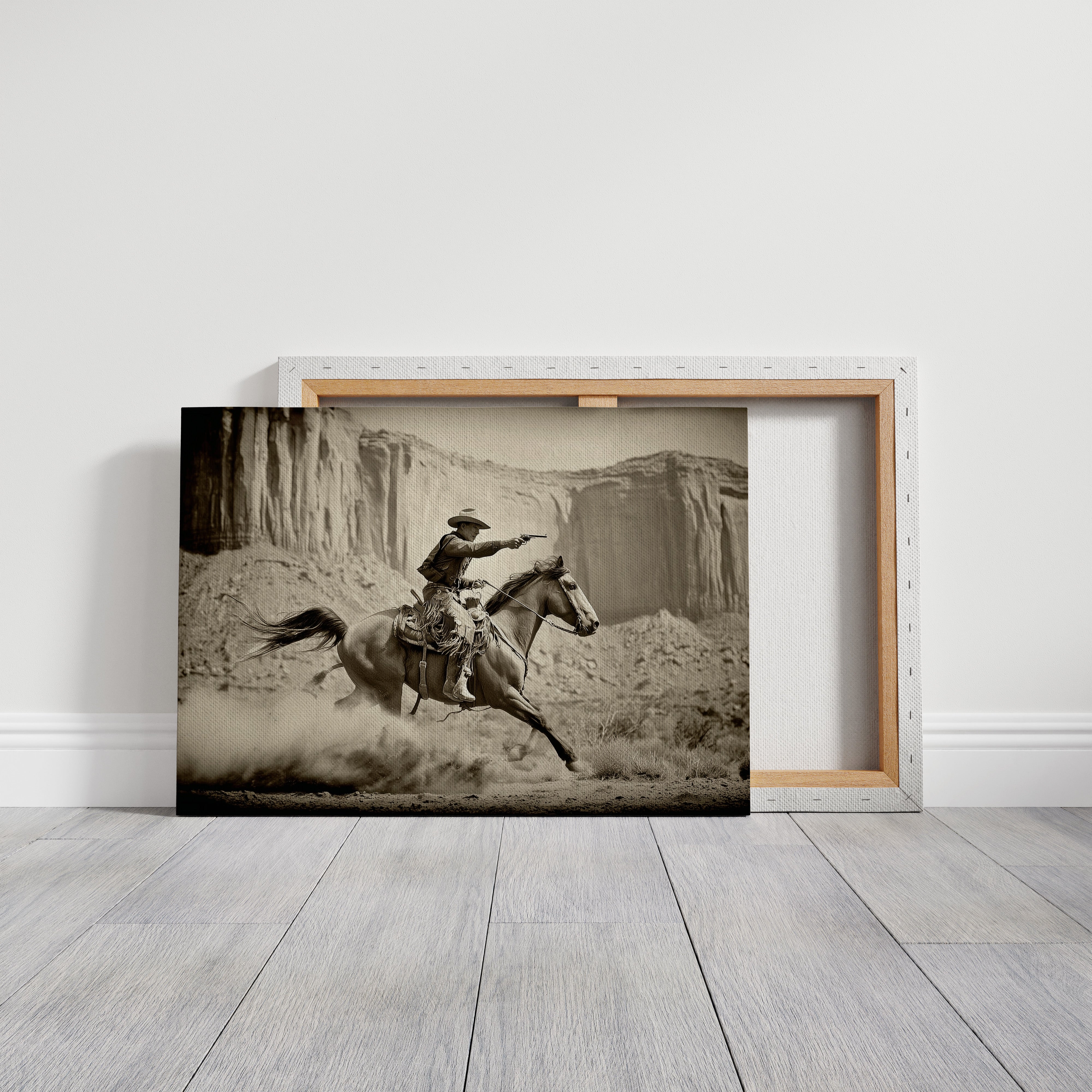 Hooves thunder against desert earth as time stands still in this crystallized moment of raw western spirit. From our Contemporary collection, this striking sepia capture embodies the untamed essence of frontier mythology. The rider and horse move as one through billowing dust clouds, their silhouette stark against towering canyon walls that have witnessed centuries of such passages. Power and grace intertwine as the horse's muscles ripple and mane flies free, while the rider maintains perfect form with drawn pistol - a dance of control and wildness frozen in time. This bold statement piece commands attention in a study, great room, or above a grand fireplace where it can inspire with its untamed energy.