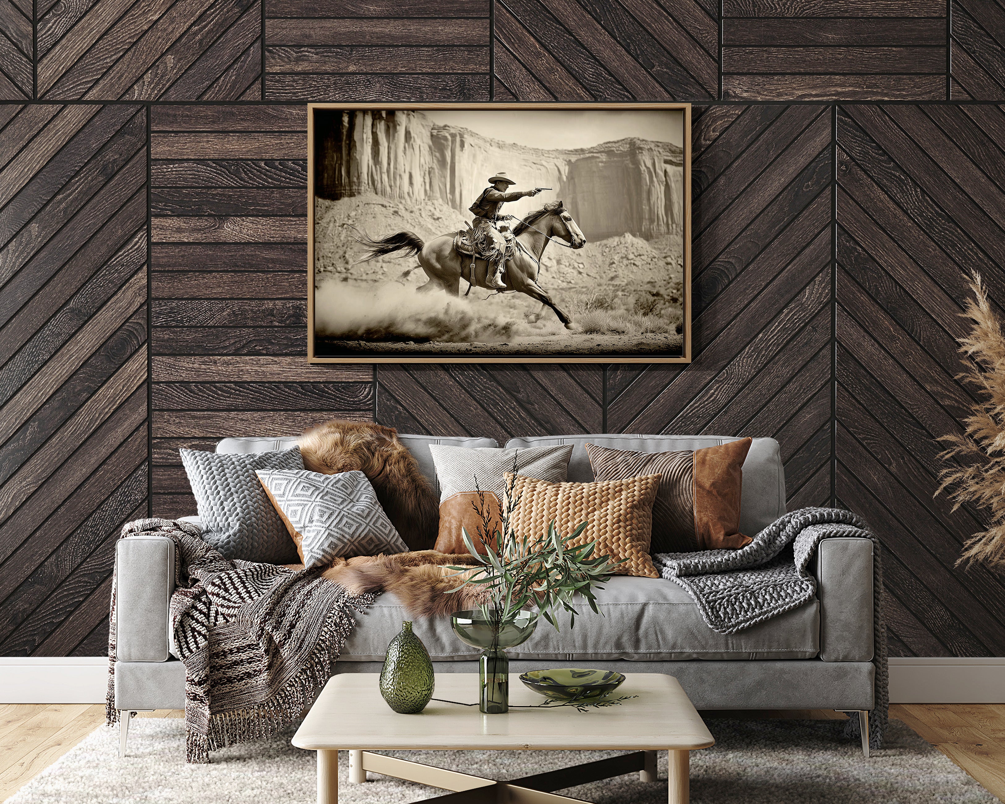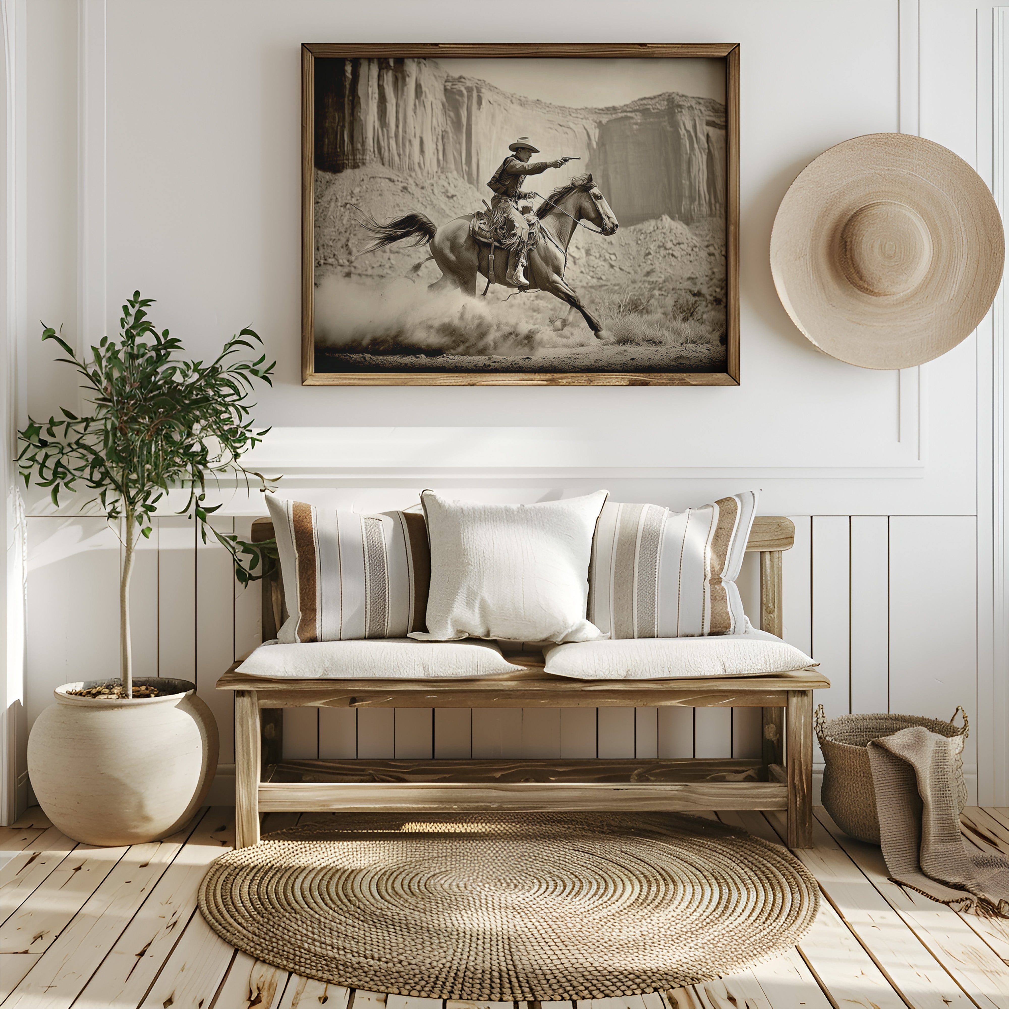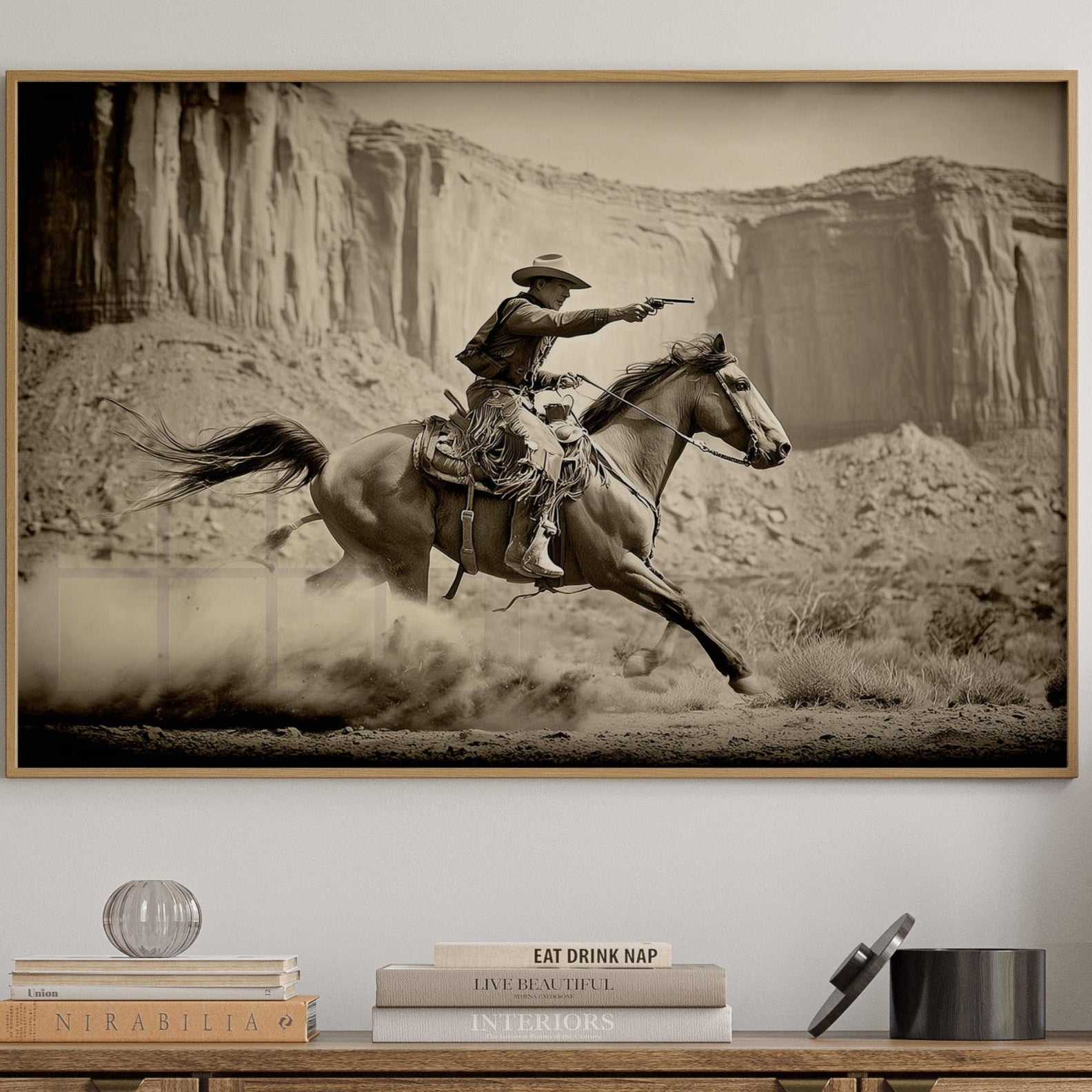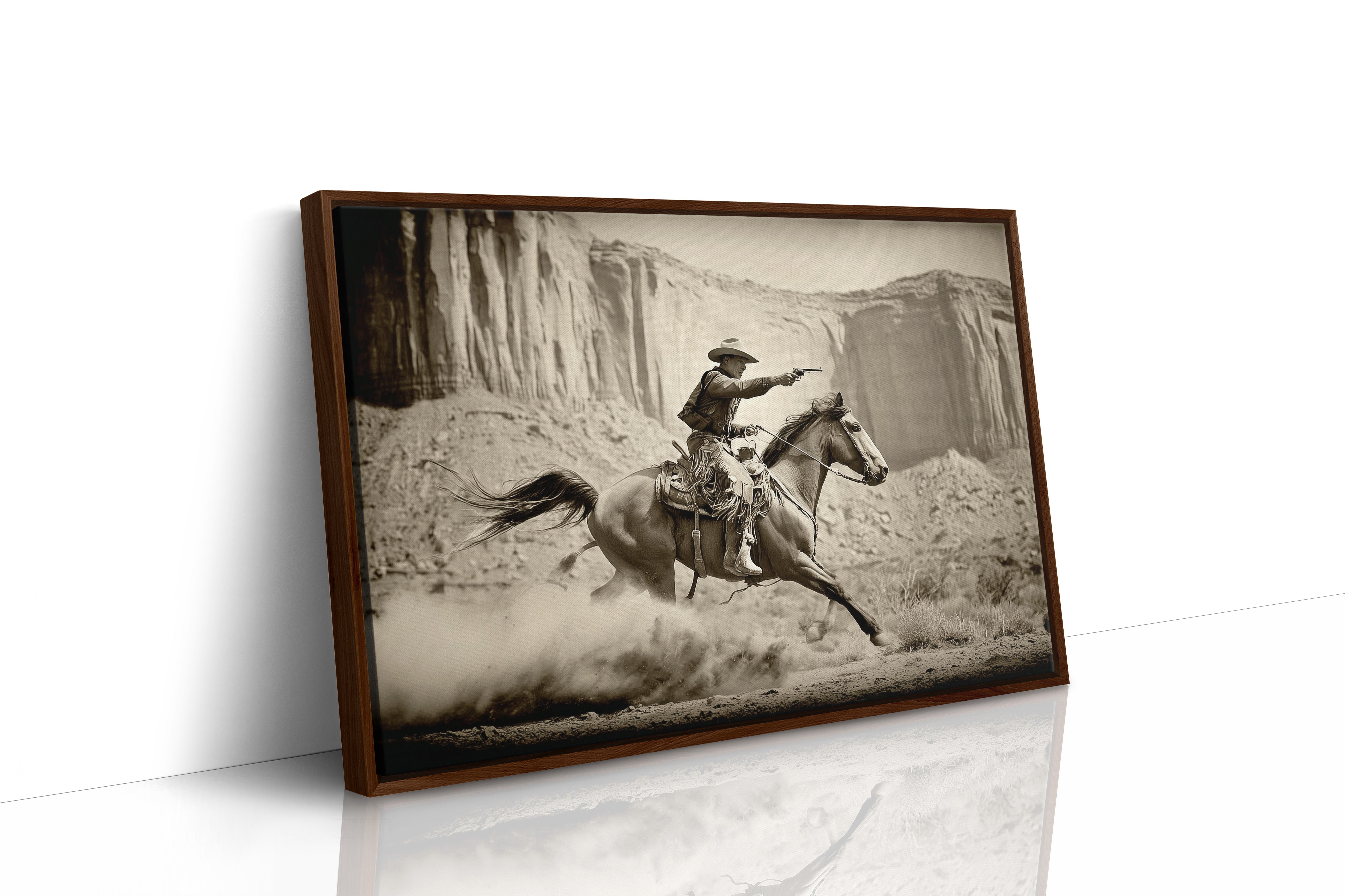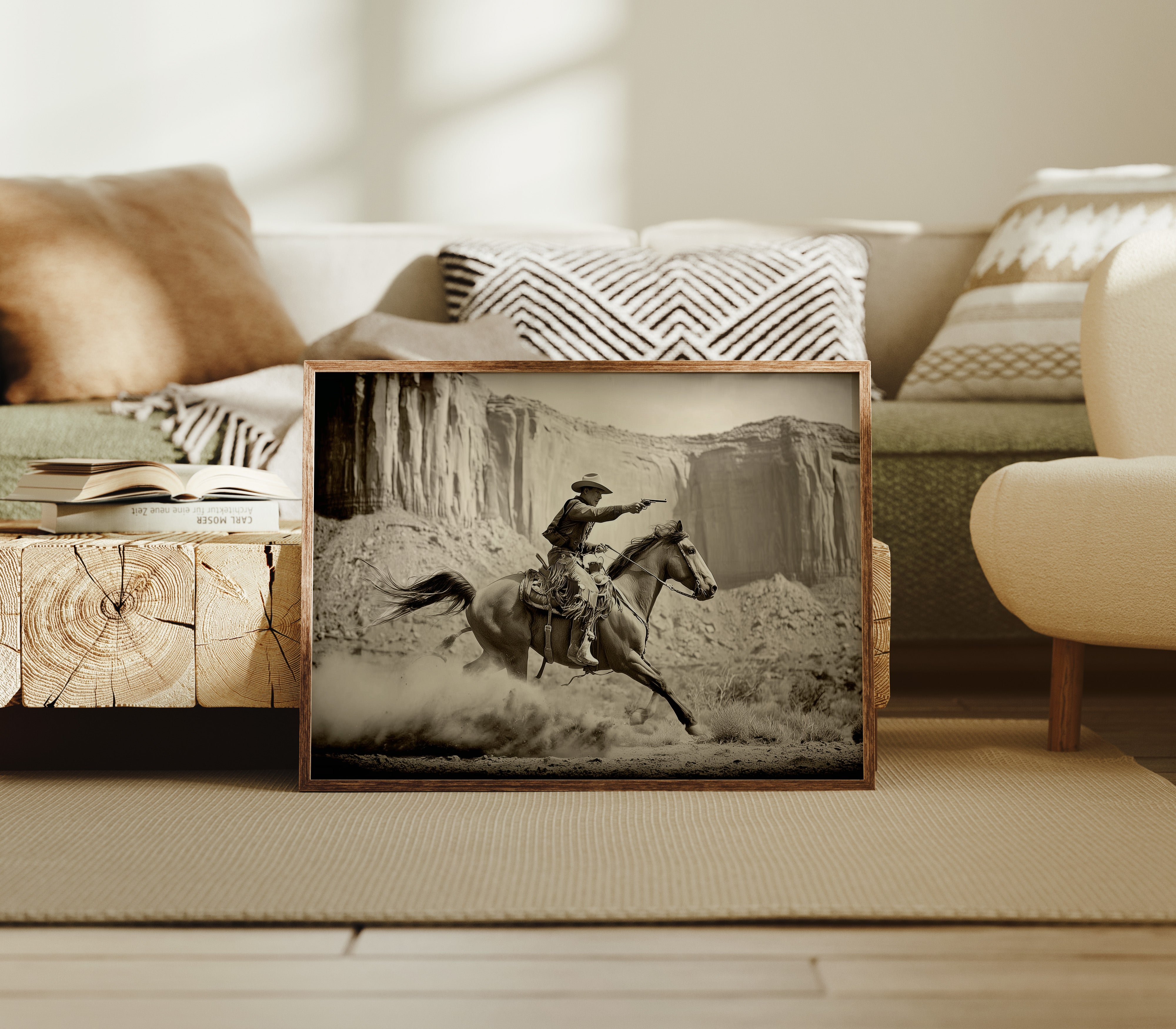 Hooves thunder against desert earth as time stands still in this crystallized moment of raw western spirit. From our Contemporary collection, this striking sepia capture embodies the untamed essence of frontier mythology. The rider and horse move as one through billowing dust clouds, their silhouette stark against towering canyon walls that have witnessed centuries of such passages. Power and grace intertwine as the horse's muscles ripple and mane flies free, while the rider maintains perfect form with drawn pistol - a dance of control and wildness frozen in time. This bold statement piece commands attention in a study, great room, or above a grand fireplace where it can inspire with its untamed energy.