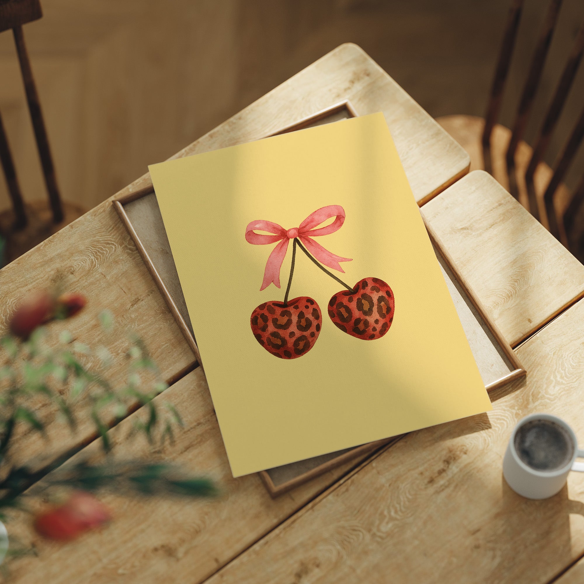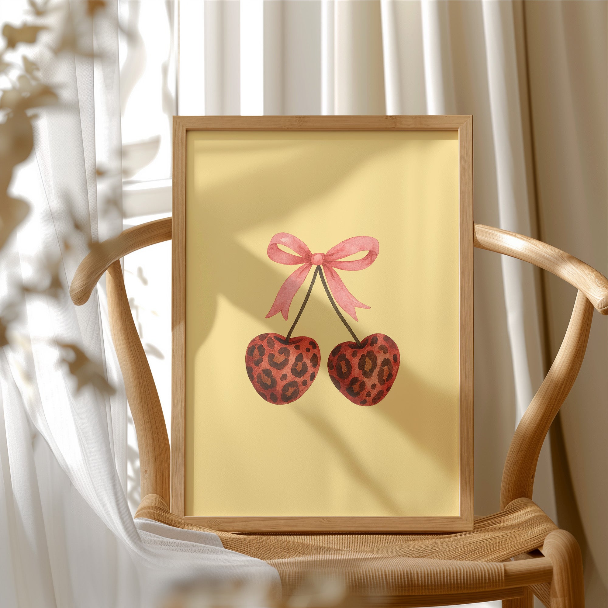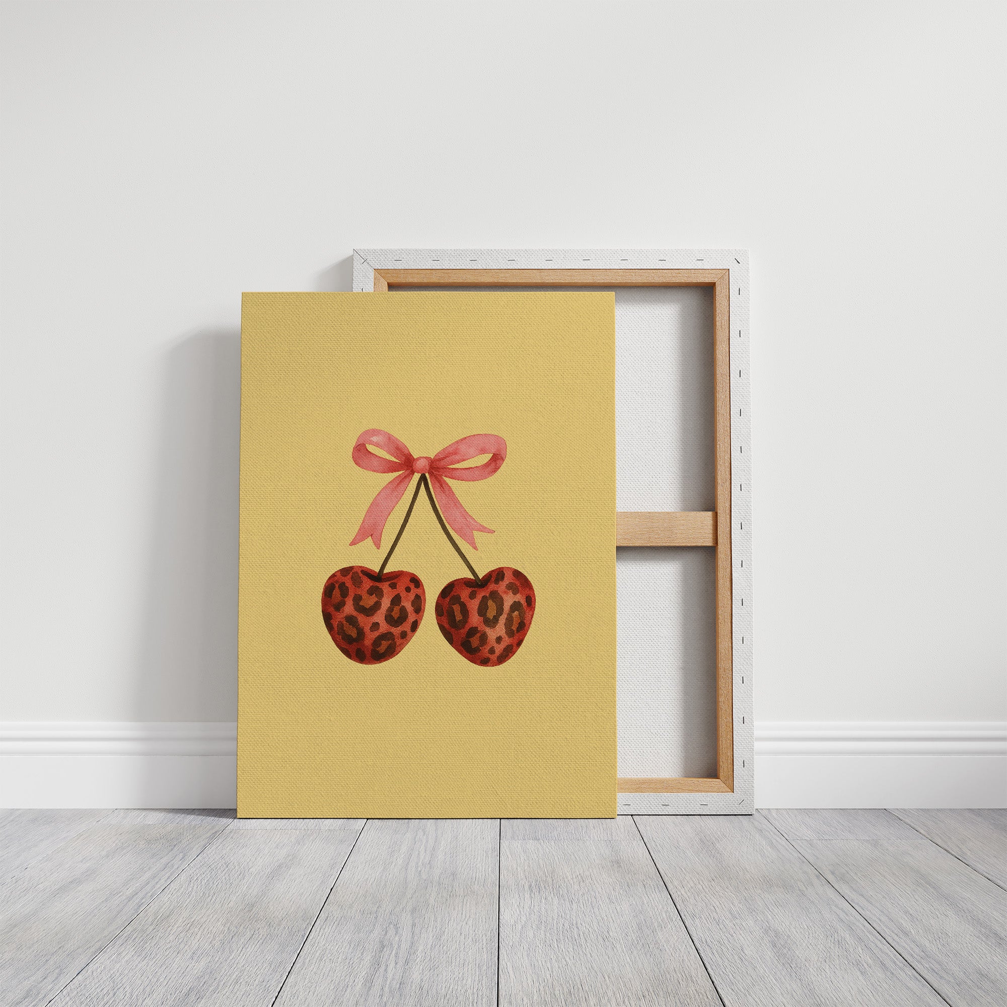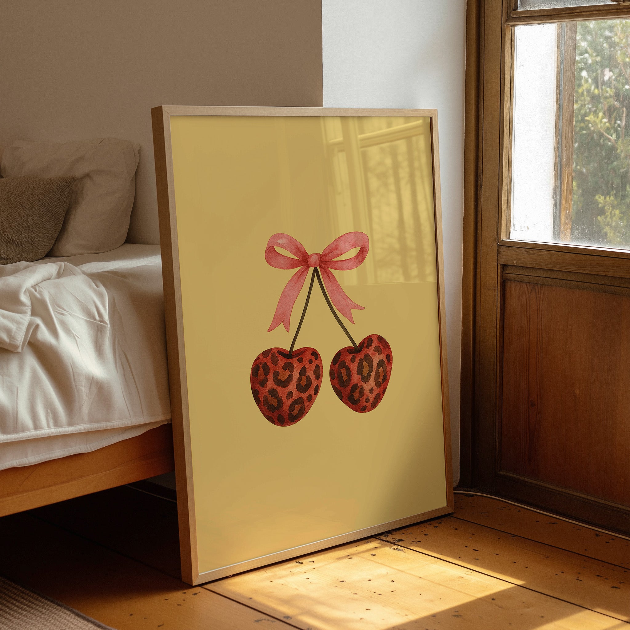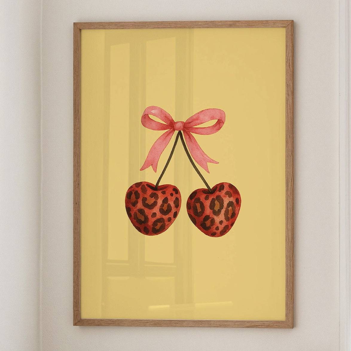 A playful watercolor illustration featuring two heart-shaped cherries adorned with leopard print patterns, hanging from slender stems and bound together by a delicate pink ribbon bow. Set against a warm yellow background, this whimsical piece merges natural fruit imagery with fashion-forward animal print in a contemporary pop art style. The contrast between the soft pink ribbon and the bold spotted pattern creates a striking visual that speaks to both sweetness and wildness a perfect embodiment of modern romantic aesthetics with a touch of fierce femininity.