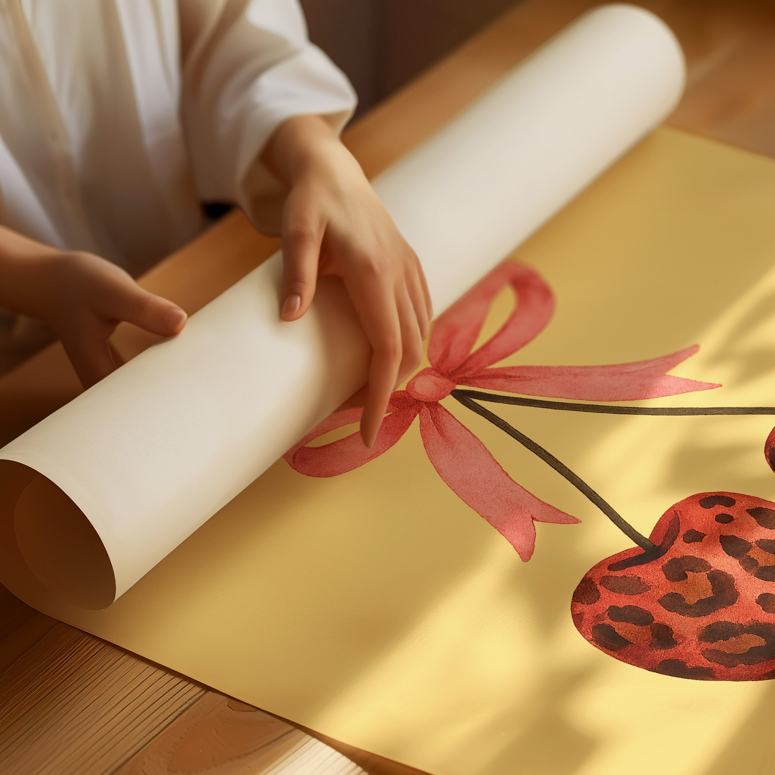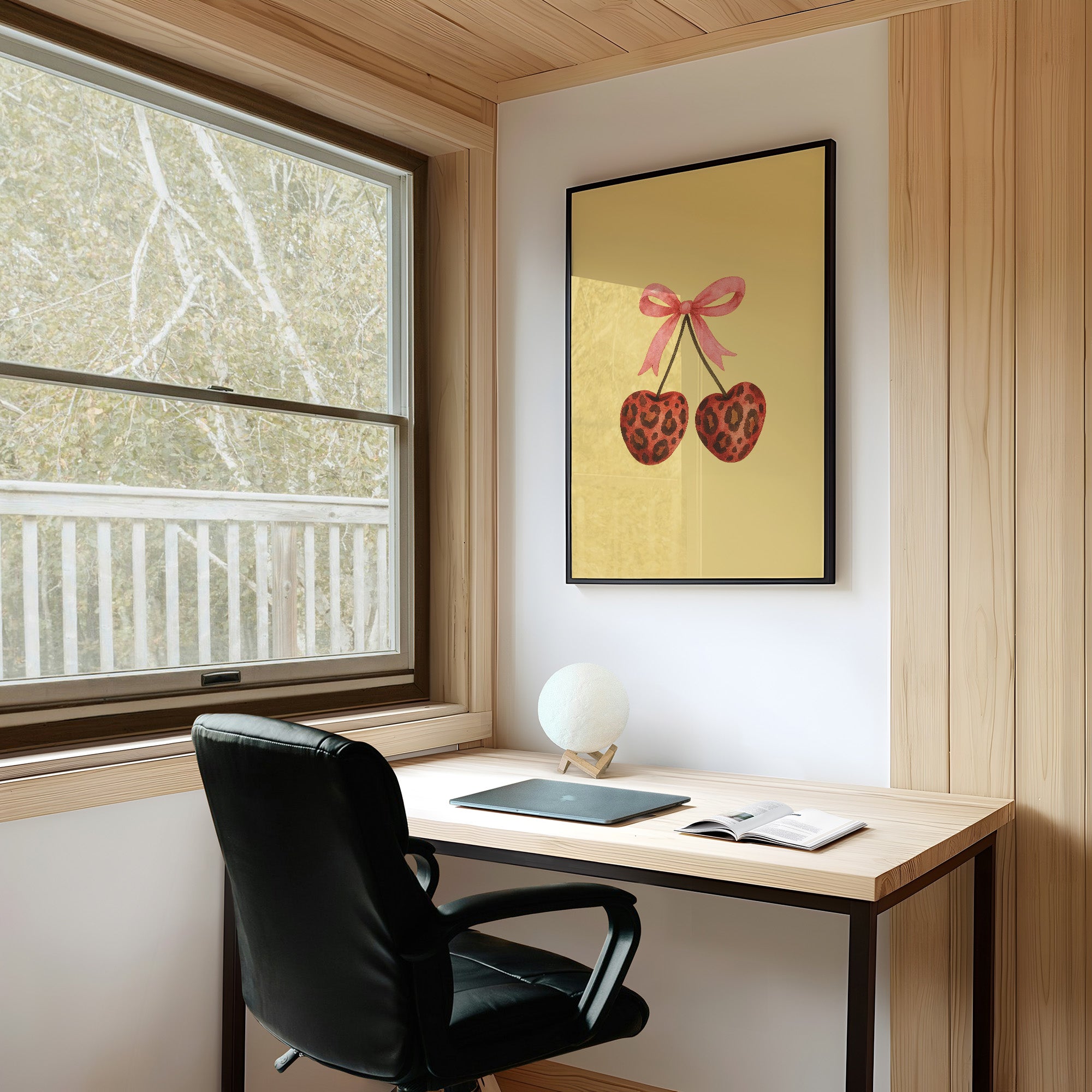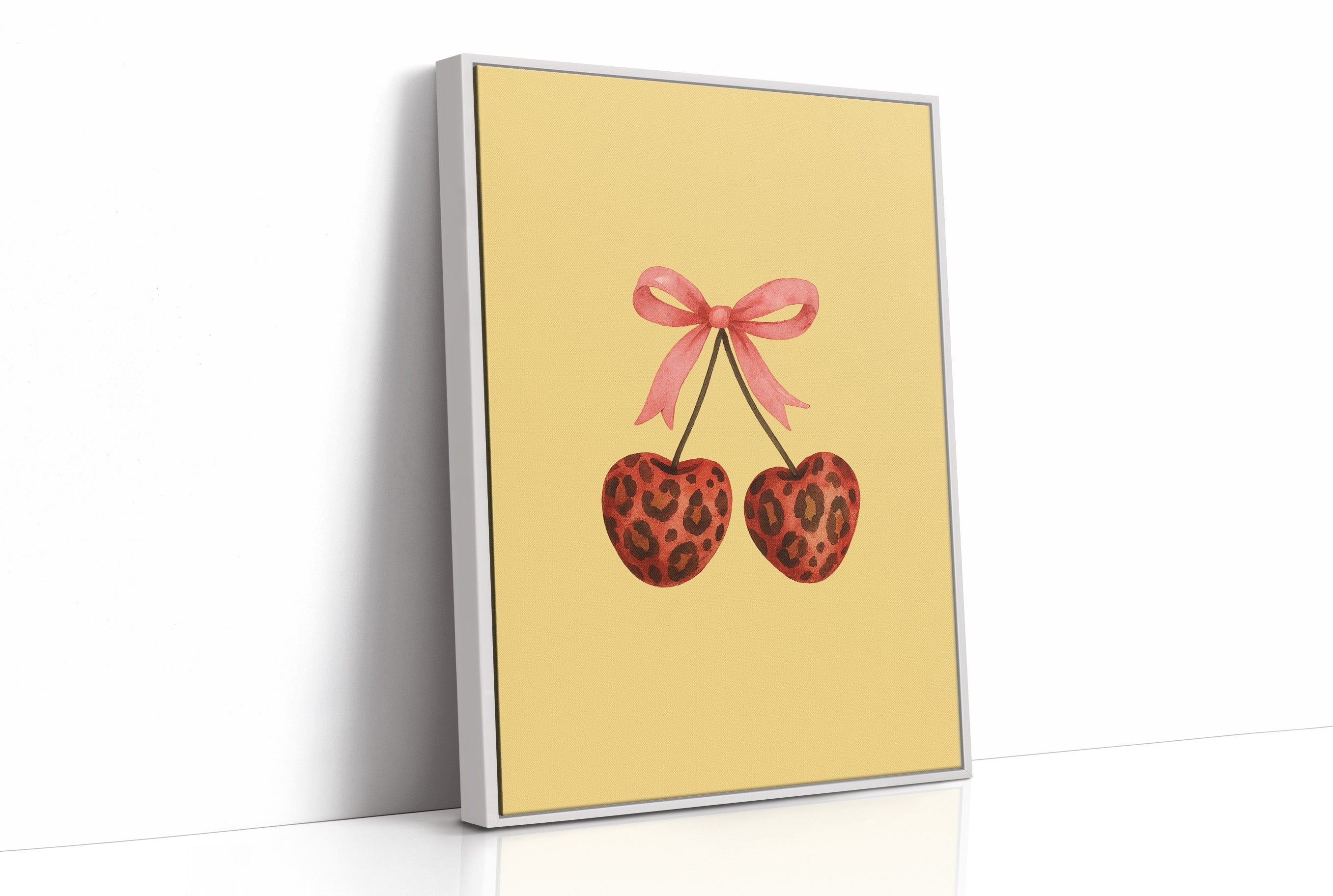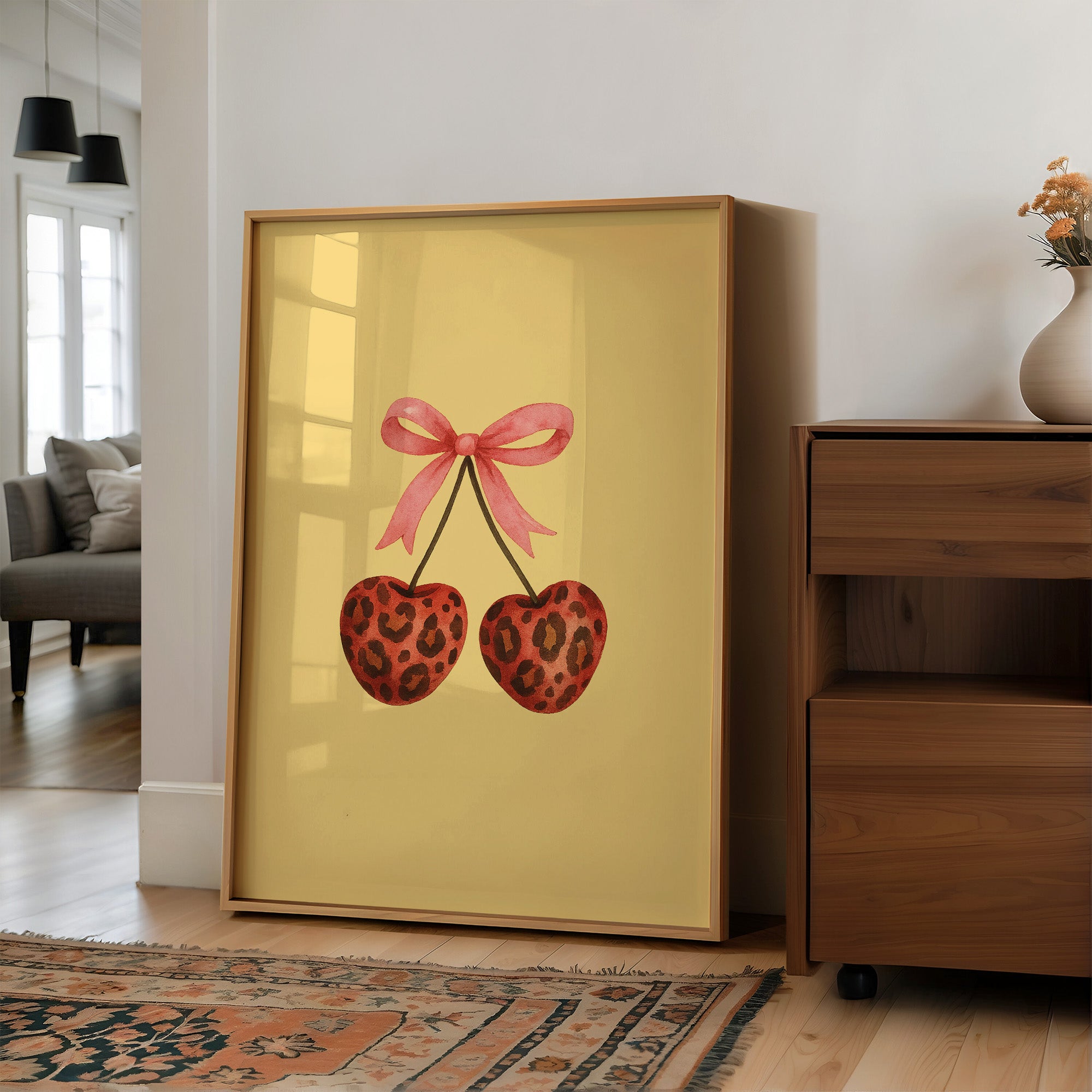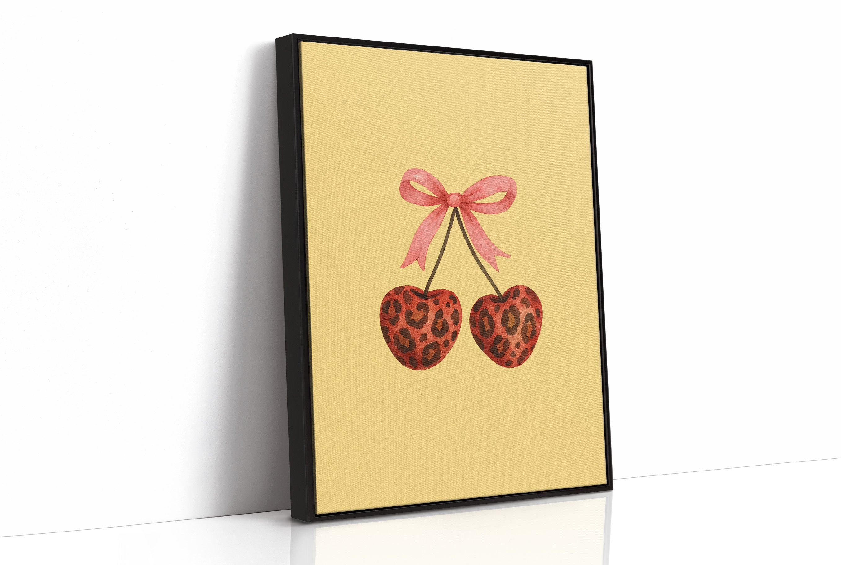 A playful watercolor illustration featuring two heart-shaped cherries adorned with leopard print patterns, hanging from slender stems and bound together by a delicate pink ribbon bow. Set against a warm yellow background, this whimsical piece merges natural fruit imagery with fashion-forward animal print in a contemporary pop art style. The contrast between the soft pink ribbon and the bold spotted pattern creates a striking visual that speaks to both sweetness and wildness a perfect embodiment of modern romantic aesthetics with a touch of fierce femininity.