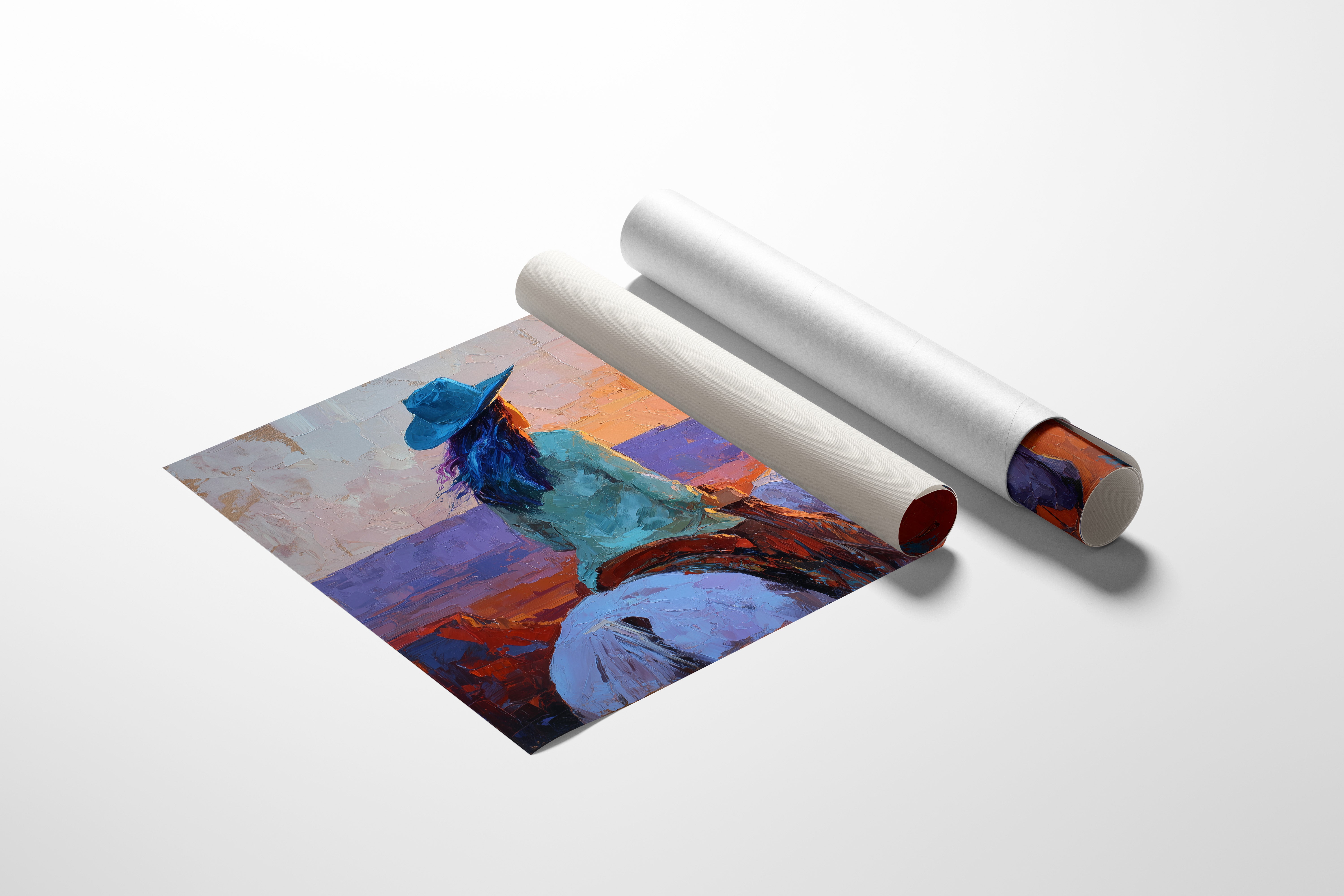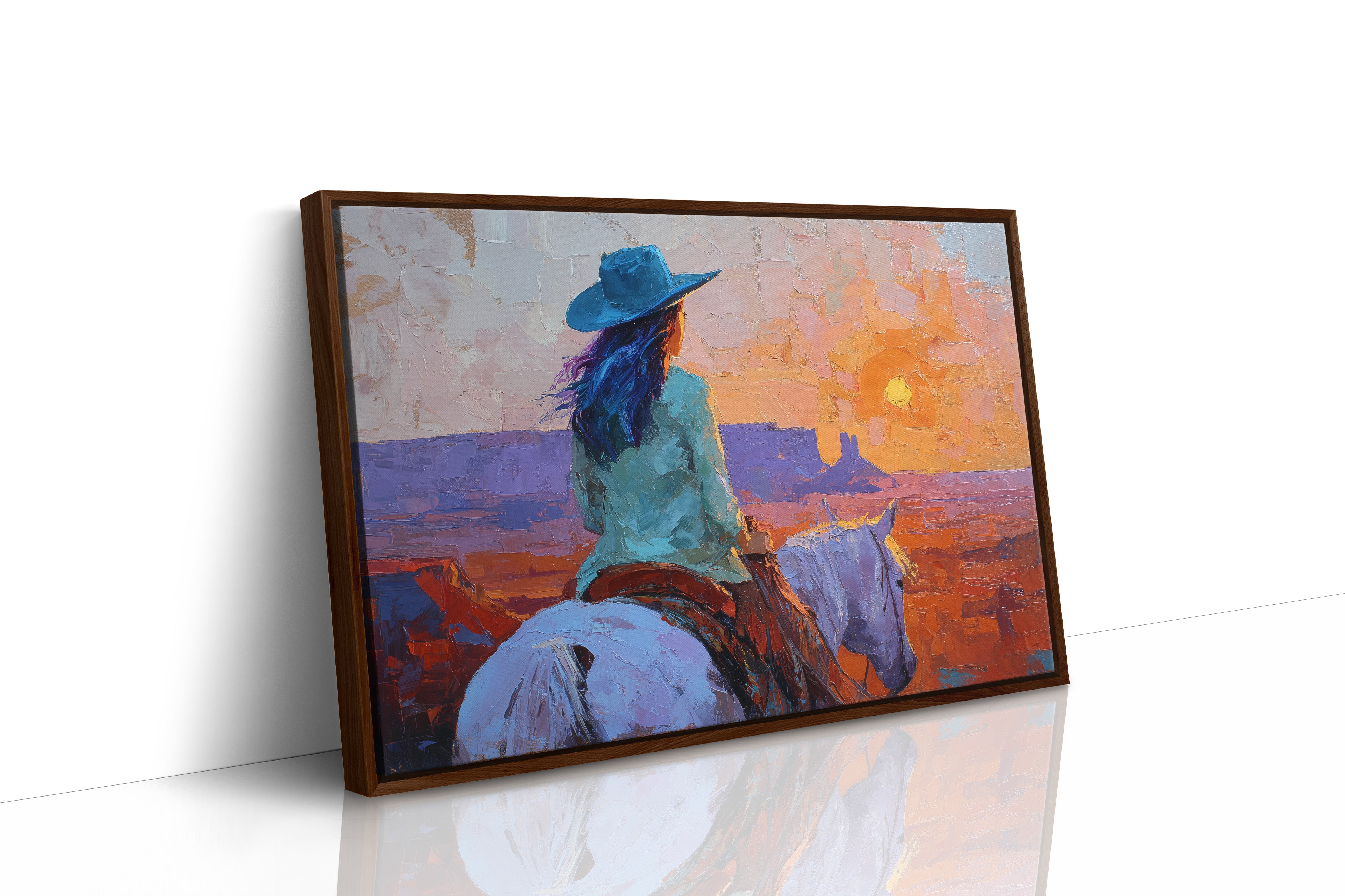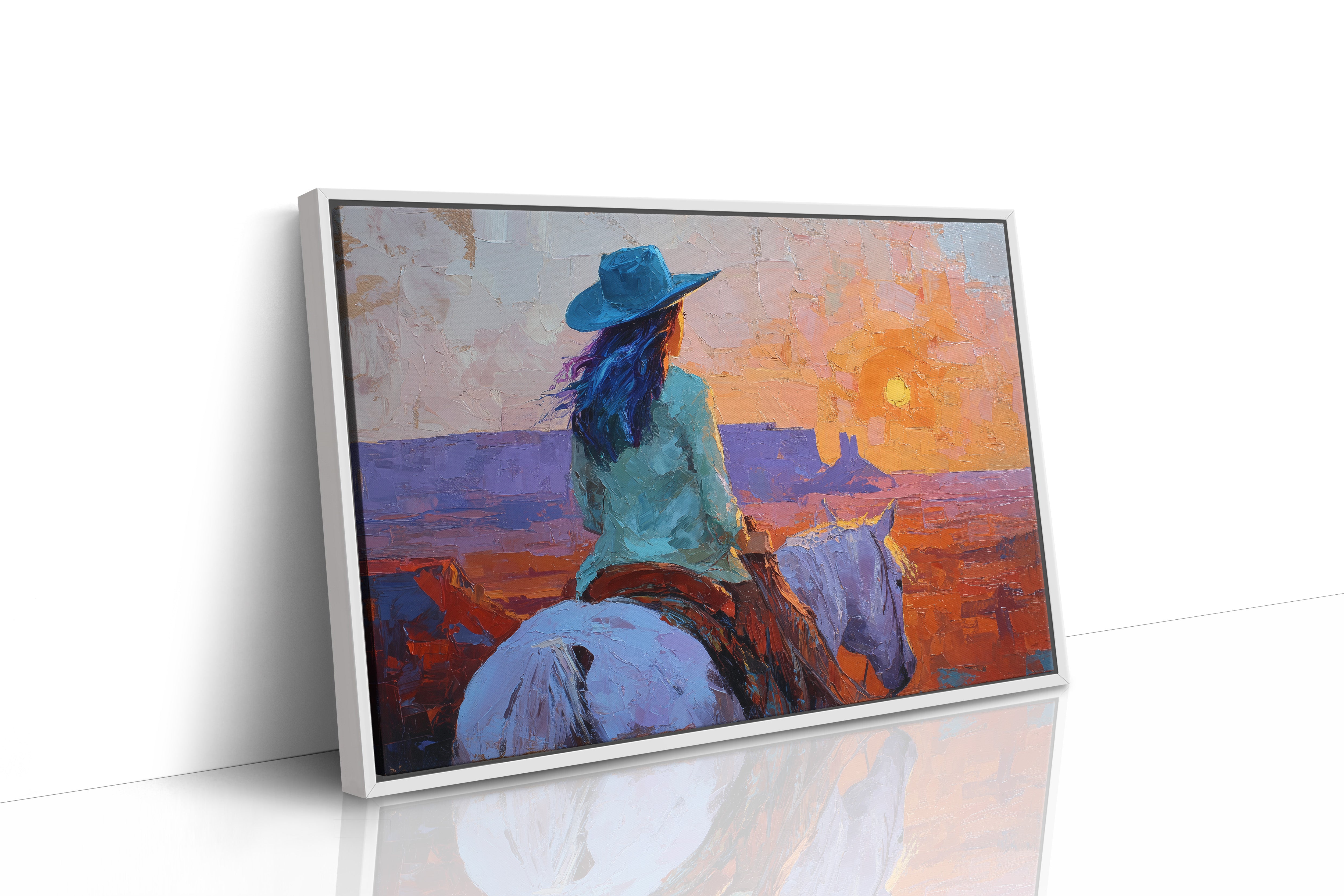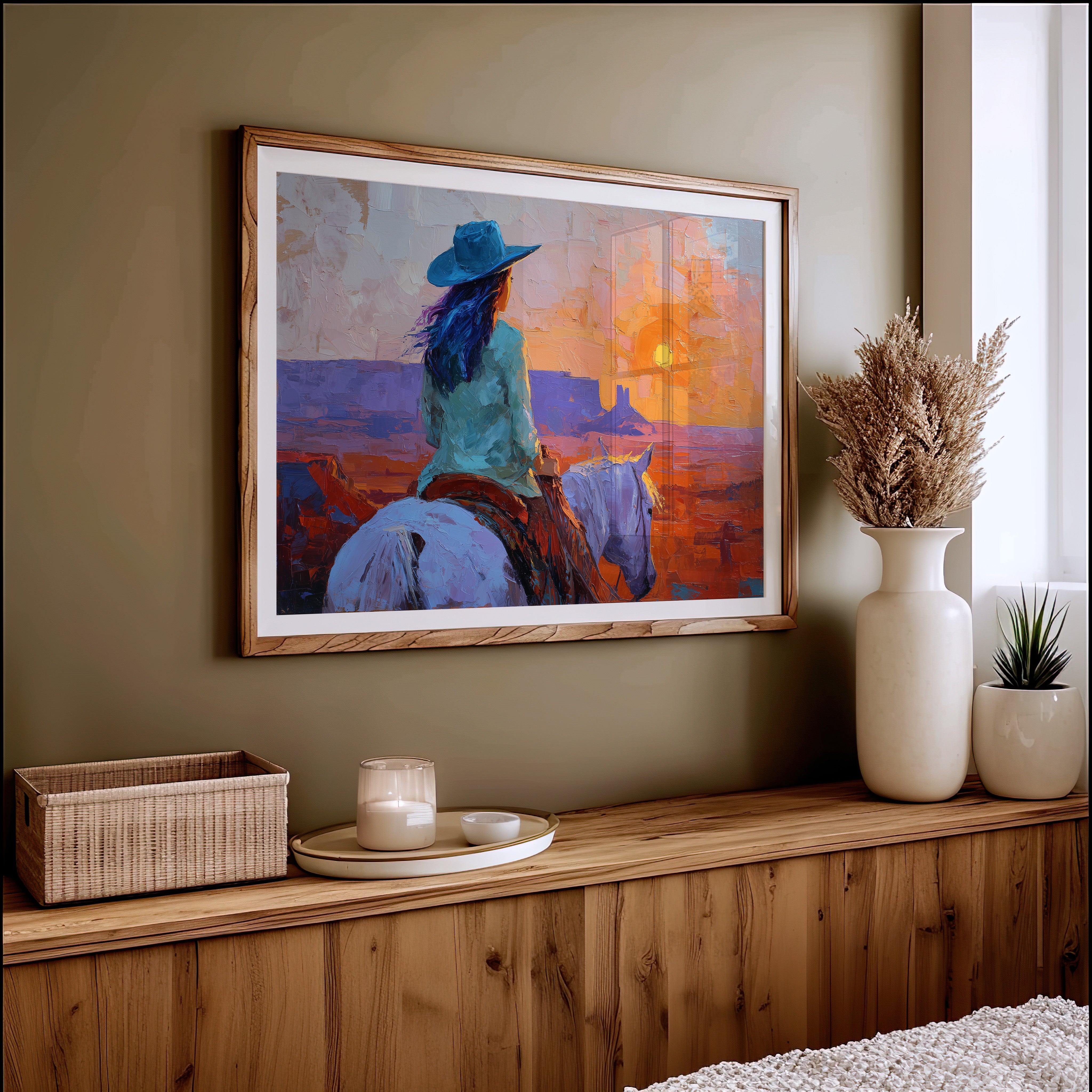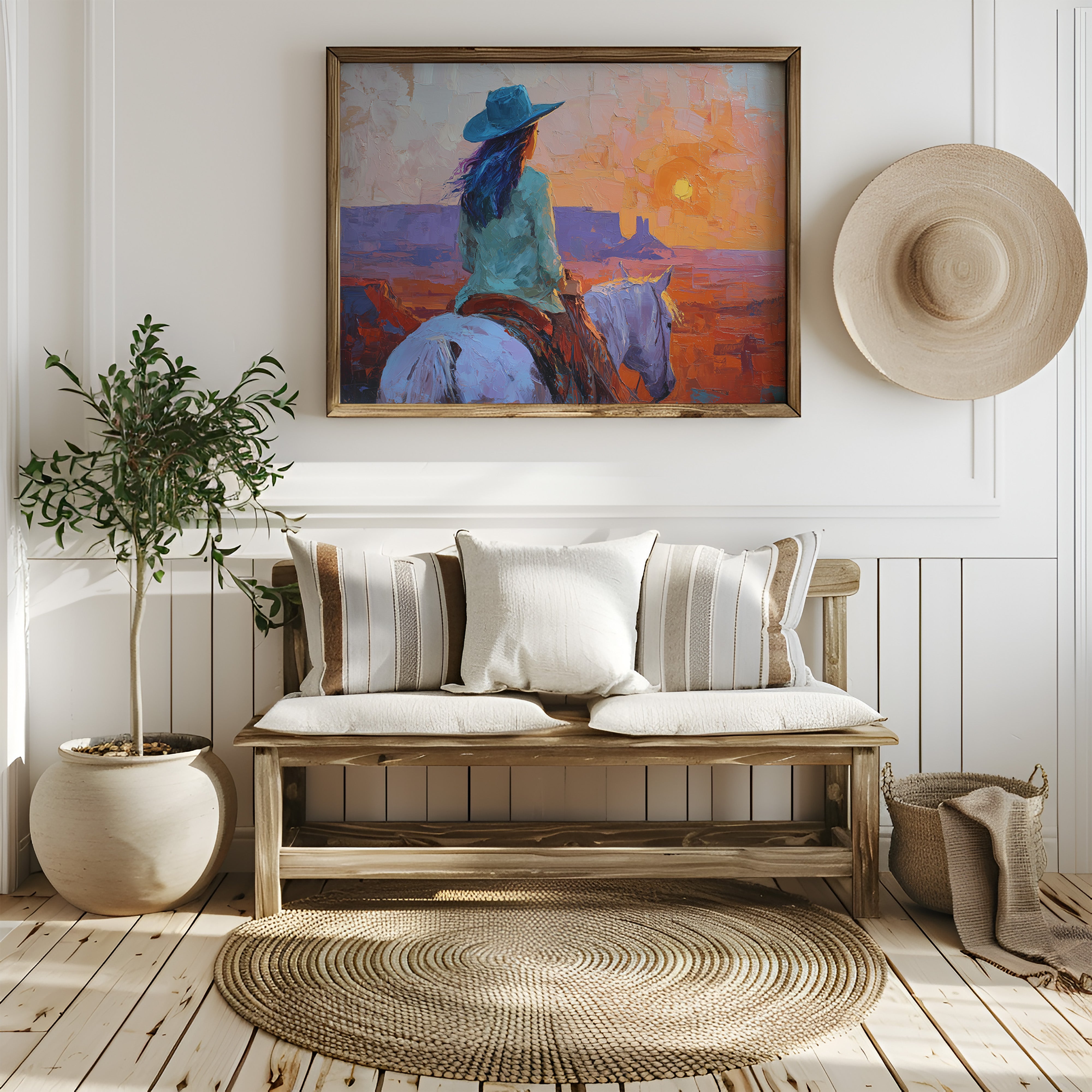 Golden light spills across red canyon walls as horse and rider pause in silent reverence of nature's evening show. This contemporary Western piece captures the bold spirit of the American Southwest through vibrant impasto brushstrokes. Rich oranges and purples dance across the canvas, while a turquoise-clad figure atop a white horse creates a striking silhouette against the blazing sunset. The textured paint application brings dimension to every element - from the rider's flowing hair to the majestic rock formations standing sentinel in the distance. This statement piece commands attention in a great room or above a fireplace, its dramatic palette warming any space with the glow of desert magic.