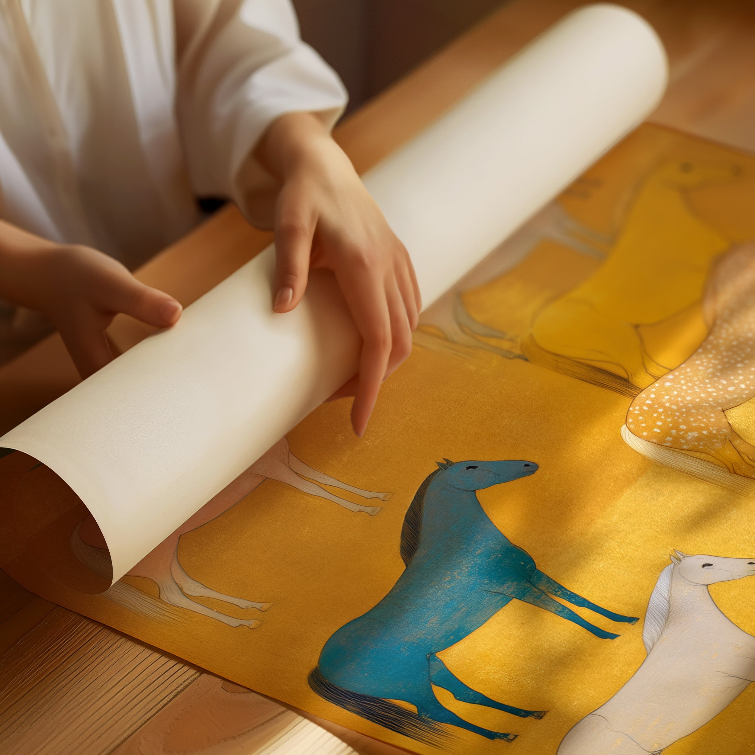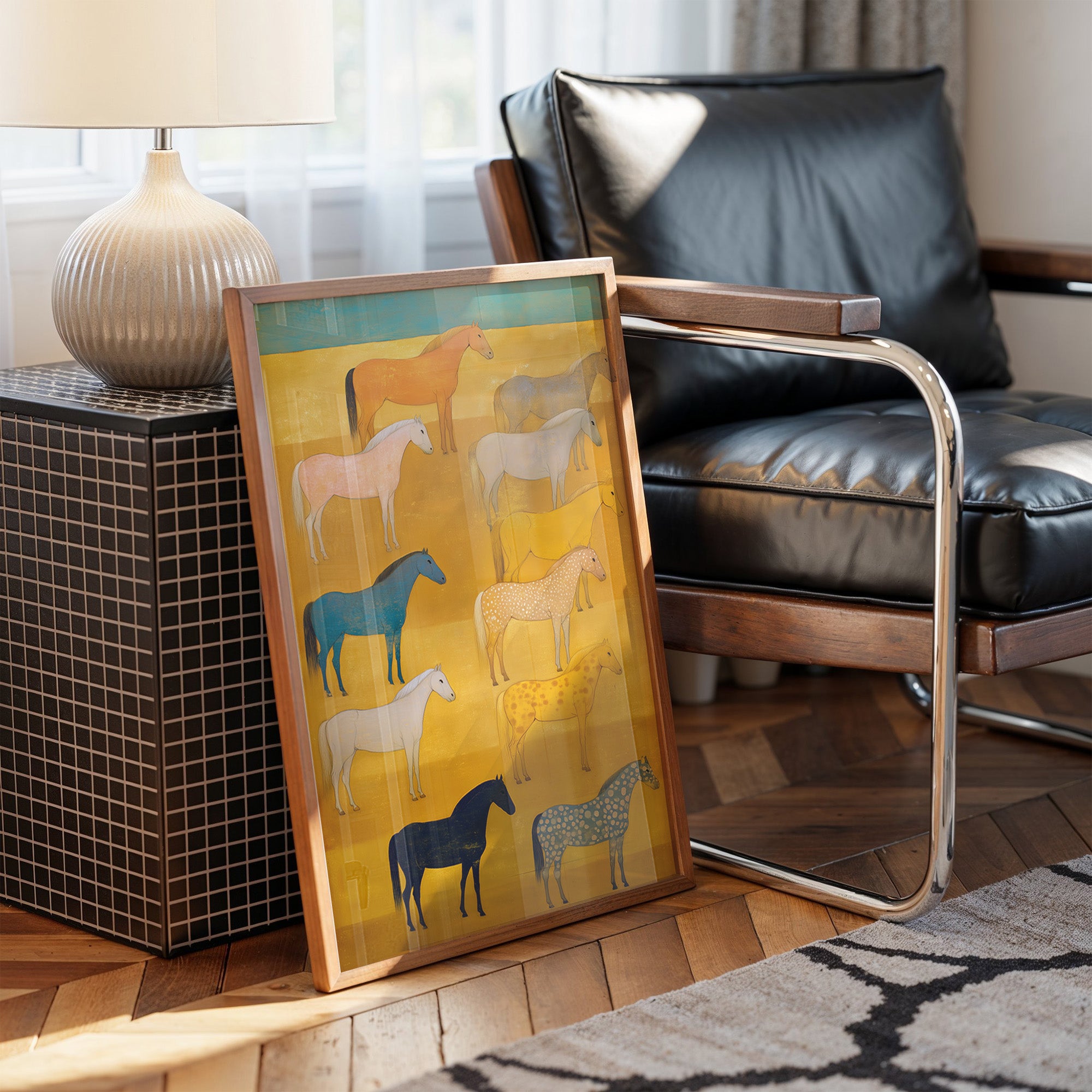 A collection of ten horses stands proudly against a sun-drenched golden backdrop, each one uniquely rendered in its own distinctive coat and character. The modern folk art style brings these equine figures to life through a palette of blues, grays, and earth tones, creating a striking contrast against the warm yellow background. The simplicity of the forms speaks to both childlike wonder and sophisticated design sensibility. This piece finds its perfect home in a contemporary bar area, where its playful energy and bold colors complement the amber glow of fine spirits. The combination of rustic charm and modern aesthetics makes it an ideal focal point for spaces that blend casual sophistication with artistic flair.