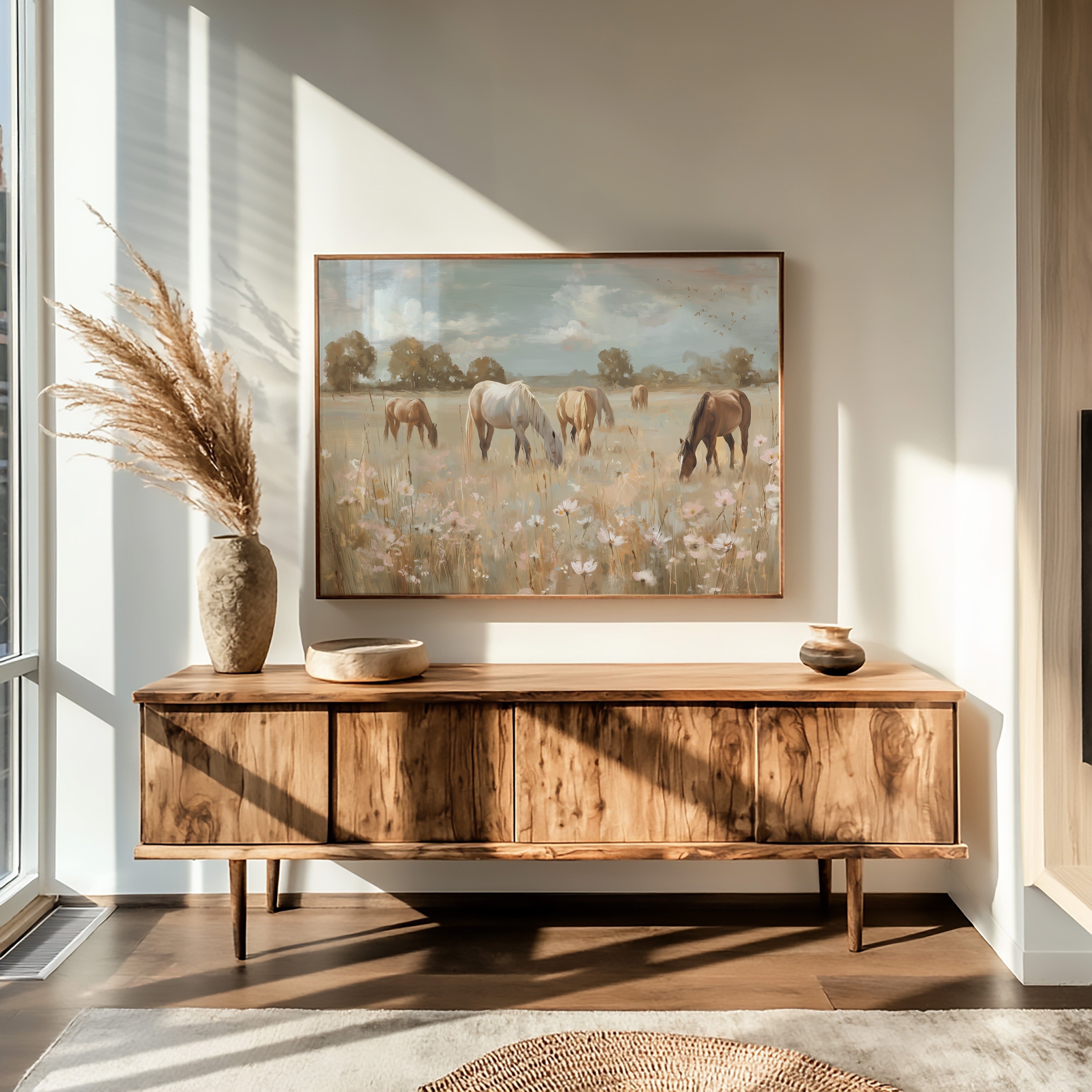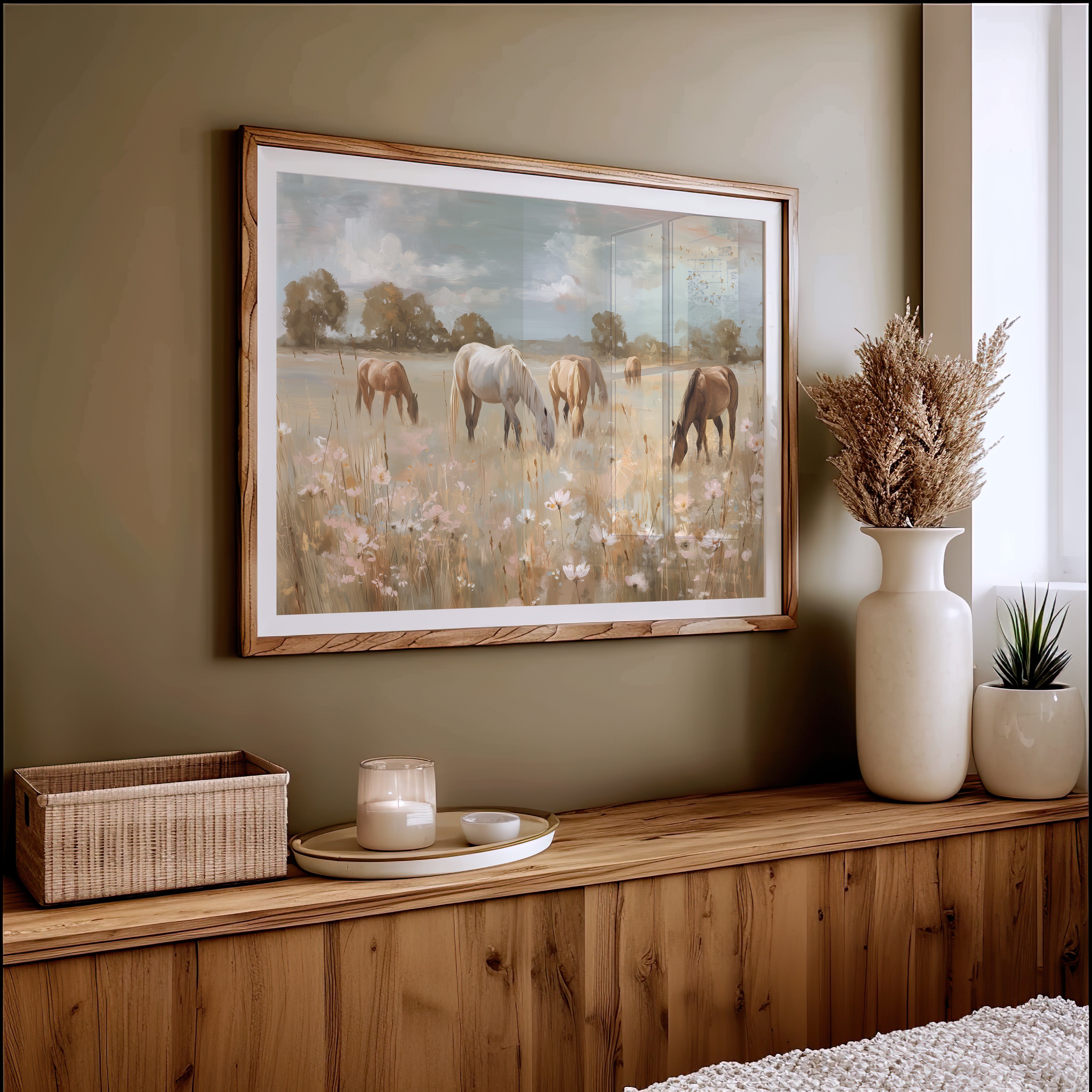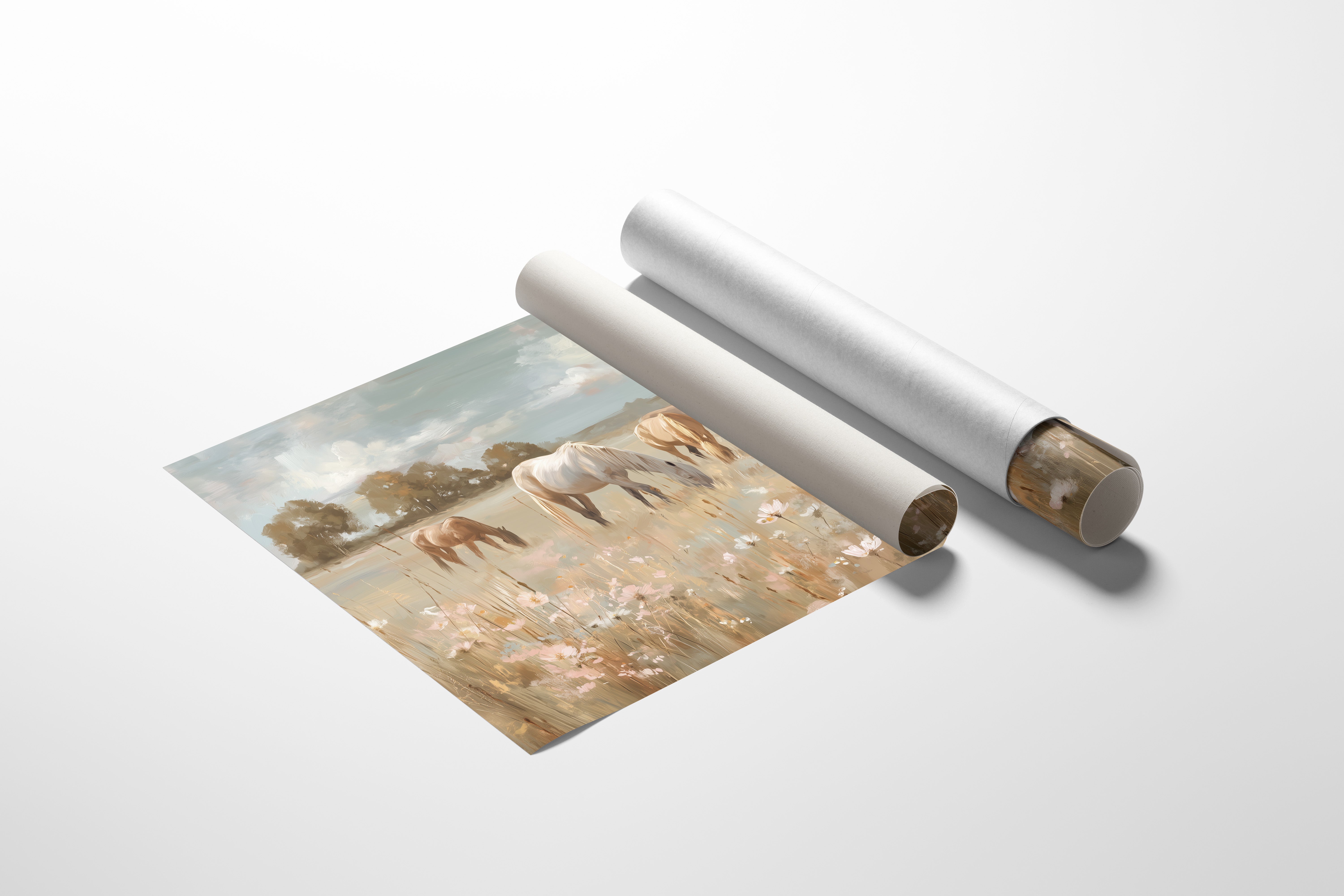 Morning light spills across a meadow where horses graze among delicate cosmos flowers, their forms soft against the golden hour haze. This contemporary pastoral piece captures the gentle harmony between wild beauty and cultivated grace. The composition unfolds in layers of warm neutrals and blush tones, with the horses' gentle movements echoing the swaying of wildflowers in the breeze. White and cream petals dance around sturdy equine legs while distant trees frame the peaceful scene beneath a pearl-tinted sky. Perfect for bringing natural serenity to a living room or adding romantic charm to a bedroom sanctuary. Each viewing reveals new details in this meditation on freedom and grace.