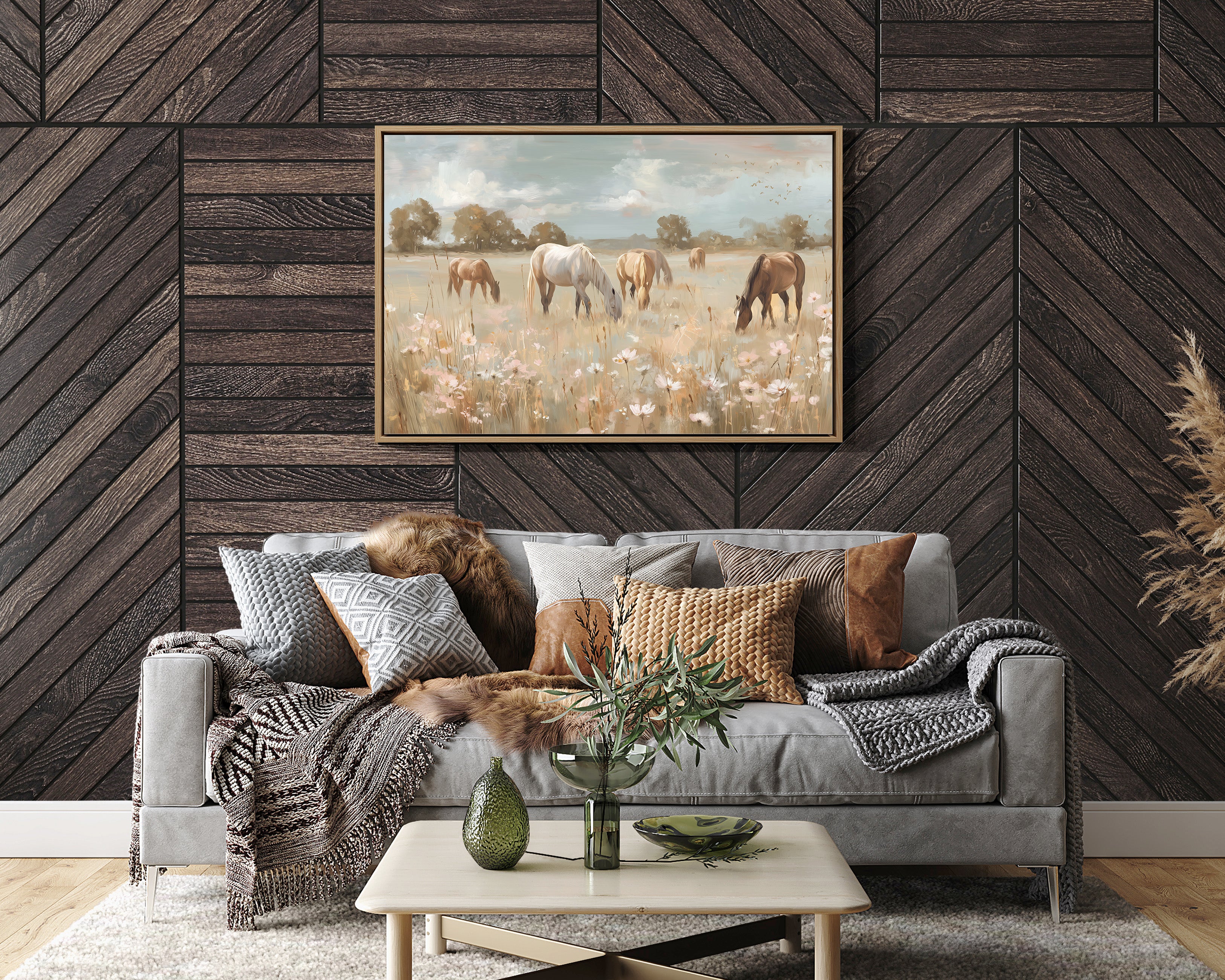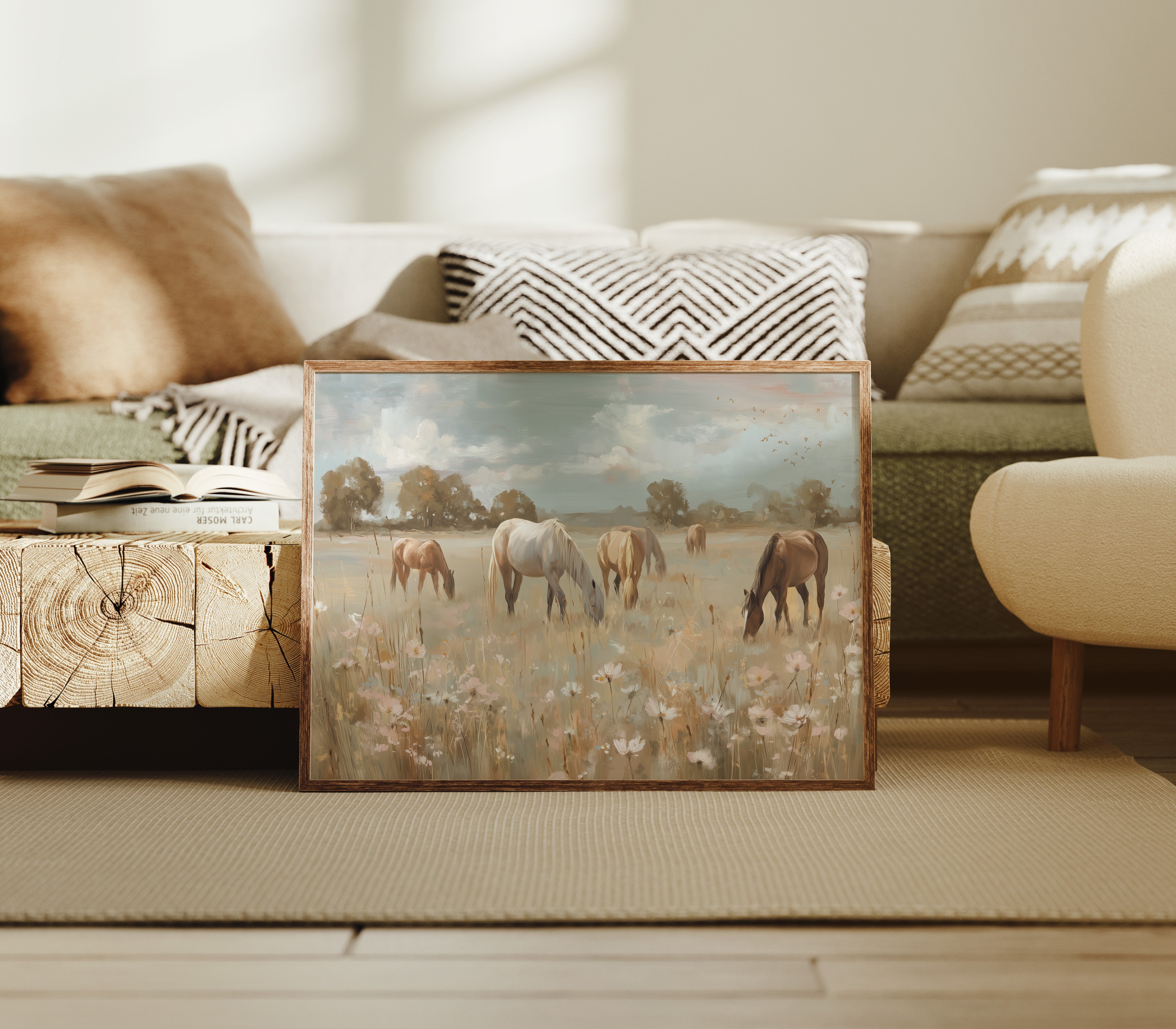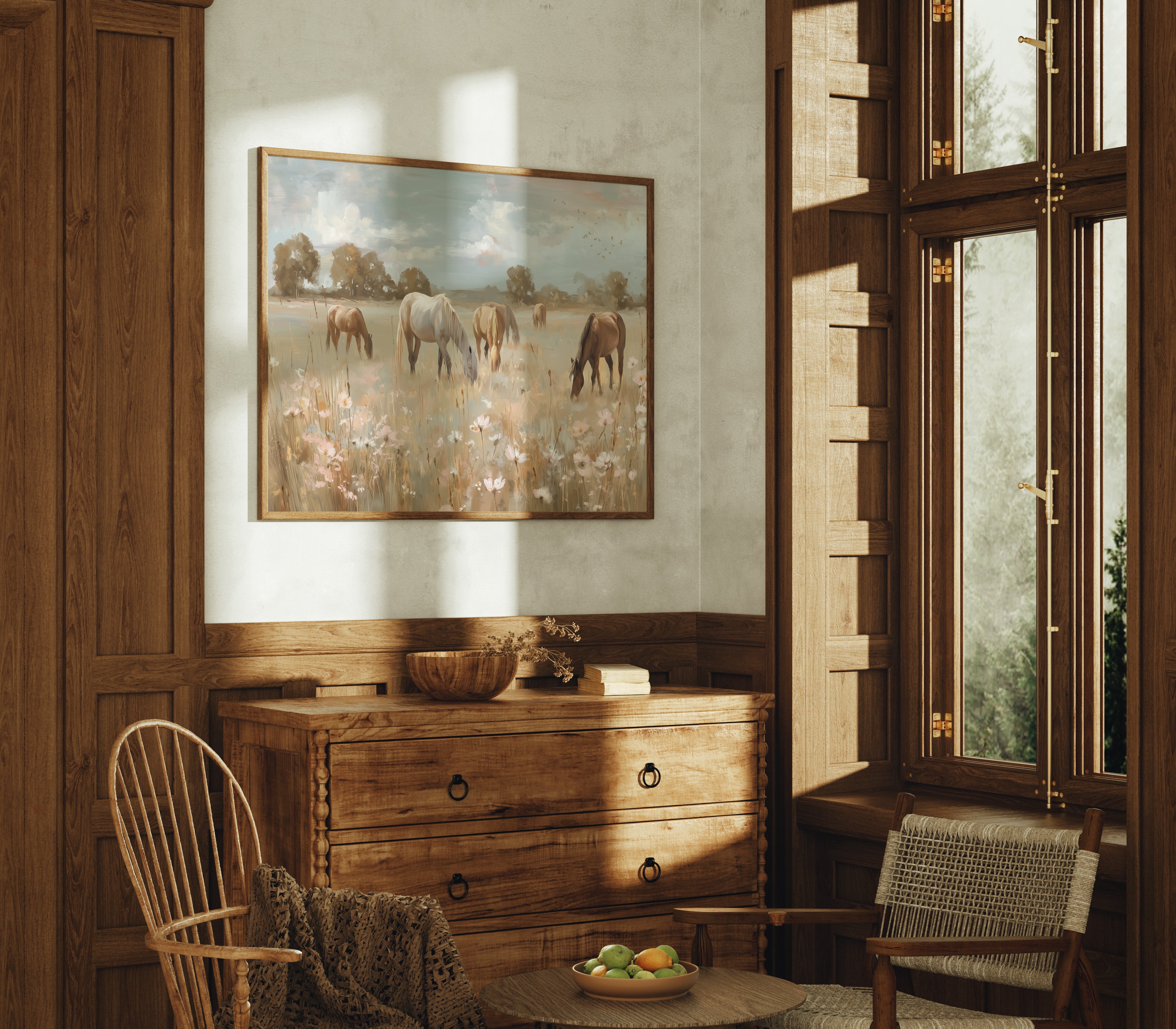 Morning light spills across a meadow where horses graze among delicate cosmos flowers, their forms soft against the golden hour haze. This contemporary pastoral piece captures the gentle harmony between wild beauty and cultivated grace. The composition unfolds in layers of warm neutrals and blush tones, with the horses' gentle movements echoing the swaying of wildflowers in the breeze. White and cream petals dance around sturdy equine legs while distant trees frame the peaceful scene beneath a pearl-tinted sky. Perfect for bringing natural serenity to a living room or adding romantic charm to a bedroom sanctuary. Each viewing reveals new details in this meditation on freedom and grace.