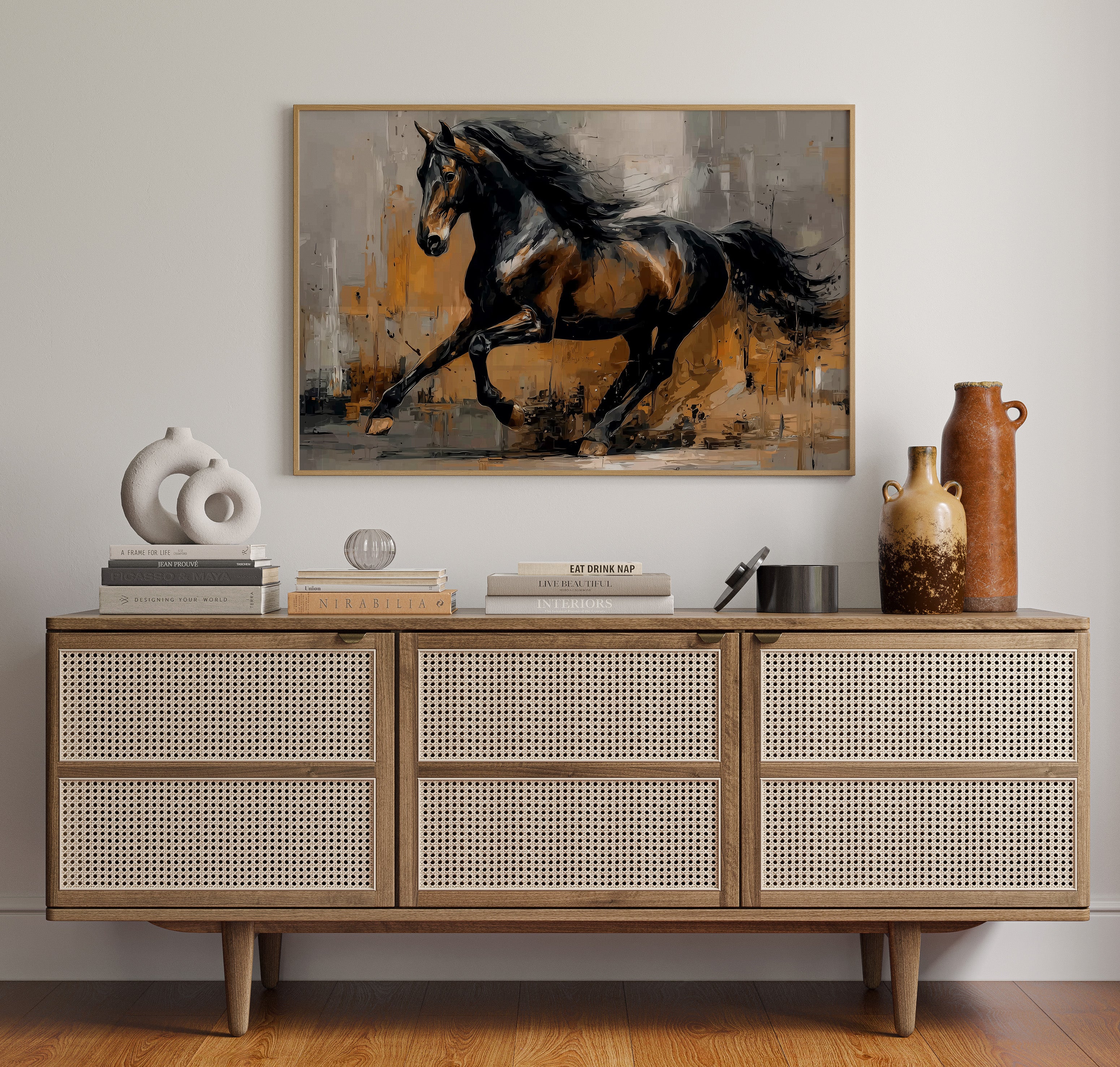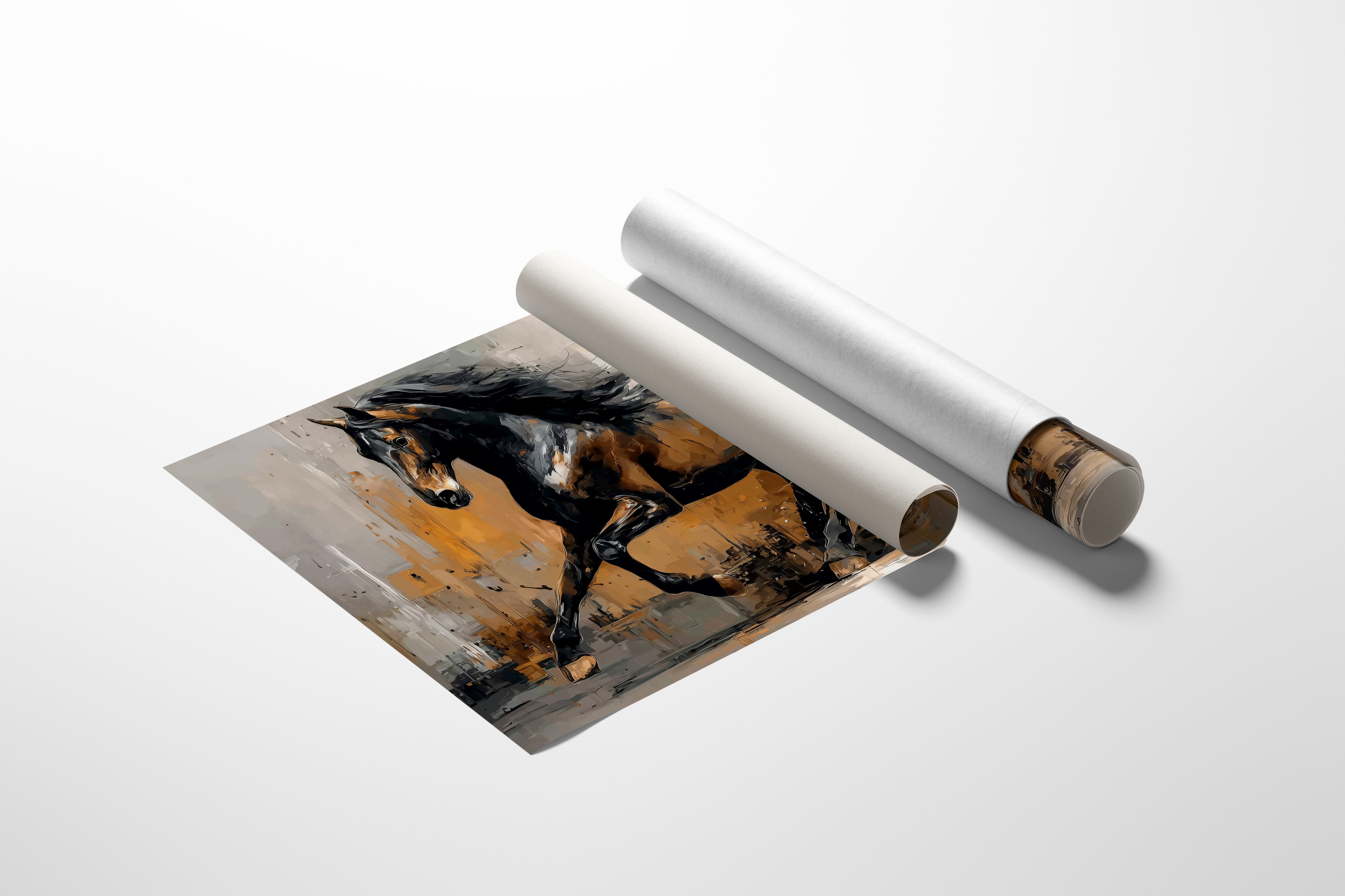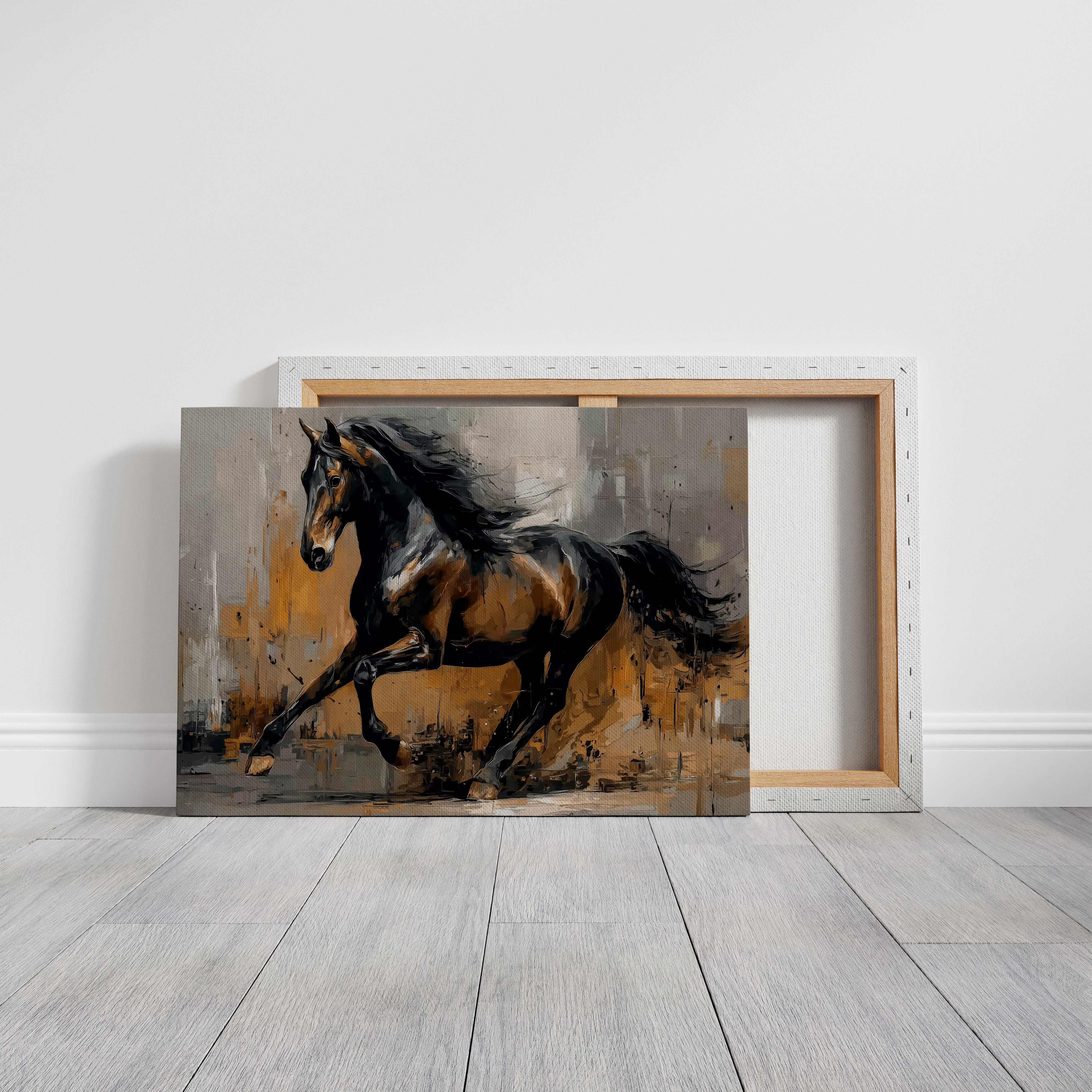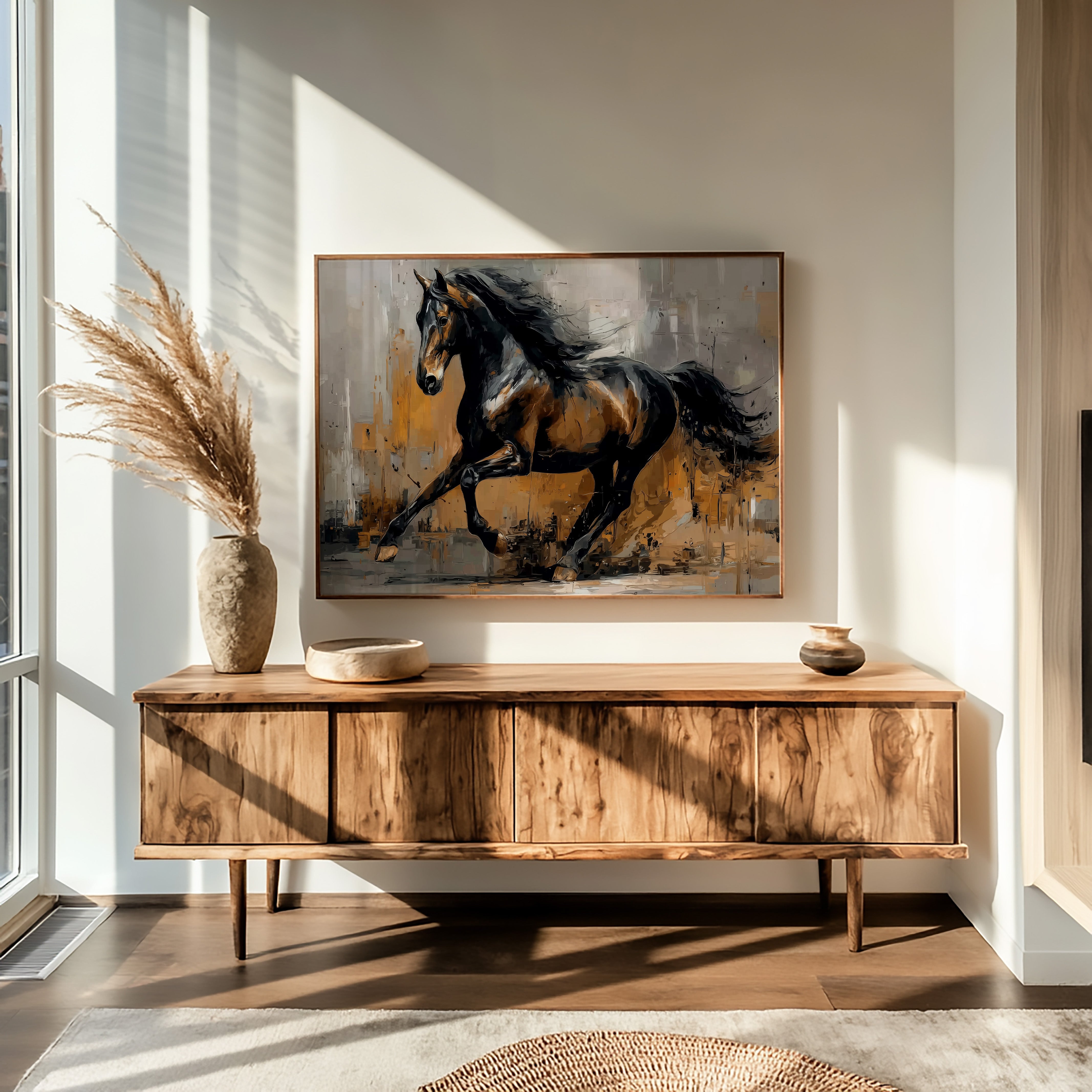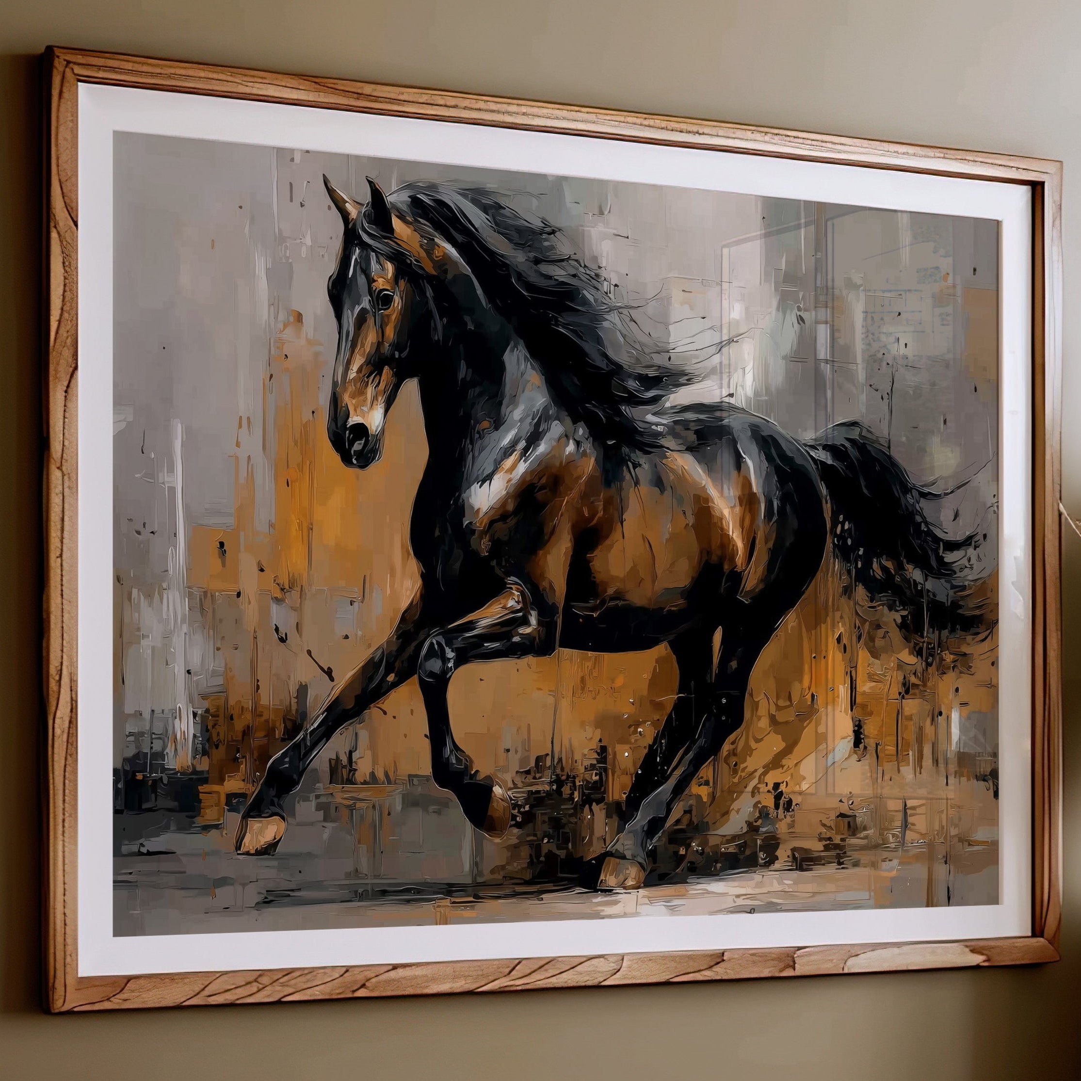 A majestic stallion bursts through a storm of amber and grey, its powerful form captured in dynamic brushstrokes that seem to pulse with raw energy. The horse's muscular body moves with untamed grace, its dark mane flowing like silk against the abstract landscape of warm earth tones and stormy greys. The textural interplay of light and shadow creates a dramatic narrative of freedom and power, while bold impasto techniques bring dimensional depth to every movement. This striking piece commands attention as a focal point in a modern ranch house, contemporary living room, or any space that celebrates the untamed beauty of equine artistry.