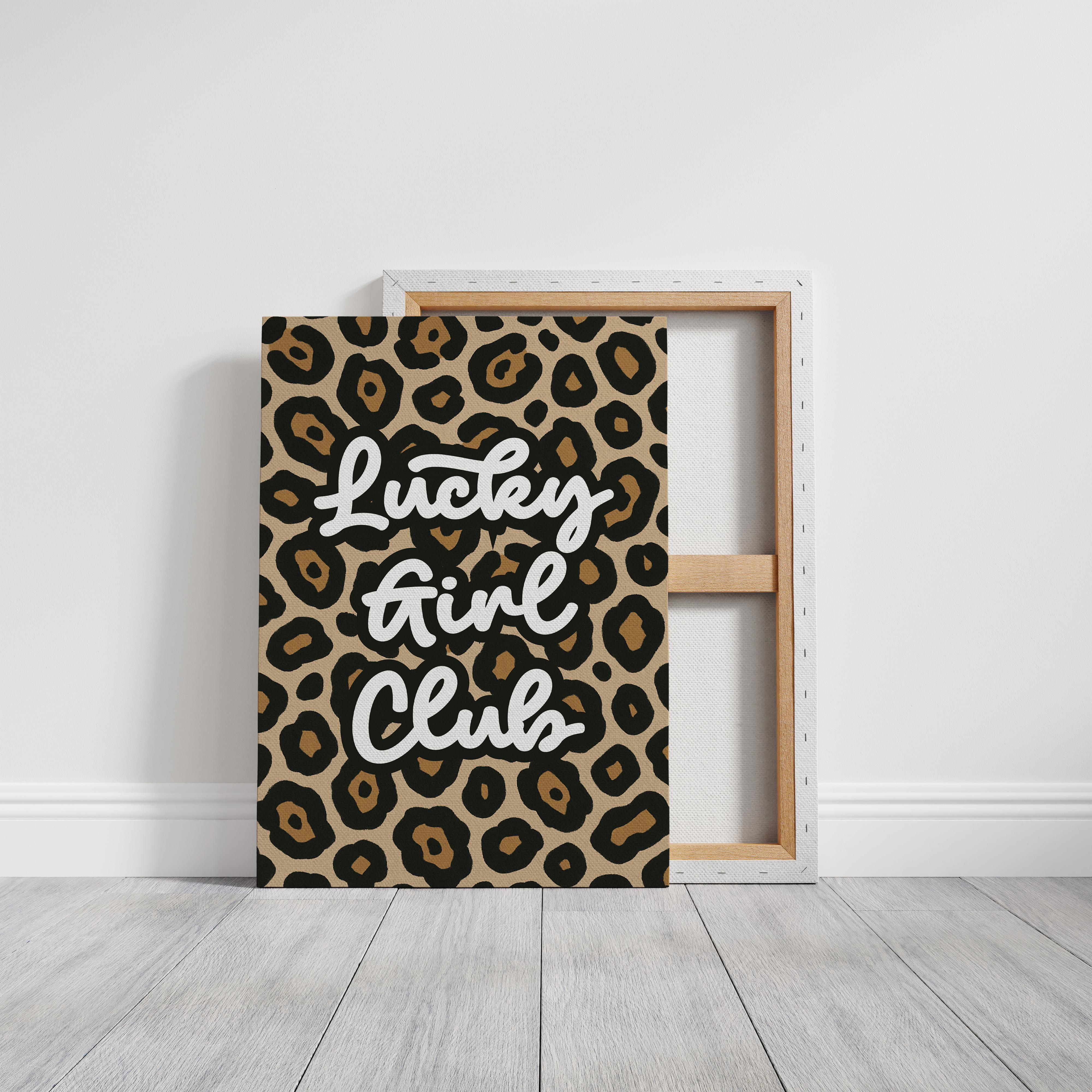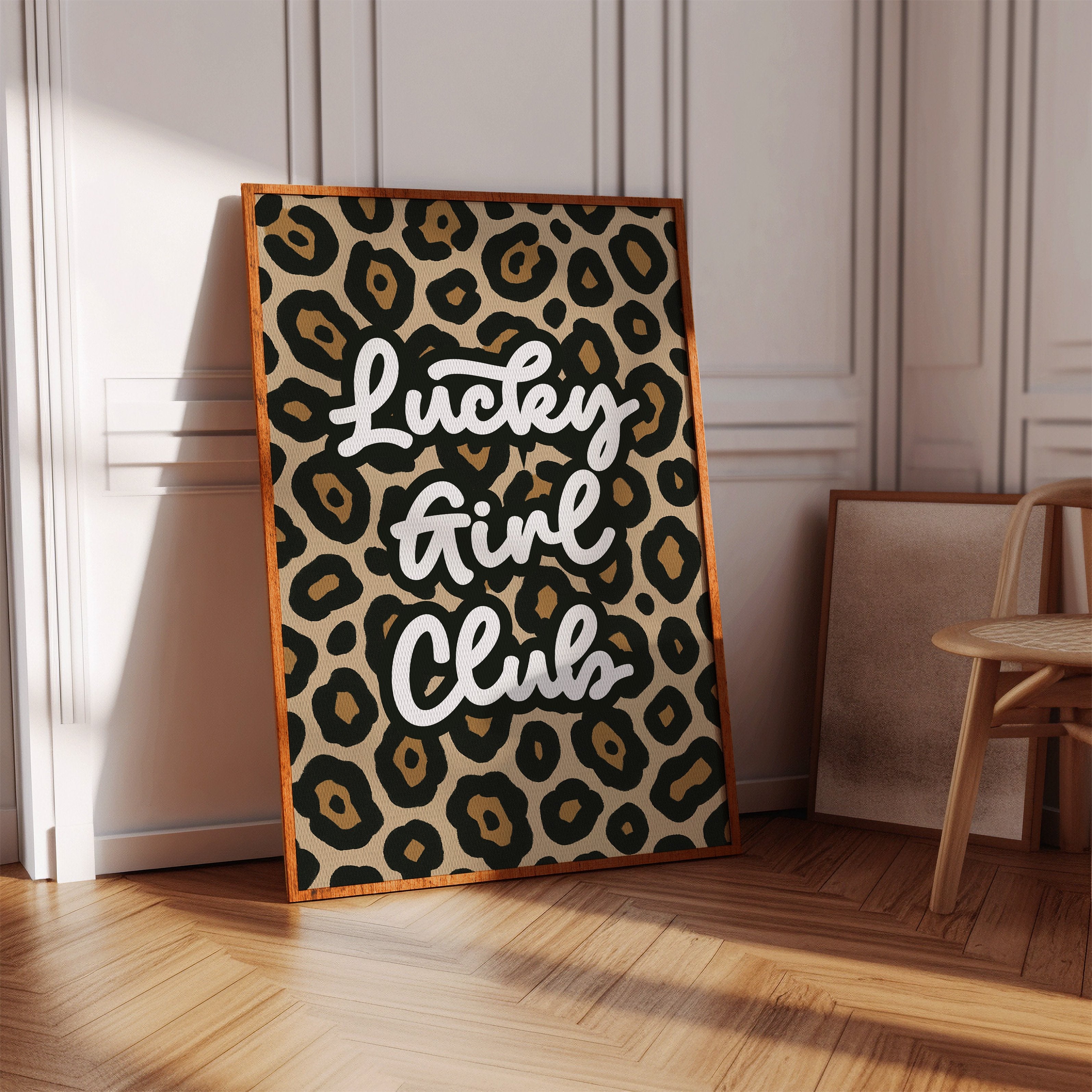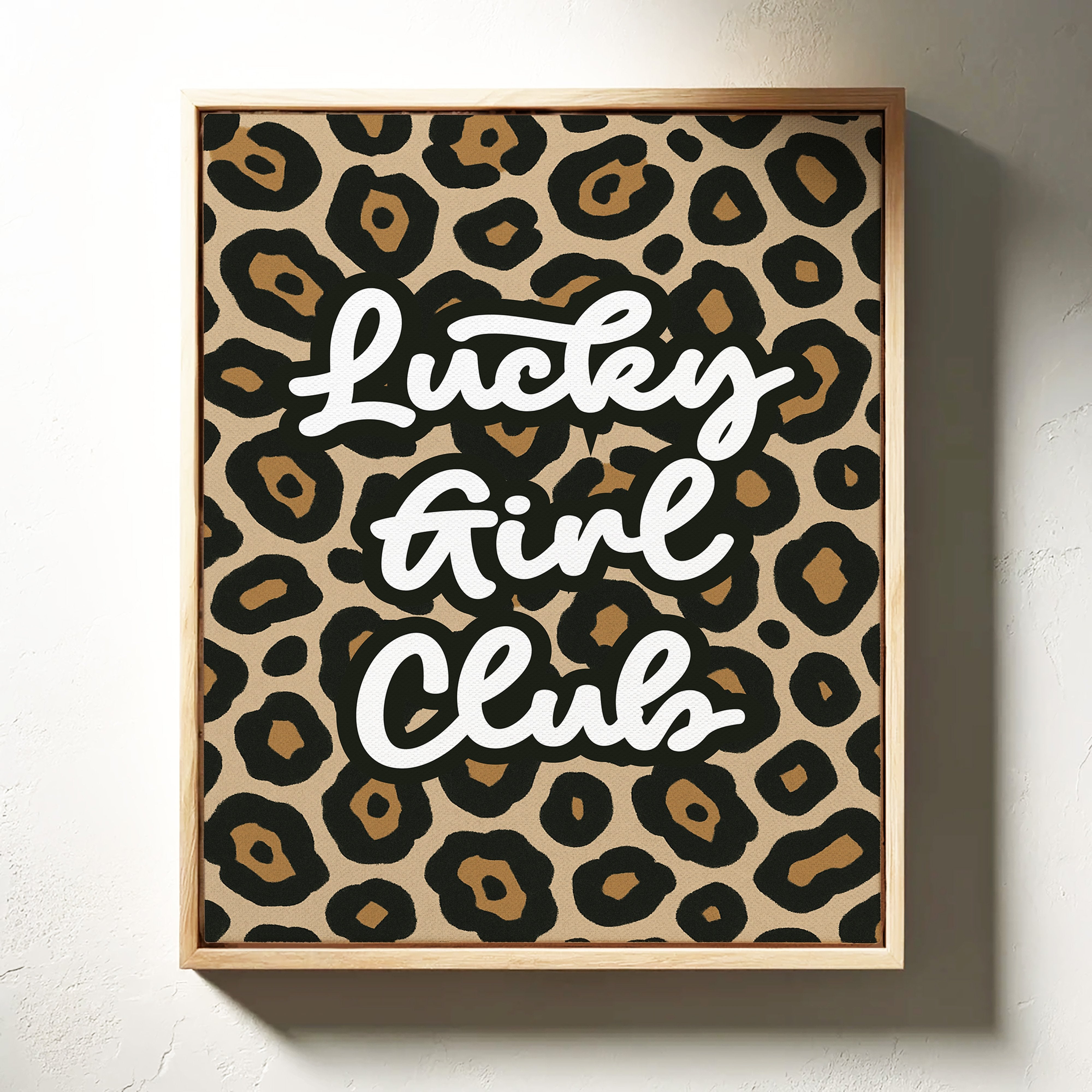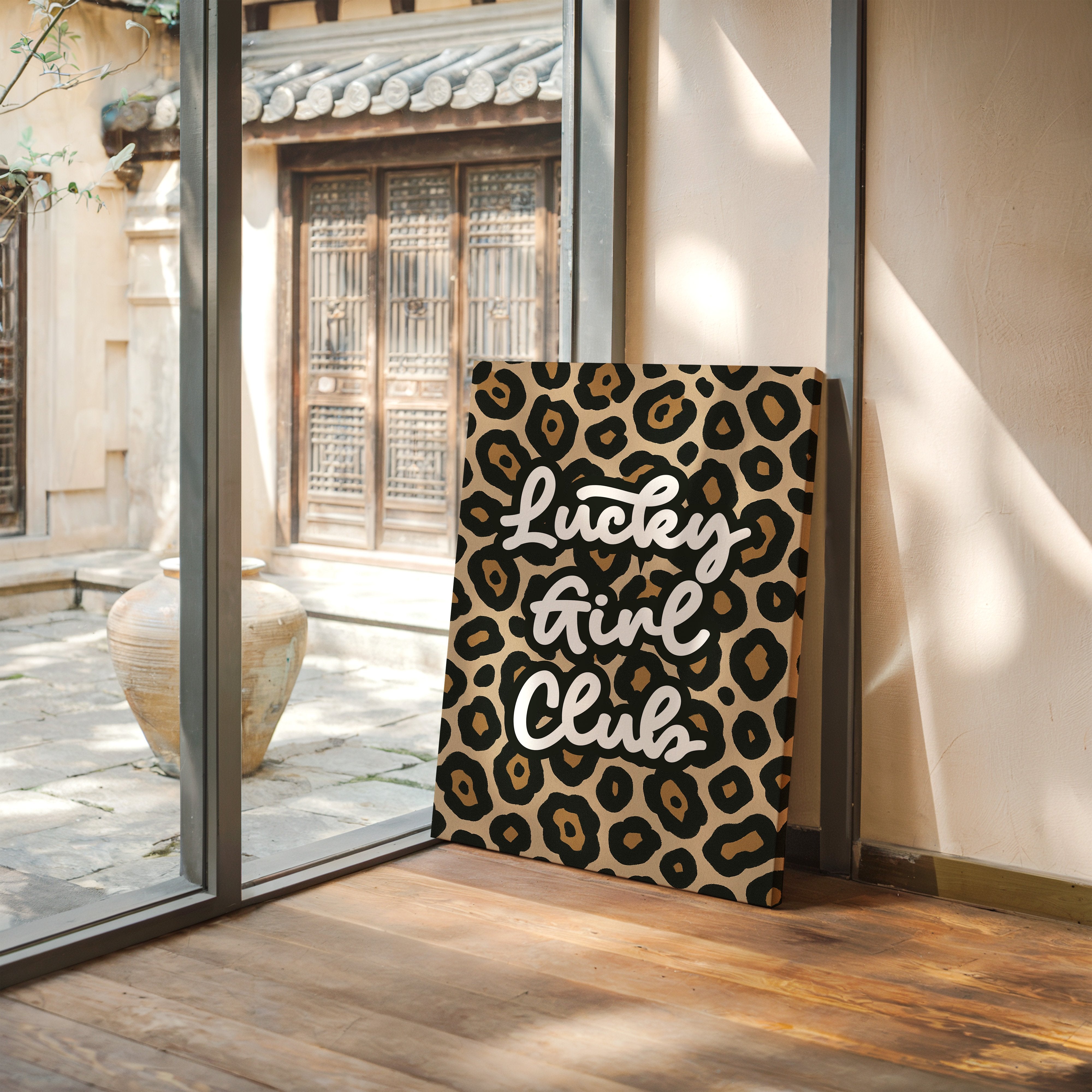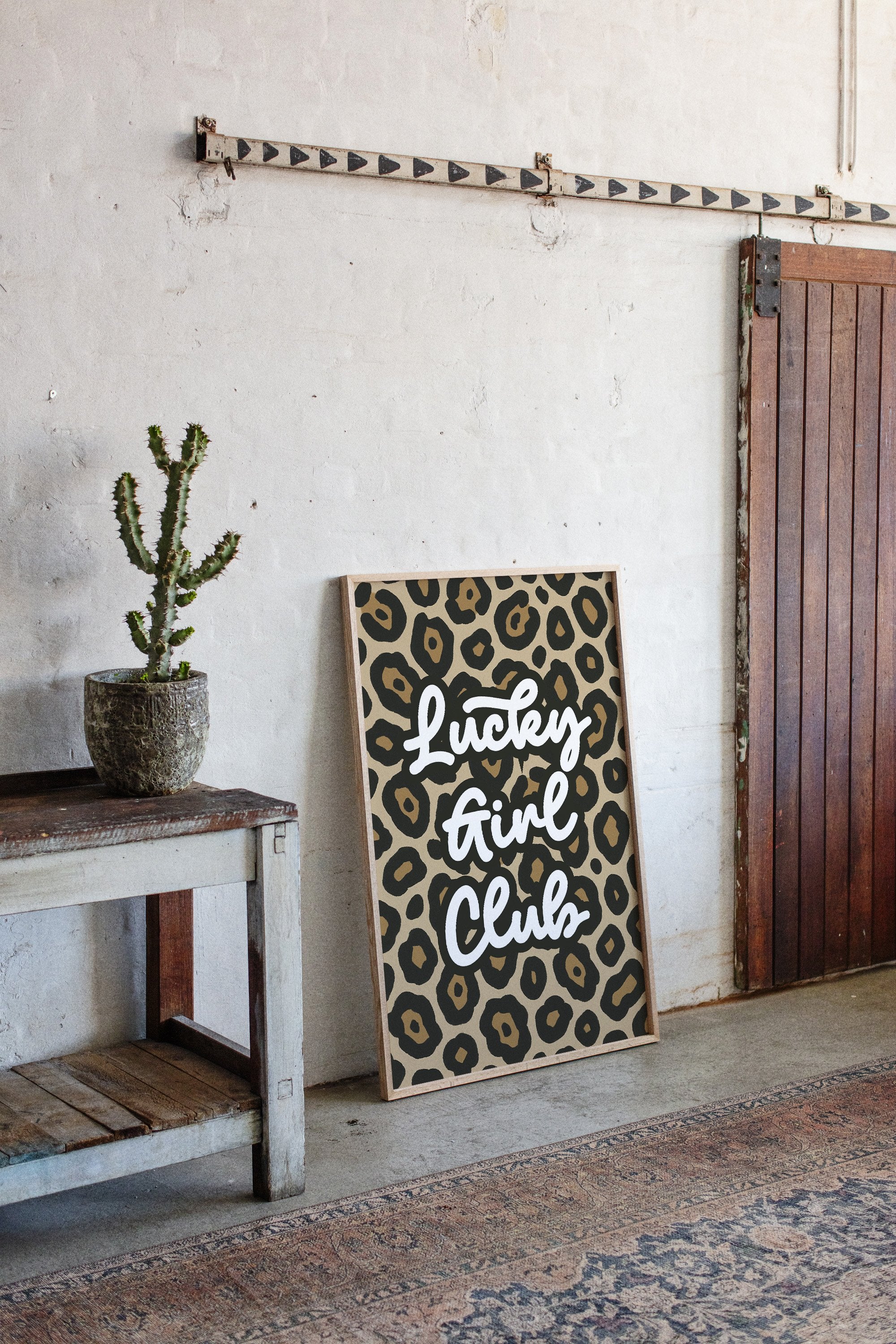 Bold leopard spots create a mesmerizing backdrop for crisp white typography, merging untamed nature with modern style. The tan and black pattern pulses with primal energy while elegant script lettering adds a touch of sophistication and playful confidence. This piece speaks to those who embrace both their fierce independence and their lucky stars. Perfect for adding a bold statement to a home office, dressing room, or any space that needs an injection of confident energy. The neutral palette allows it to complement various decor styles while making its own fearless declaration.