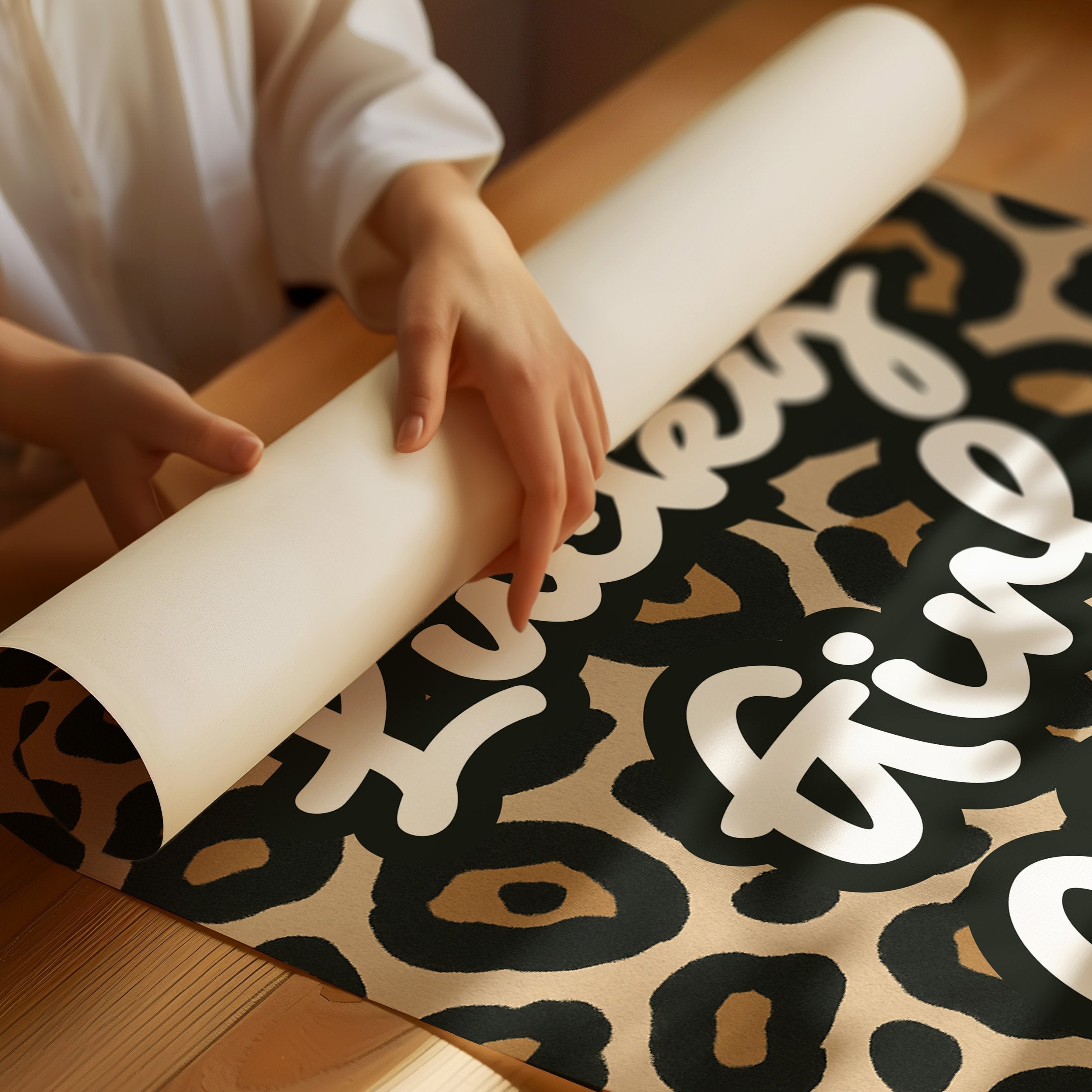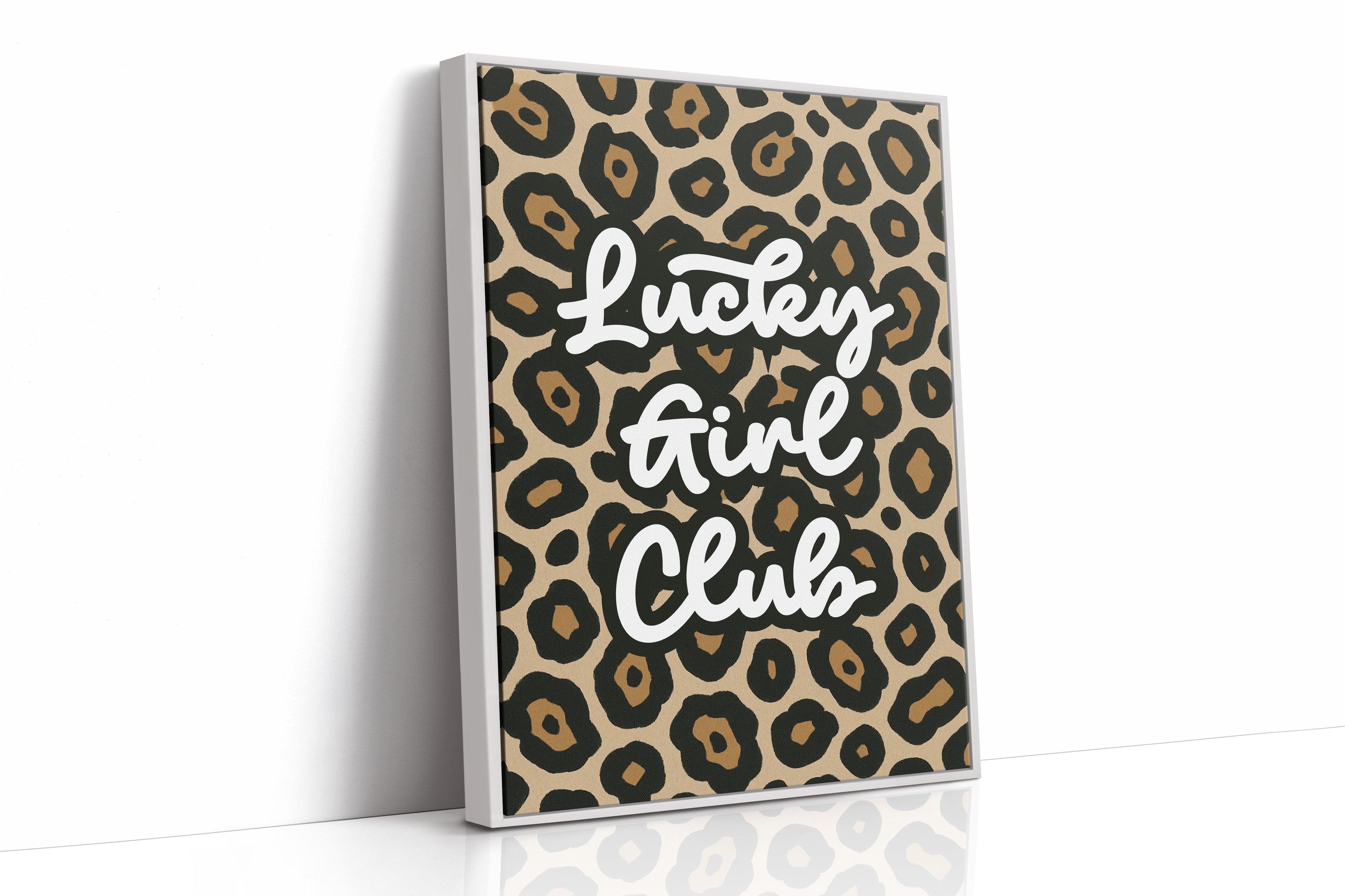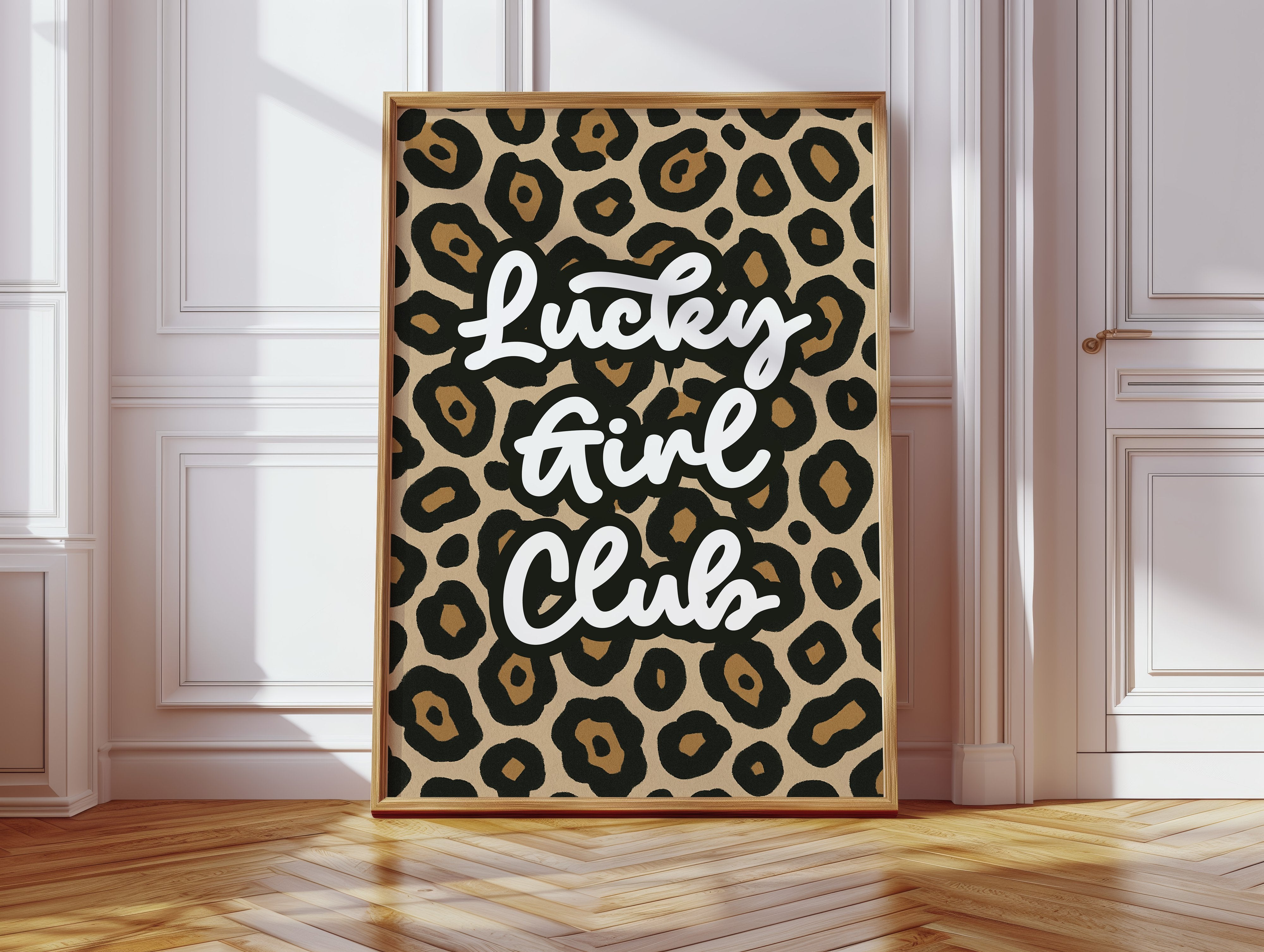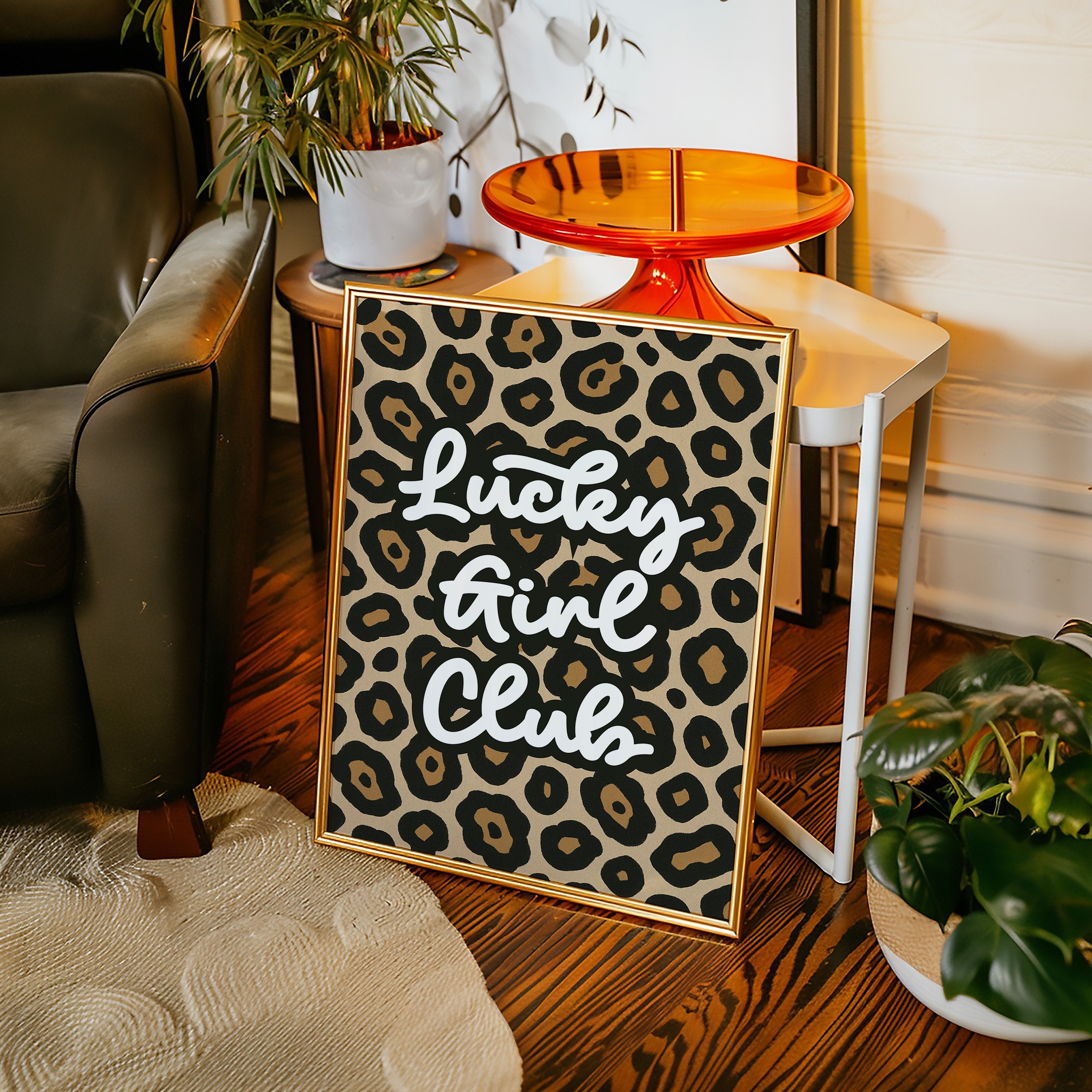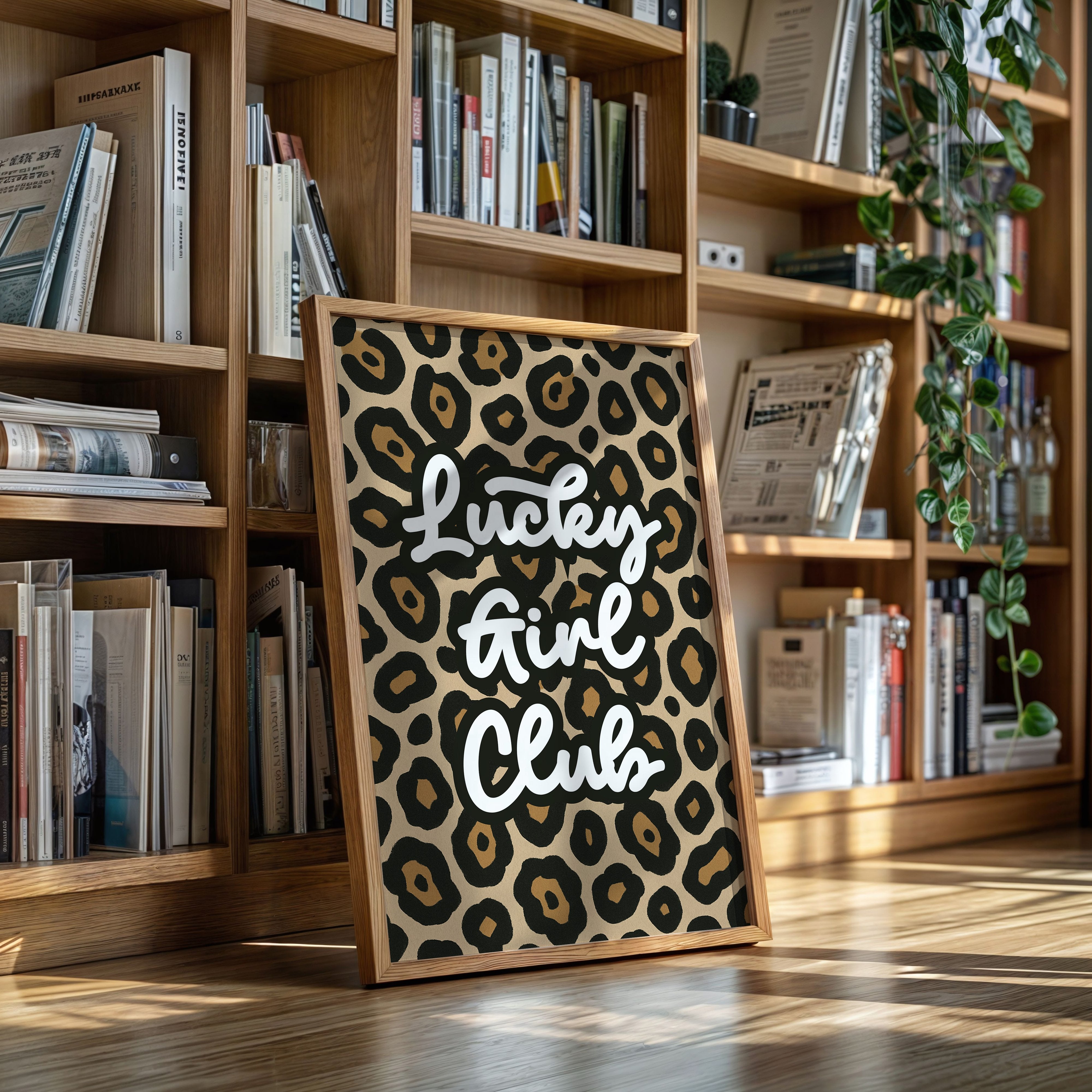 Bold leopard spots create a mesmerizing backdrop for crisp white typography, merging untamed nature with modern style. The tan and black pattern pulses with primal energy while elegant script lettering adds a touch of sophistication and playful confidence. This piece speaks to those who embrace both their fierce independence and their lucky stars. Perfect for adding a bold statement to a home office, dressing room, or any space that needs an injection of confident energy. The neutral palette allows it to complement various decor styles while making its own fearless declaration.