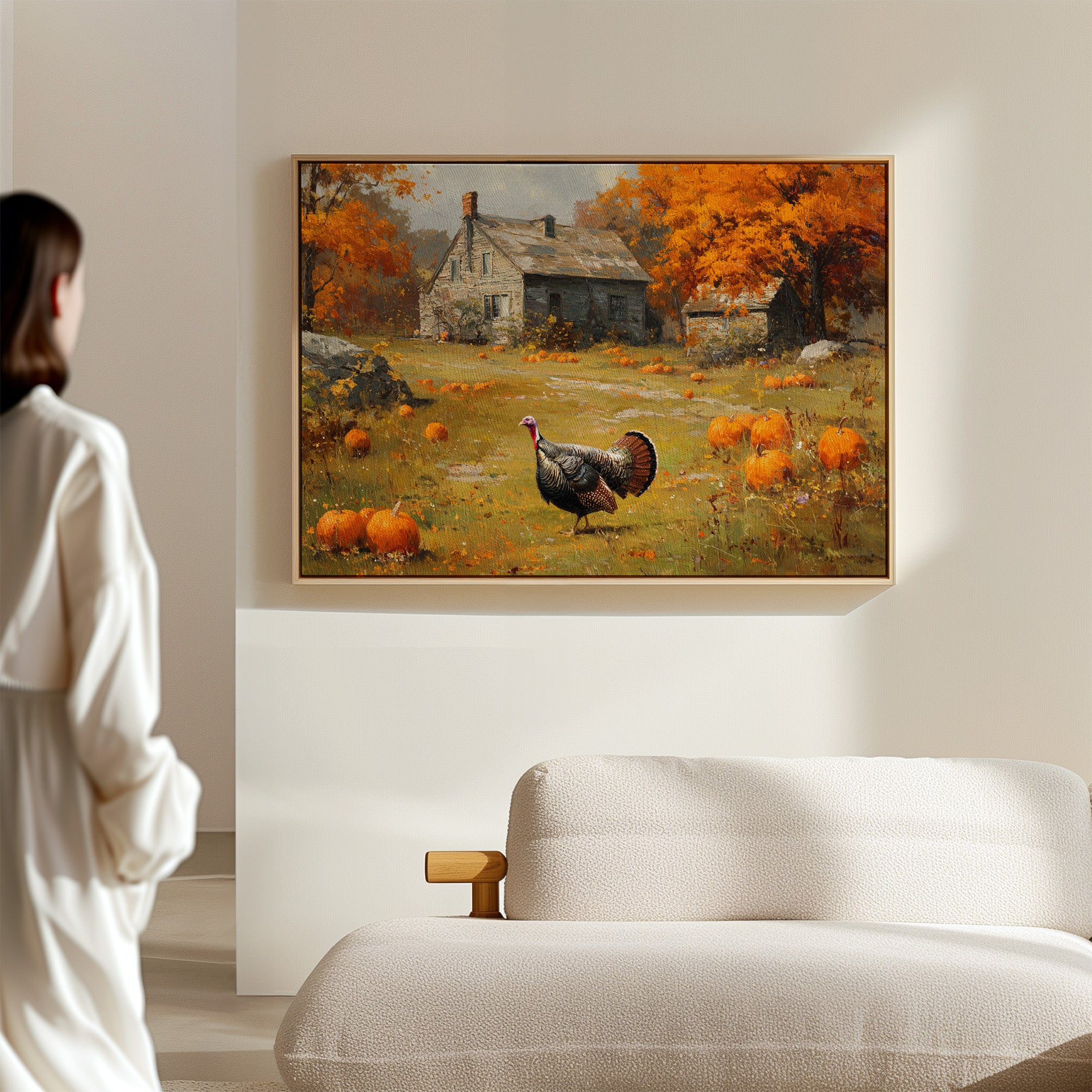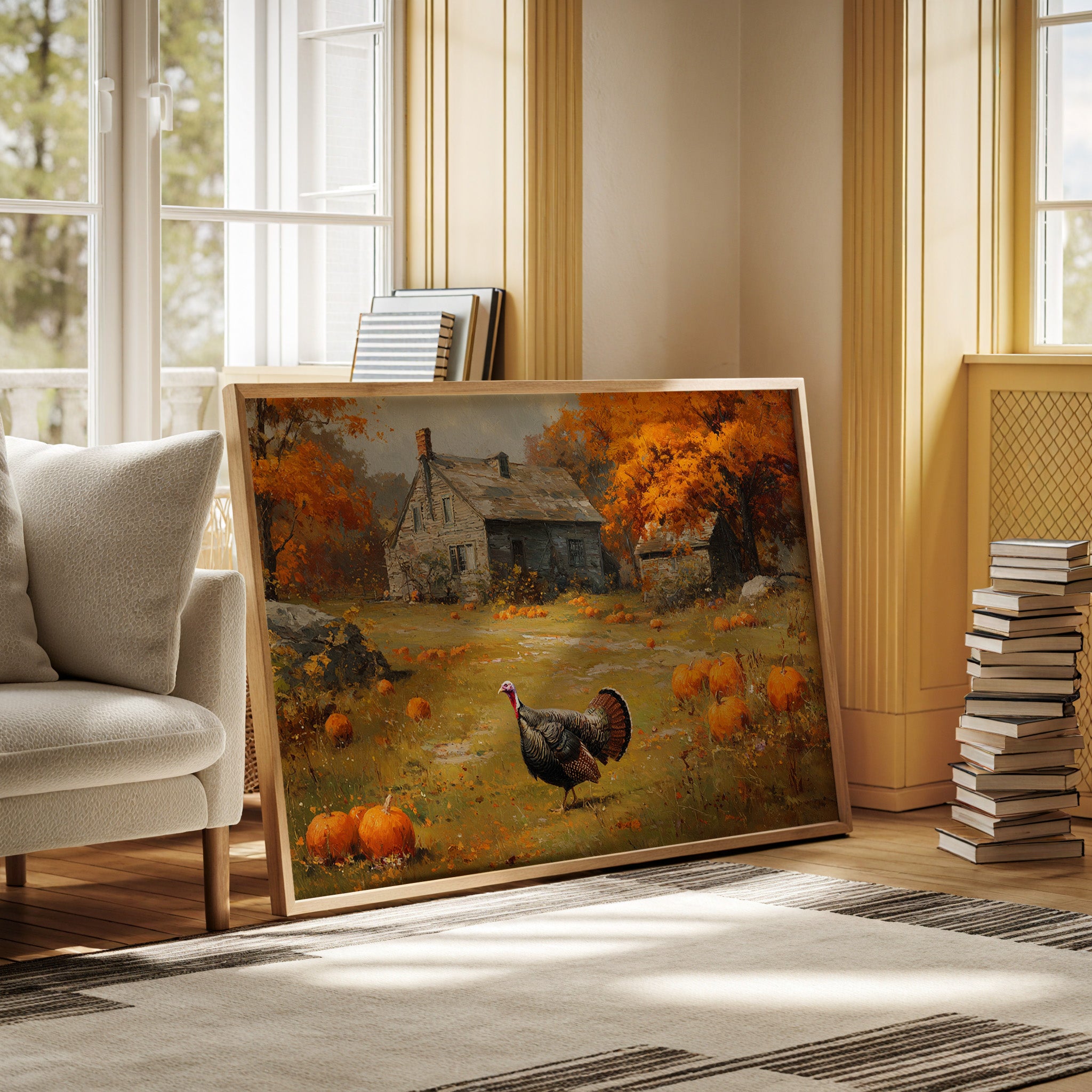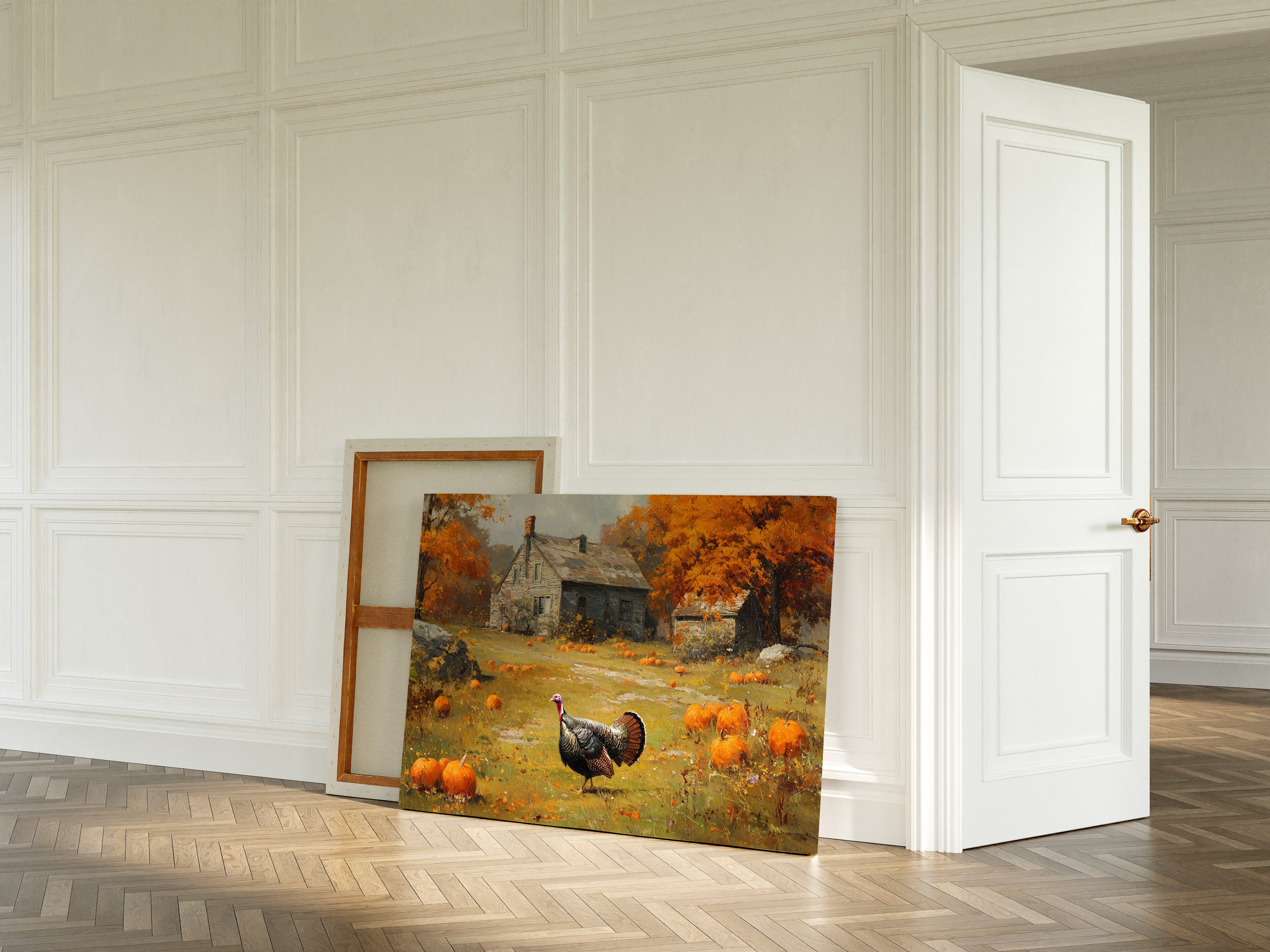 Golden autumn light spills across a rustic farmyard where a proud turkey struts among scattered pumpkins. The weathered farmhouse stands sentinel, its aged wooden siding telling stories of harvests past, while brilliant orange maples frame the scene in their fiery embrace. Rich textures emerge through the interplay of the turkey's iridescent feathers, the rough-hewn pumpkins, and the wild grasses swaying in the October breeze. This pastoral vignette captures the essence of rural American autumn, where nature's bounty meets architectural heritage.