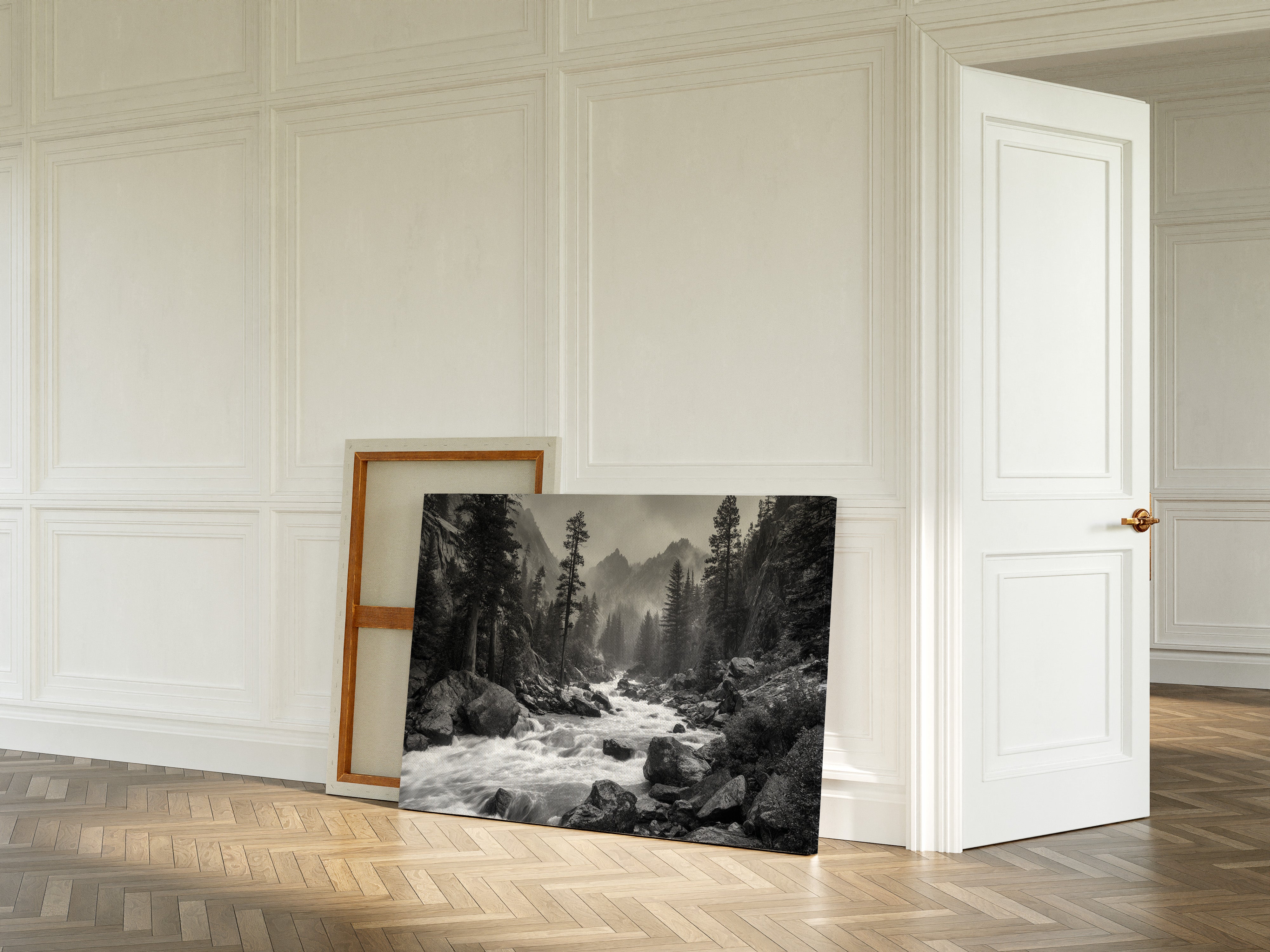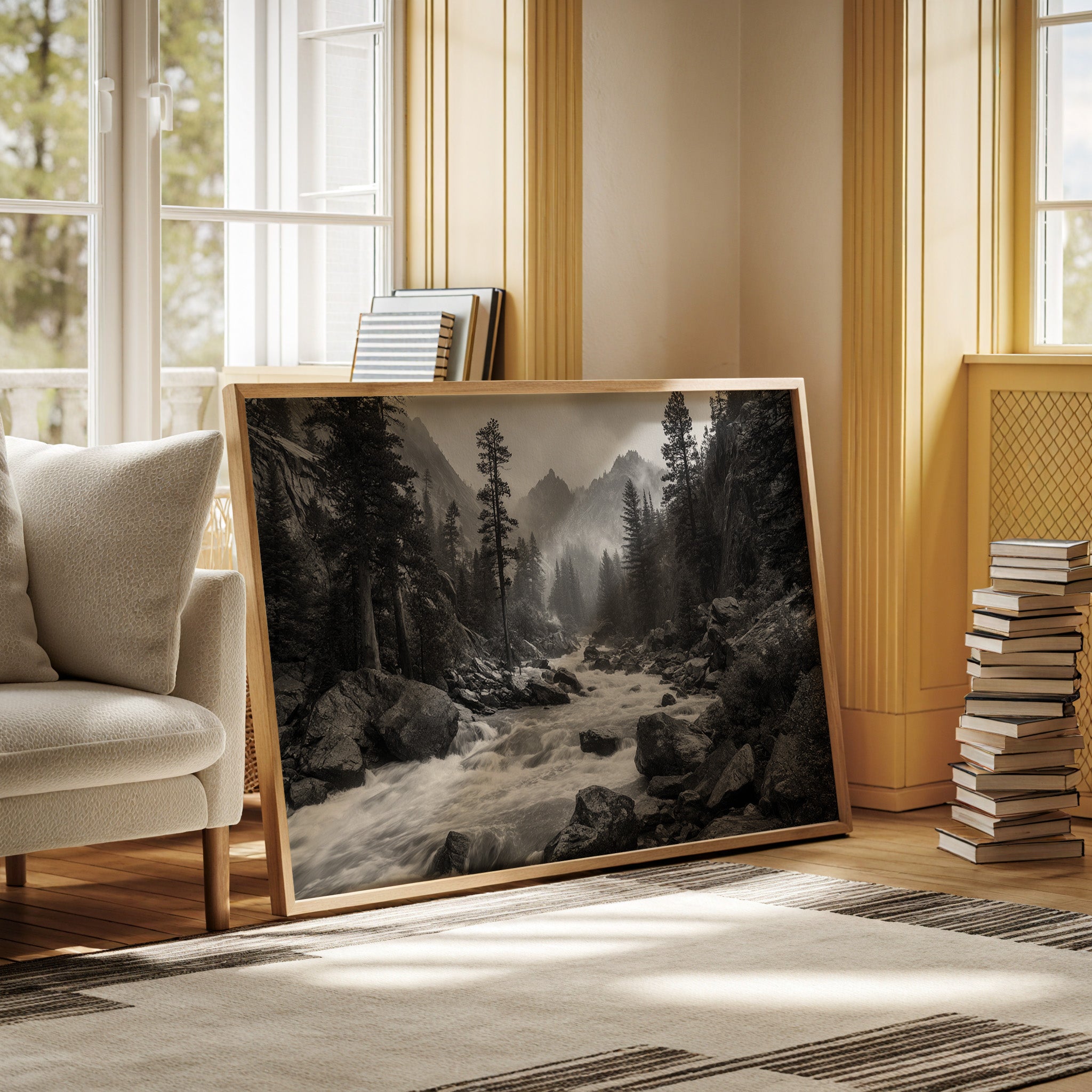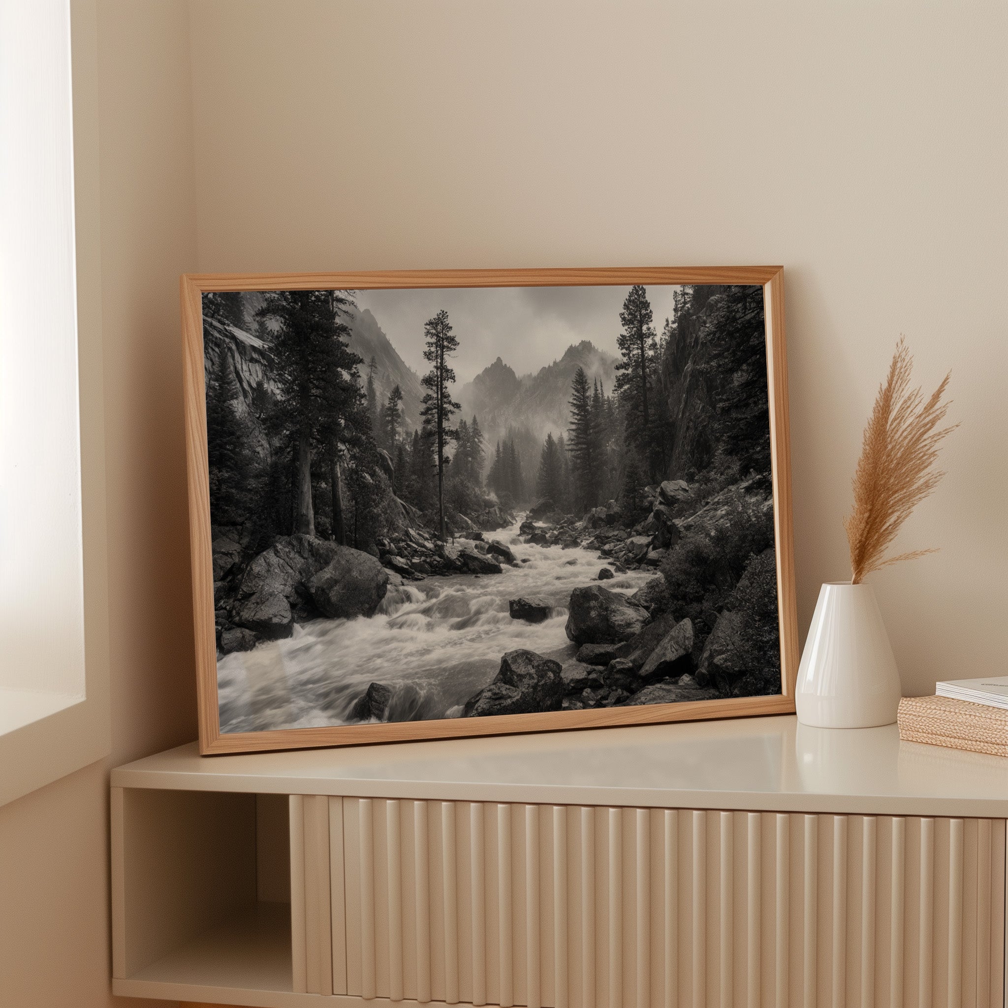 Rushing waters surge through ancient granite, their white foam a stark contrast against dark rocks in this monochromatic symphony. Towering pines stand sentinel along the riverbank, their silhouettes reaching skyward as morning mist embraces distant peaks. The raw power of the mountain stream speaks to something primordial, each boulder and cascade telling stories of geological time. This dramatic landscape captures the untamed spirit of wilderness, where water and stone engage in their eternal dance. Perfect for spaces seeking to evoke a sense of adventure and natural grandeur, this piece brings the commanding presence of the wild into contemporary living areas.