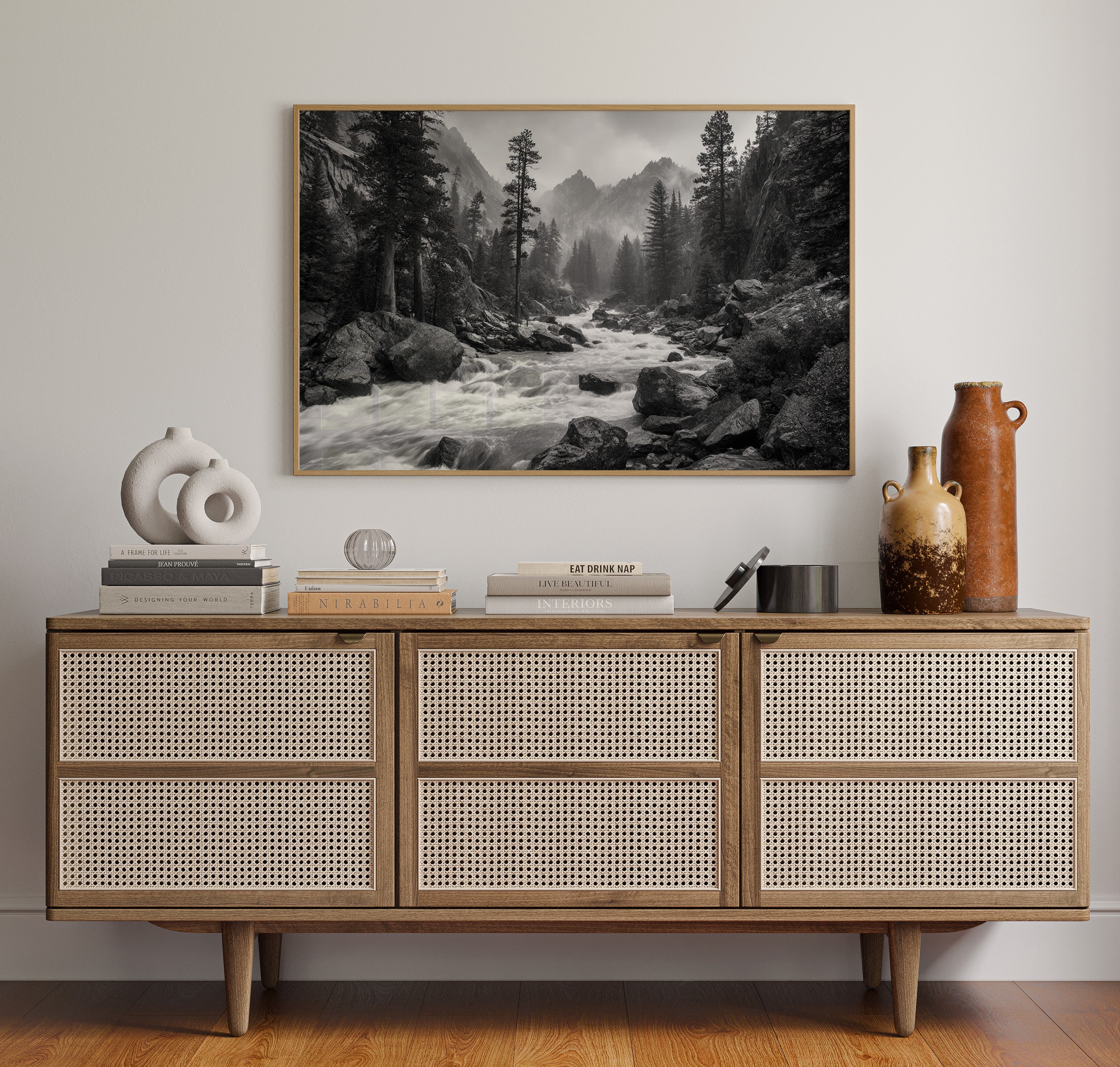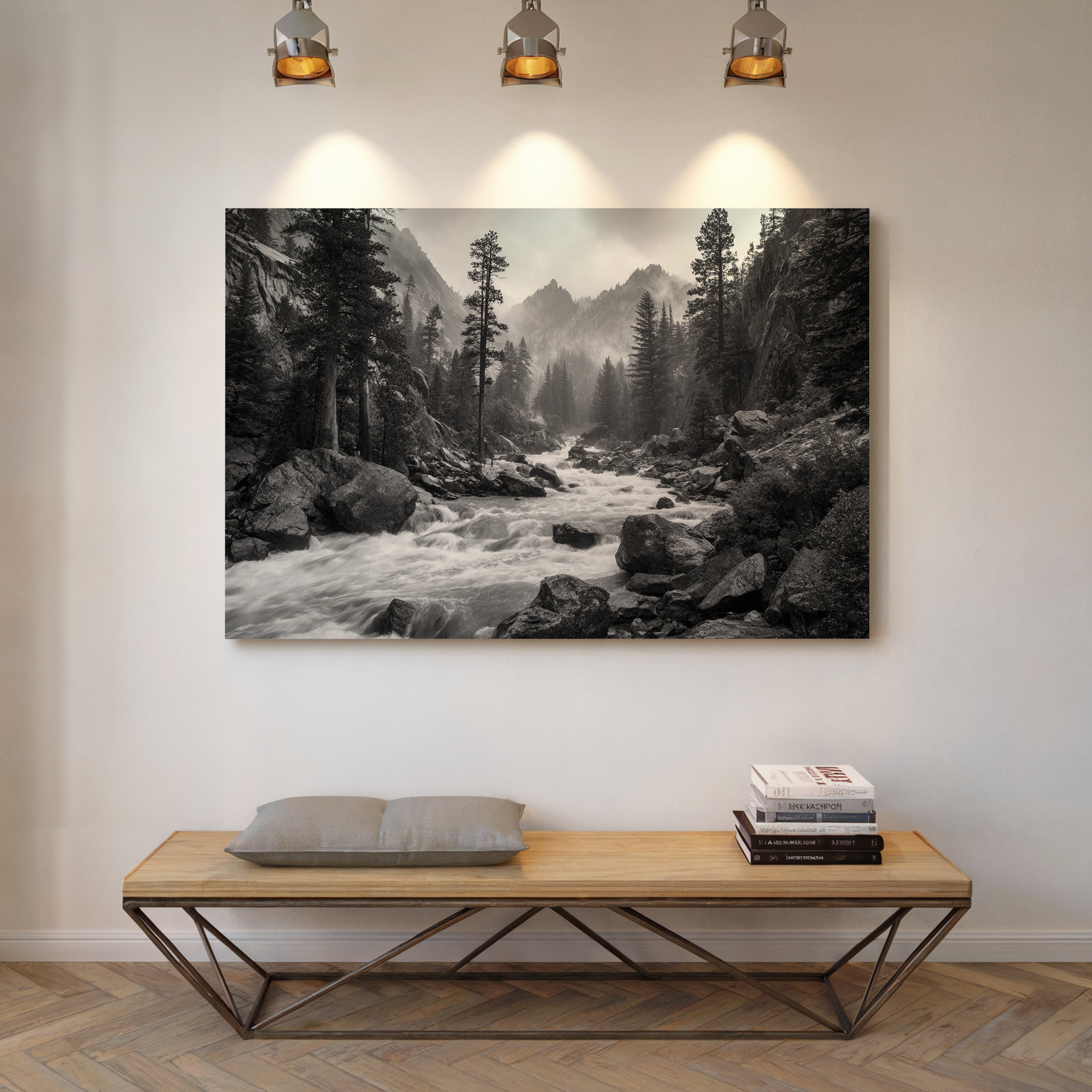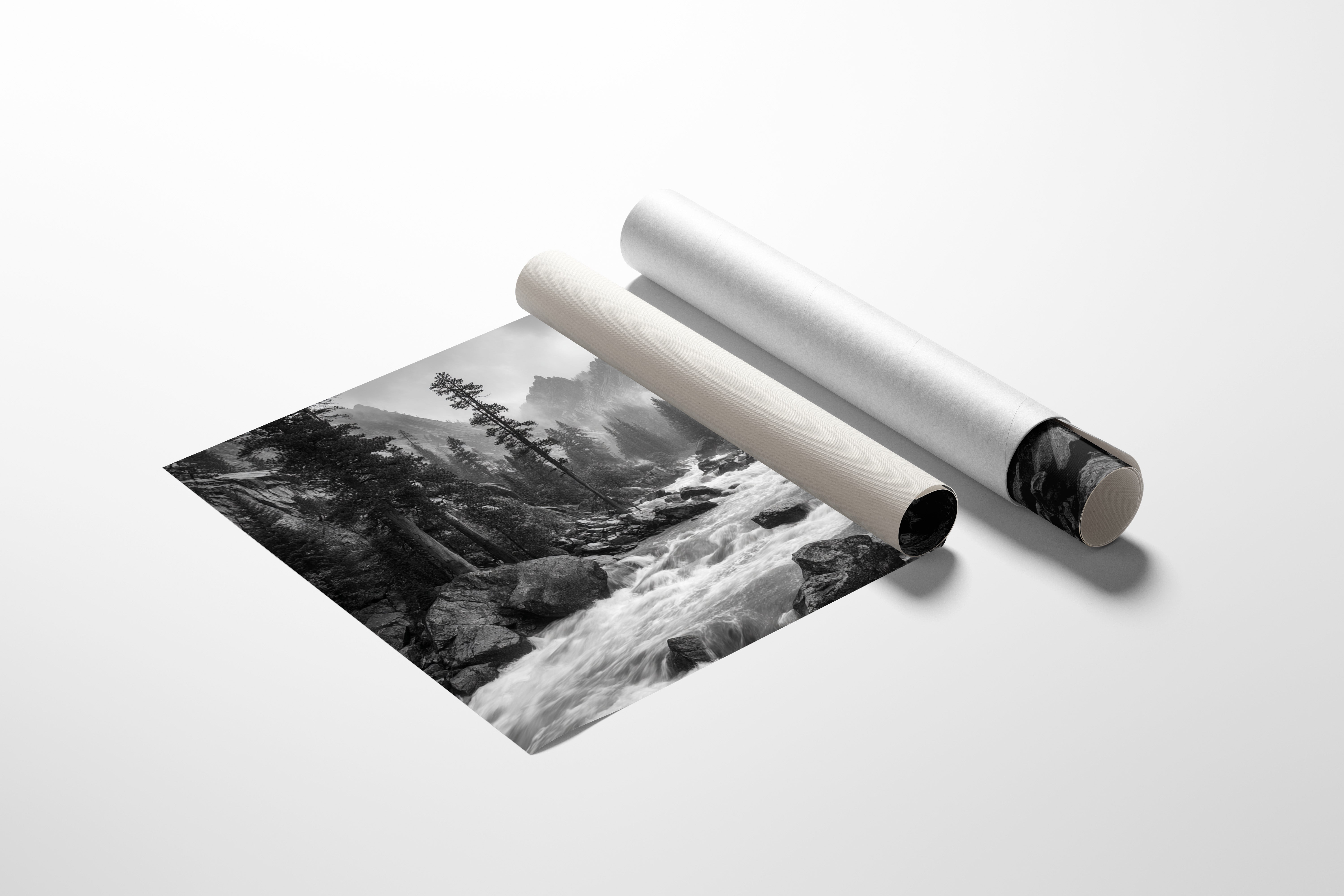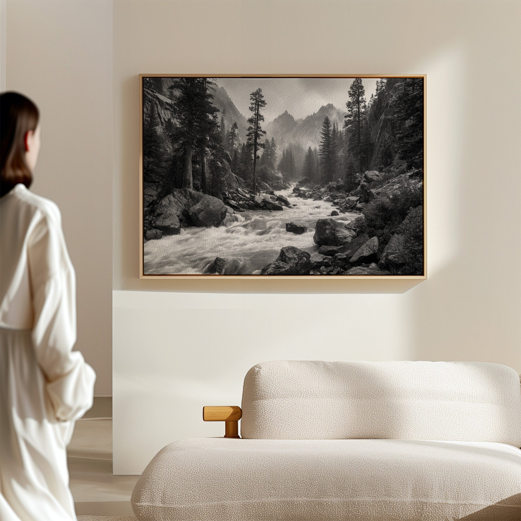 Rushing waters surge through ancient granite, their white foam a stark contrast against dark rocks in this monochromatic symphony. Towering pines stand sentinel along the riverbank, their silhouettes reaching skyward as morning mist embraces distant peaks. The raw power of the mountain stream speaks to something primordial, each boulder and cascade telling stories of geological time. This dramatic landscape captures the untamed spirit of wilderness, where water and stone engage in their eternal dance. Perfect for spaces seeking to evoke a sense of adventure and natural grandeur, this piece brings the commanding presence of the wild into contemporary living areas.