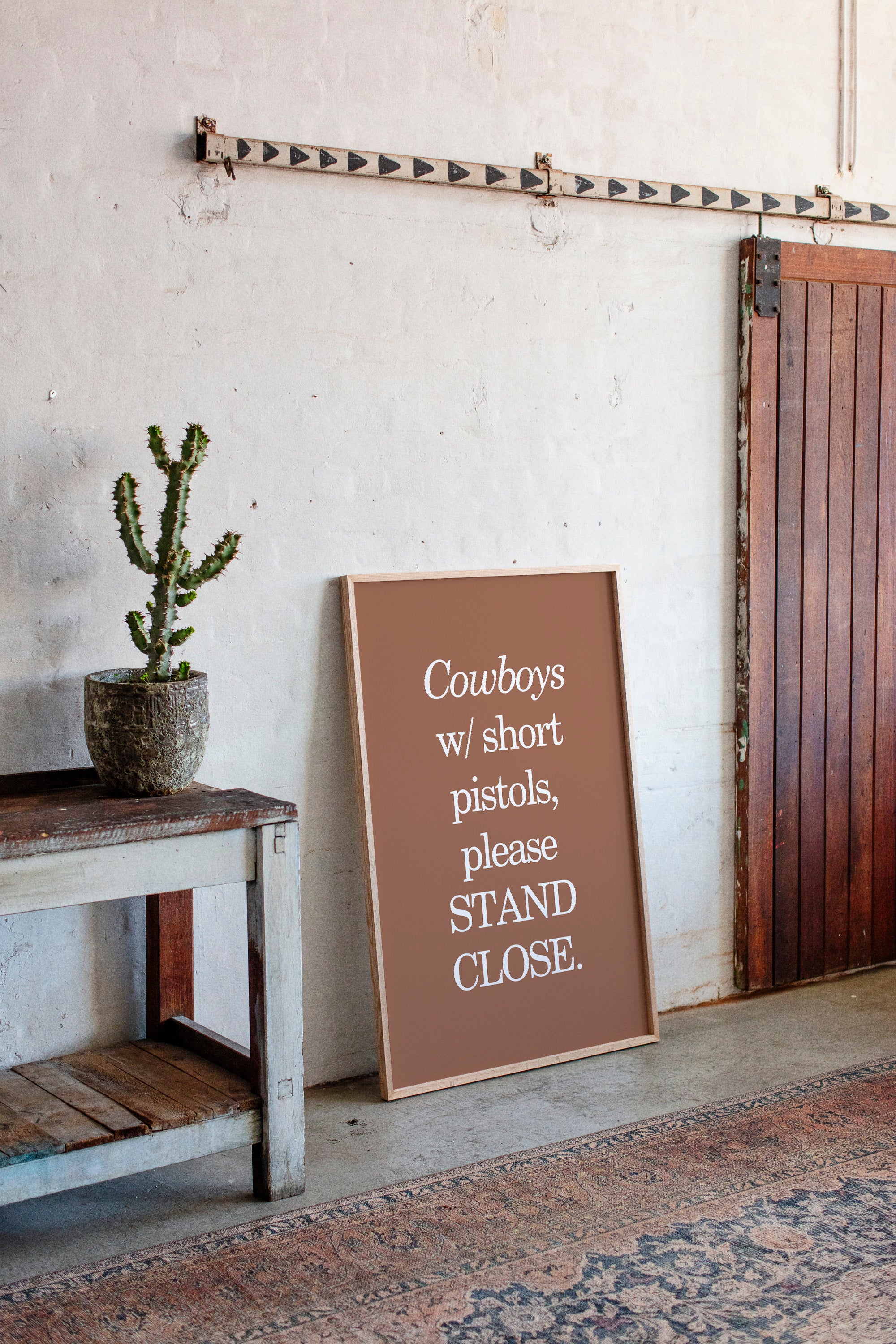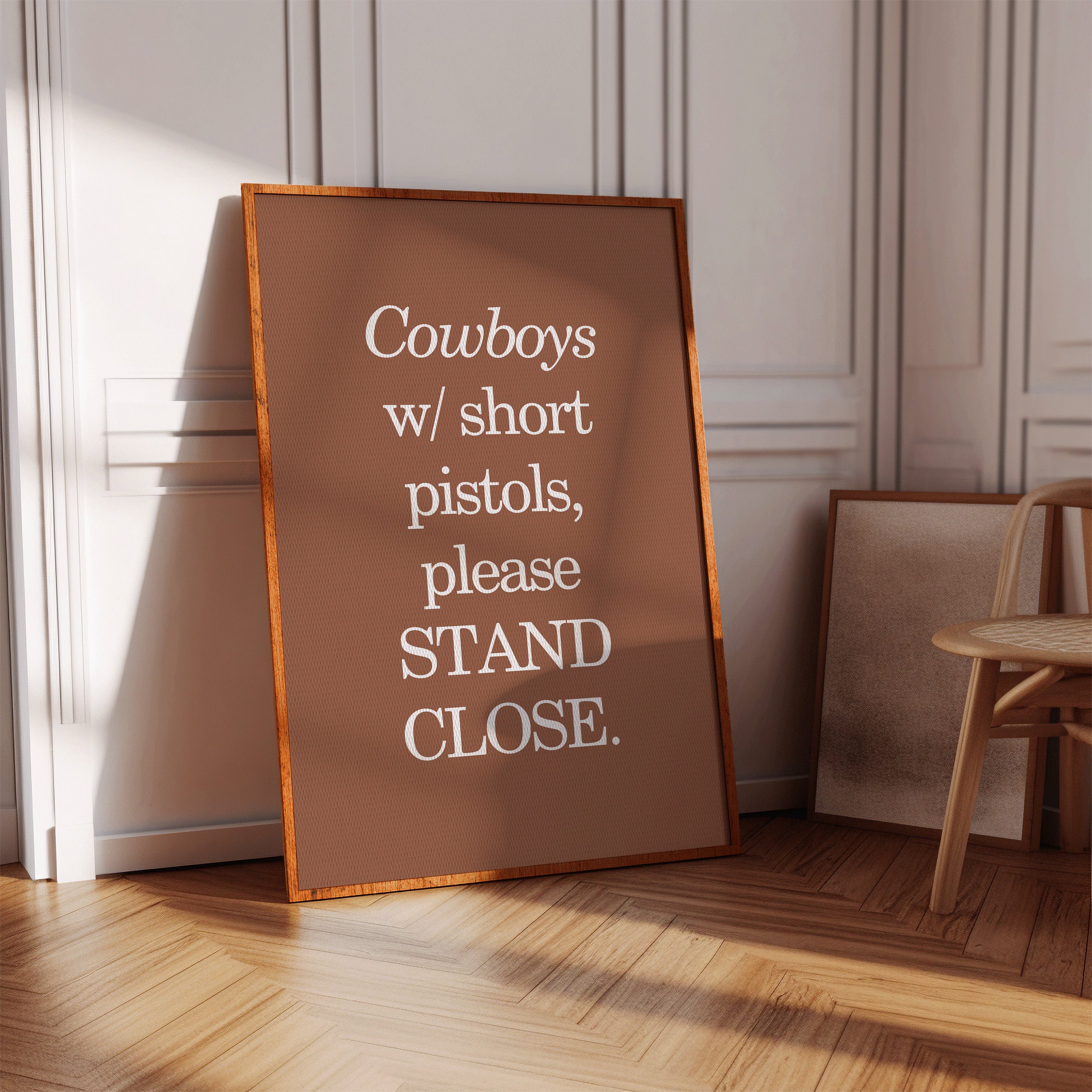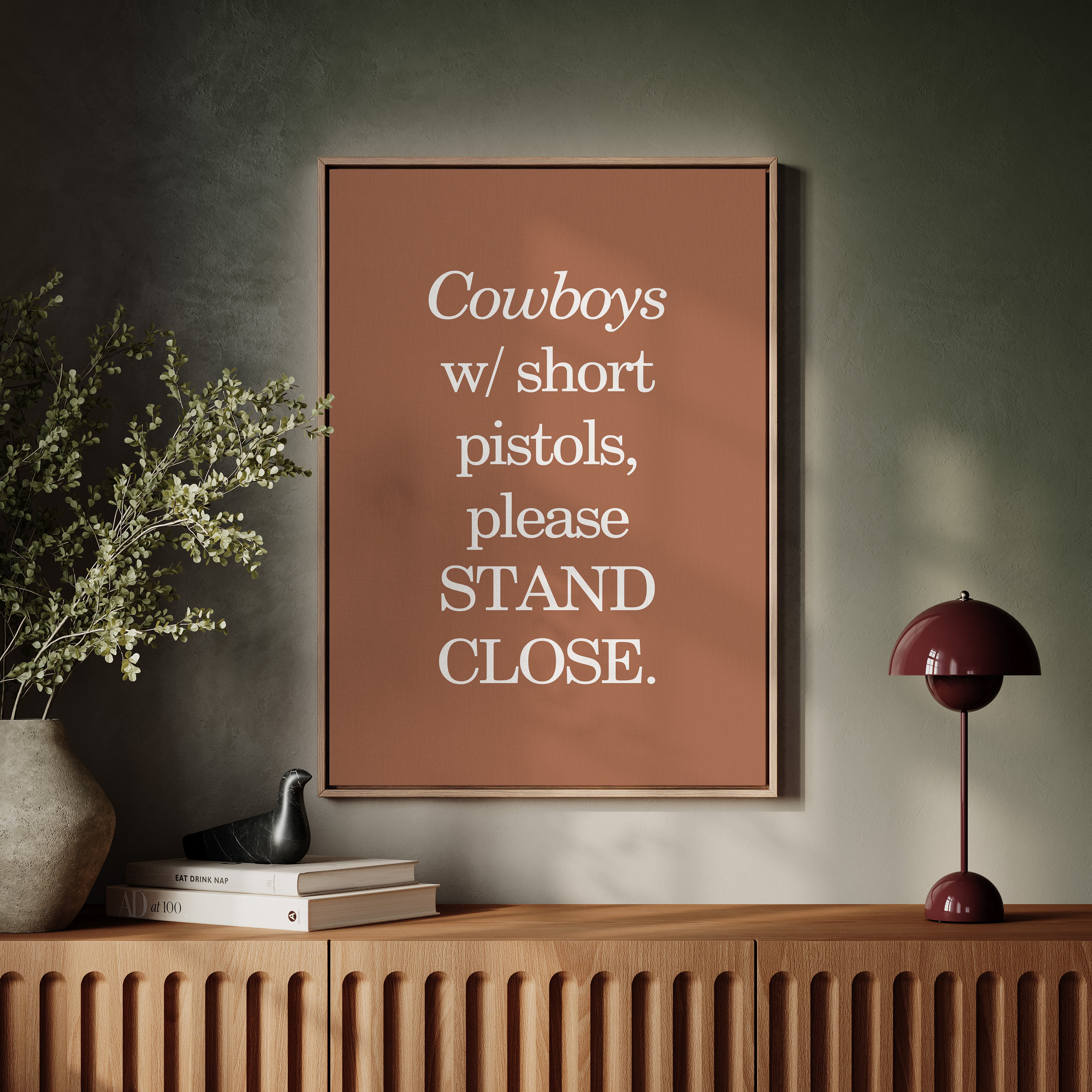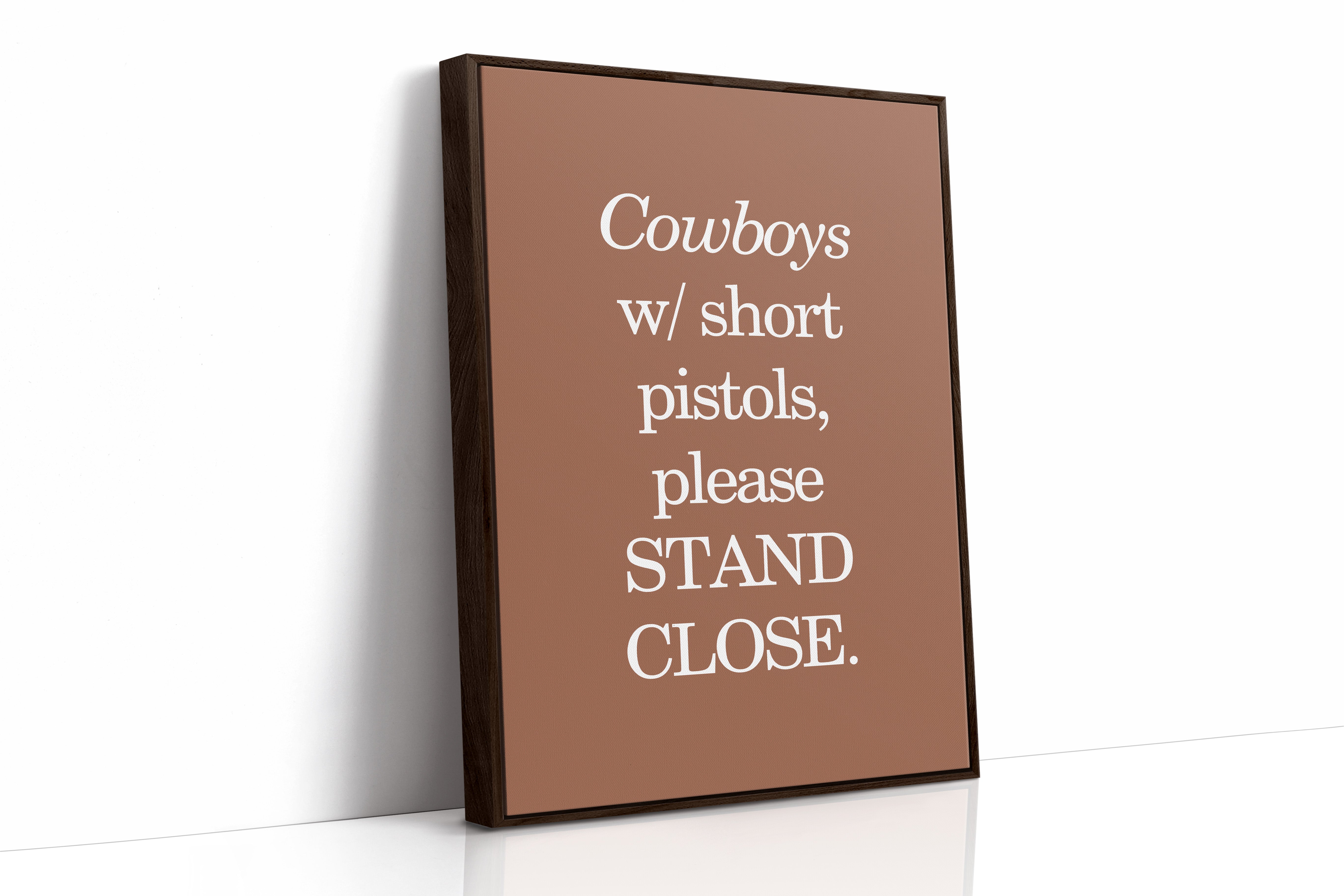 Crisp white typography emerges from a rich terra cotta backdrop, carrying the bold spirit of frontier sass. Part of our Contemporary Typography collection, this piece marries modern minimalism with vintage western charm. The playful yet commanding message creates an unexpected dialogue between classic cowboy culture and contemporary design sensibility, with clean serif fonts standing proud against the warm earthy background. Perfect for adding a touch of personality to a modern farmhouse kitchen or bringing character to an industrial-style home office. Each glance reveals a new layer of wit in this conversation between past and present.