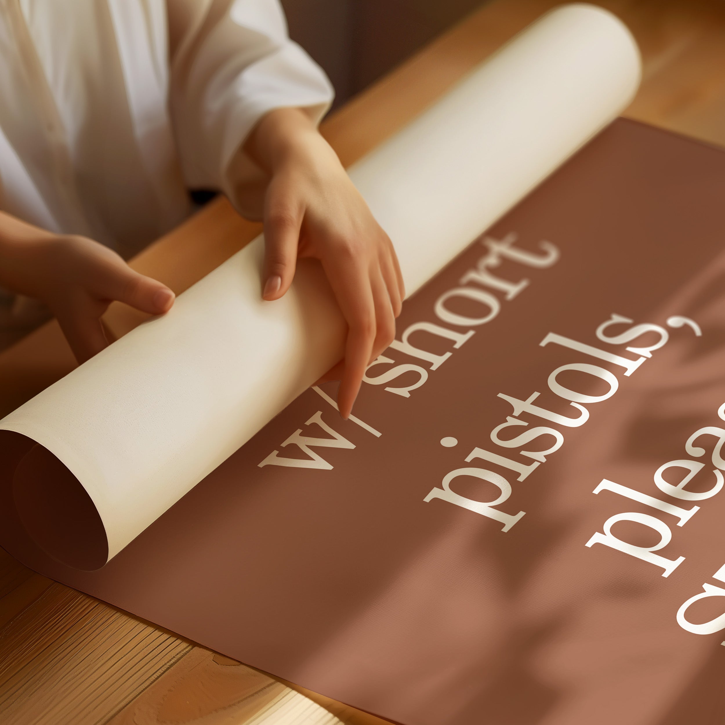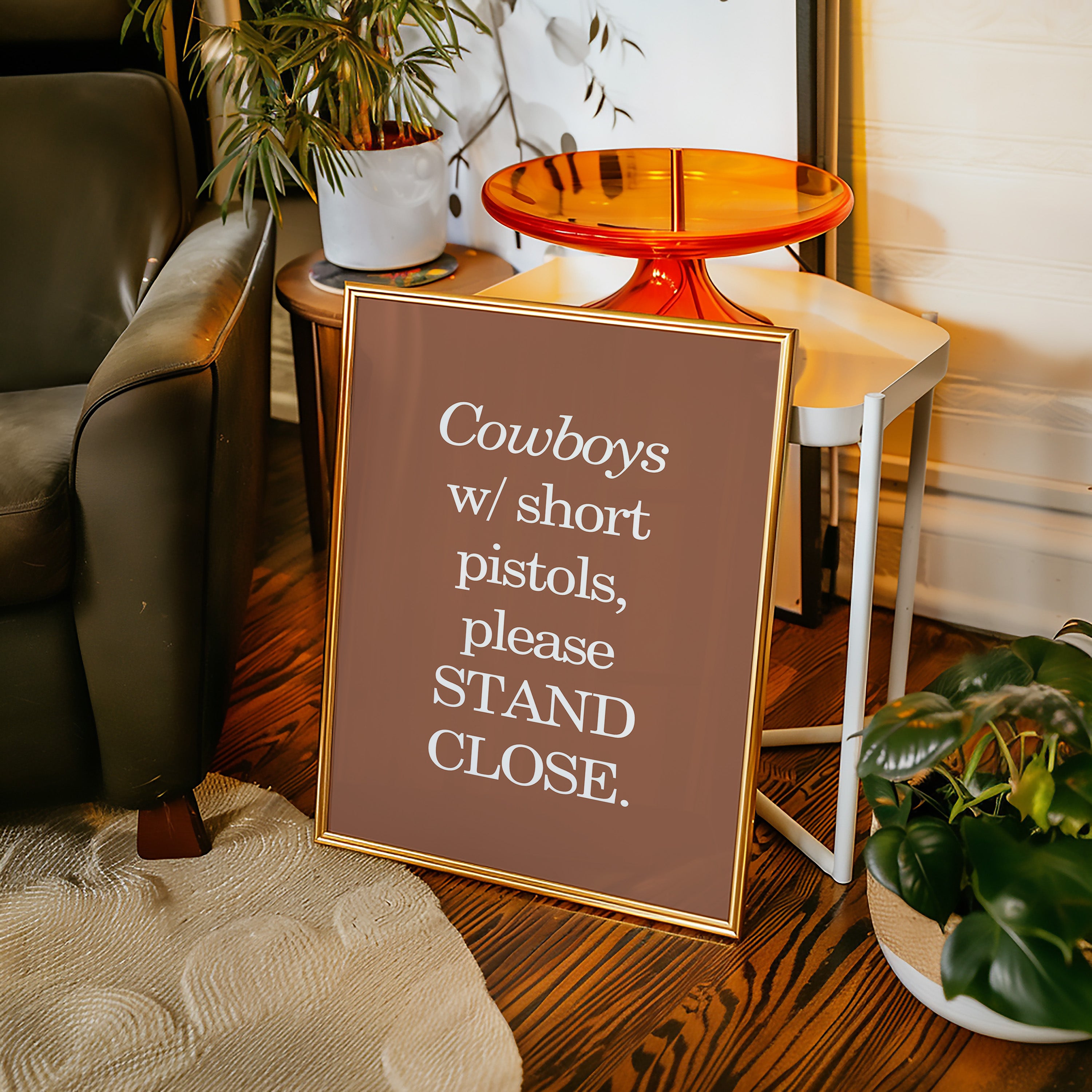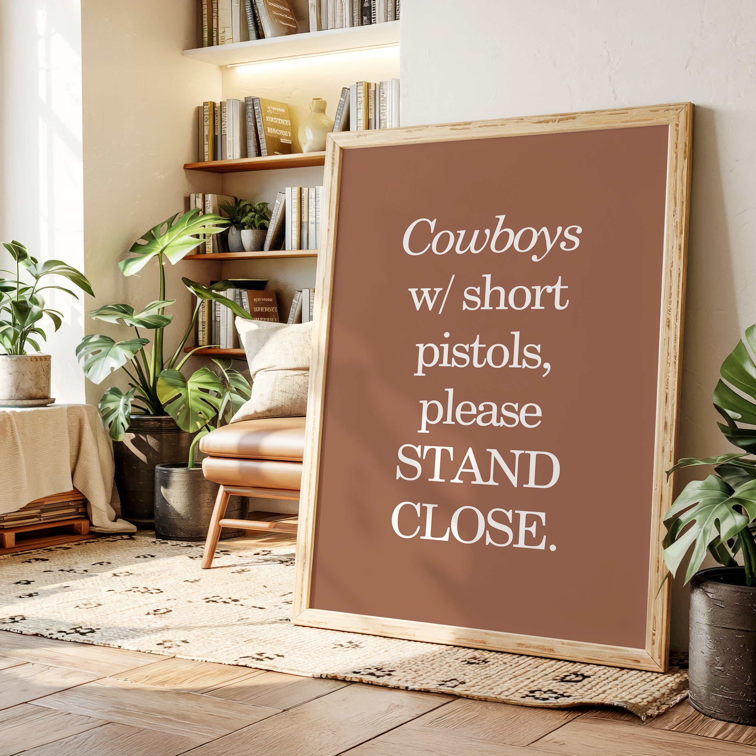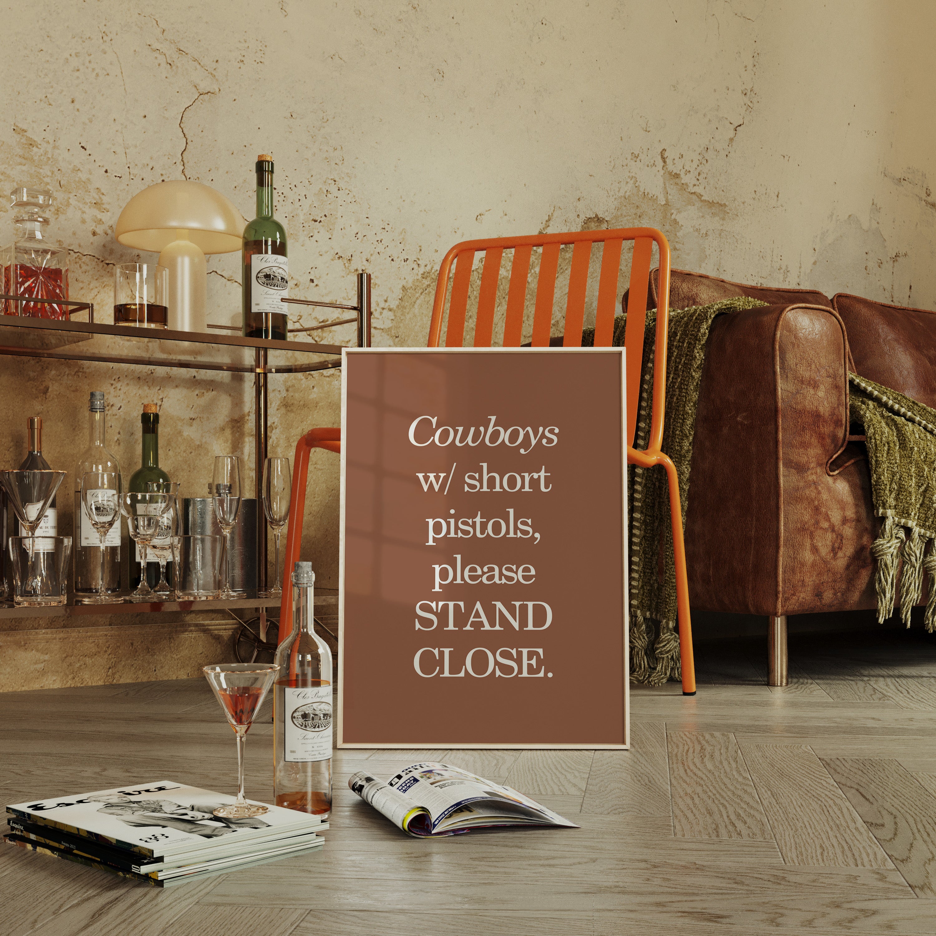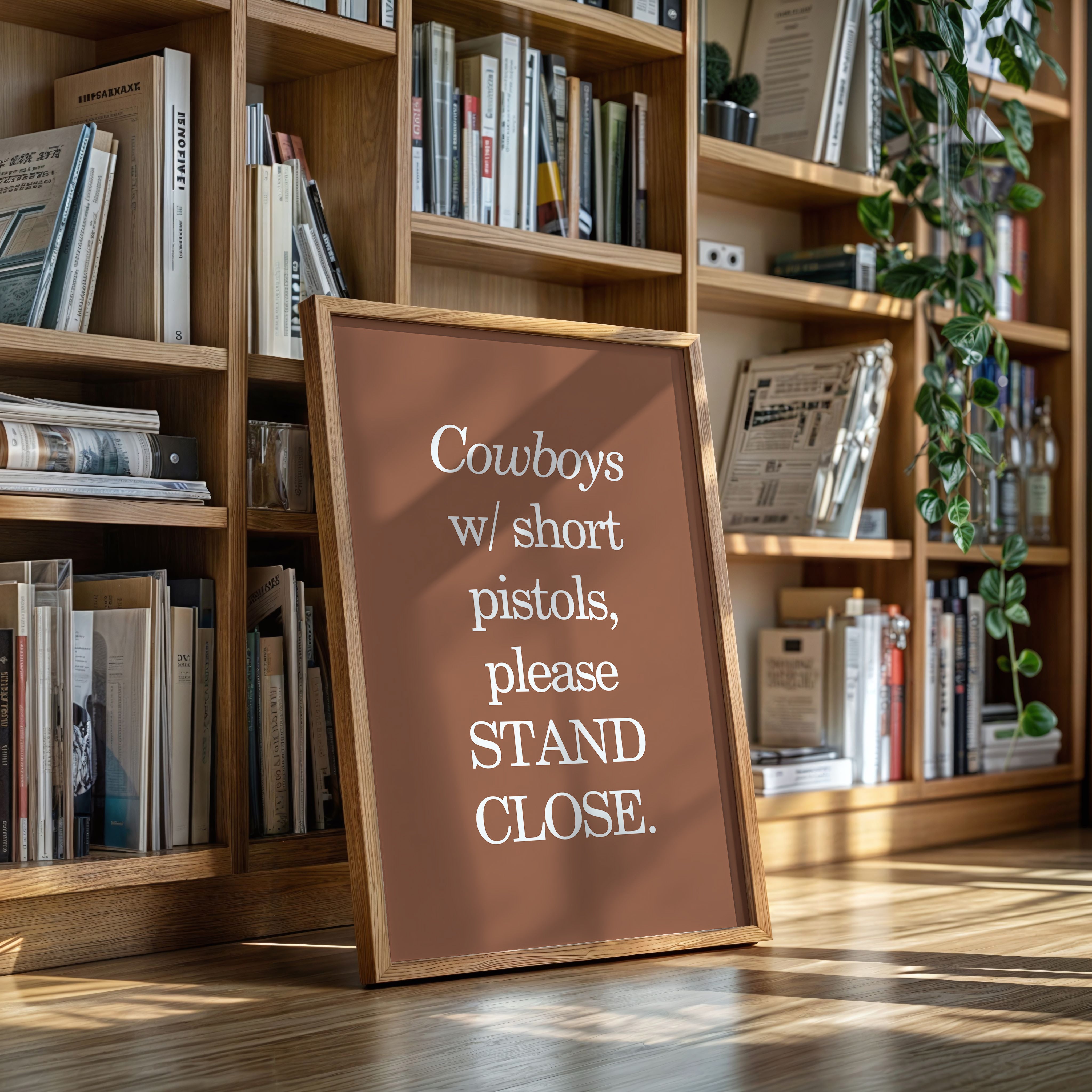Crisp white typography emerges from a rich terra cotta backdrop, carrying the bold spirit of frontier sass. Part of our Contemporary Typography collection, this piece marries modern minimalism with vintage western charm. The playful yet commanding message creates an unexpected dialogue between classic cowboy culture and contemporary design sensibility, with clean serif fonts standing proud against the warm earthy background. Perfect for adding a touch of personality to a modern farmhouse kitchen or bringing character to an industrial-style home office. Each glance reveals a new layer of wit in this conversation between past and present.