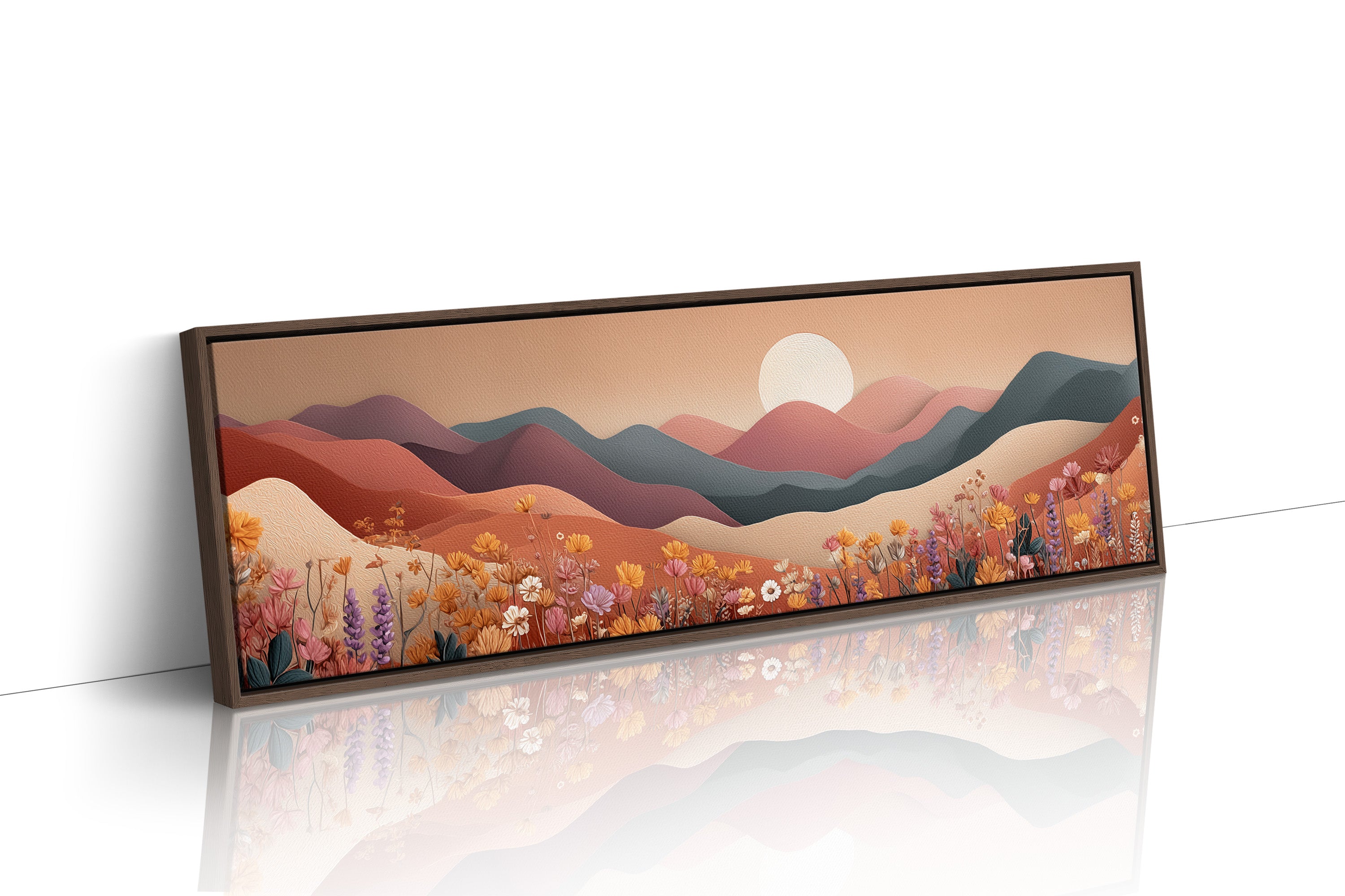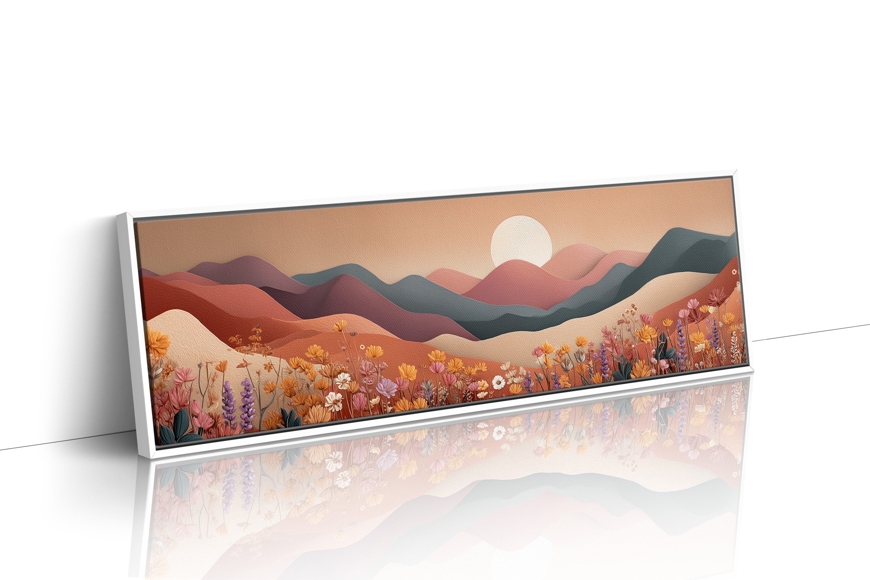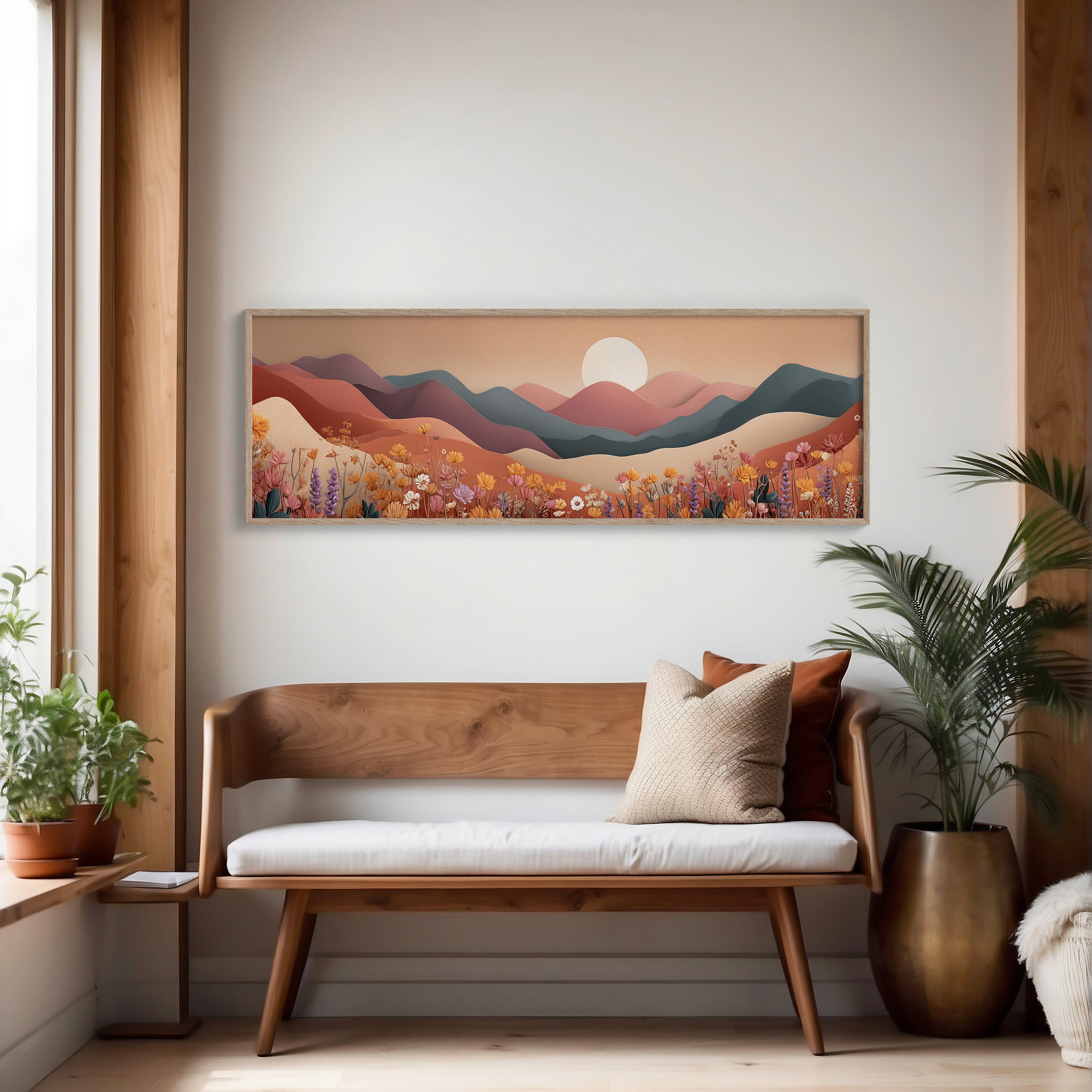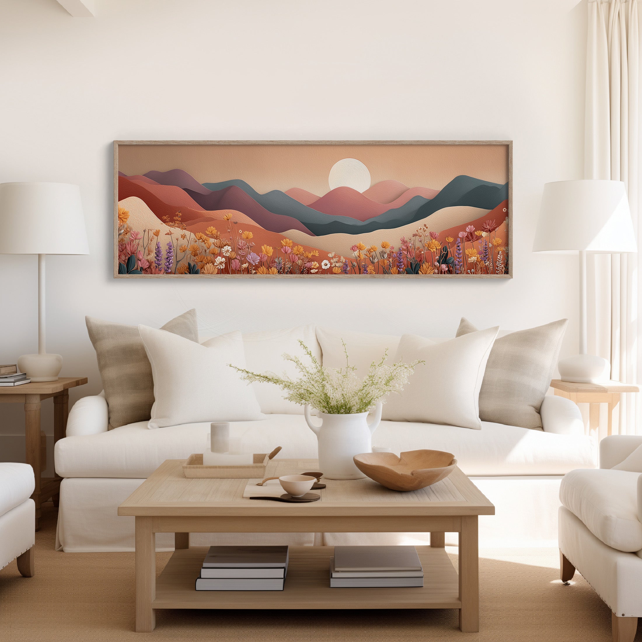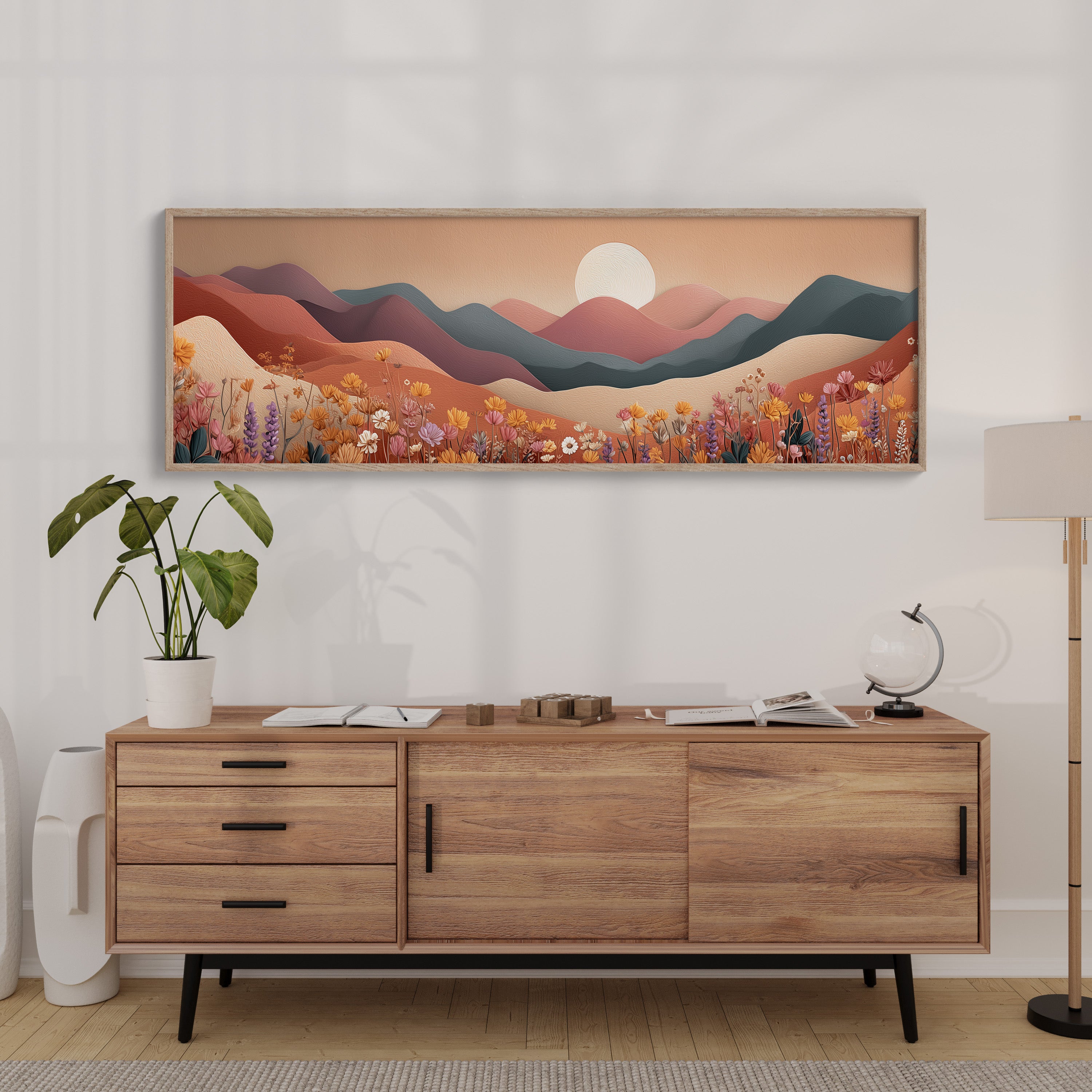 Soft rolling hills stretch beneath a pale rising sun while fields of delicate wildflowers bloom in warm desert tones. With its layered shapes and muted palette, this serene landscape blends modern minimalism with earthy calm, evoking the peaceful rhythm of nature at dawn.