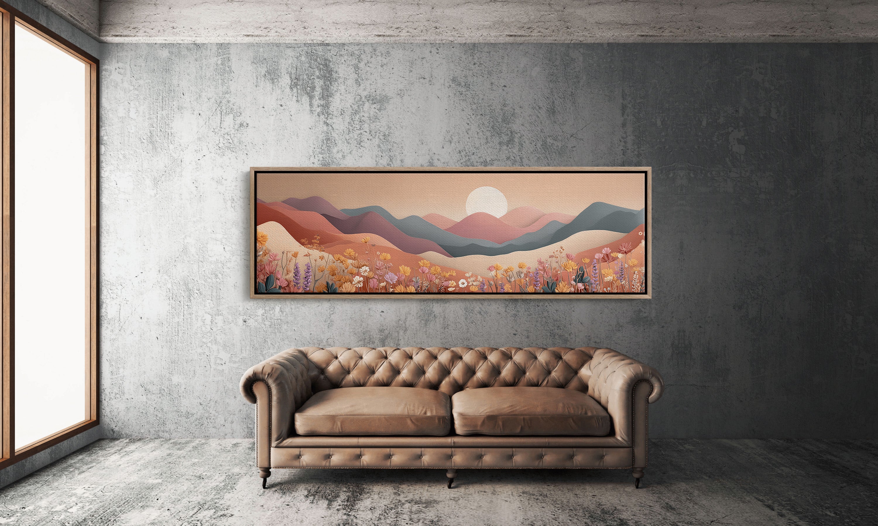 Your artwork should take up 60-75% of wall space above furniture. For standard sofas, choose 24"x36" or larger. When in doubt, go slightly bigger.