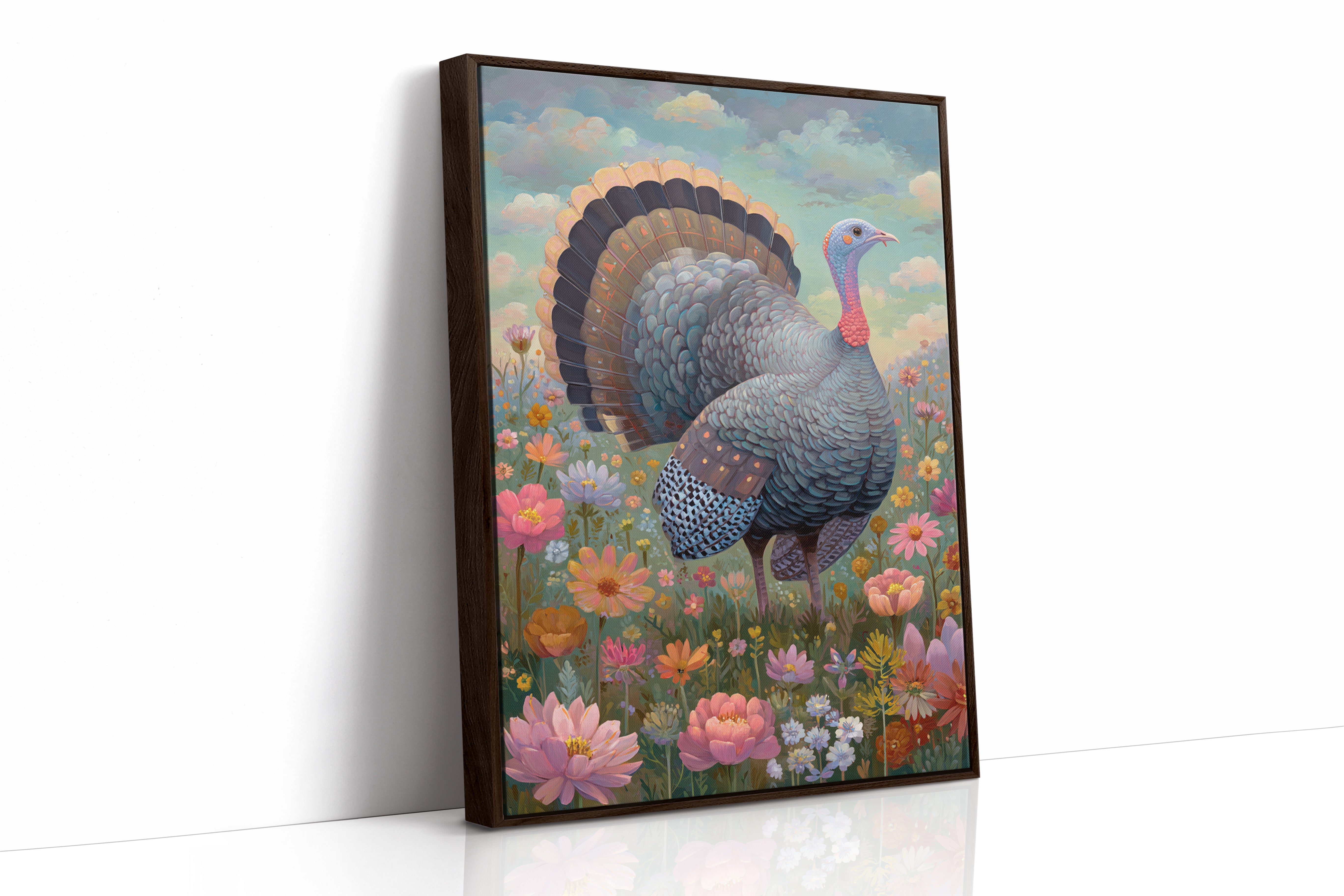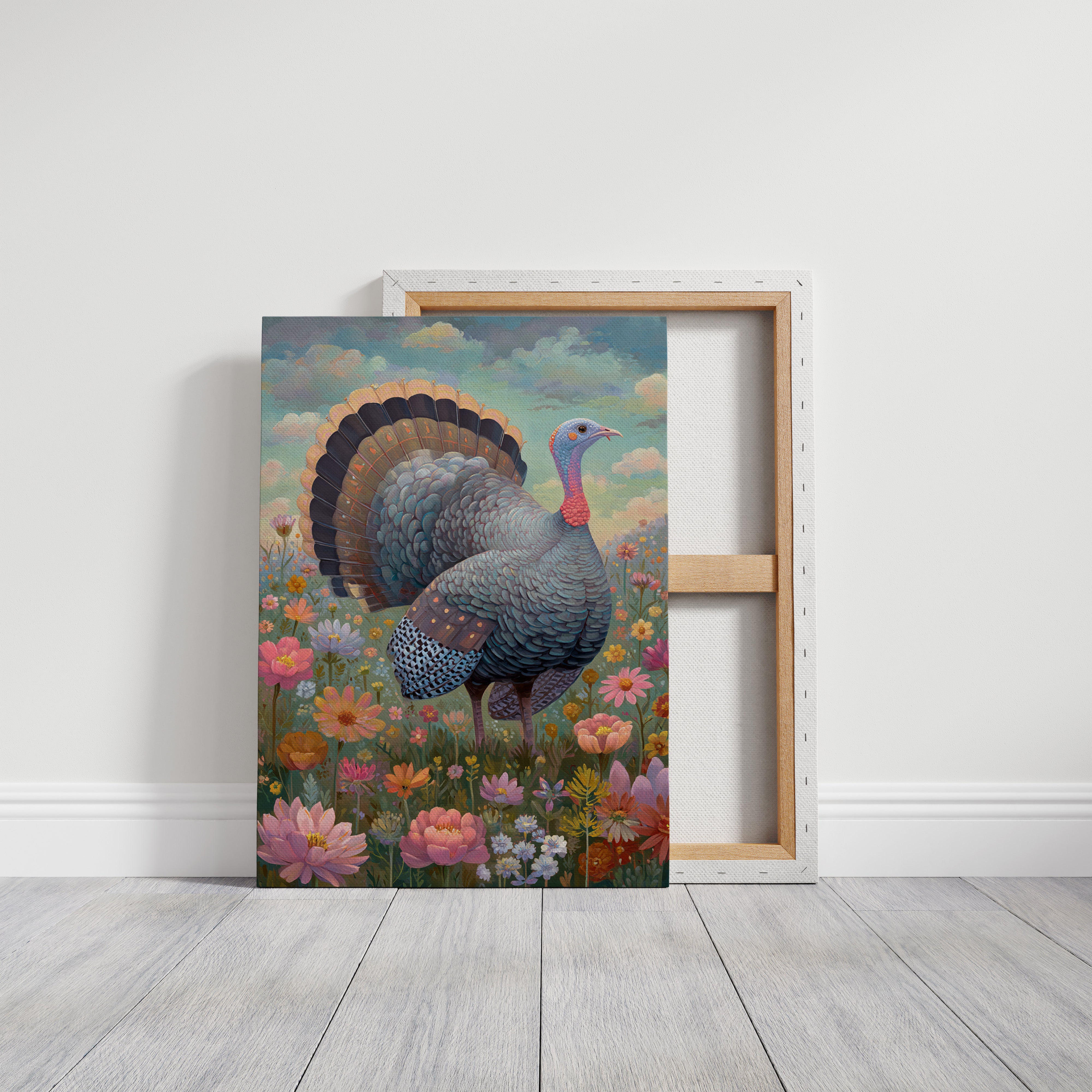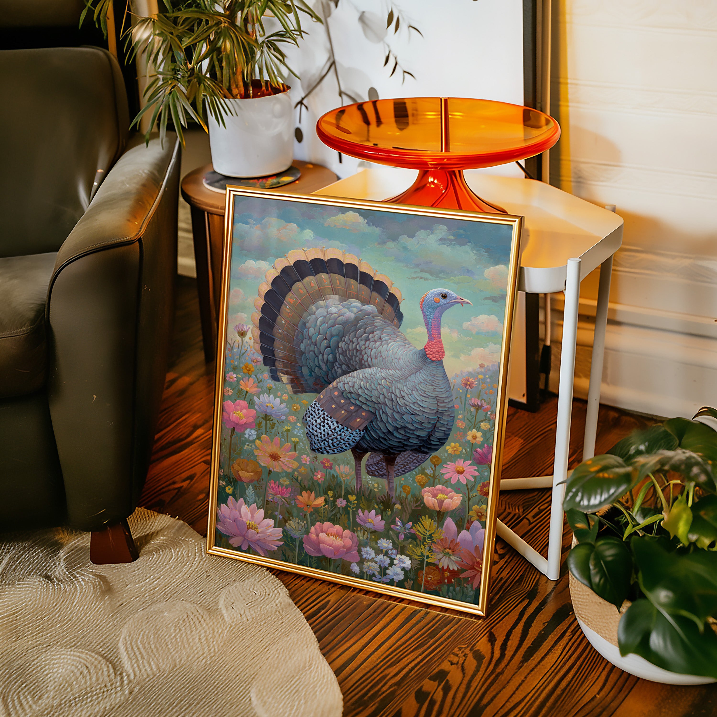 A regal wild turkey stands proudly amidst a symphony of blooming wildflowers, its iridescent feathers catching the soft light of a dreamy afternoon. The bird's magnificent fan of copper and slate-blue plumage creates a striking silhouette against a backdrop of pastel clouds and turquoise sky. Delicate cosmos, daisies, and prairie flowers in shades of coral, pink, and gold dance around its feet, creating a natural garden throne for this majestic creature. This piece brings the charm of American wildlife and the romance of cottage gardens together in perfect harmony.