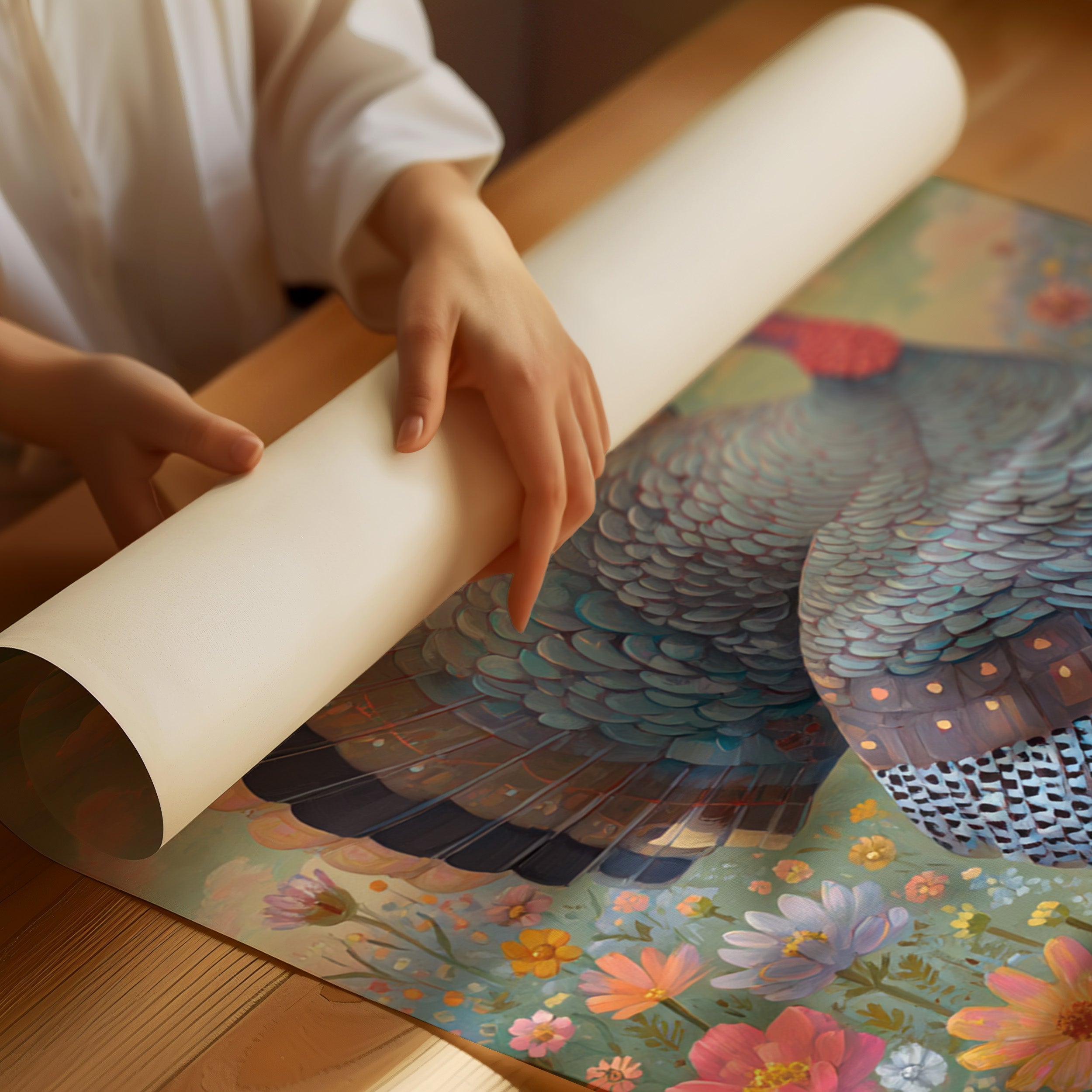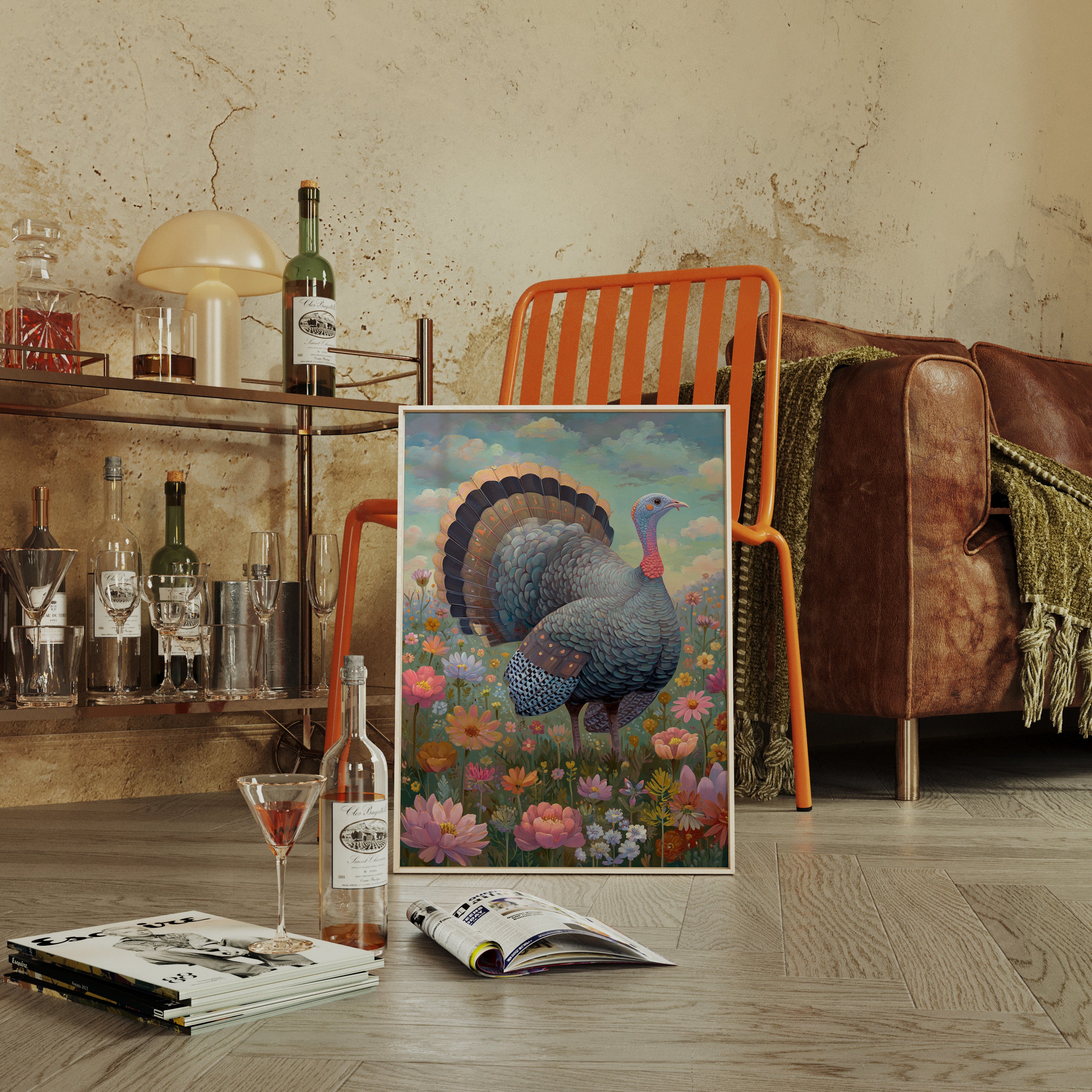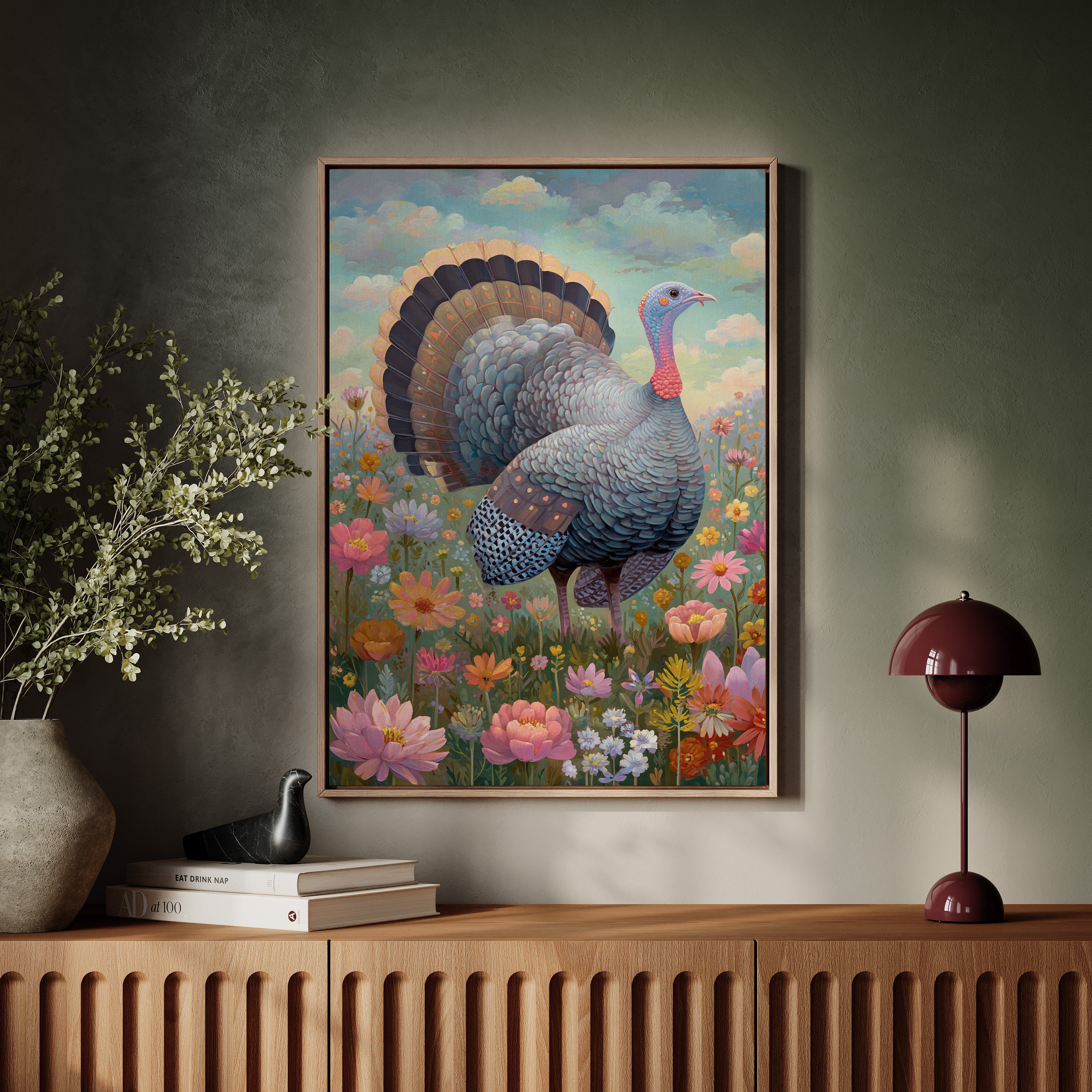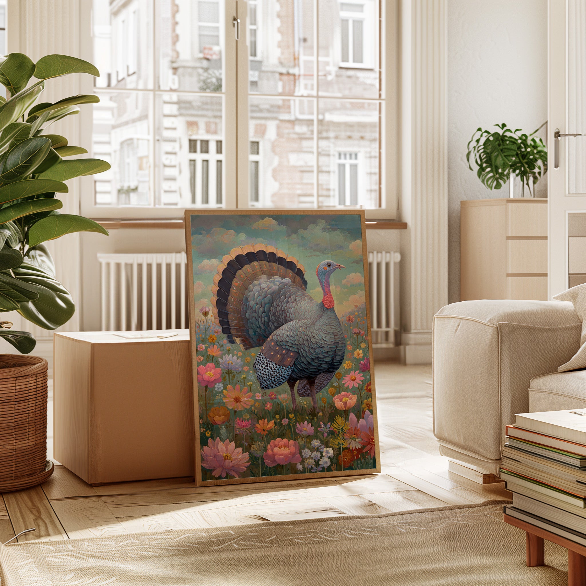 A regal wild turkey stands proudly amidst a symphony of blooming wildflowers, its iridescent feathers catching the soft light of a dreamy afternoon. The bird's magnificent fan of copper and slate-blue plumage creates a striking silhouette against a backdrop of pastel clouds and turquoise sky. Delicate cosmos, daisies, and prairie flowers in shades of coral, pink, and gold dance around its feet, creating a natural garden throne for this majestic creature. This piece brings the charm of American wildlife and the romance of cottage gardens together in perfect harmony.