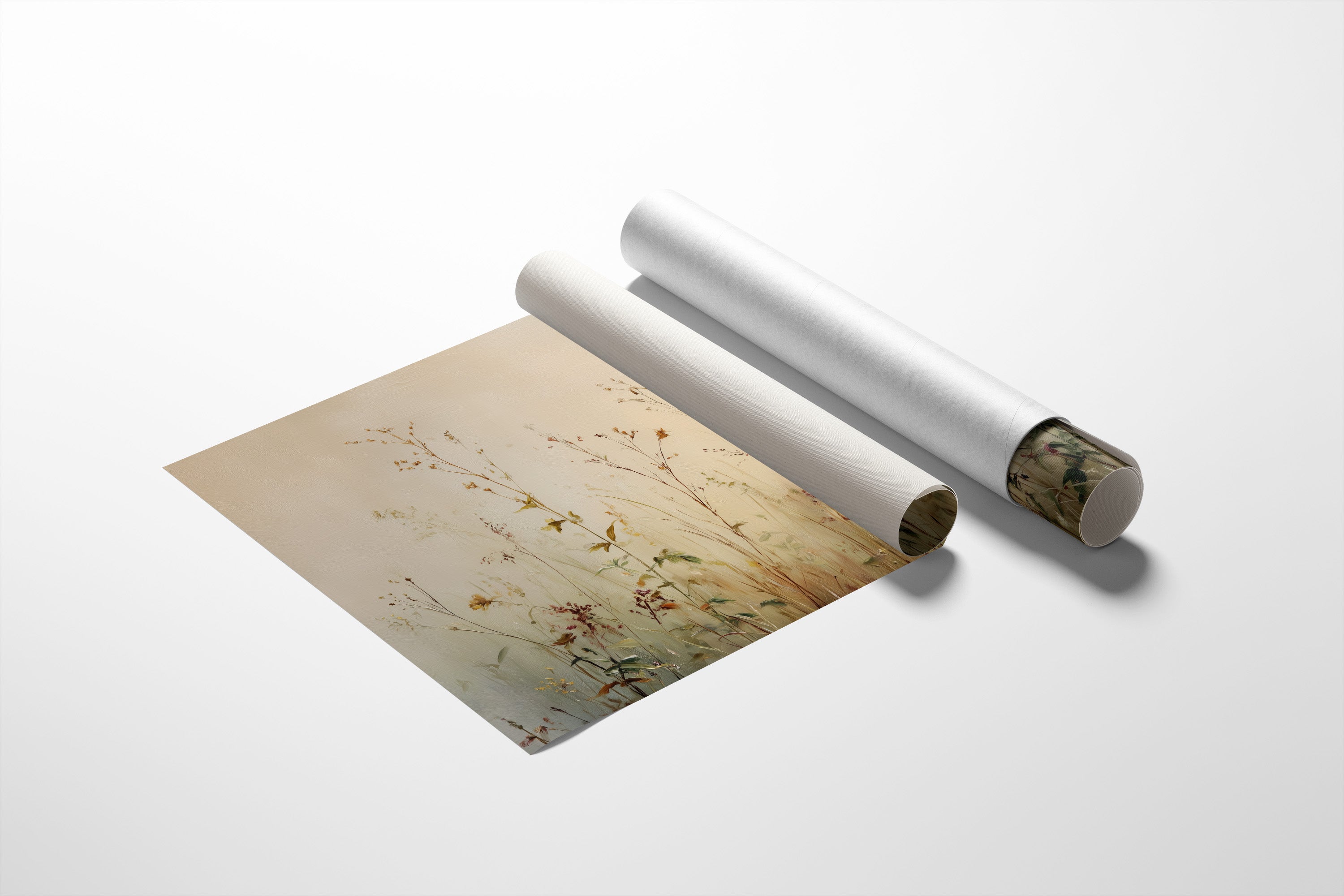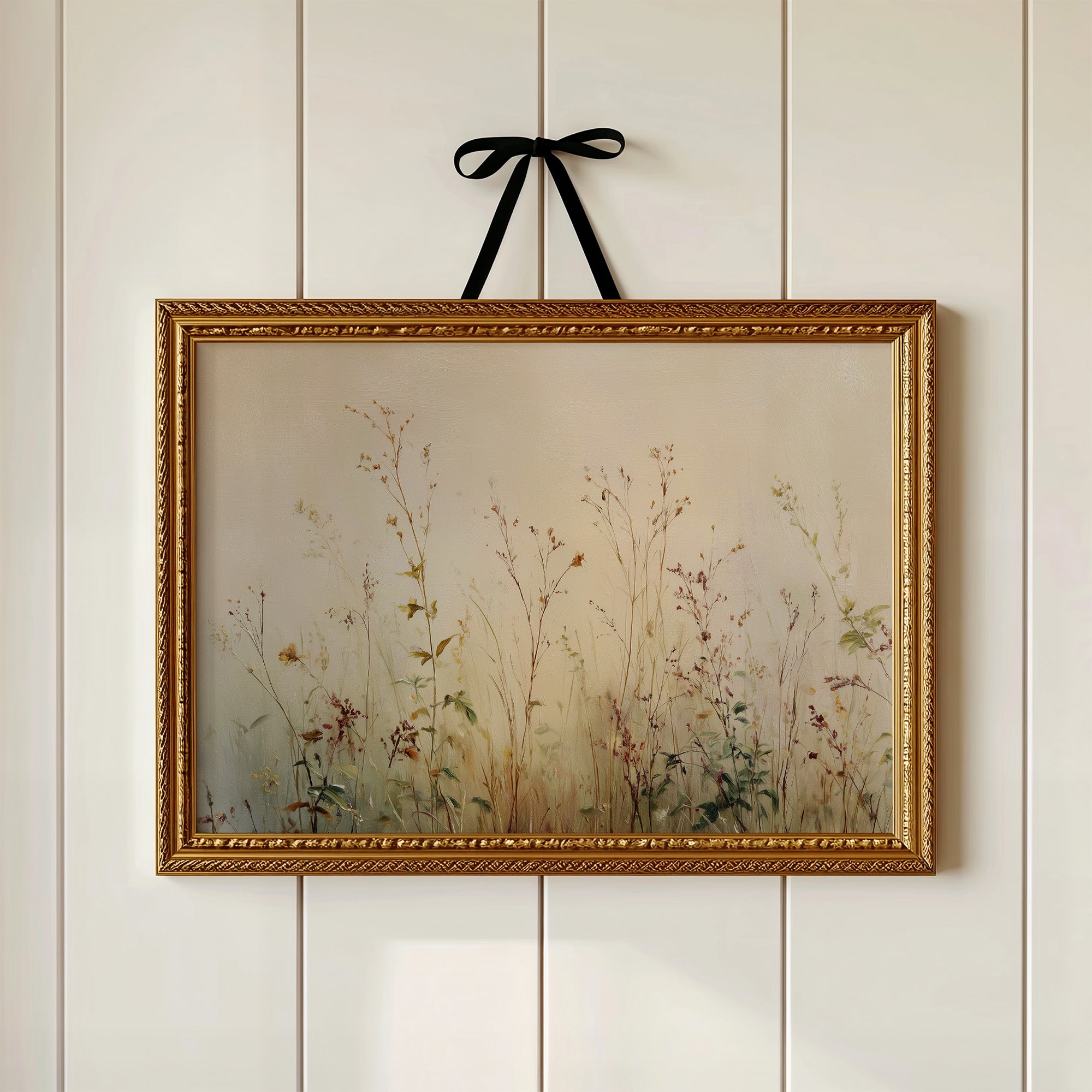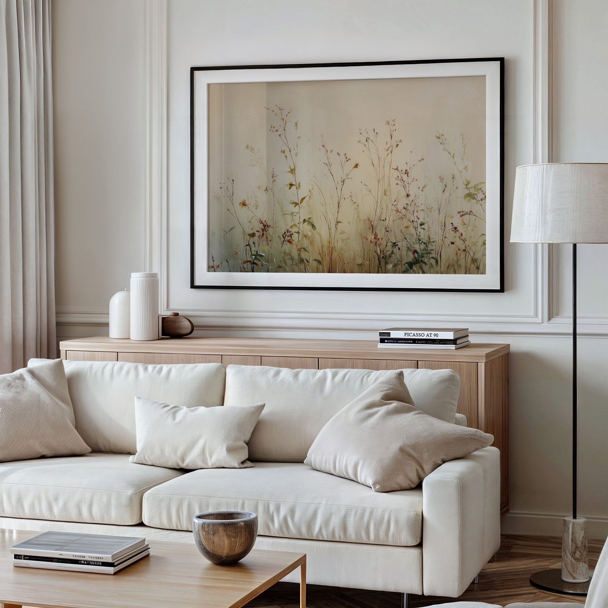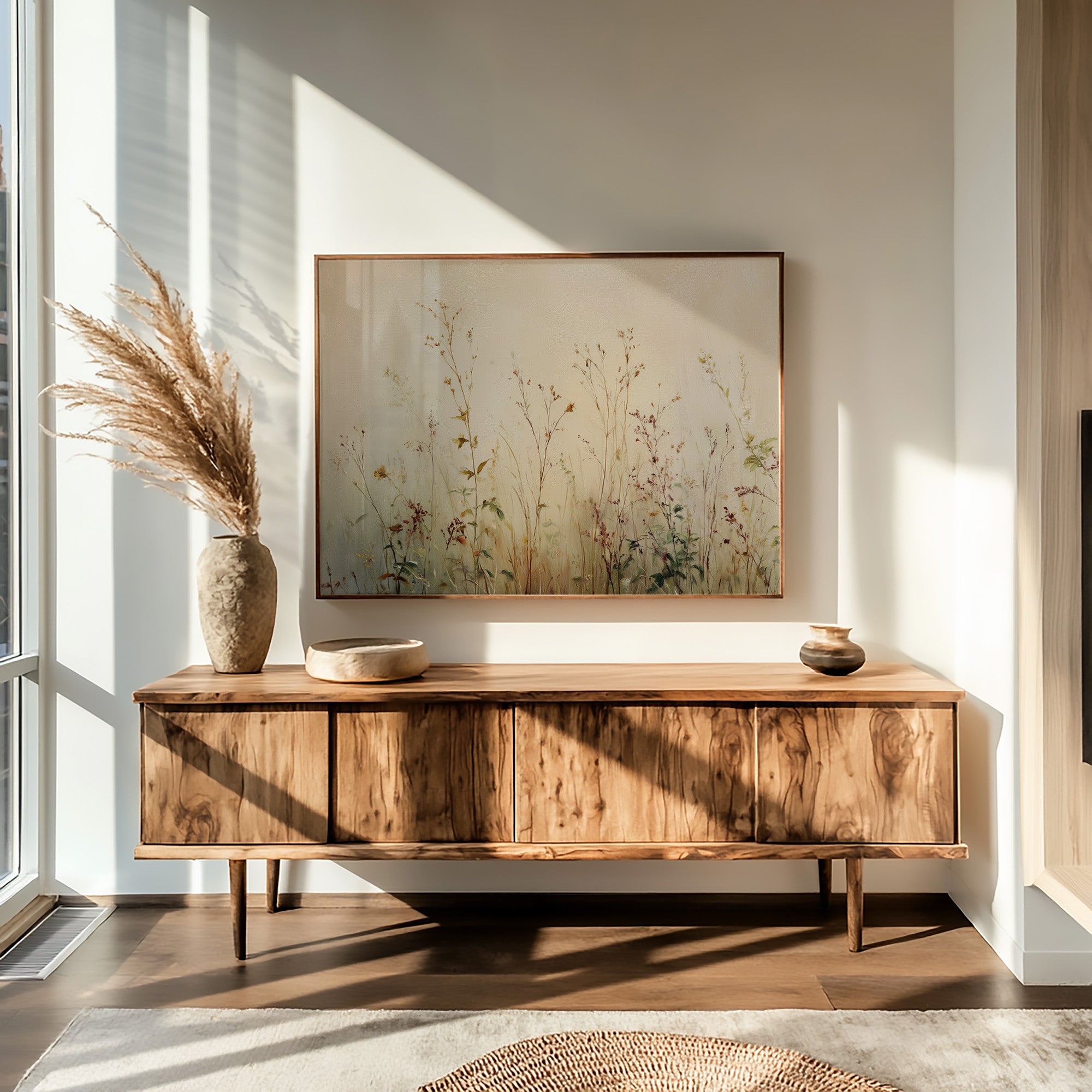 Sunlight bathes delicate wildflowers in a golden glow, their slender stems reaching skyward like quiet poetry. The watercolor meadow rests against wooden bookshelves, creating a harmonious dialogue between nature's artistry and human knowledge. Dried pampas grass in an earthenware vessel completes this serene vignette, bringing the outdoors into a thoughtfully curated space.