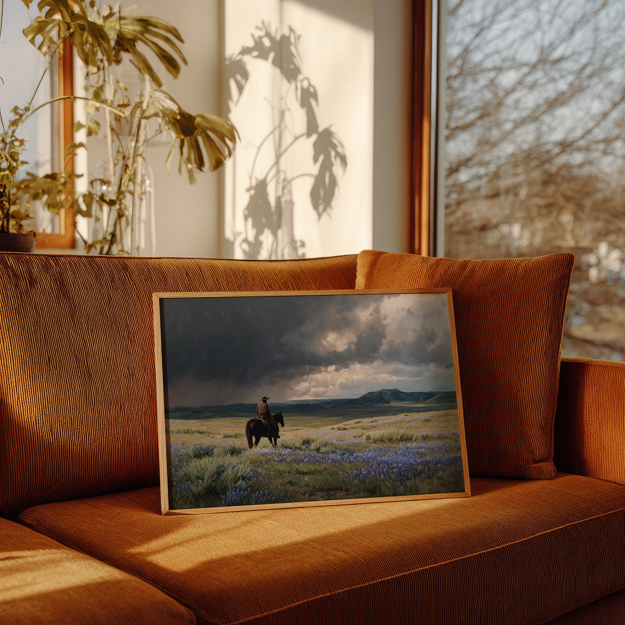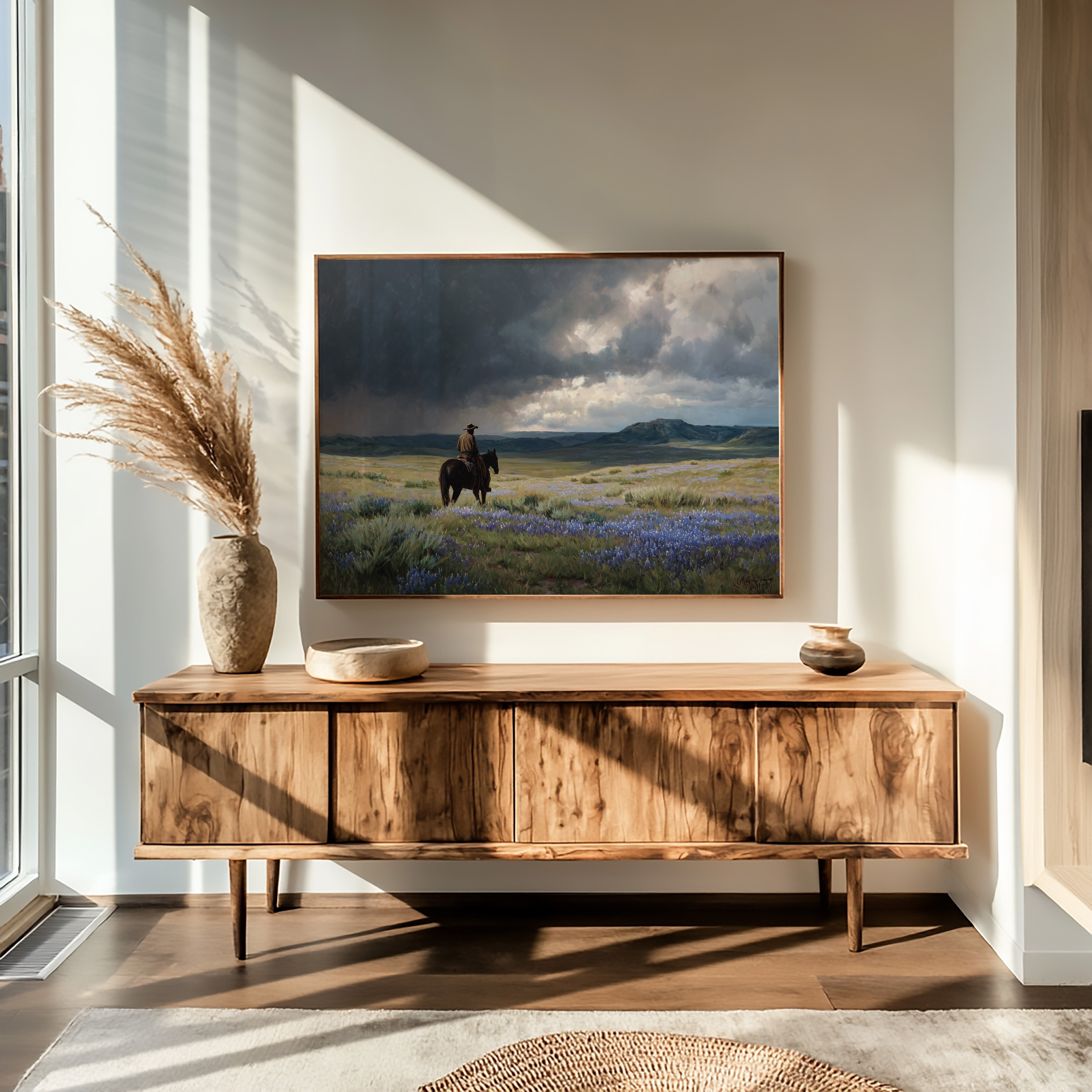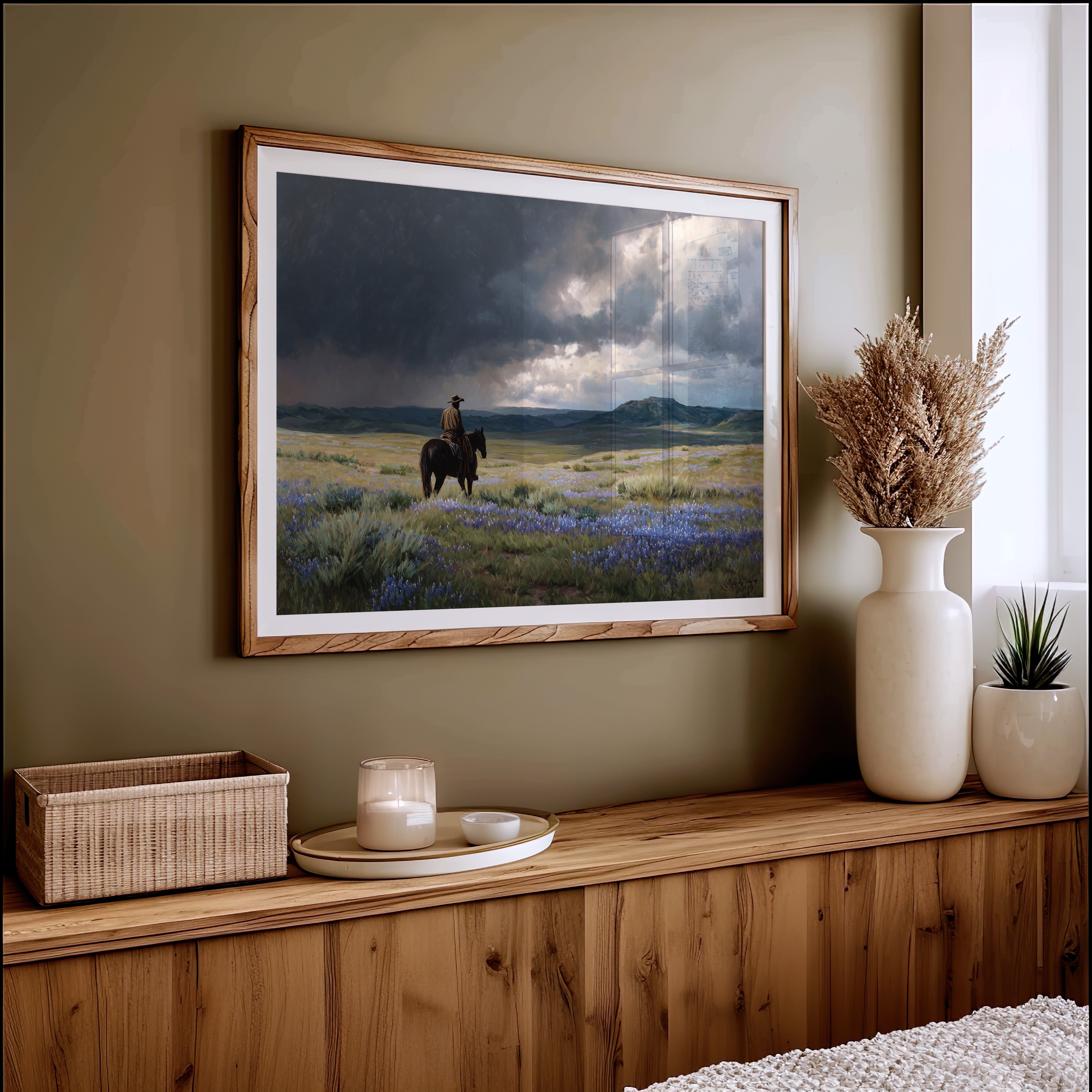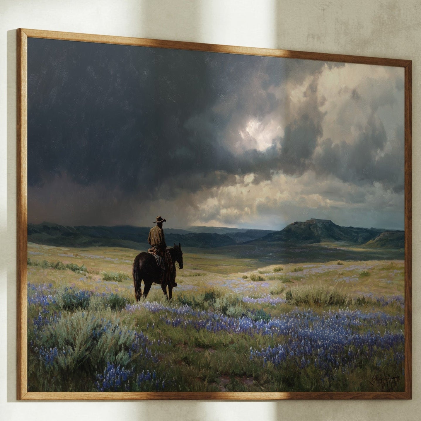 A lone rider pauses atop a black horse, silhouetted against an approaching storm's dramatic sky. Purple lupines carpet the rolling prairie, their delicate blooms creating a stunning contrast against the moody atmosphere and golden grasslands. Dark clouds gather overhead, painting the landscape in rich contrasts of light and shadow, while distant mountains stand sentinel on the horizon. This contemporary Western scene captures both the untamed spirit of the American frontier and nature's raw beauty. Perfect for adding dramatic flair to a living room or bringing bold character to an office space.