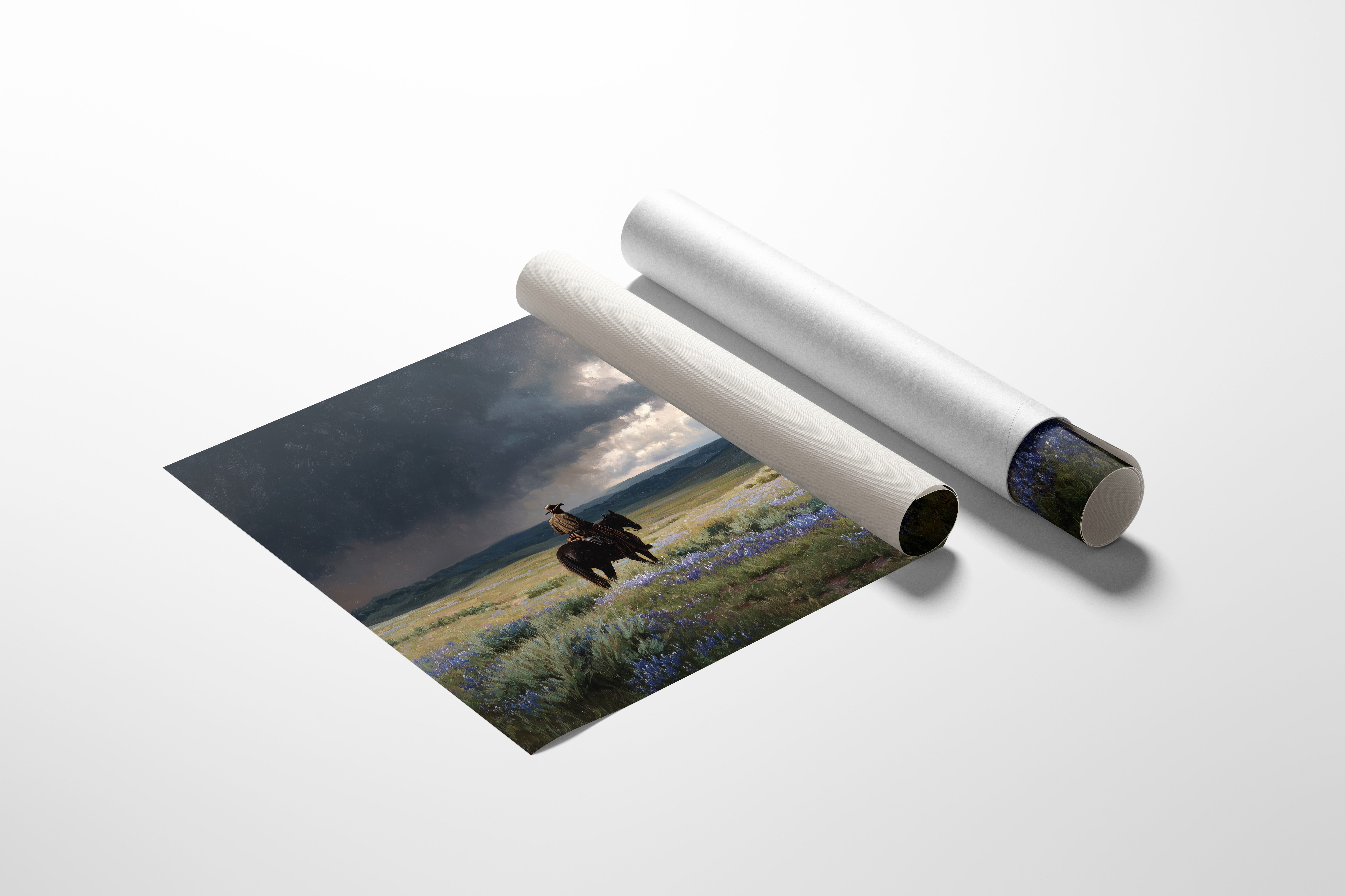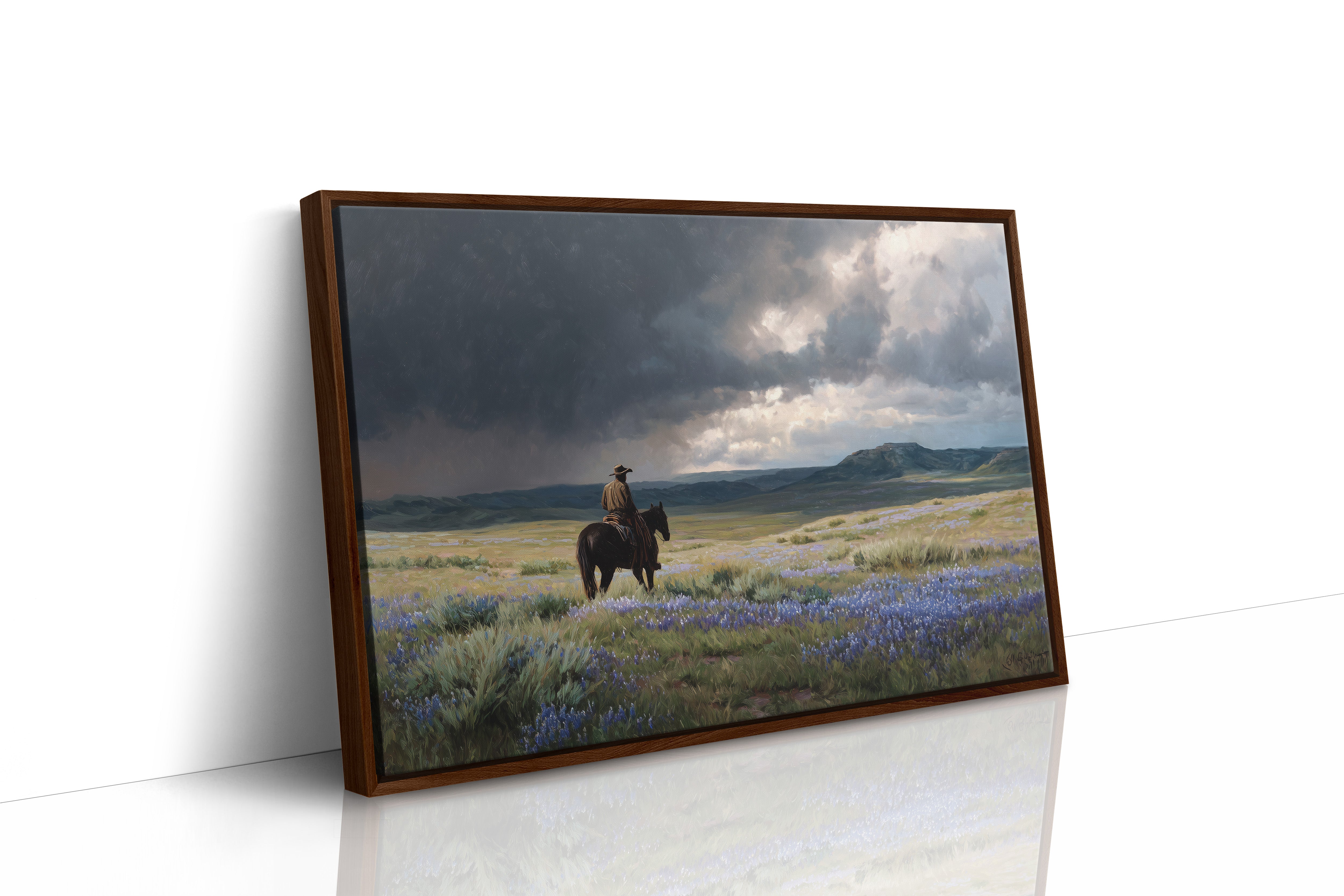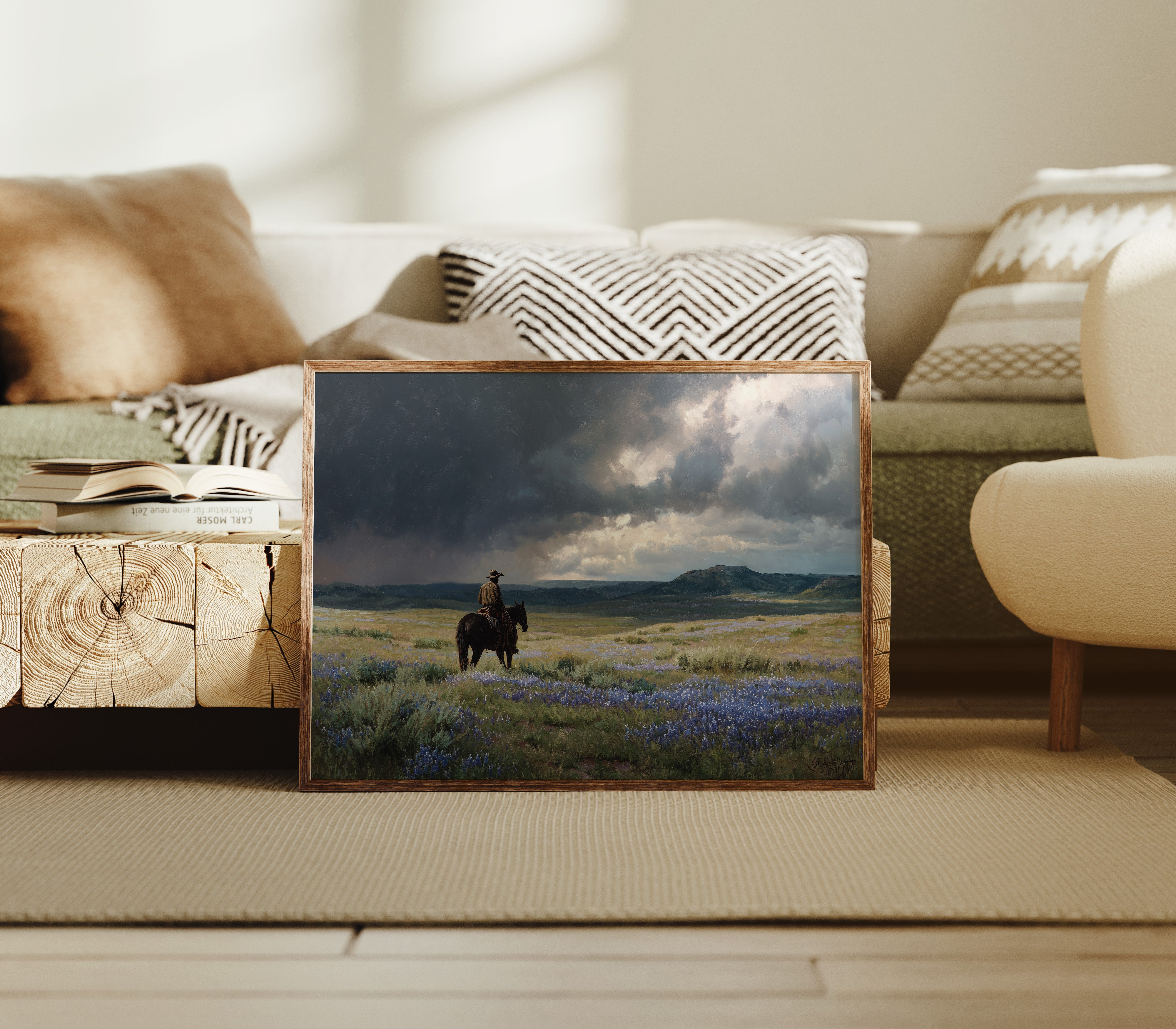 A lone rider pauses atop a black horse, silhouetted against an approaching storm's dramatic sky. Purple lupines carpet the rolling prairie, their delicate blooms creating a stunning contrast against the moody atmosphere and golden grasslands. Dark clouds gather overhead, painting the landscape in rich contrasts of light and shadow, while distant mountains stand sentinel on the horizon. This contemporary Western scene captures both the untamed spirit of the American frontier and nature's raw beauty. Perfect for adding dramatic flair to a living room or bringing bold character to an office space.