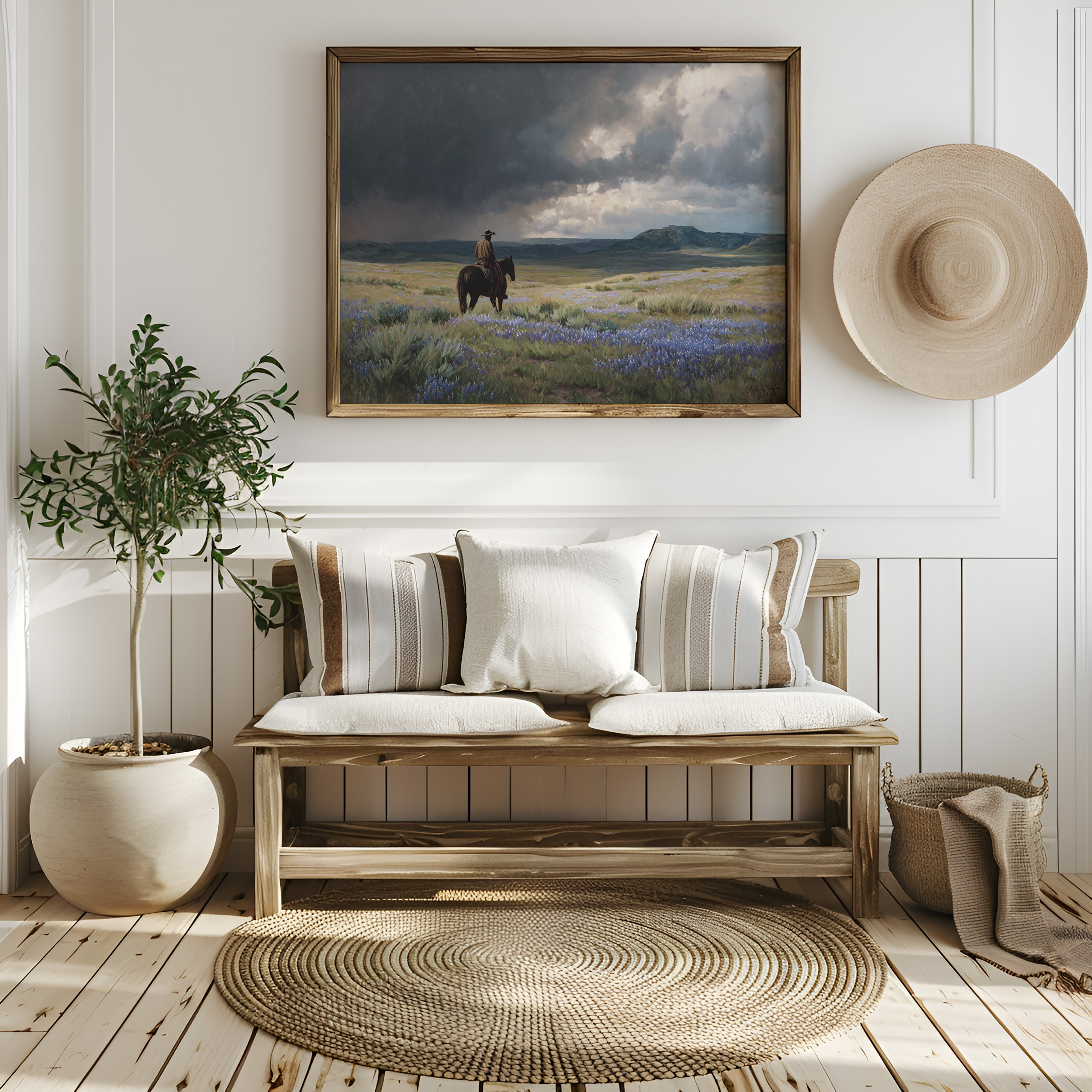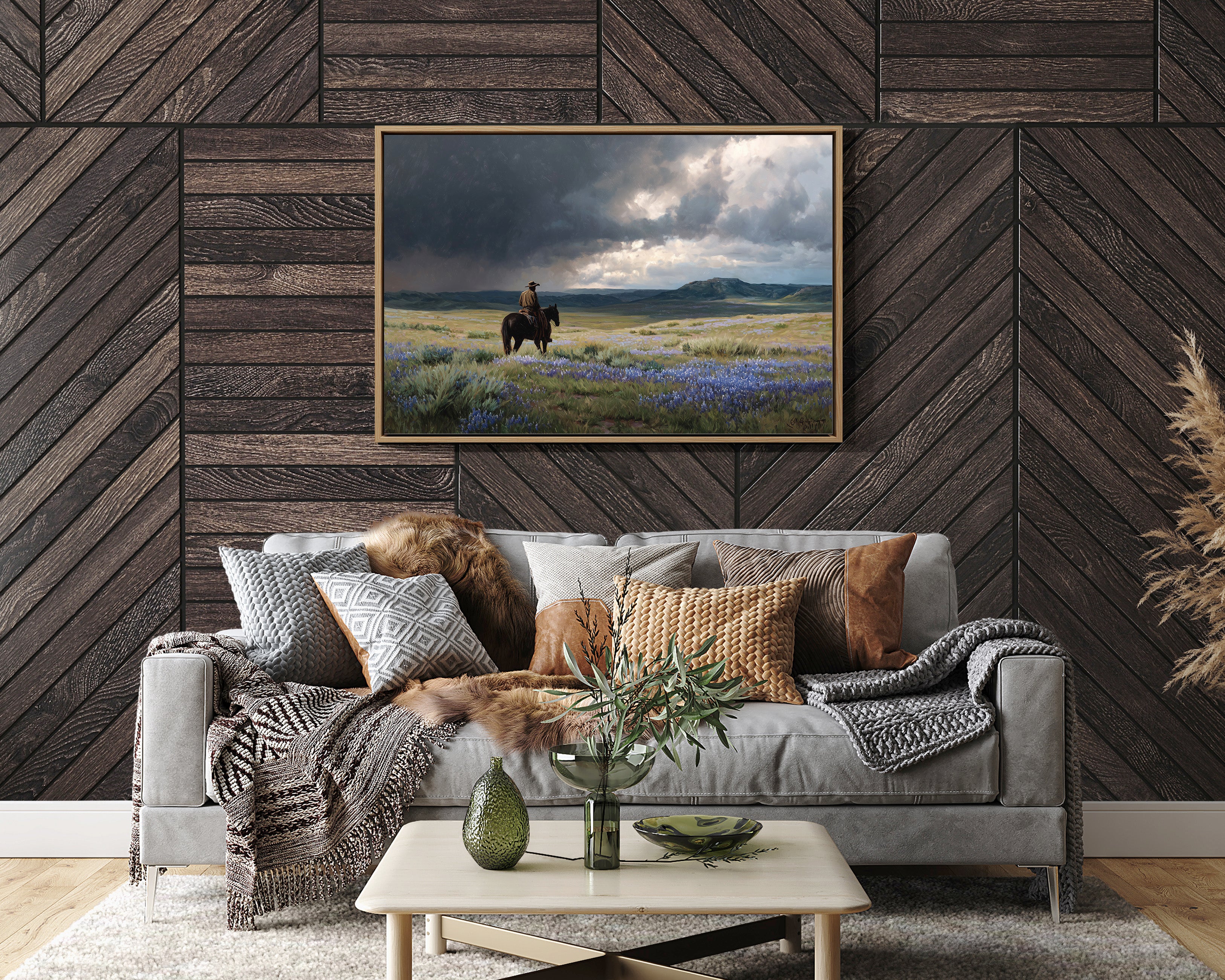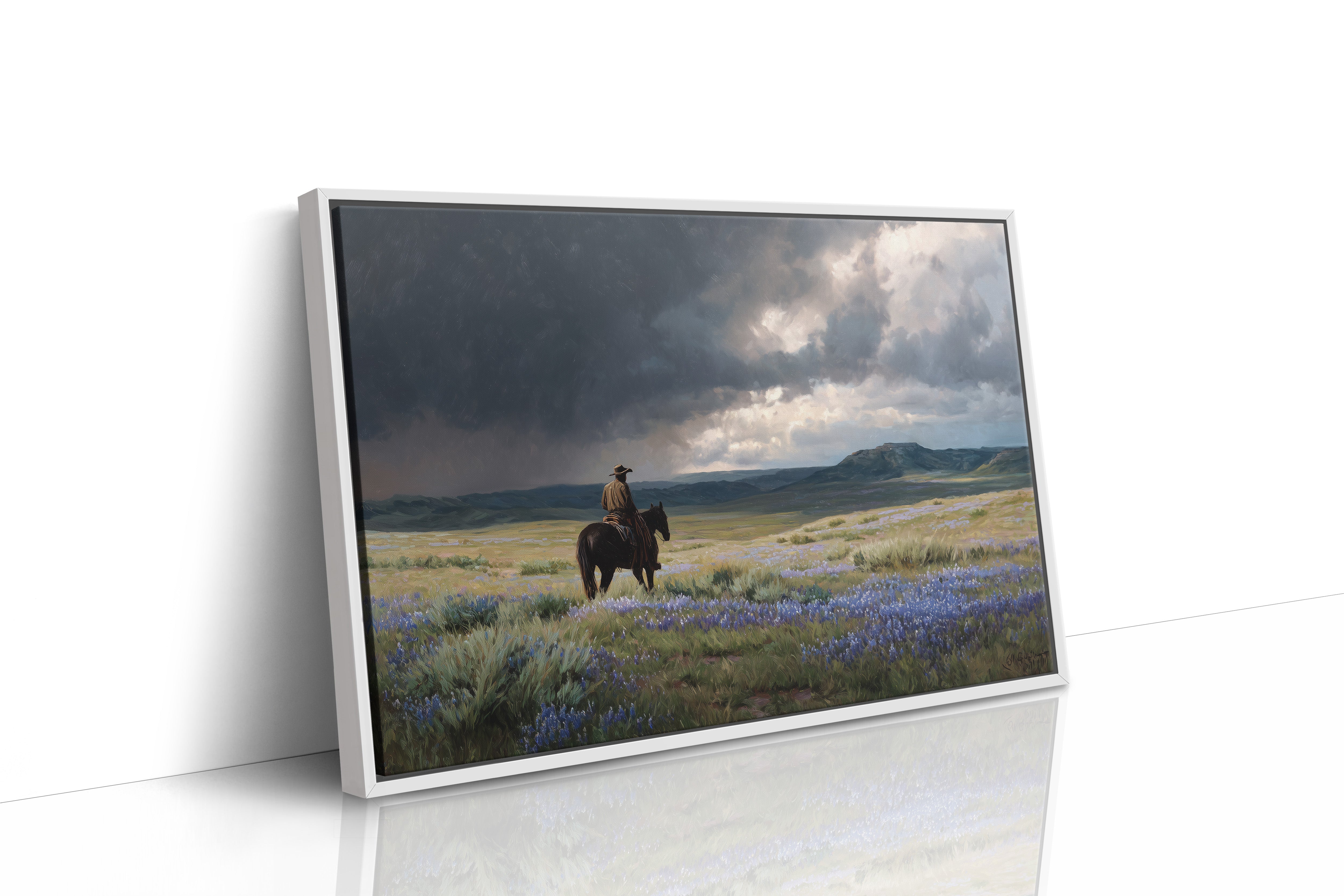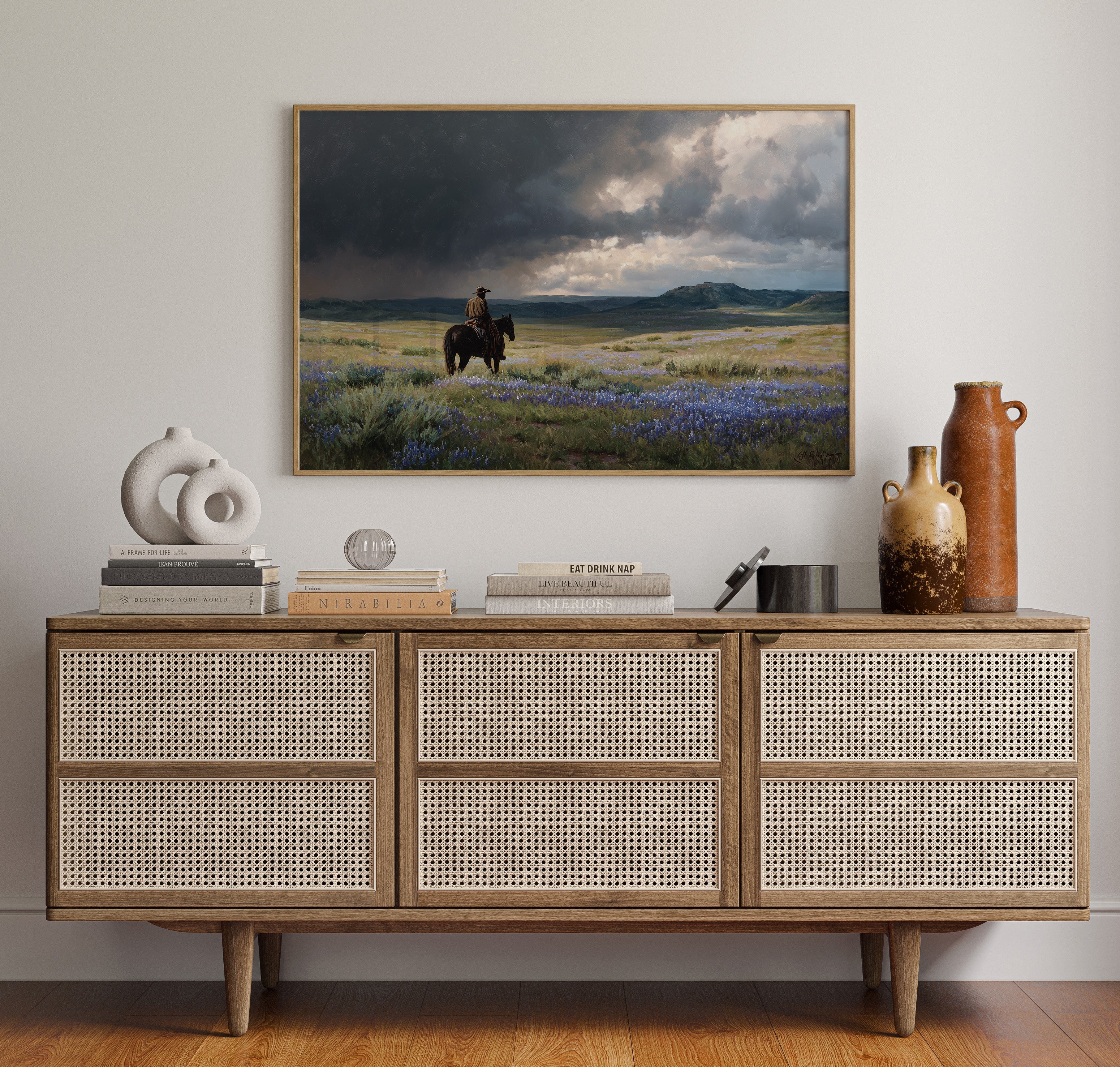 A lone rider pauses atop a black horse, silhouetted against an approaching storm's dramatic sky. Purple lupines carpet the rolling prairie, their delicate blooms creating a stunning contrast against the moody atmosphere and golden grasslands. Dark clouds gather overhead, painting the landscape in rich contrasts of light and shadow, while distant mountains stand sentinel on the horizon. This contemporary Western scene captures both the untamed spirit of the American frontier and nature's raw beauty. Perfect for adding dramatic flair to a living room or bringing bold character to an office space.