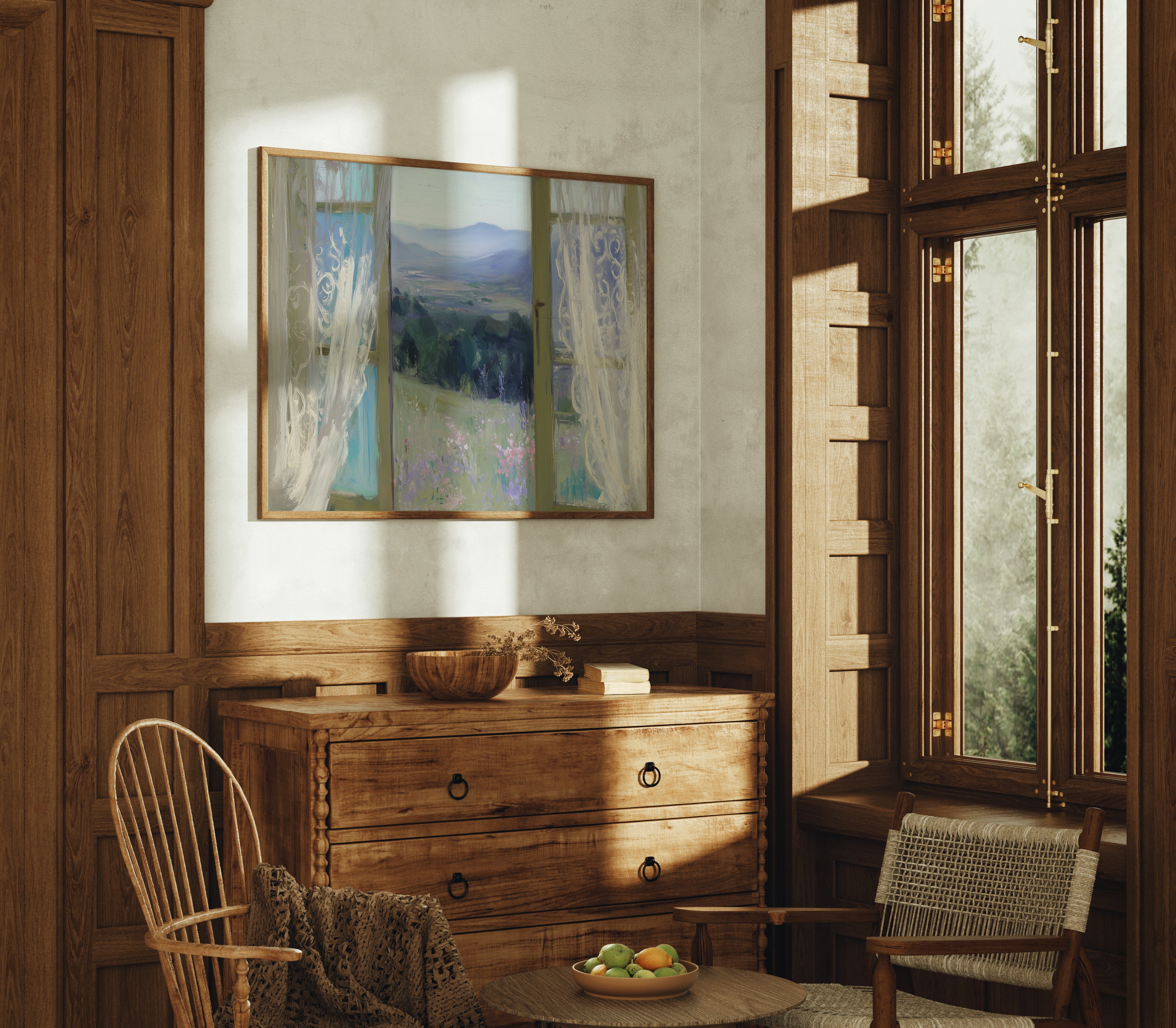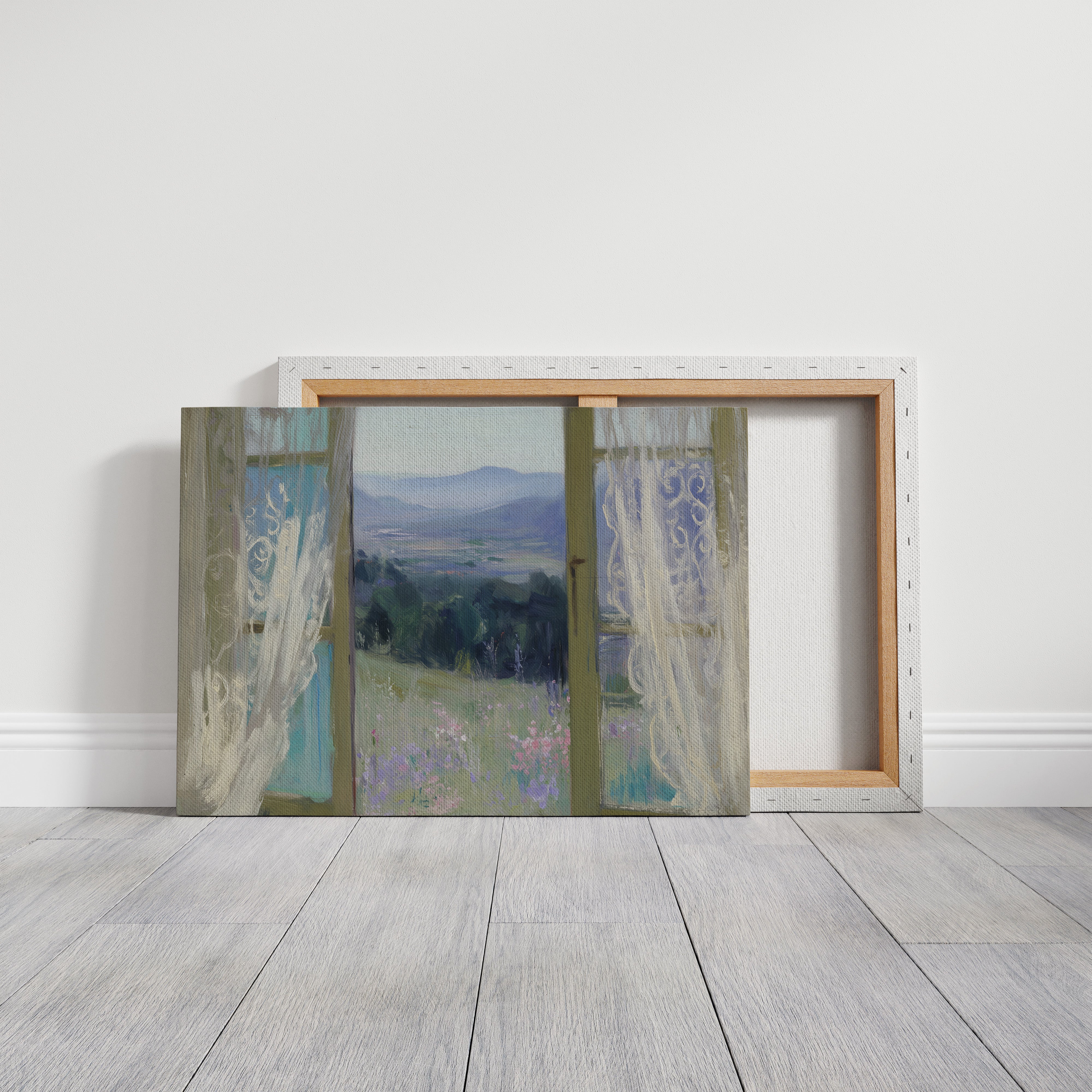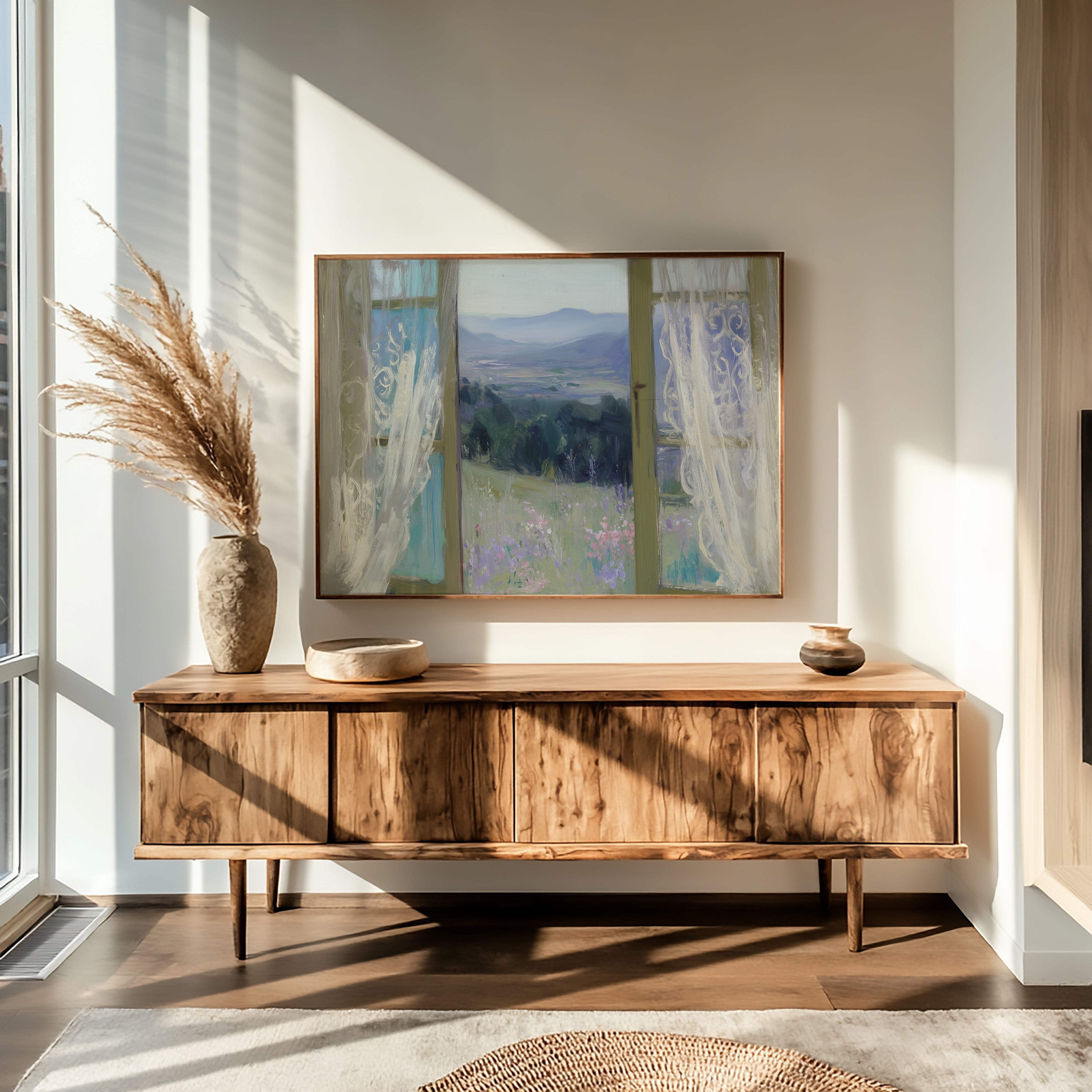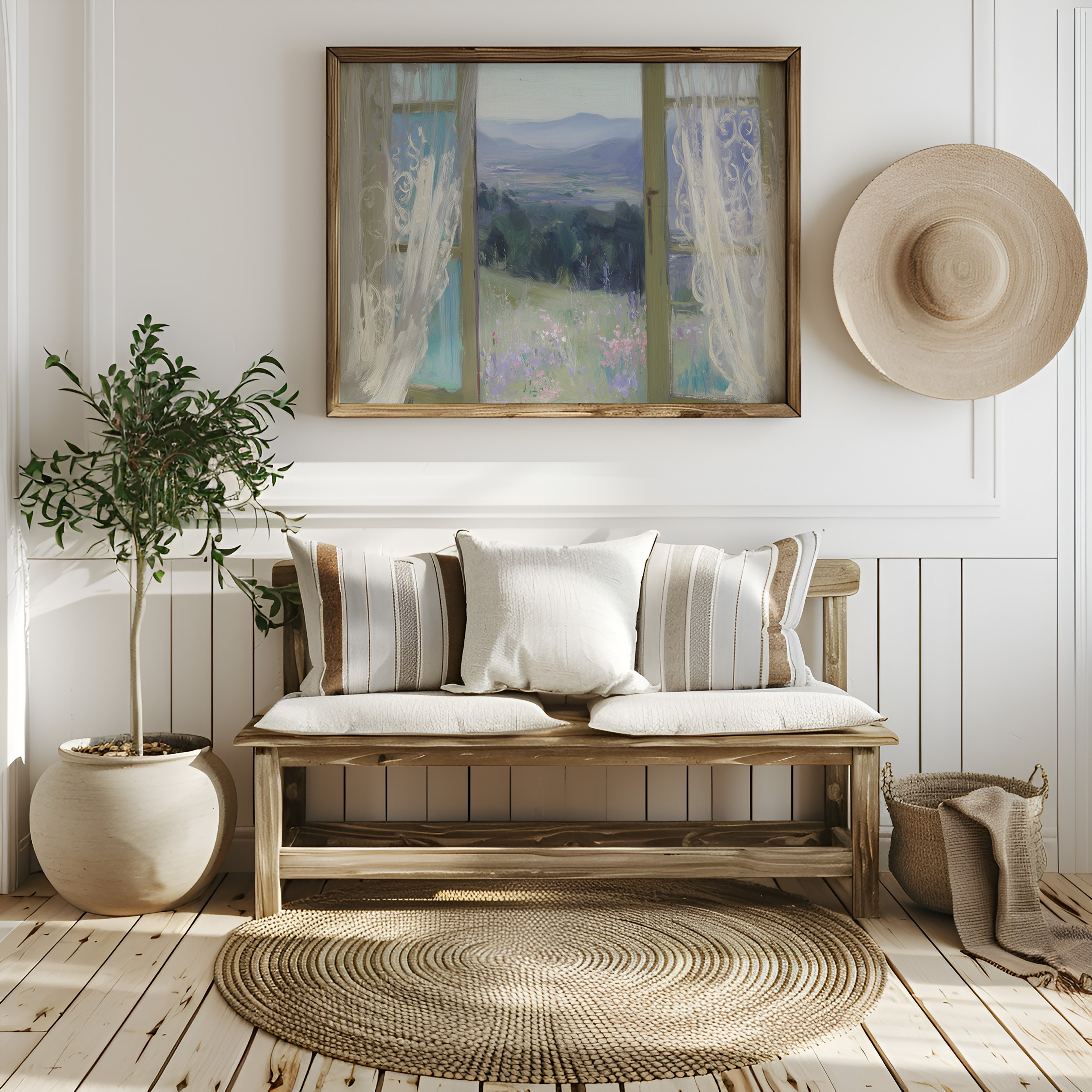 Morning light filters through gossamer curtains, framing a dreamy vista of rolling hills and distant mountains. Delicate wildflowers in soft lavender and pink dot the meadow, swaying gently in an unseen breeze against a backdrop of deep green forest. The scene captures that perfect moment between dawn and day, where the world feels full of quiet possibility. This ethereal view would bring serenity to a bedroom or reading nook, creating a peaceful retreat that invites contemplation and rest.