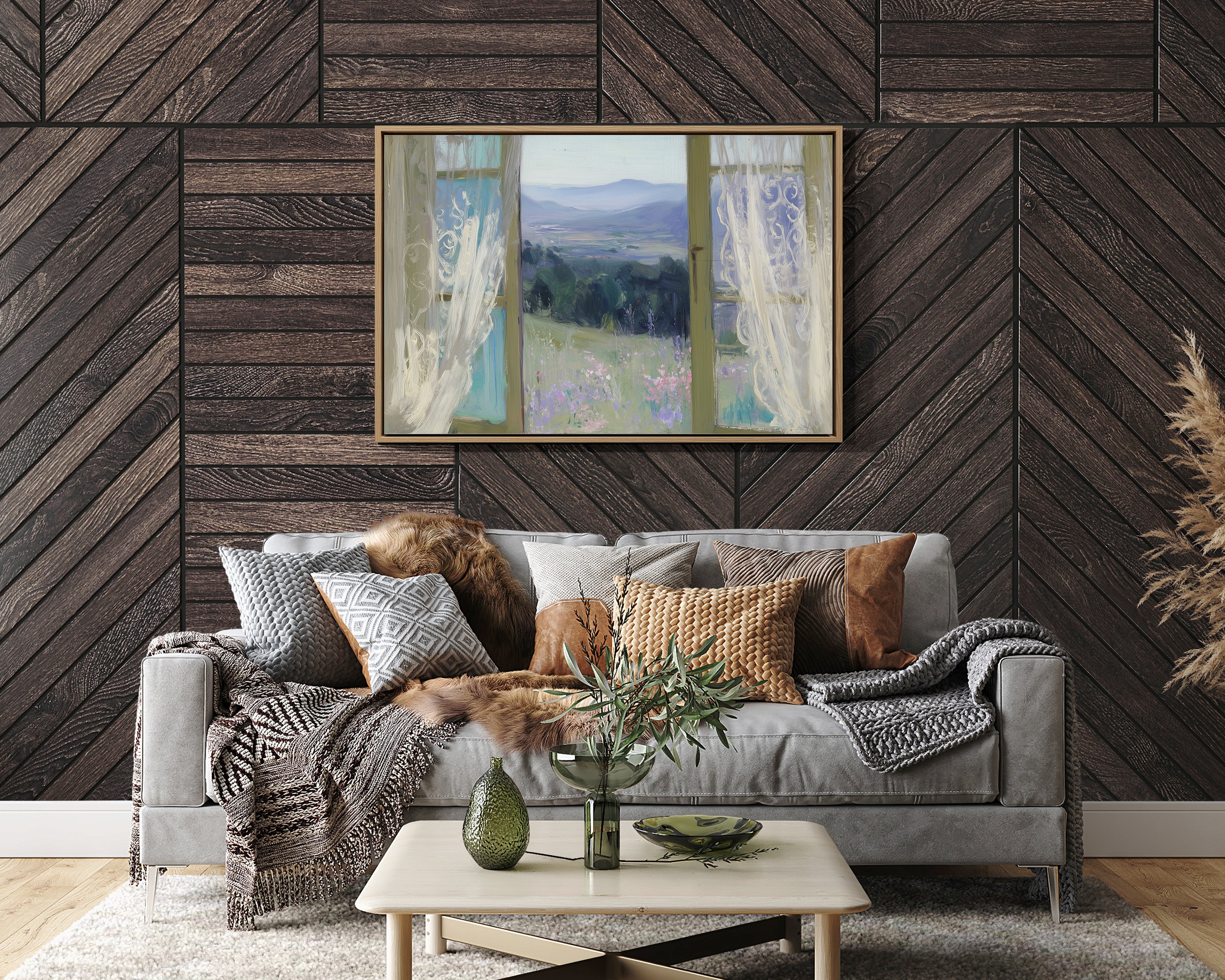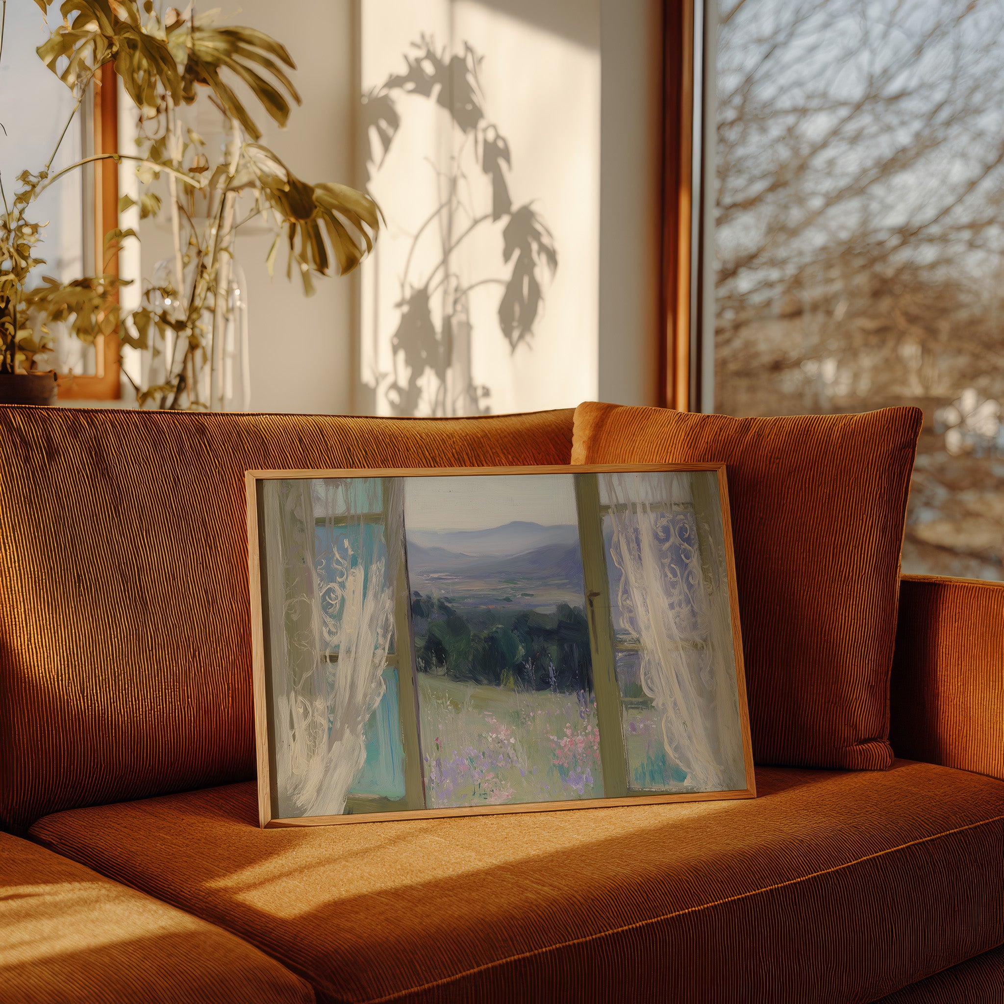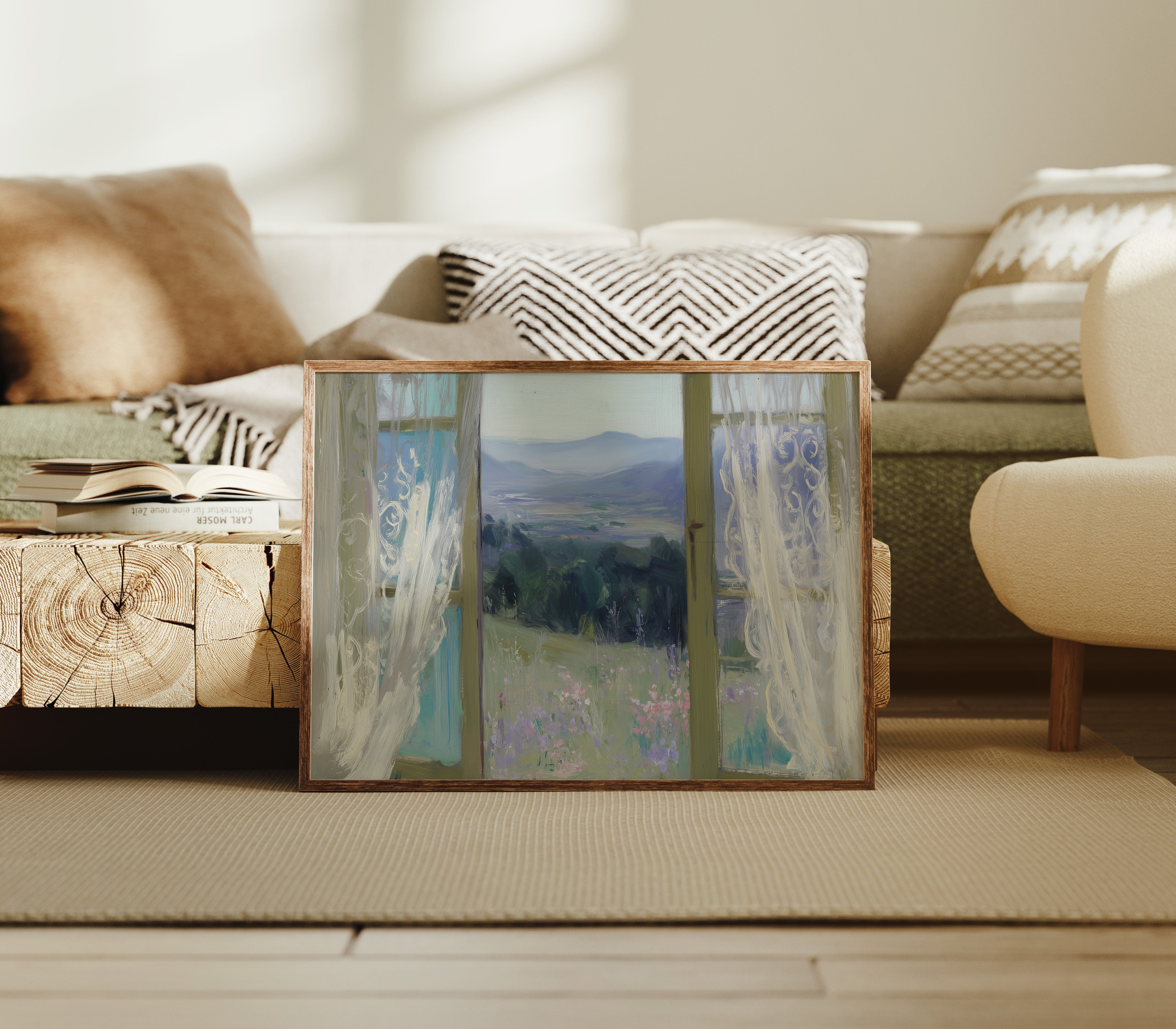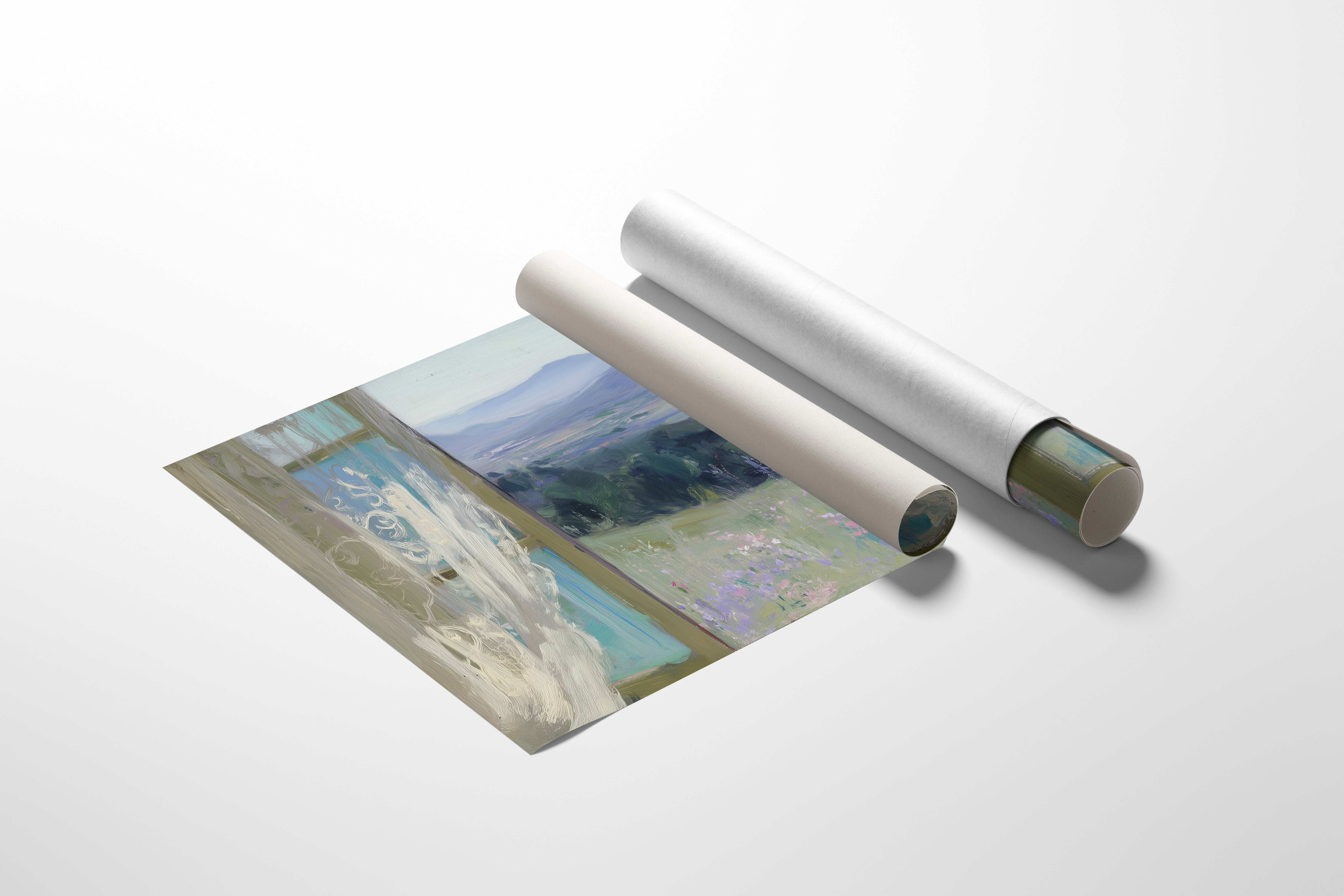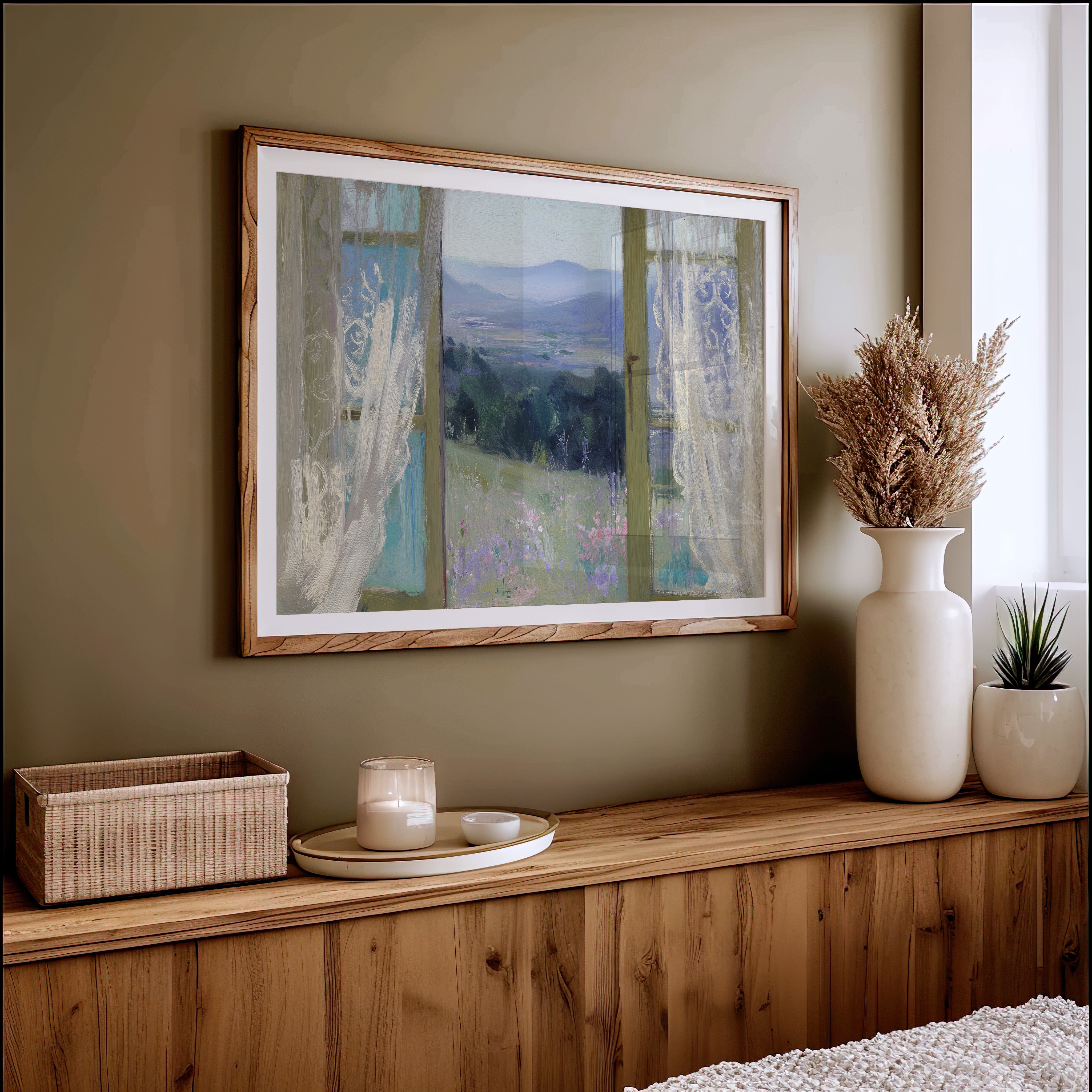 Morning light filters through gossamer curtains, framing a dreamy vista of rolling hills and distant mountains. Delicate wildflowers in soft lavender and pink dot the meadow, swaying gently in an unseen breeze against a backdrop of deep green forest. The scene captures that perfect moment between dawn and day, where the world feels full of quiet possibility. This ethereal view would bring serenity to a bedroom or reading nook, creating a peaceful retreat that invites contemplation and rest.