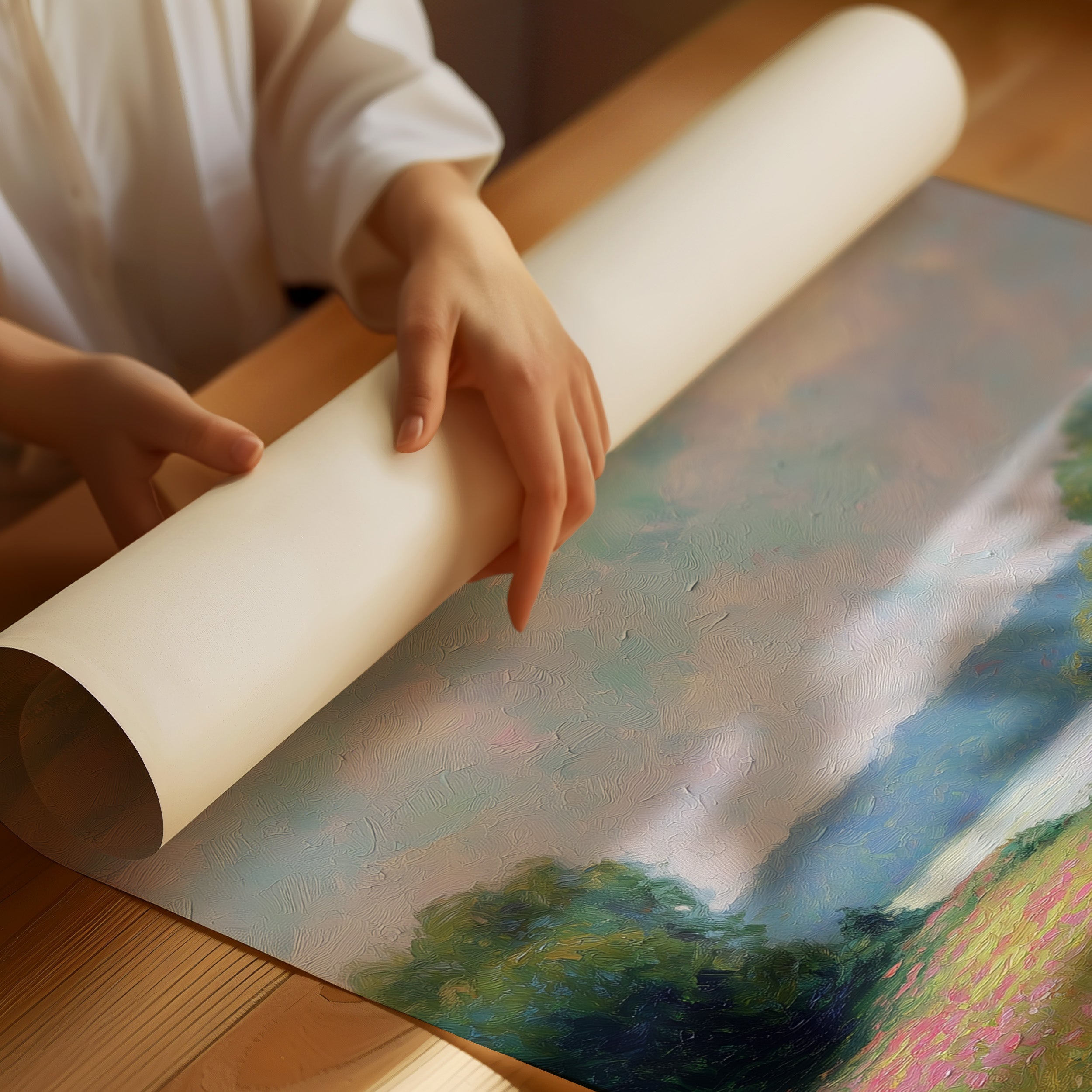 Morning light dances across a meadow where pink and purple wildflowers stretch toward a hazy horizon. The impressionist brushstrokes capture that perfect summer moment when the world seems suspended between dreams and reality, with lush green trees framing a glimpse of serene water in the distance. The painting rests on a rustic wooden table, a beautiful juxtaposition of art and everyday life that invites contemplation.
