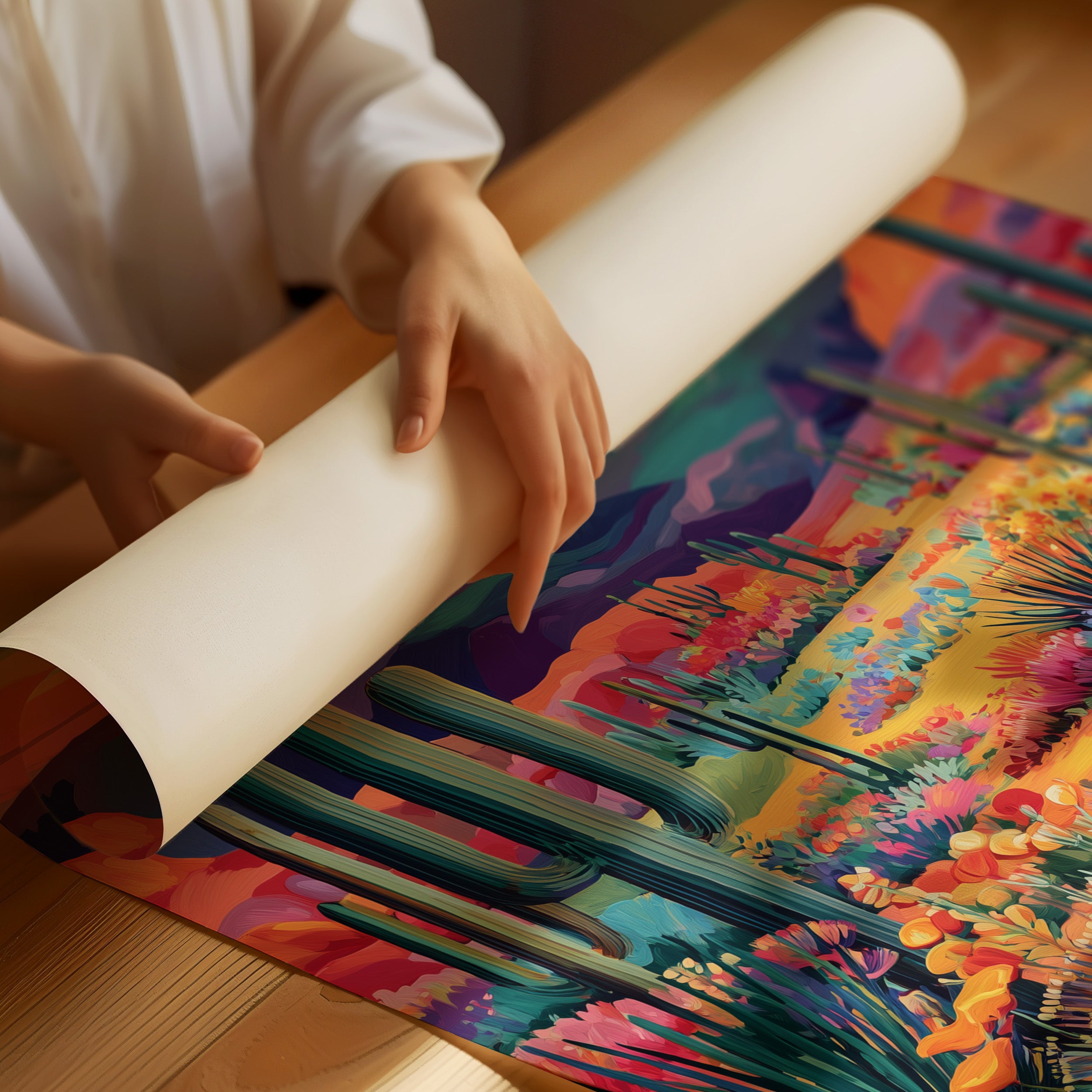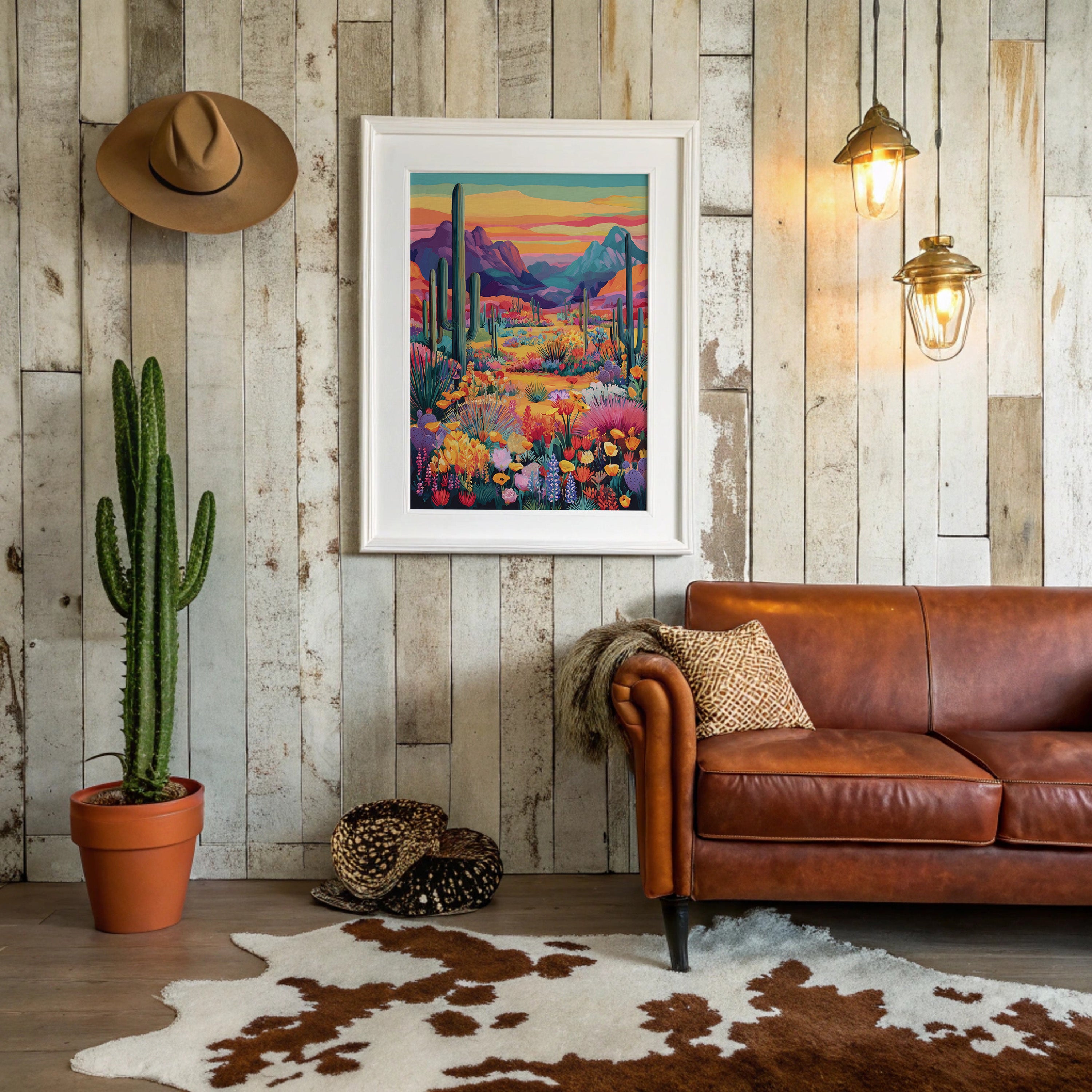 A vibrant desert landscape bursts with color as native wildflowers carpet the valley floor in a kaleidoscope of purples, oranges, and pinks. Majestic saguaro cacti stand sentinel against layered mountains painted in twilight hues, while a radiant sunset ignites the sky in bands of turquoise and coral. The contemporary illustration style brings a fresh perspective to classic southwestern scenery, blending bold geometric shapes with organic desert flora. This statement piece adds a perfect pop of color and southwestern charm to a modern rustic living room, home office, or anywhere you want to capture the magic of desert blooms.