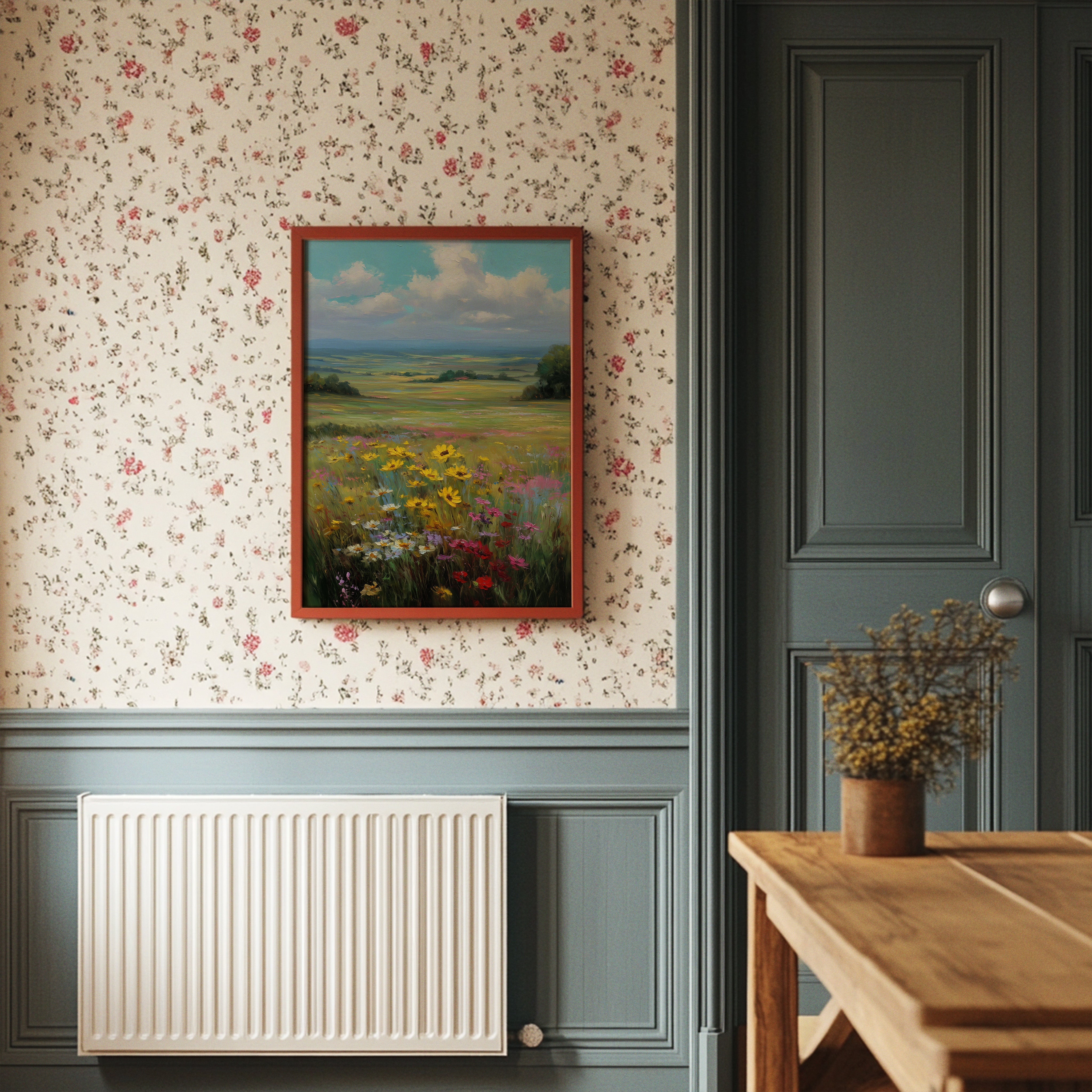 A gentle breeze sweeps across rolling meadows, where wildflowers dance in nature's own choreography. Golden daisies and crimson blooms create a vibrant tapestry against the endless horizon, while wisps of clouds drift lazily across an azure sky. The verdant landscape stretches endlessly, dotted with patches of untamed beauty and the soft interplay of light and shadow. This scene brings the untamed spirit of the countryside into modern living spaces, perfect for adding a touch of natural serenity to contemporary rooms with rustic or farmhouse elements.