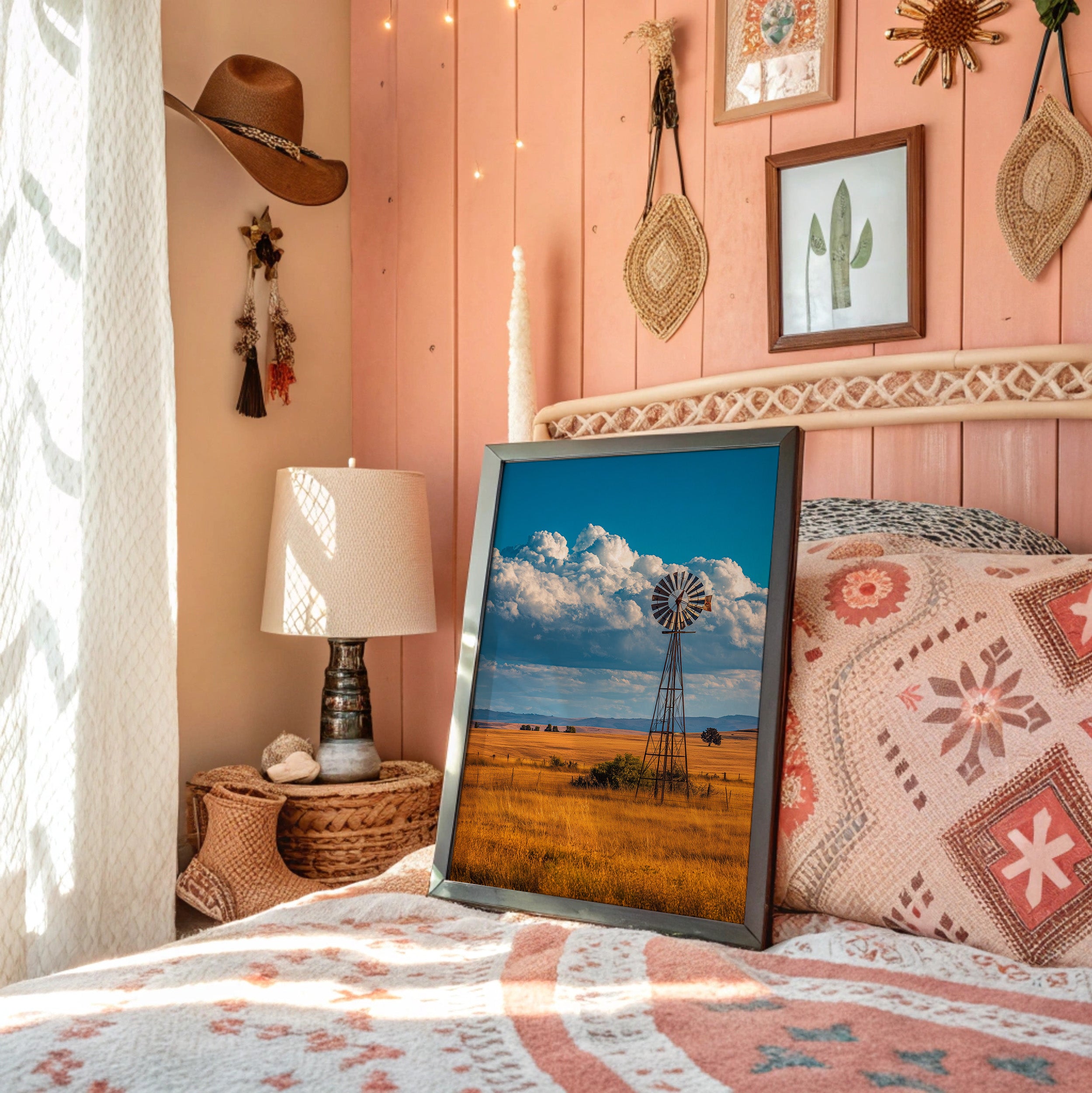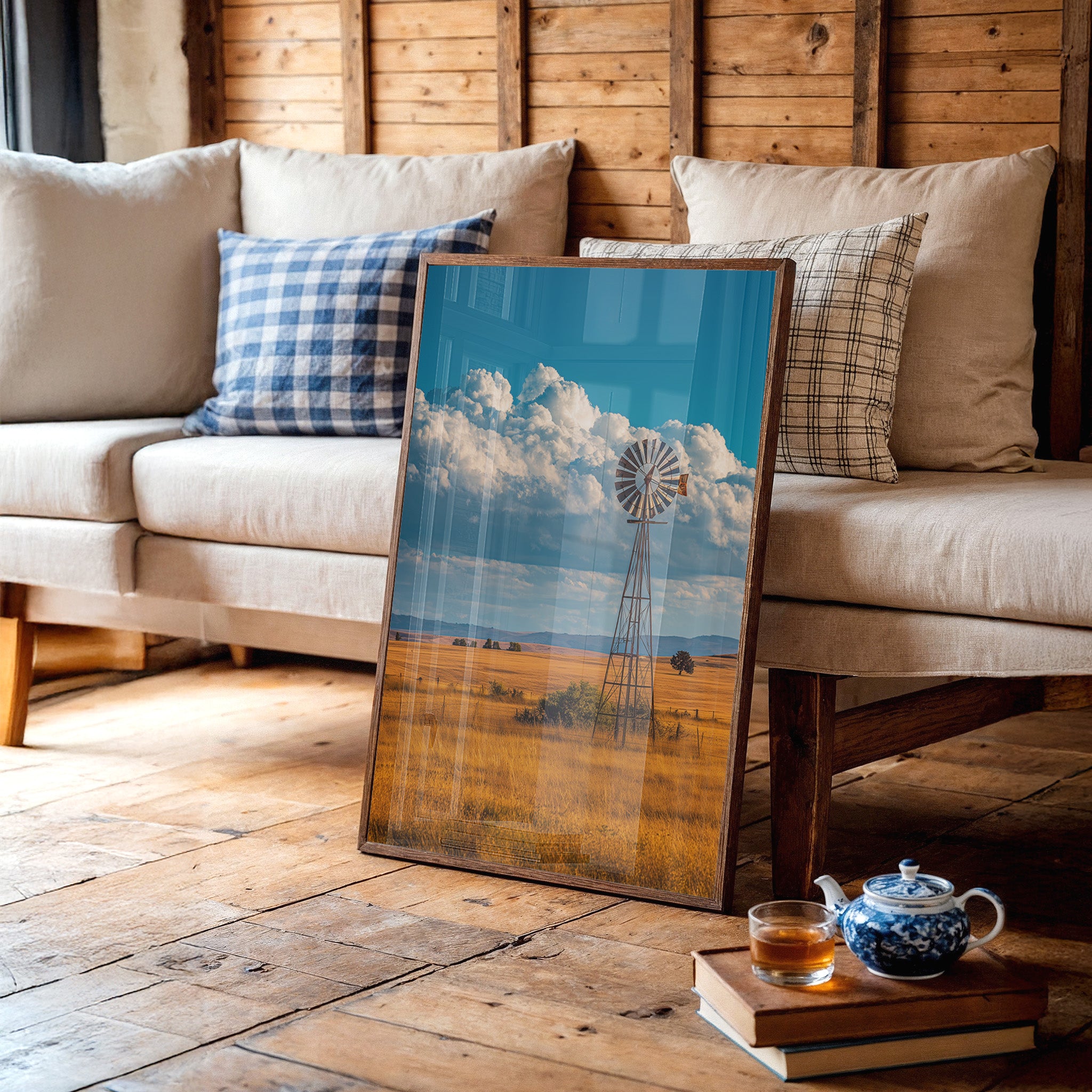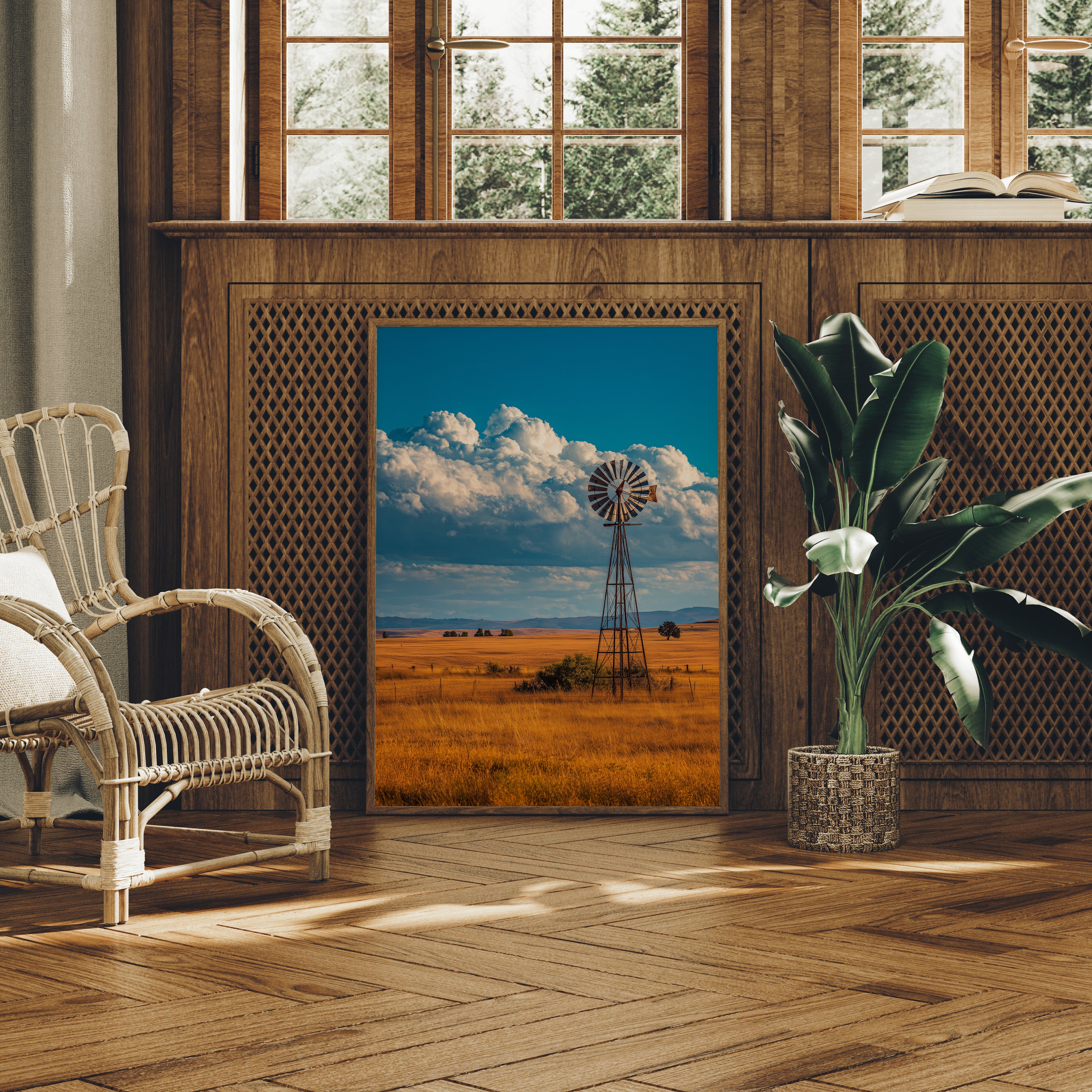 A solitary windmill stands sentinel against an endless azure sky, its metal blades catching the golden light of a late summer afternoon. Rolling wheat fields stretch toward the horizon in warm amber waves, while pillowy clouds drift lazily overhead in nature's perfect composition. The scene captures the timeless essence of rural American landscapes, where mechanical pioneers still mark the meeting point between earth and atmosphere. Perfect for a modern farmhouse living room or rustic study where its nostalgic charm can inspire quiet contemplation.