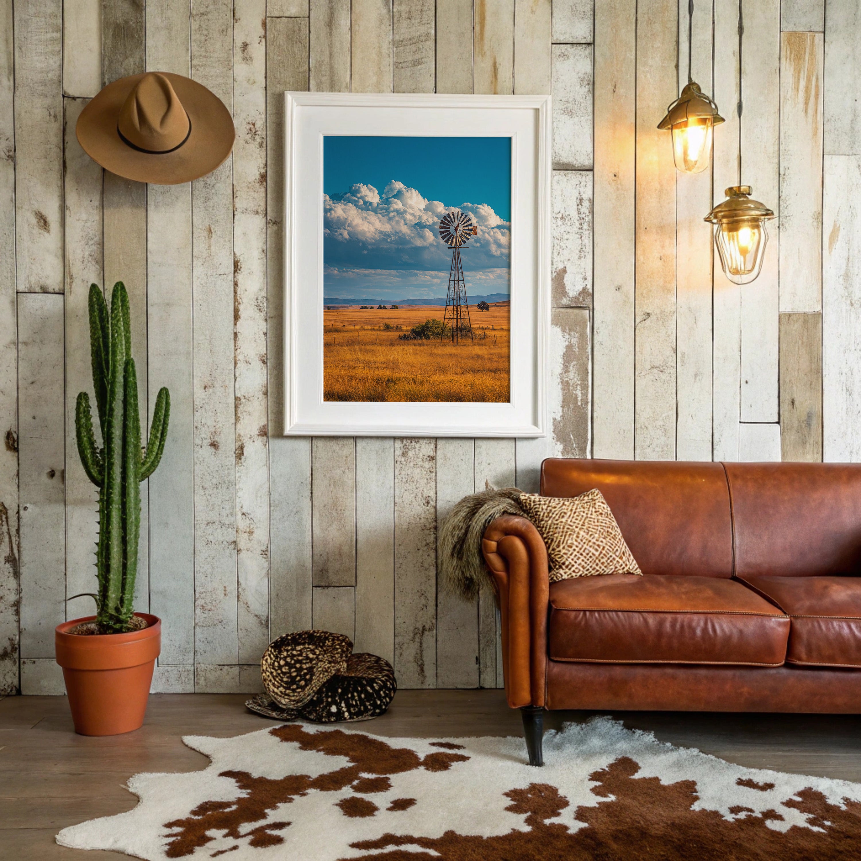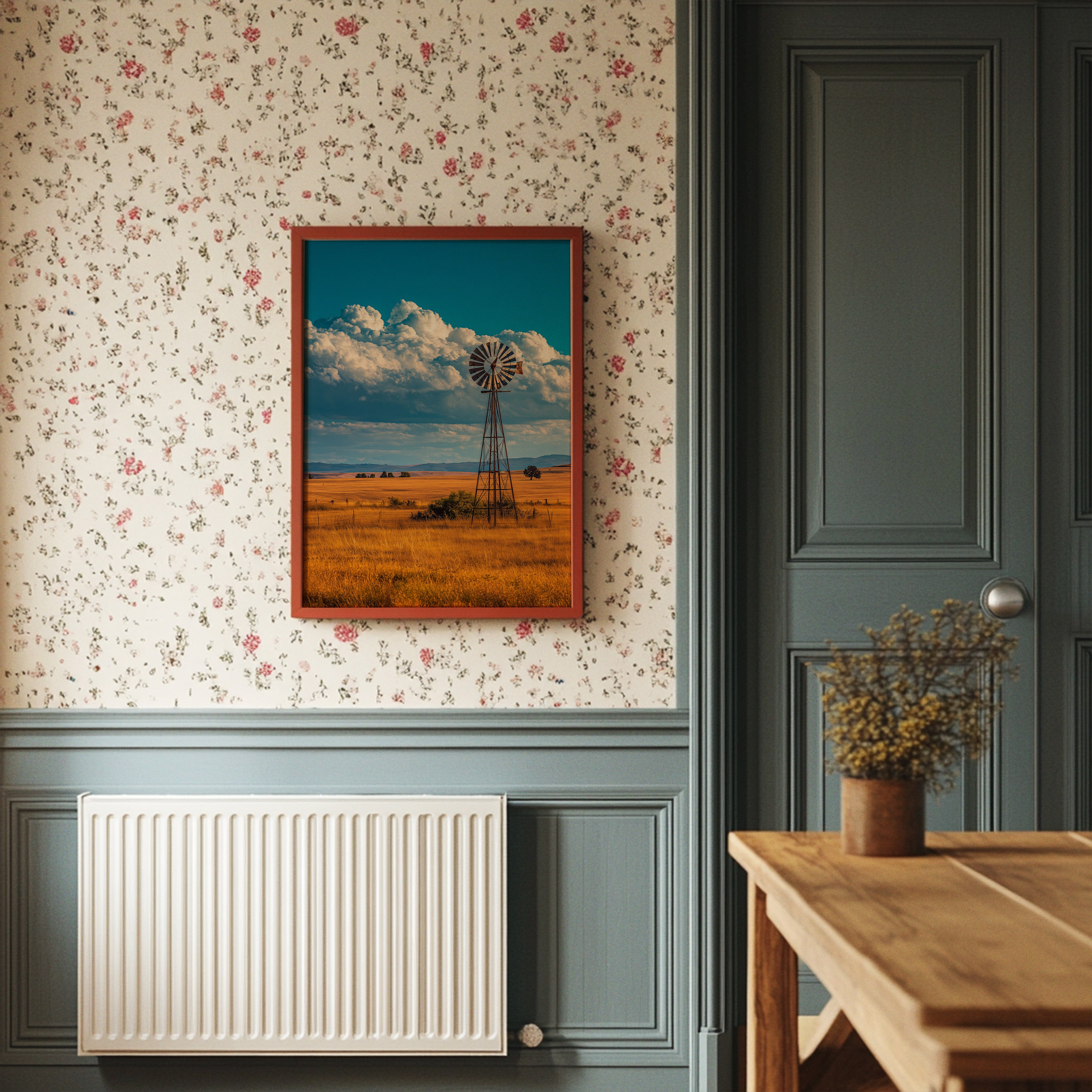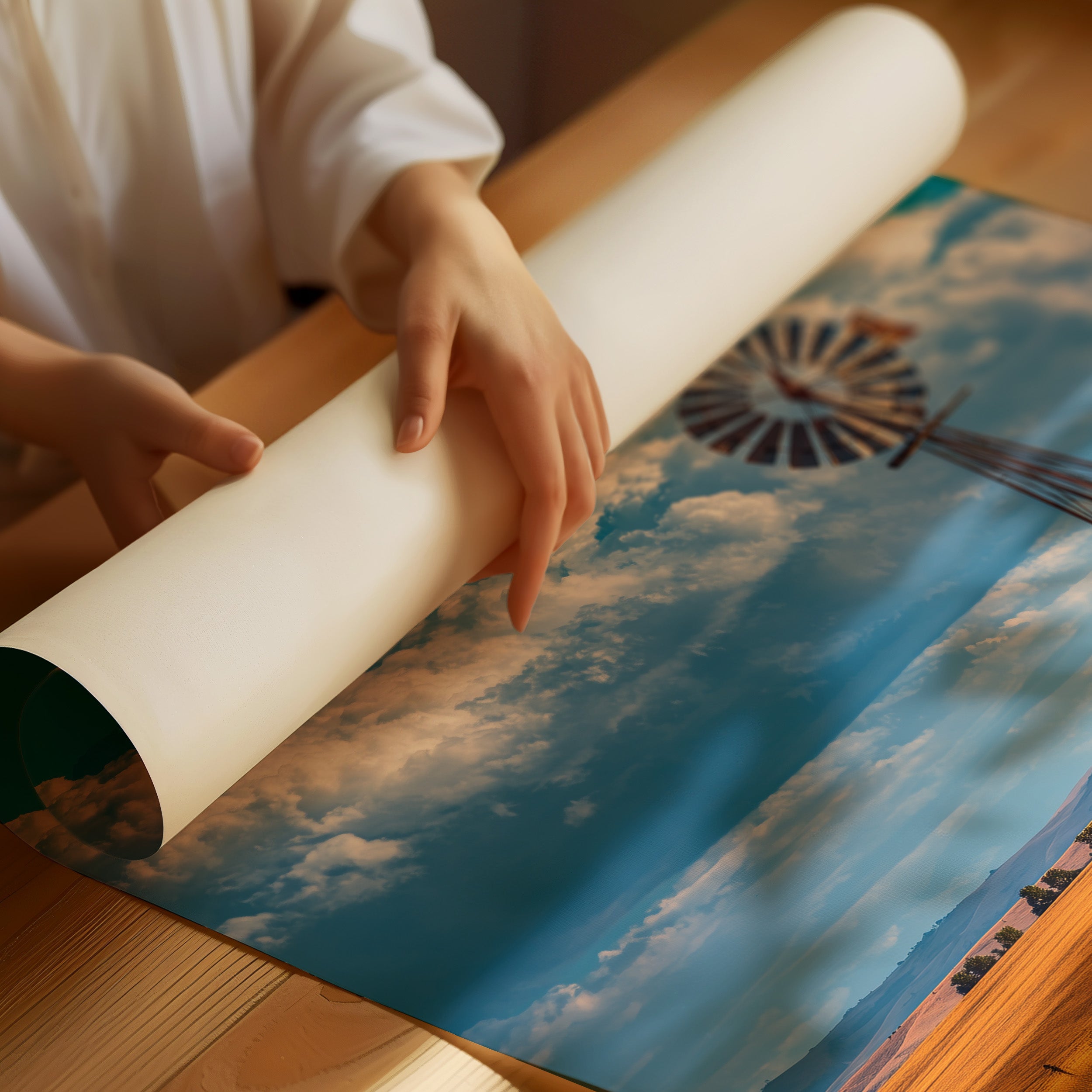 A solitary windmill stands sentinel against an endless azure sky, its metal blades catching the golden light of a late summer afternoon. Rolling wheat fields stretch toward the horizon in warm amber waves, while pillowy clouds drift lazily overhead in nature's perfect composition. The scene captures the timeless essence of rural American landscapes, where mechanical pioneers still mark the meeting point between earth and atmosphere. Perfect for a modern farmhouse living room or rustic study where its nostalgic charm can inspire quiet contemplation.