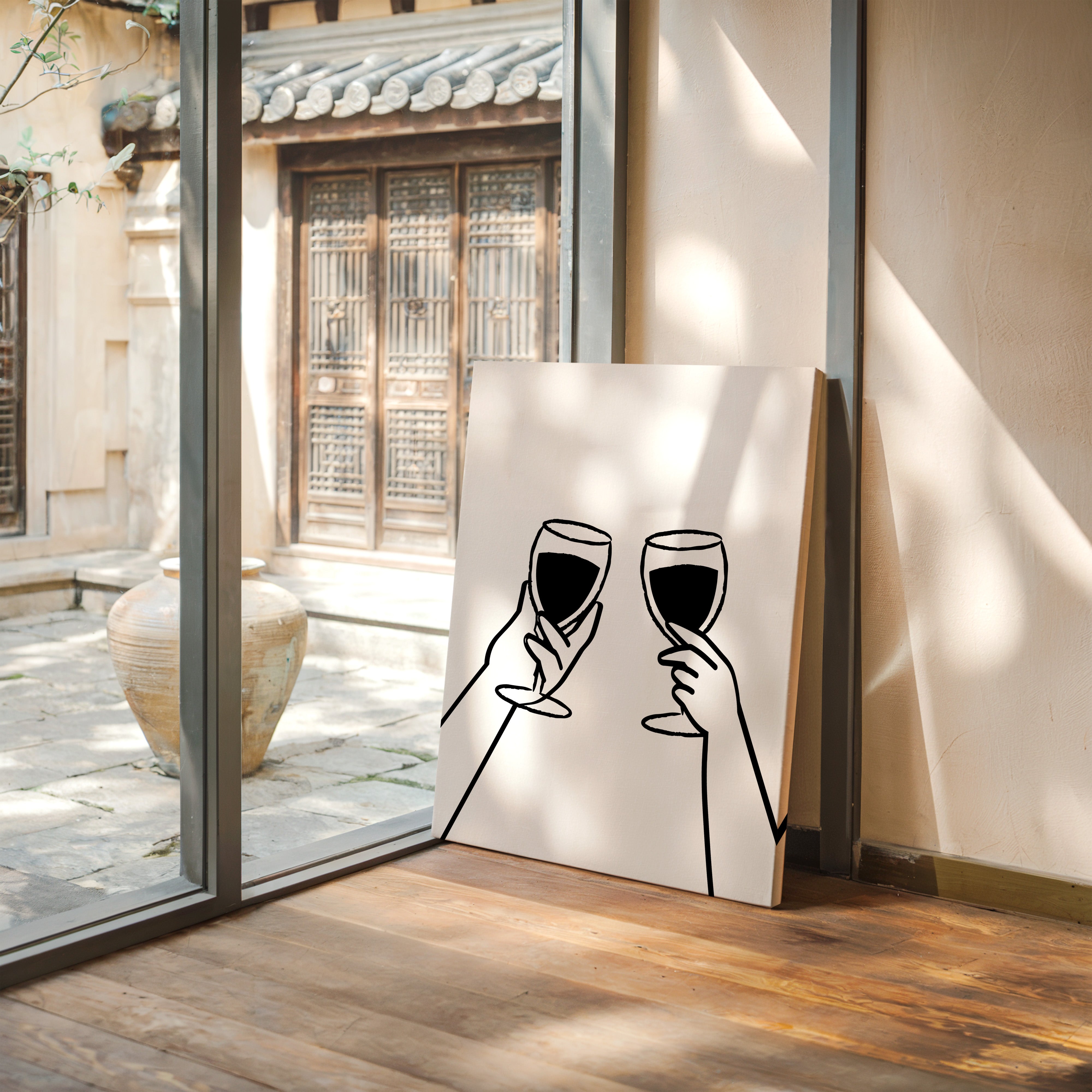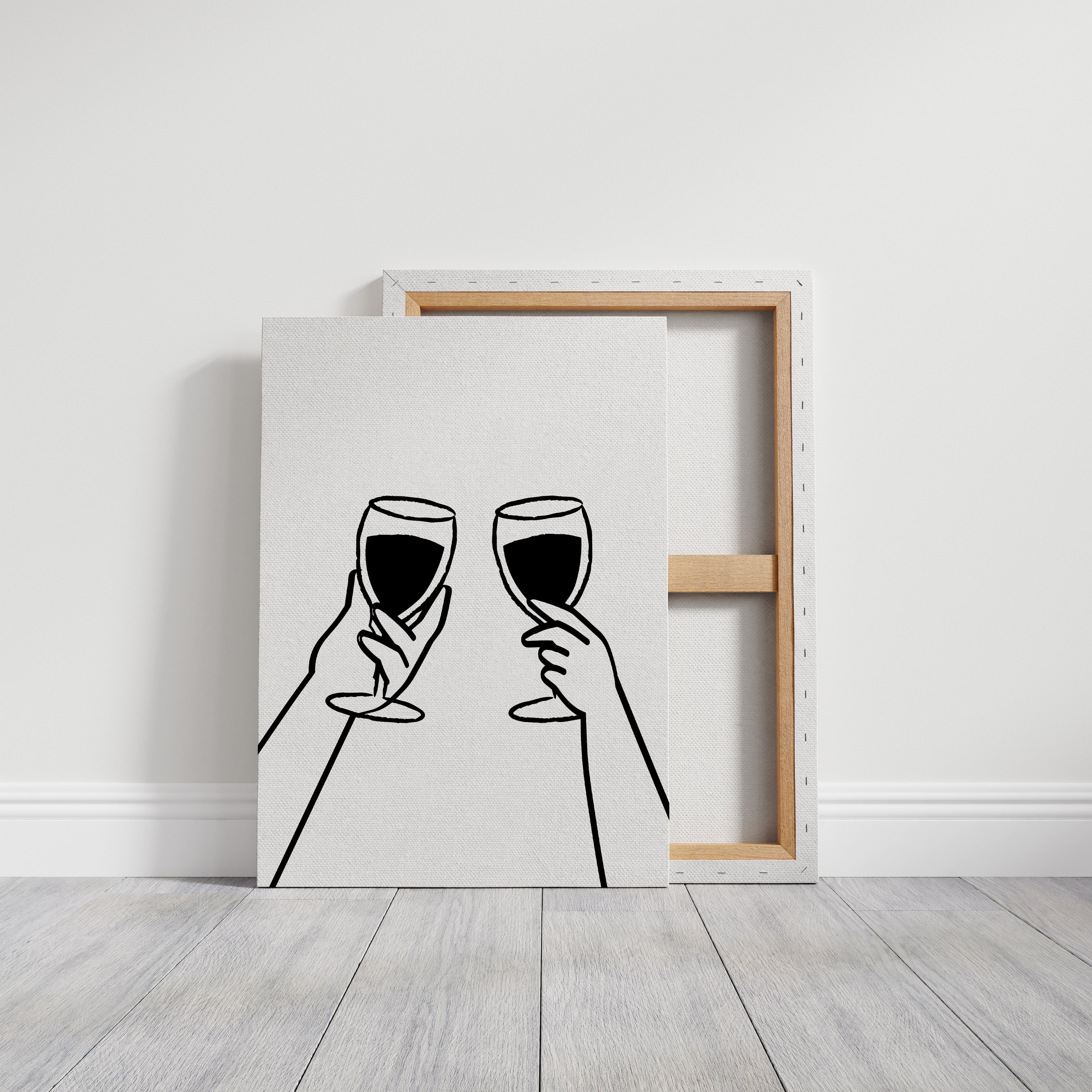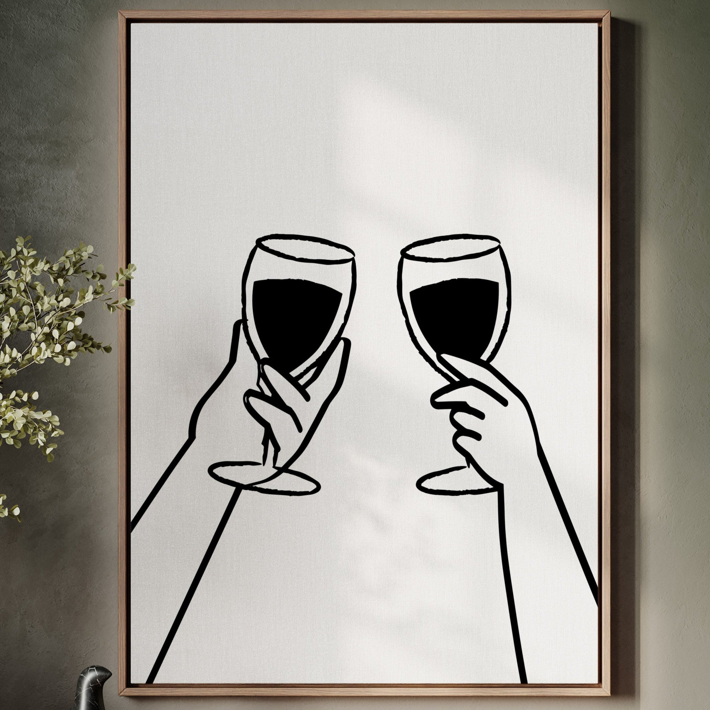 Two glasses meet in a moment of celebration, their dark contents held aloft against pristine white space. This minimalist piece from our Contemporary collection captures the essence of connection through simple, bold lines. The gentle tilt of each glass suggests an intimate dialogue, while the stark black and white palette creates a striking visual rhythm that speaks to both fellowship and sophistication. Perfect for dining rooms or kitchen spaces where memories are made and shared. This piece invites quiet moments of reflection and celebration.