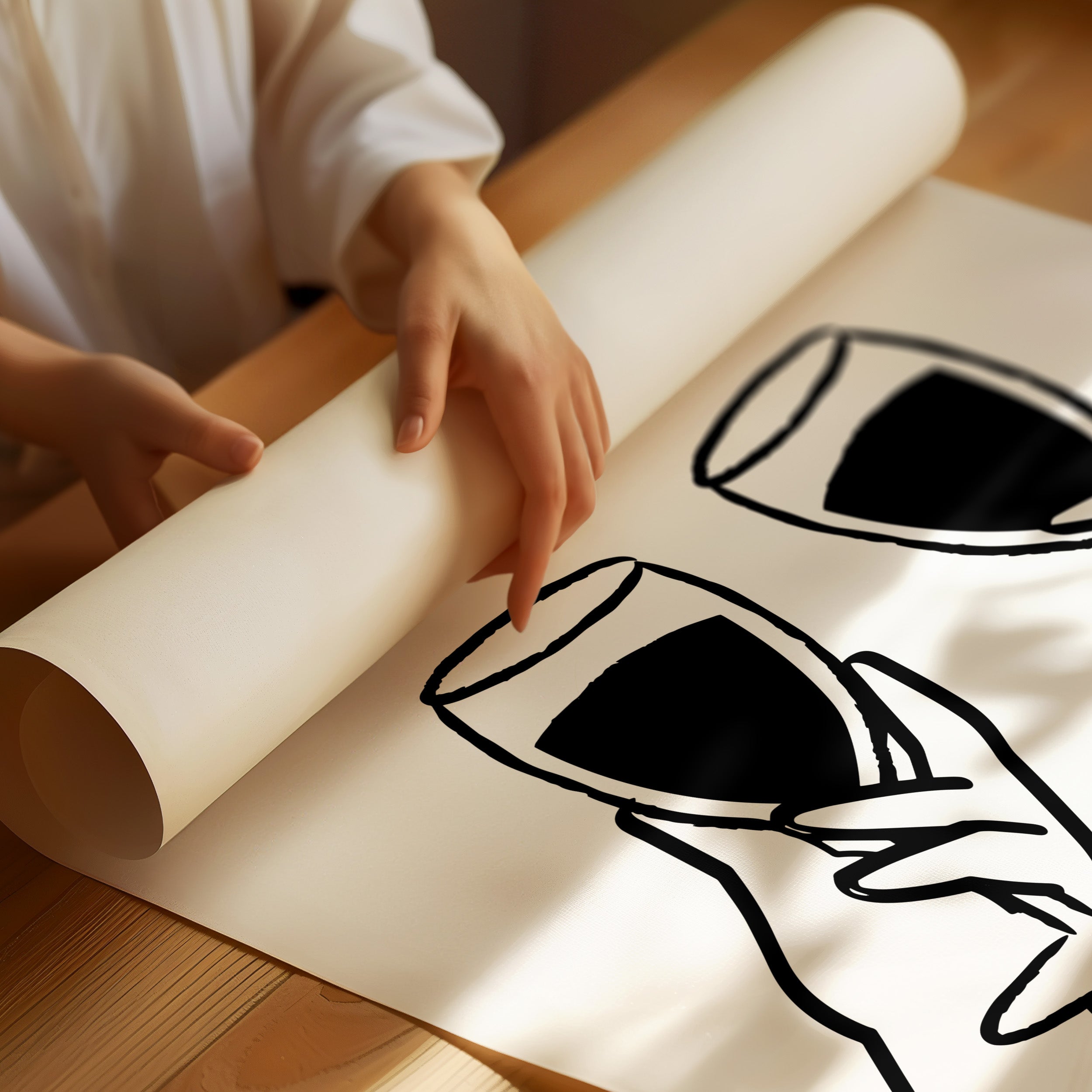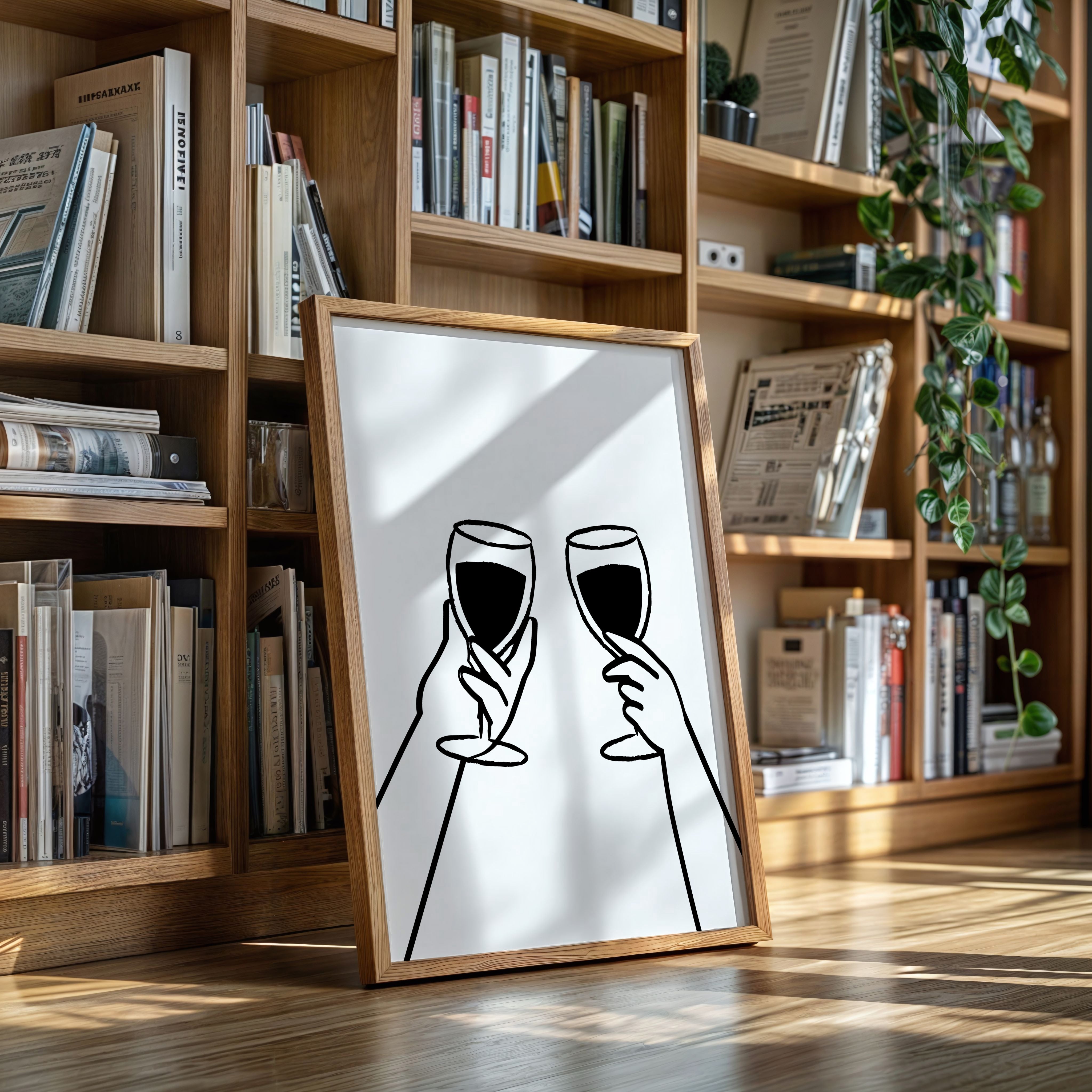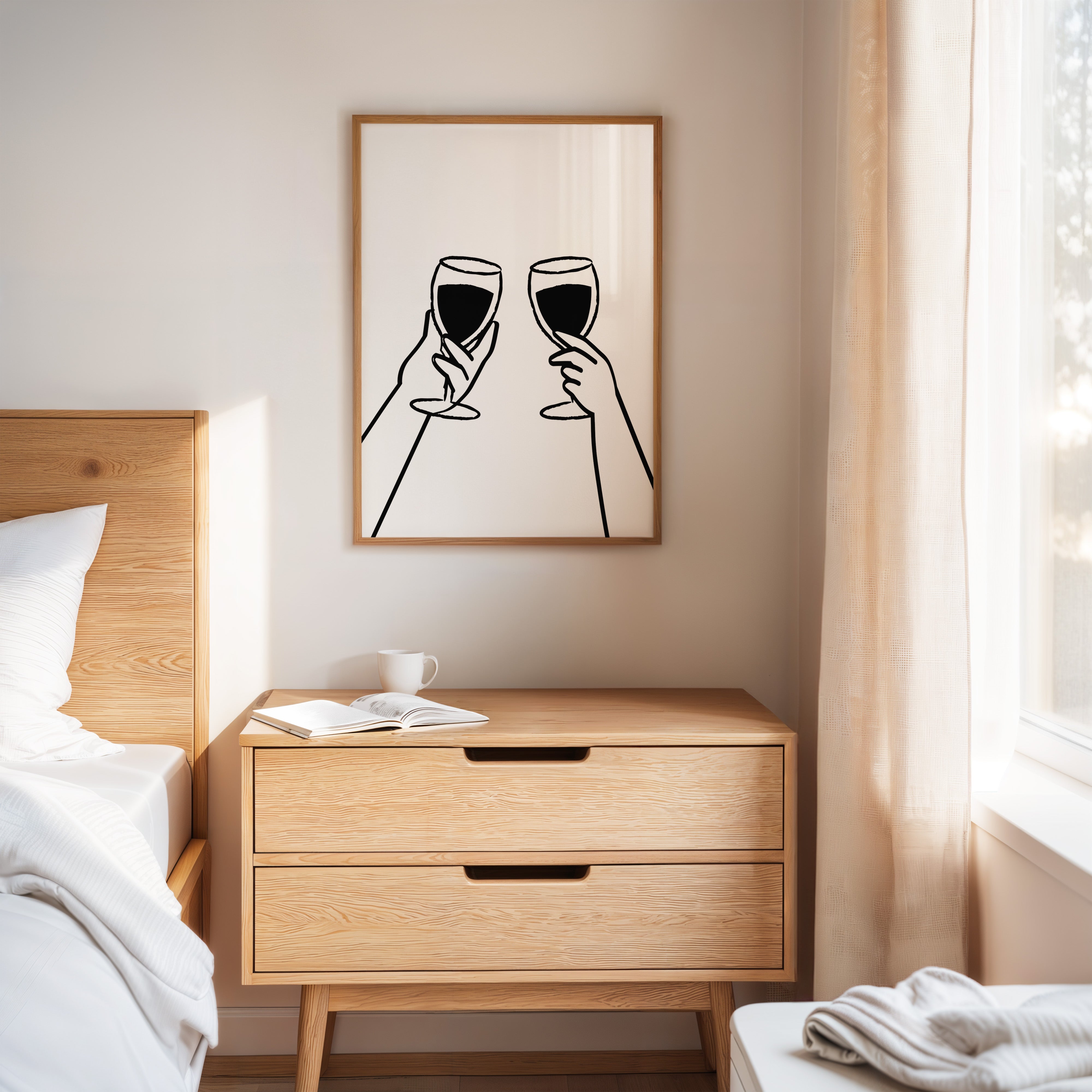 Two glasses meet in a moment of celebration, their dark contents held aloft against pristine white space. This minimalist piece from our Contemporary collection captures the essence of connection through simple, bold lines. The gentle tilt of each glass suggests an intimate dialogue, while the stark black and white palette creates a striking visual rhythm that speaks to both fellowship and sophistication. Perfect for dining rooms or kitchen spaces where memories are made and shared. This piece invites quiet moments of reflection and celebration.