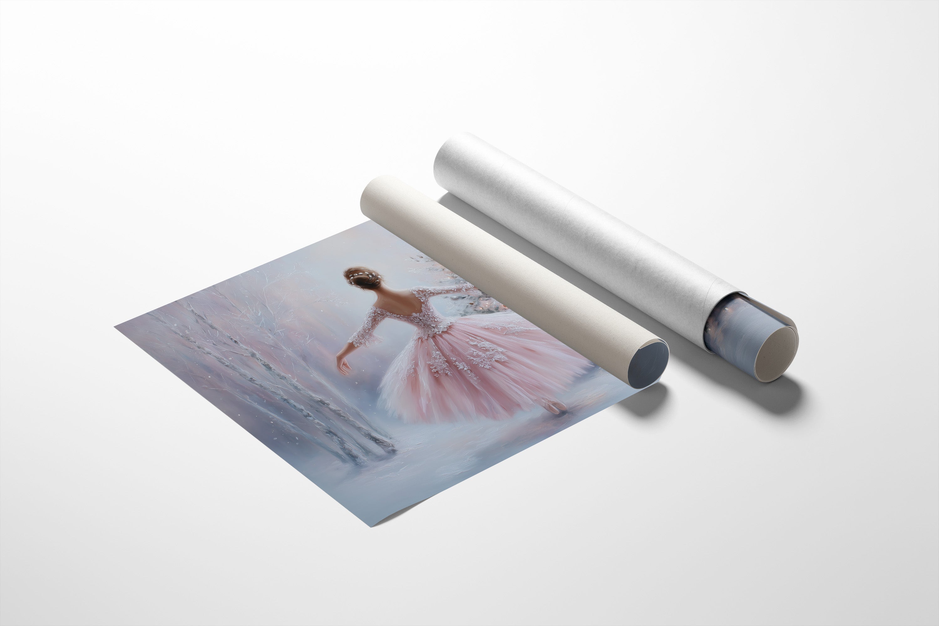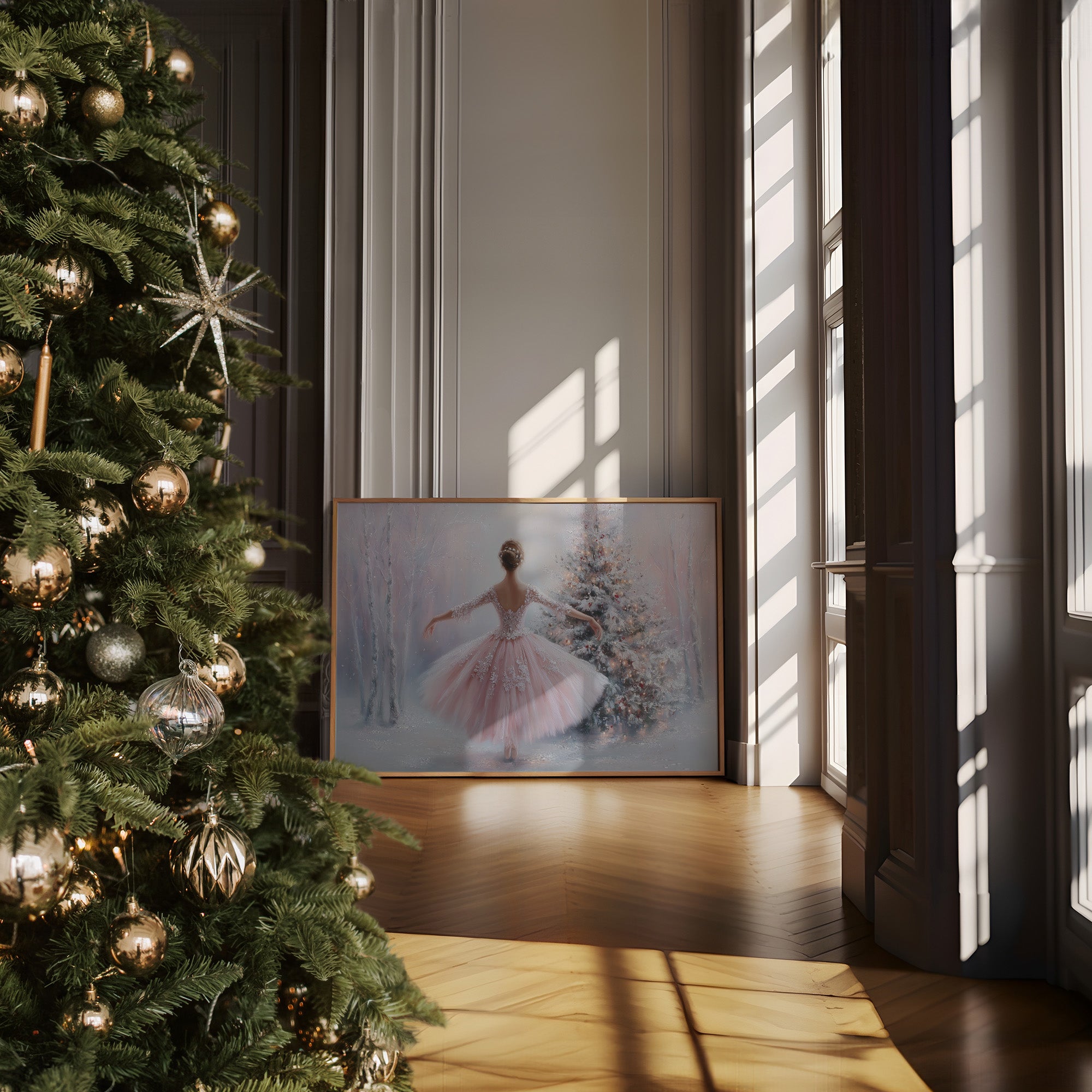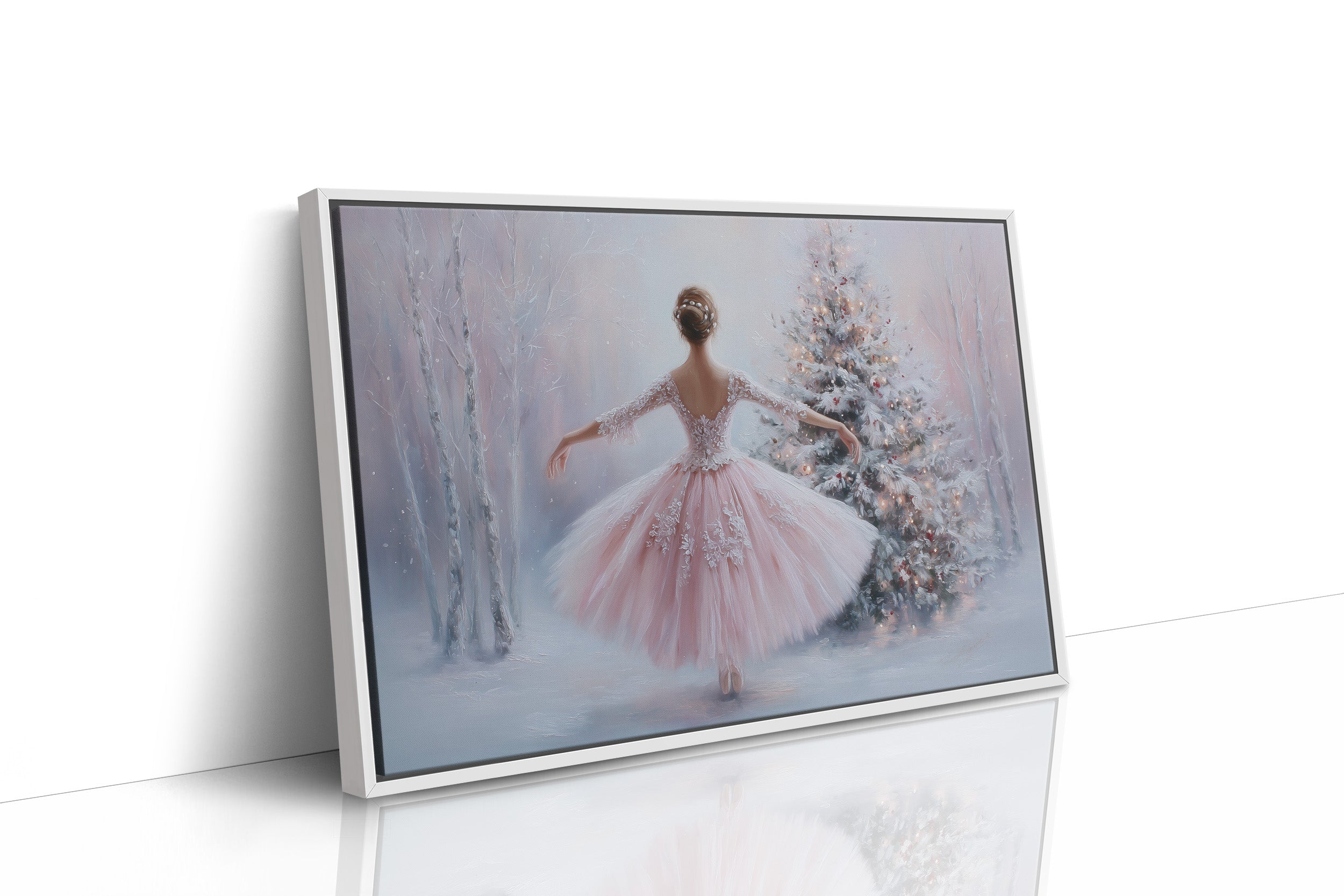 A delicate moment frozen in time as soft pink tulle swirls through a misty winter scene. The graceful figure twirls amidst silver birch trees and a decorated Christmas tree, their branches dusted with fresh snow. Gentle pastels of blush and ice blue create an ethereal atmosphere, while crystalline details on the dress catch imaginary light like morning frost. This enchanting piece brings classical elegance and winter wonder to any space, perfect for a young dancer's room or a sophisticated sitting area where dreams take flight.