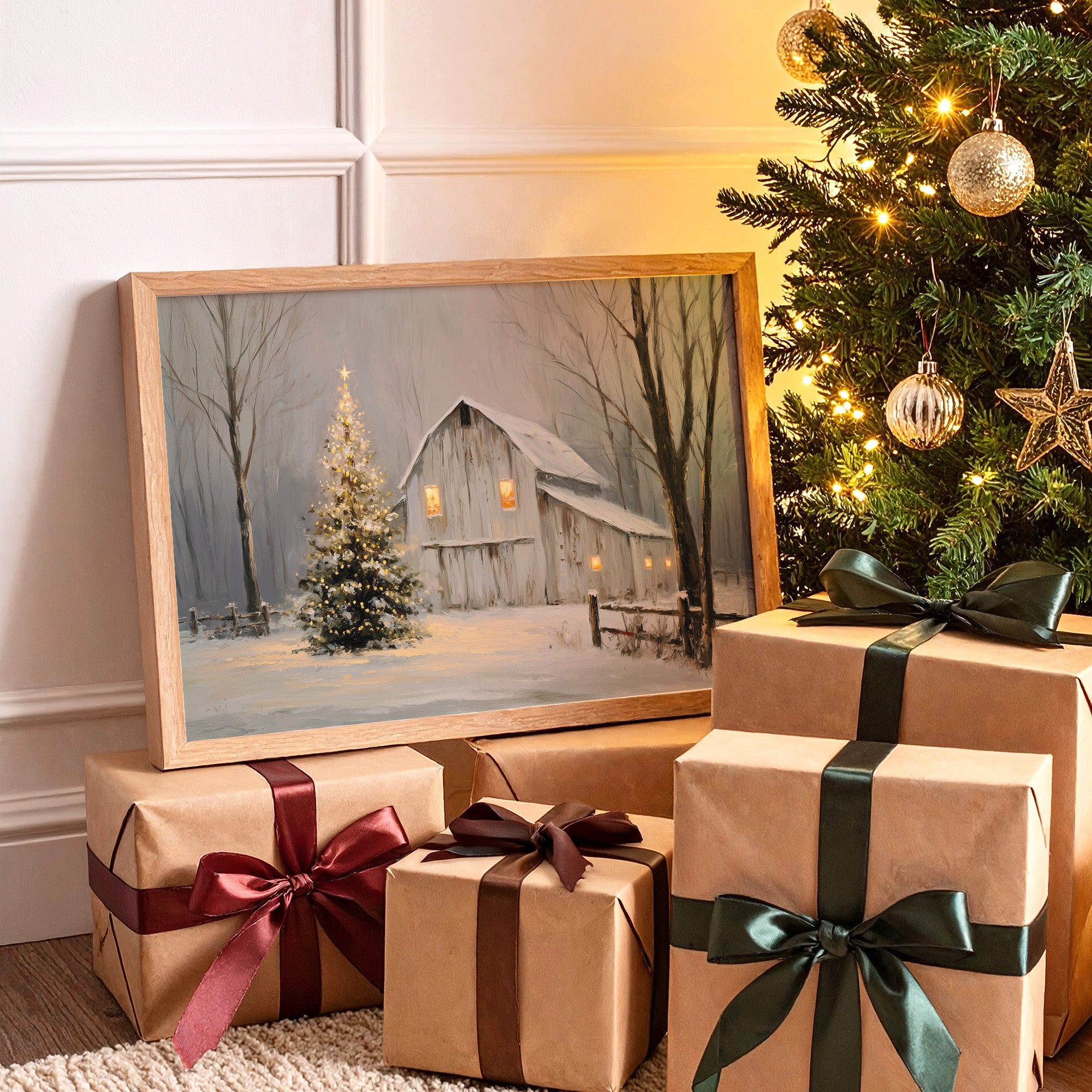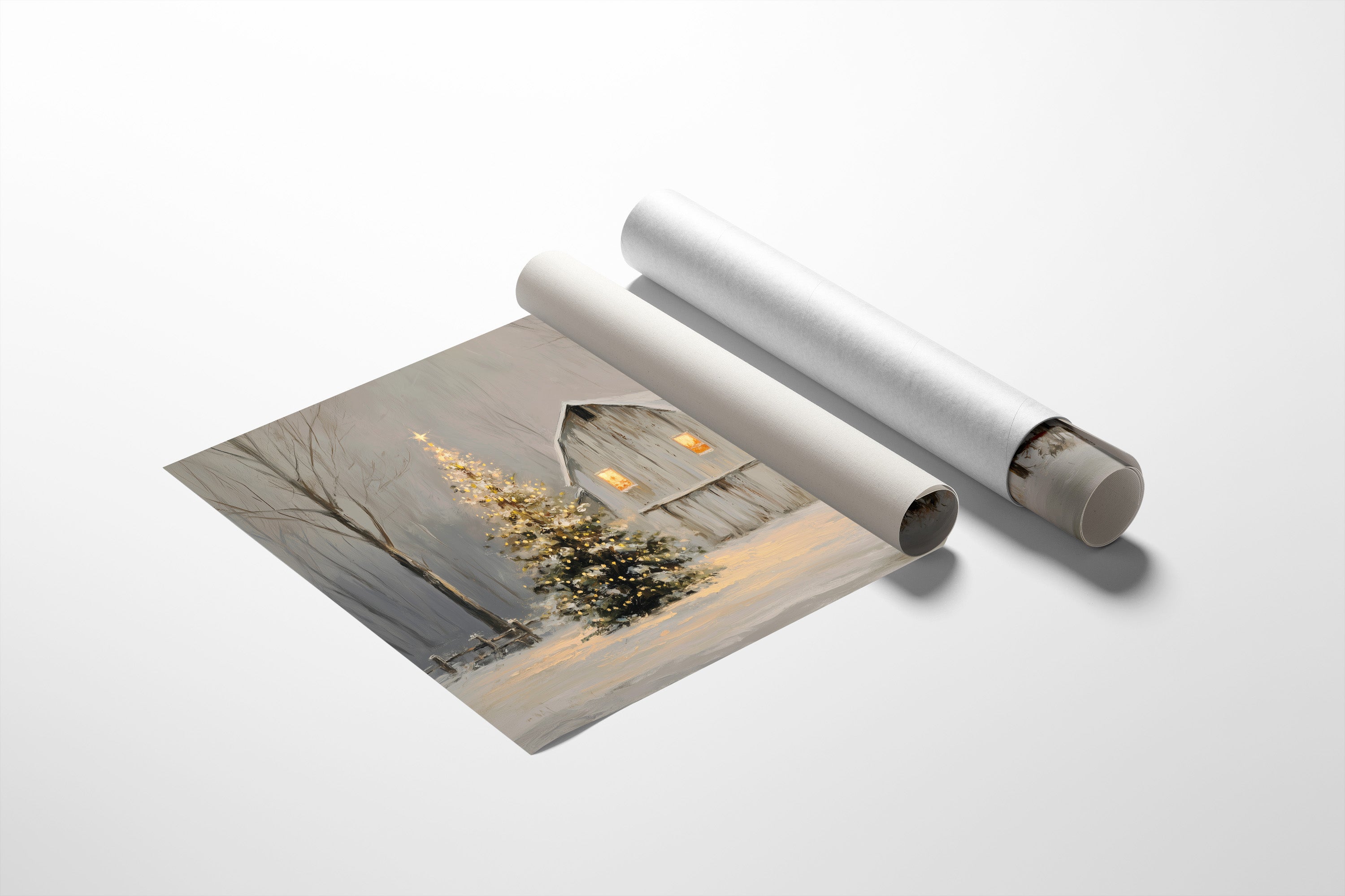 A weathered barn stands sentinel in the misty winter twilight, its windows casting warm golden light into the snowy darkness. The scene captures a moment of pure holiday enchantment, where a decorated evergreen tree sparkles against the gray-white landscape. Bare trees frame the rustic structure while snow blankets the ground, creating a peaceful sanctuary in the winter woods. This nostalgic winter scene brings countryside charm and seasonal warmth to any space. Perfect for adding a touch of holiday magic to living rooms, entryways, or cozy reading nooks during the festive season.