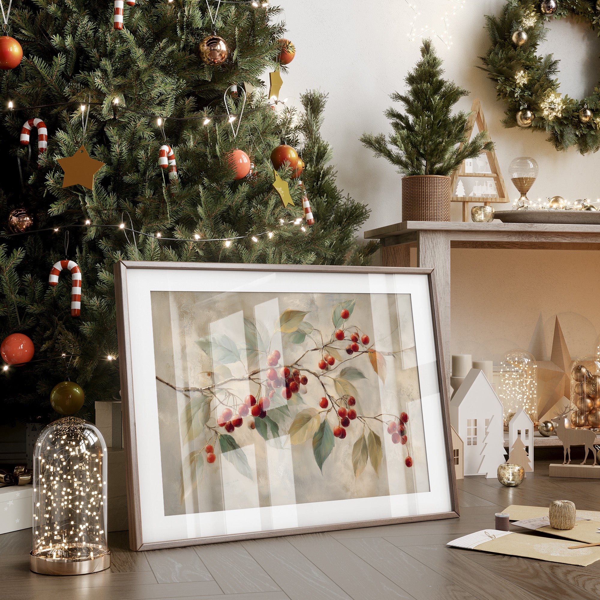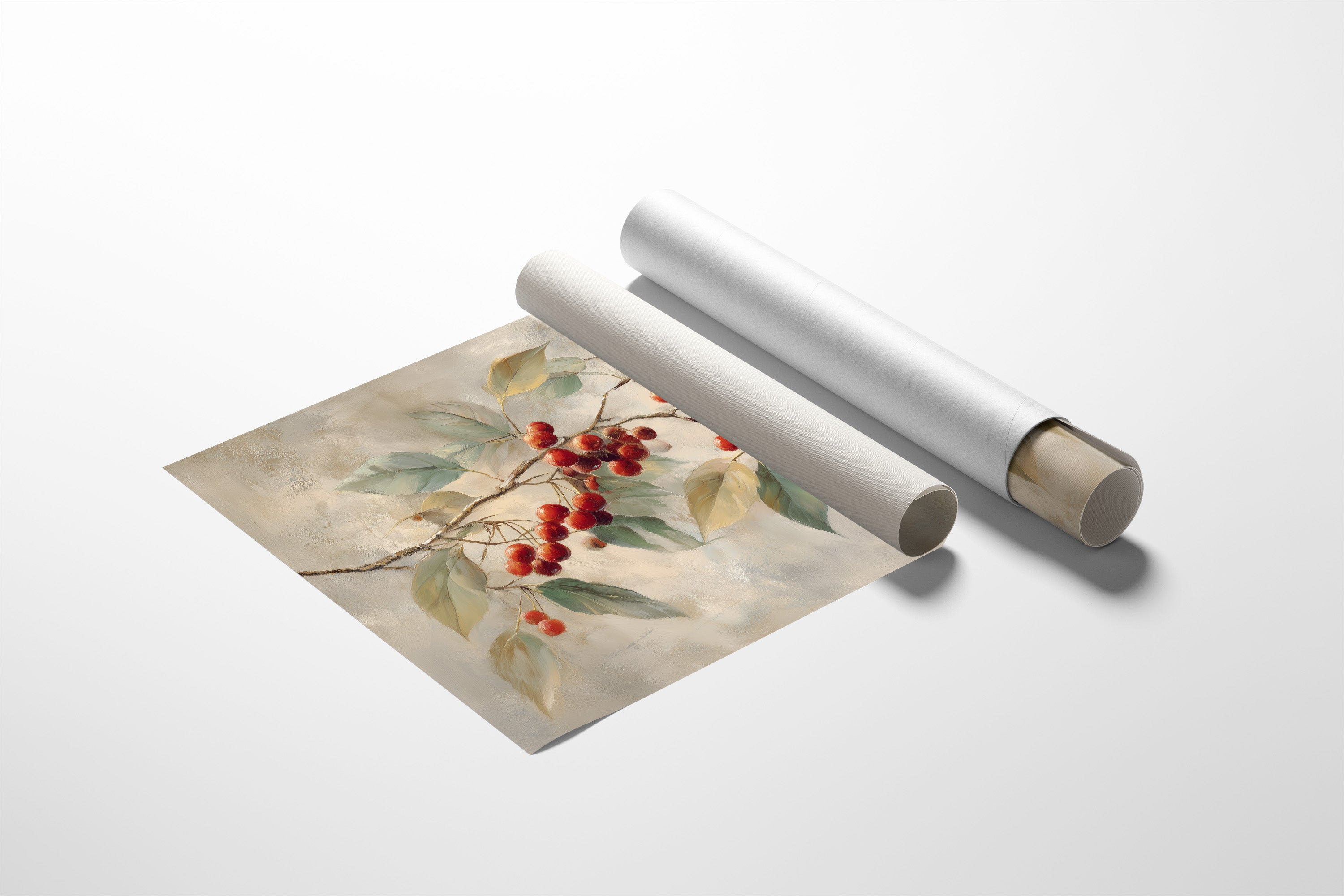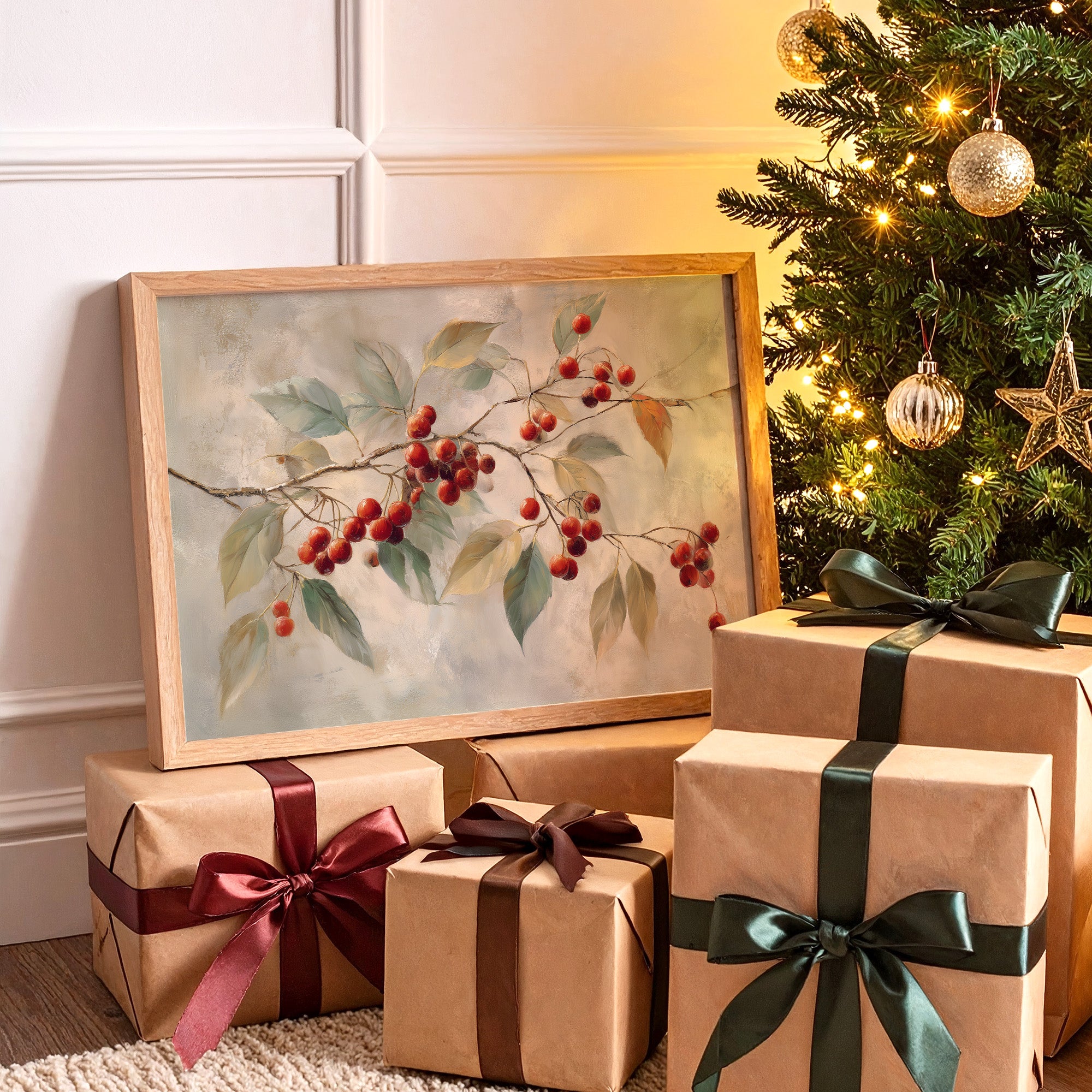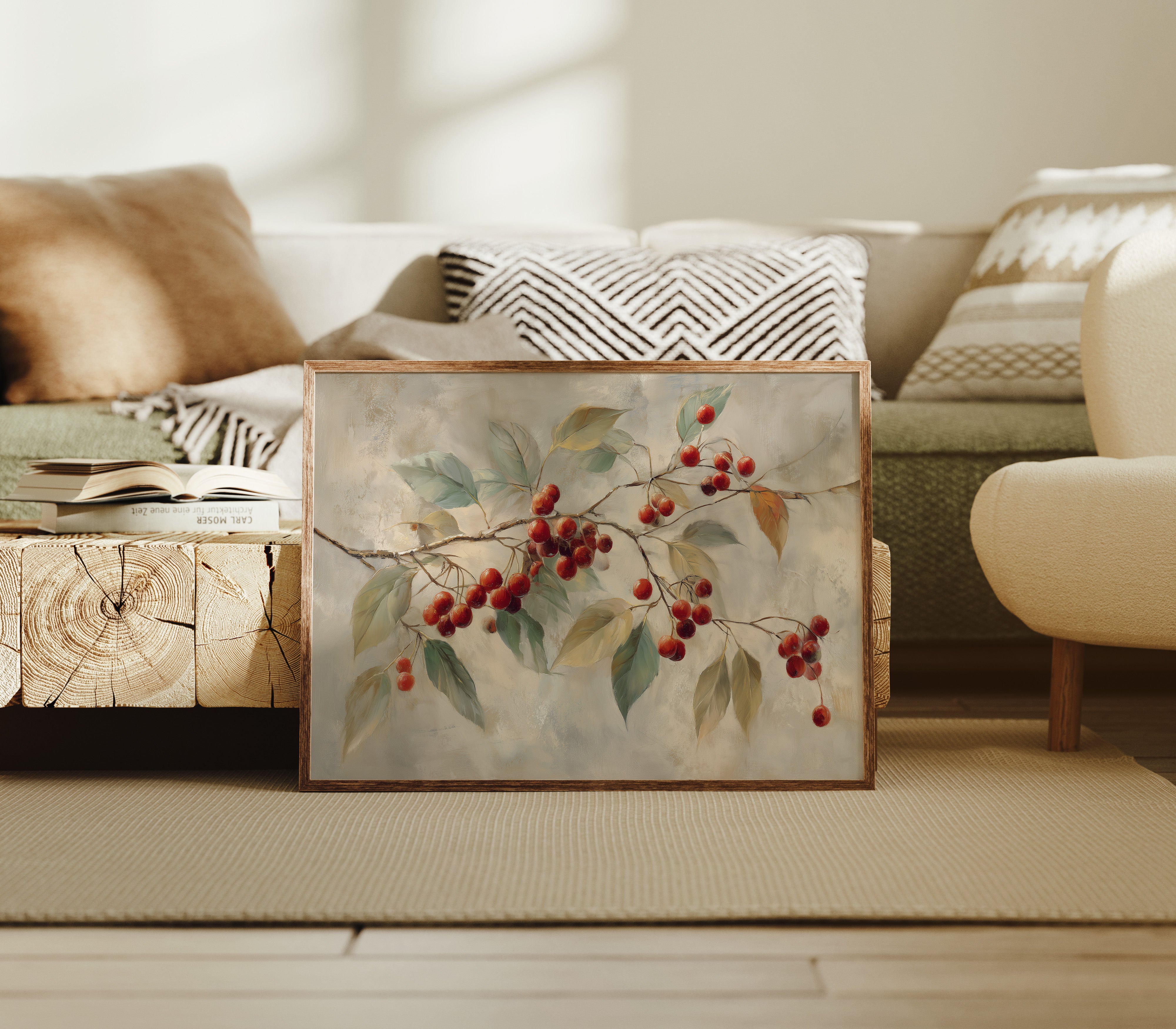 Delicate red berries dance across a misty canvas, their vibrant hue a stark contrast against sage-tinted leaves and cream-colored shadows. The botanical composition flows with graceful movement, each branch carefully rendered to capture the essence of winter's quiet beauty. The soft, neutral background creates a dreamy atmosphere while highlighting the rich crimson fruits and golden-touched foliage. This piece brings seasonal warmth to any space, perfect for creating an inviting atmosphere in a dining room or living area where its subtle holiday spirit can be appreciated year-round.