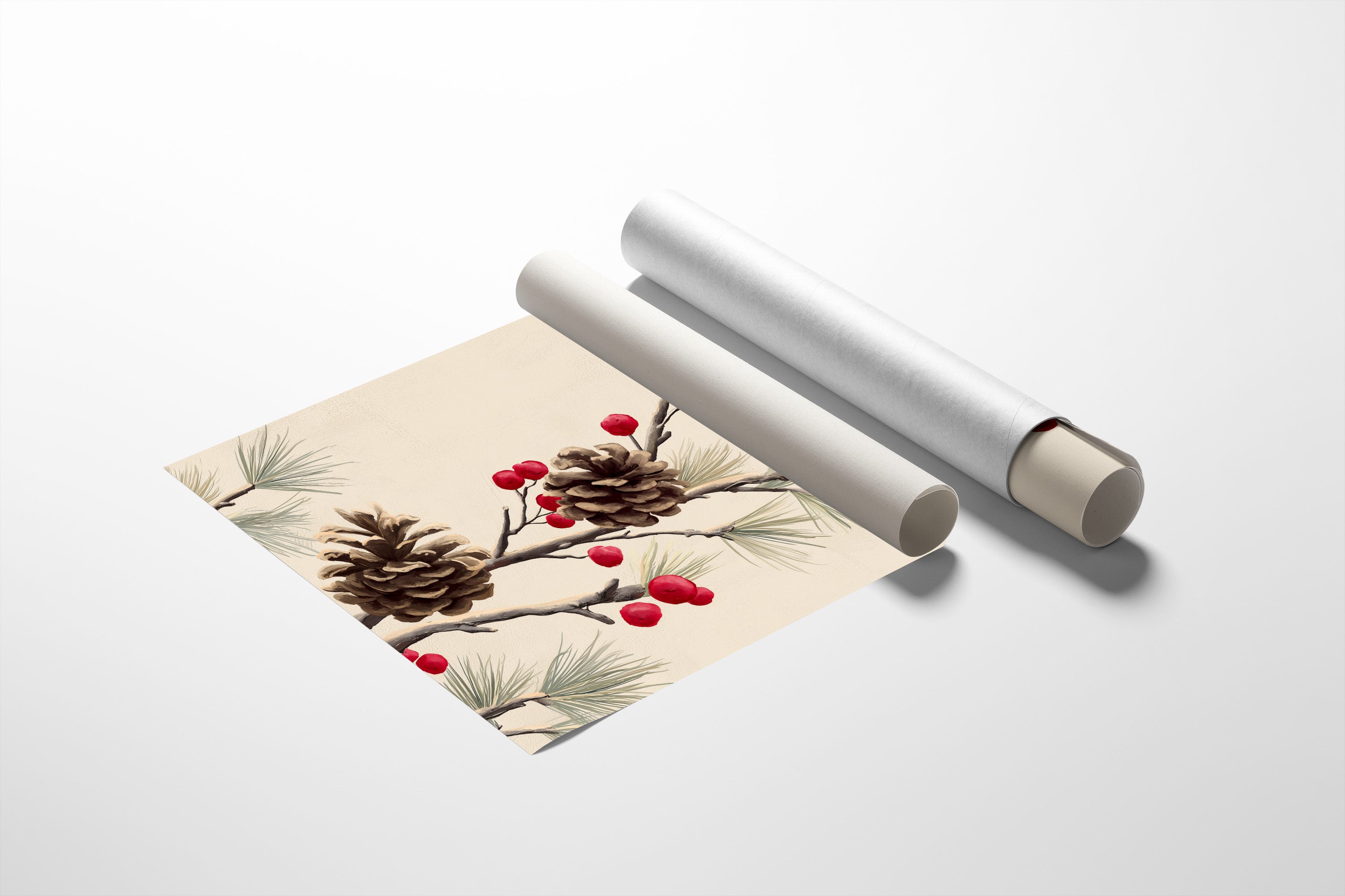 Crimson berries dot bare branches like nature's ornaments, creating a delicate dance against a peaceful cream backdrop. Brown pinecones and soft pine needles weave together in an elegant composition, capturing the essence of winter's quiet beauty. The traditional botanical study takes on a contemporary feel through its minimalist approach and thoughtful negative space. Perfect for bringing seasonal warmth to modern living spaces, this piece bridges the gap between holiday cheer and year-round sophistication.
