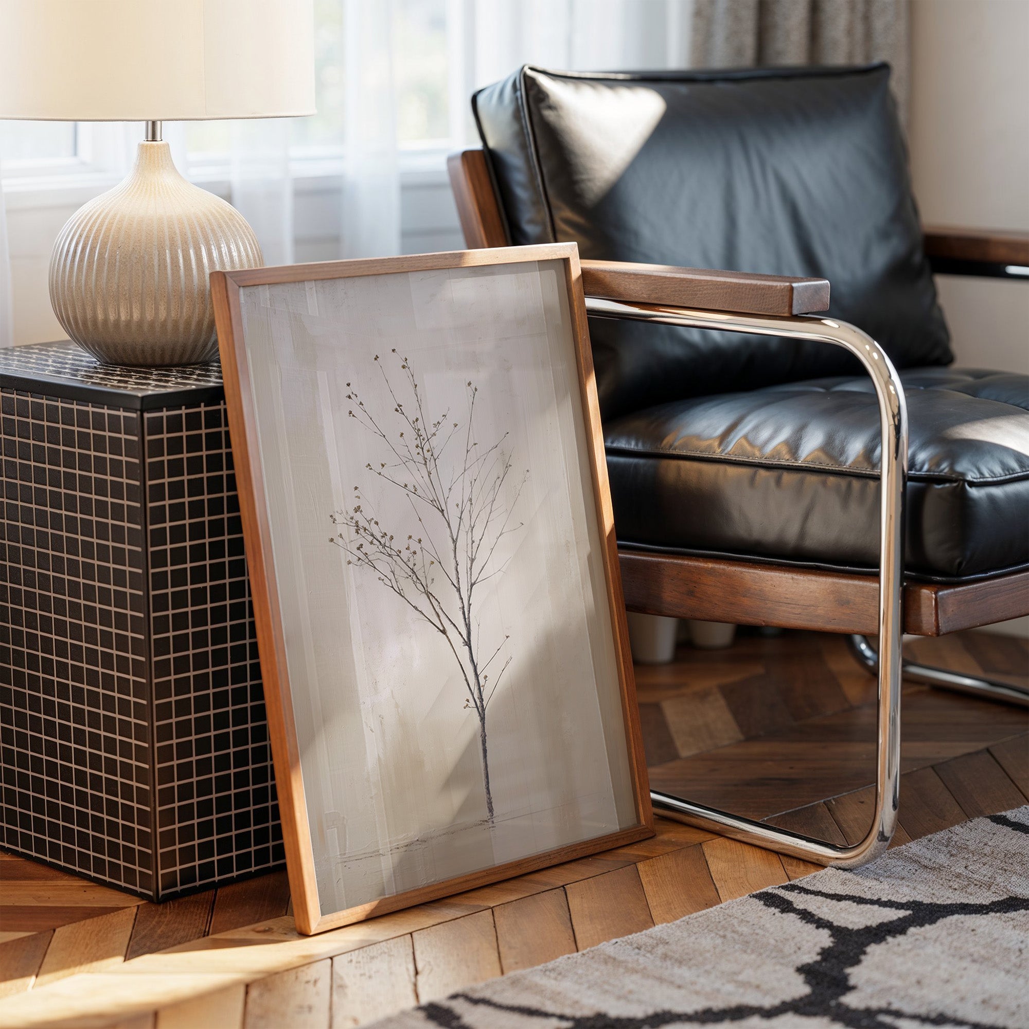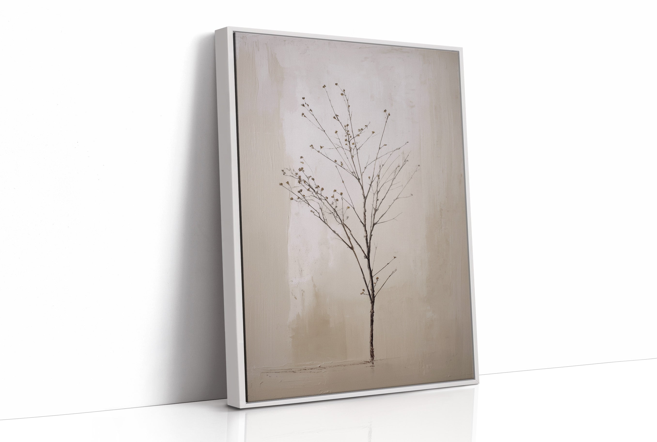 A delicate winter branch reaches skyward against a misty grey backdrop, each tiny bud holding the promise of spring. The minimalist composition captures nature's elegant simplicity, with subtle shadows dancing across the pale canvas. This contemplative piece brings together the stark beauty of winter dormancy with the hopeful anticipation of new growth, rendered in gentle earth tones and ethereal greys. Perfect for creating a serene focal point in a reading nook, home office, or any space where quiet reflection is cherished.